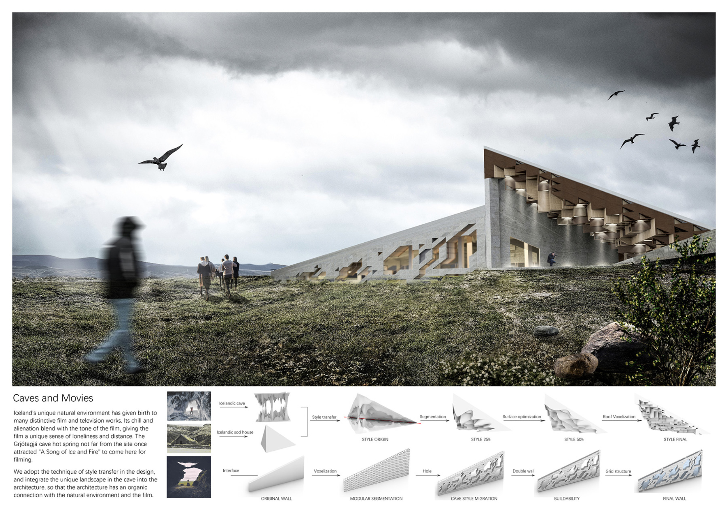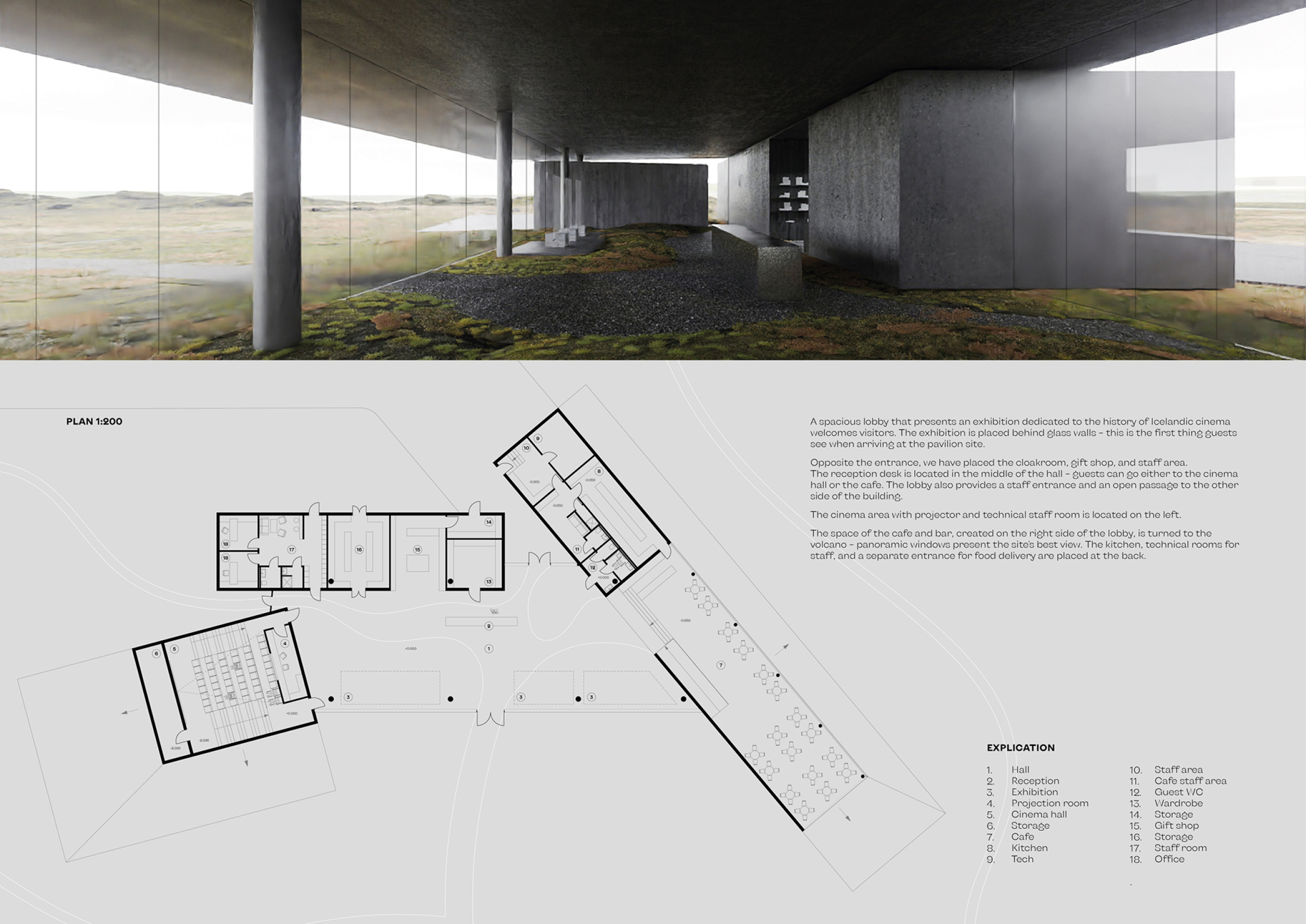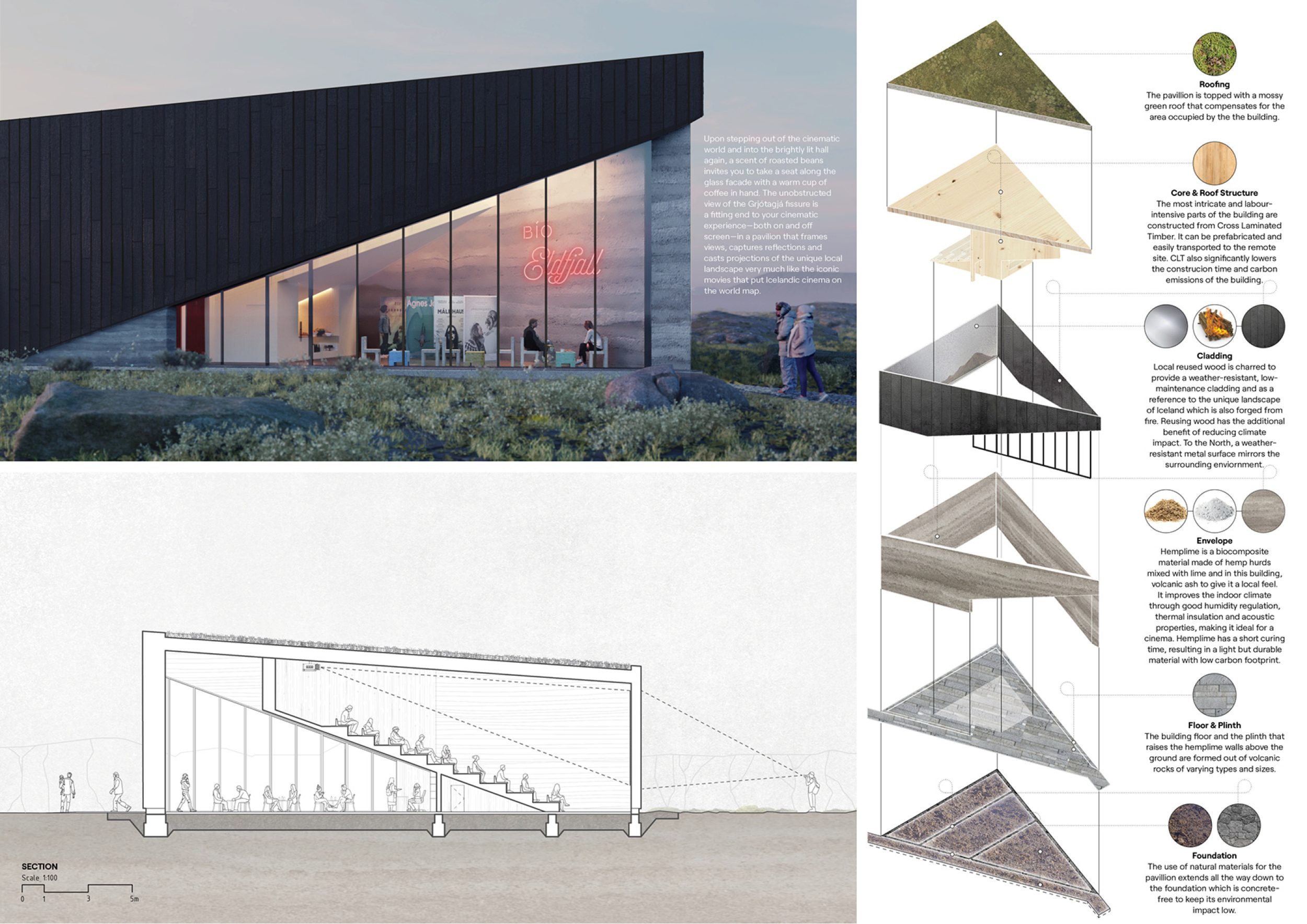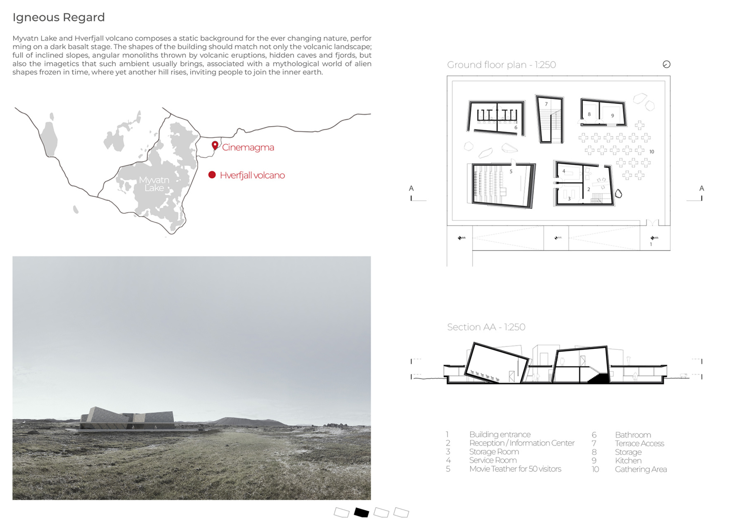 The Iceland Movie Pavilion competition sought designs for a movie pavilion in the Grjótagjá cave region located near Lake Mývatn in northern Iceland. It was asked that proposals reflect the essence of Icelandic cinema, its distinctive character and unique history, with the central focus being a small movie theater capable of hosting up to 50 visitors. The pavilion is envisioned to be a place to introduce visitors to Icelandic cinema, as well as one to offer fans a place to gather and share a passion for film.