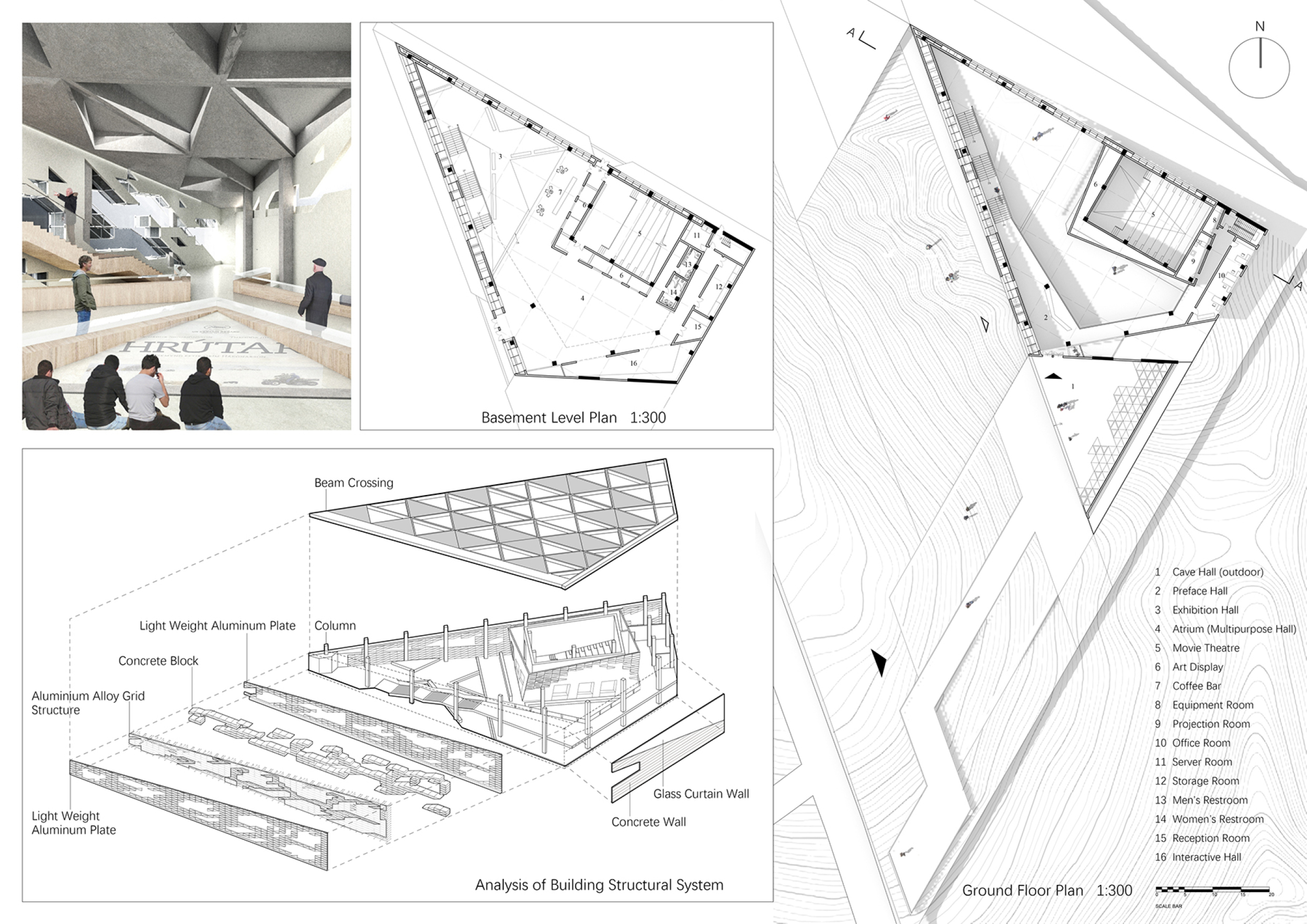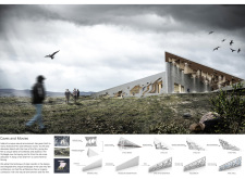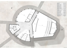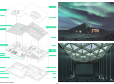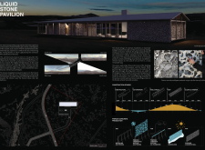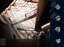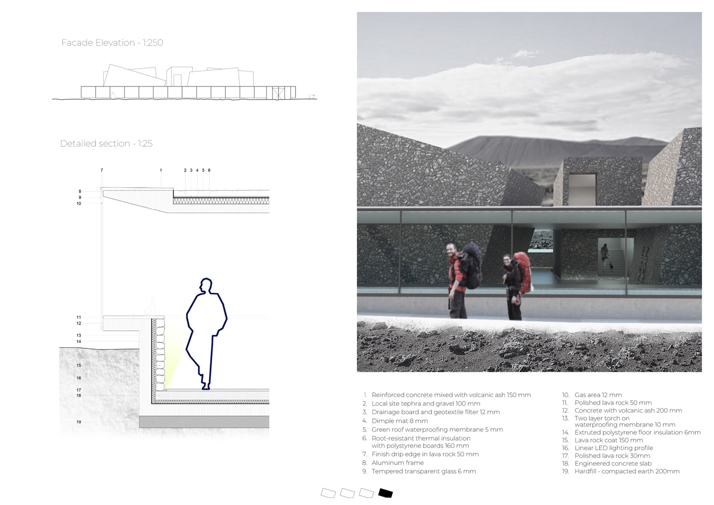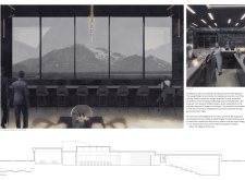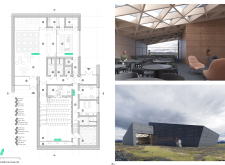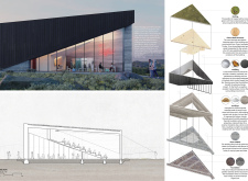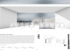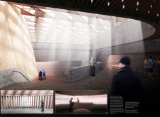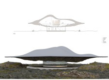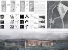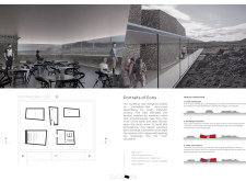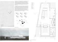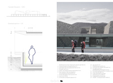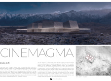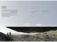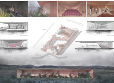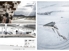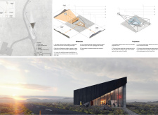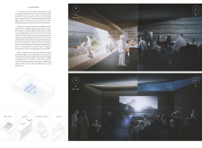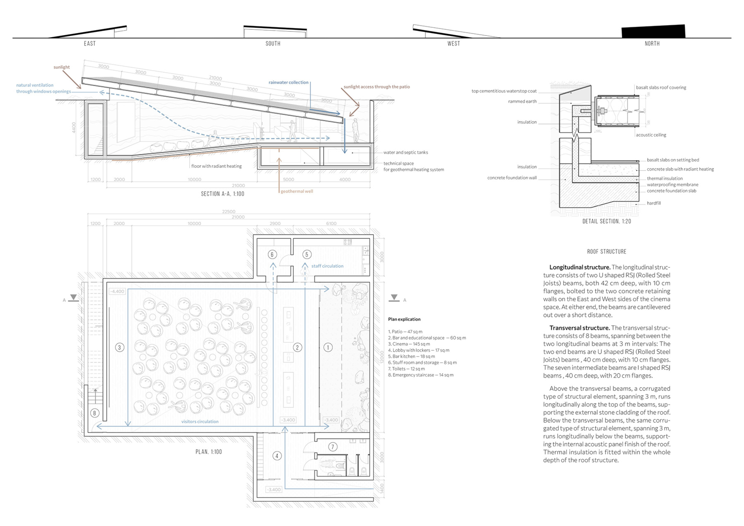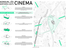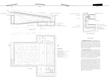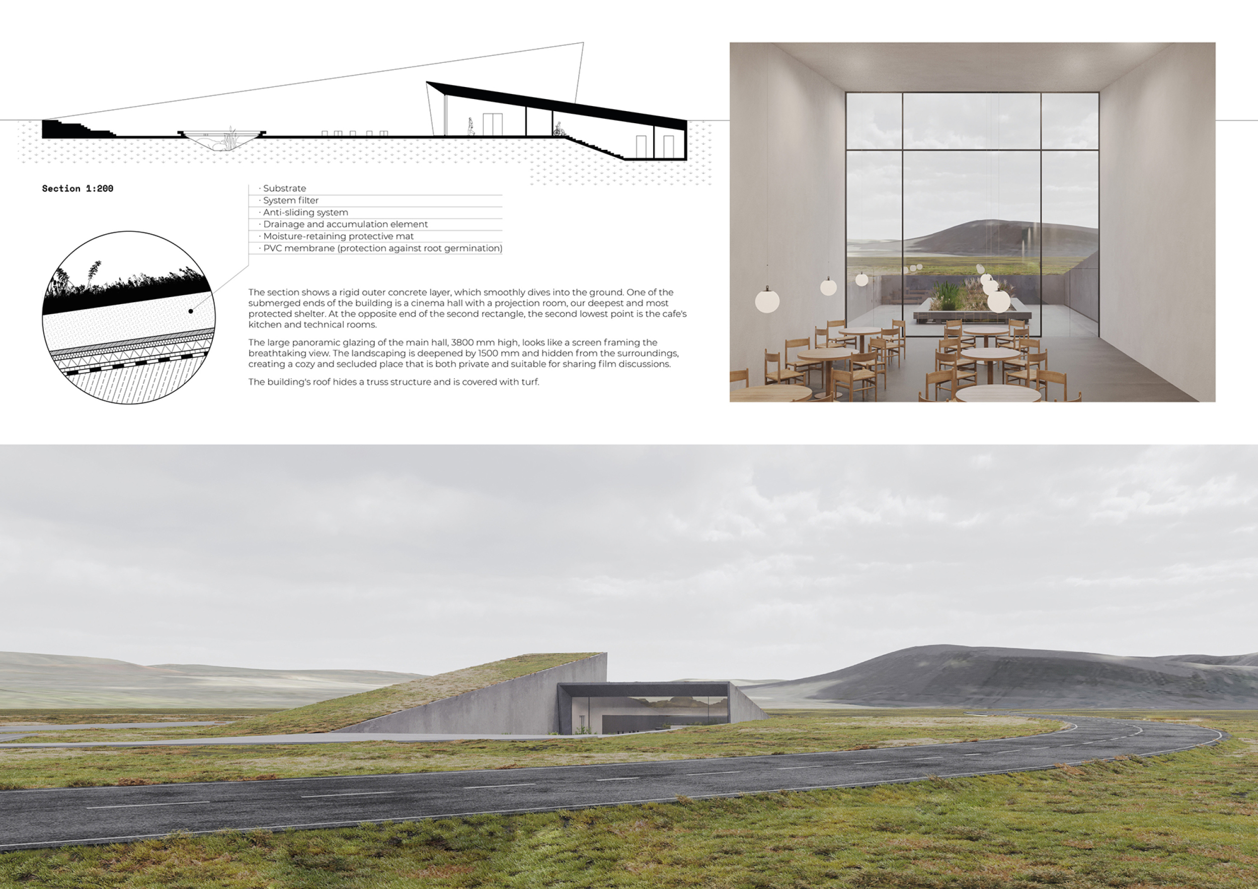 The presentation is well designed, using large perspective imagery mixed with clear drawings and diagrams, to produce a story that is convincing to a reader. The images primarily describe the exterior form of the building, and while there is one interior image, it seems that the most important interior spatial experience - that of the cinema hall - is missing. Read more For the juror this gives a sense that the project has not been fully developed, and it does not allow one to understand the whole project. Further, while there is one detail included to explain the layers of the roof buildup, the project neglects to enter into a detailed analysis of the building construction. This is arguably not necessary for a conceptual design competition, however such detail would also allow the author to more fully understand how the building meets the landscape, and should yield more interesting relationships between building and site. The plan and section drawings are very simplistic and would benefit from additional linework to describe the envelope. It would also be very beneficial in plan to understand where the interior spaces are sunken versus where they are above ground - as was done in section.