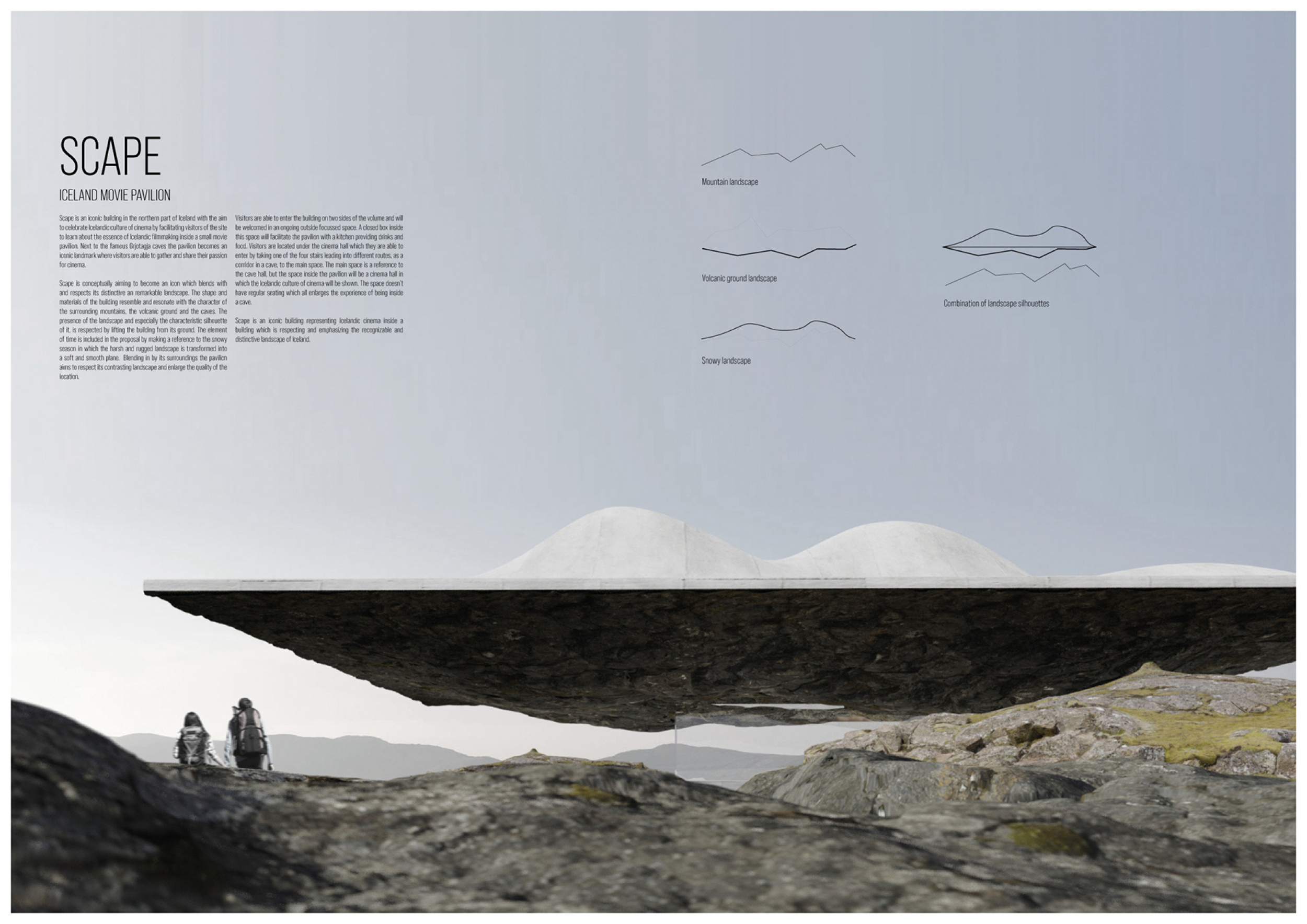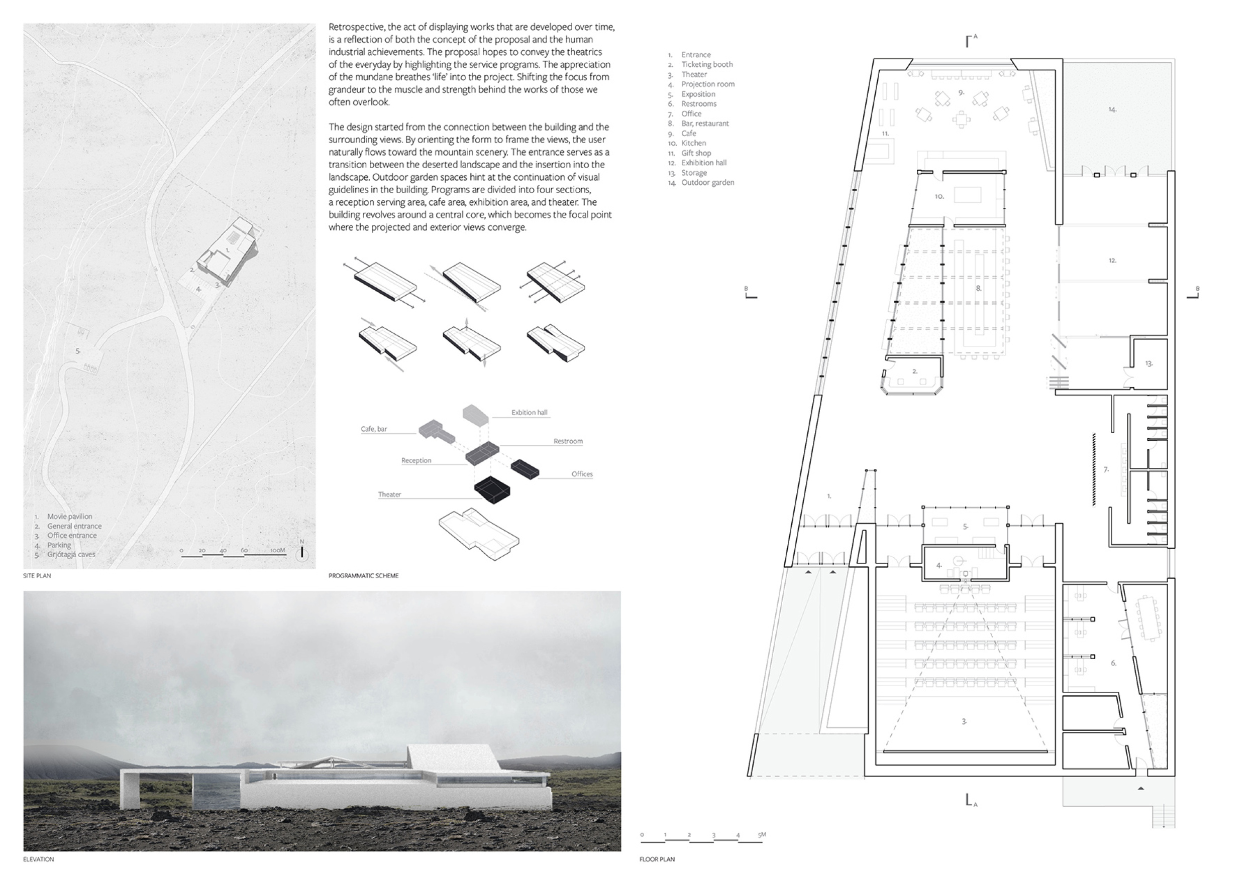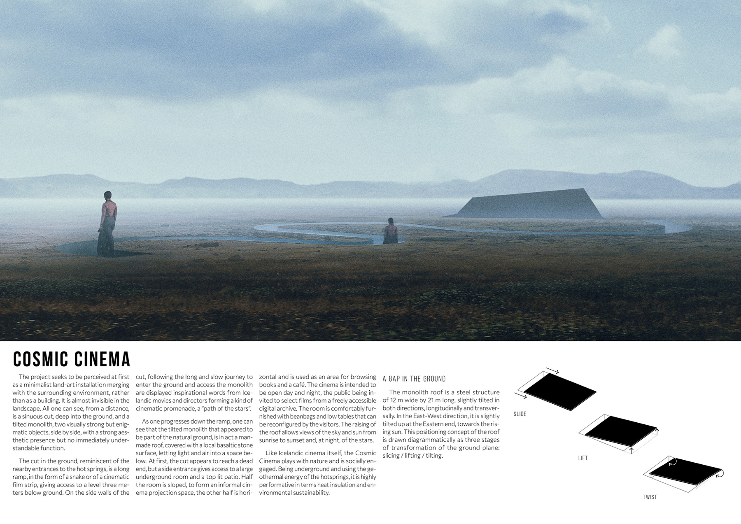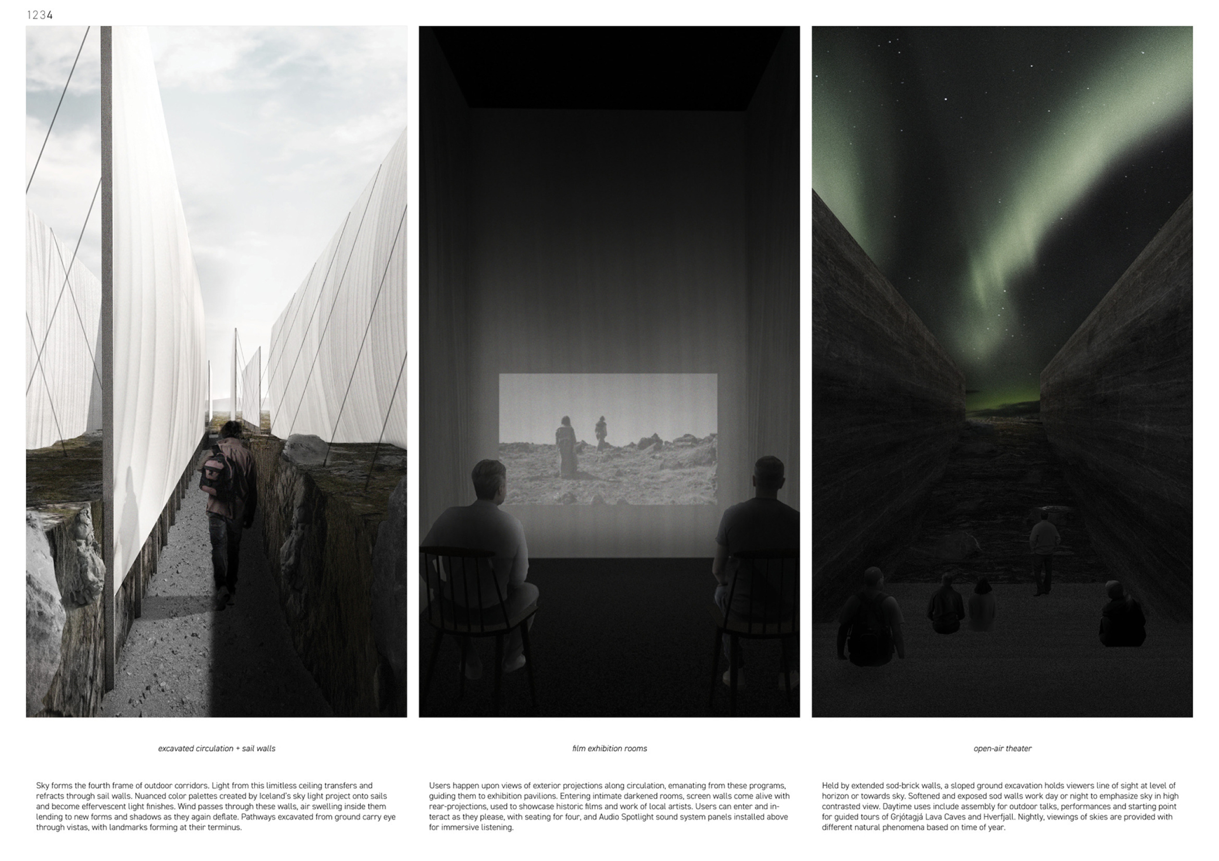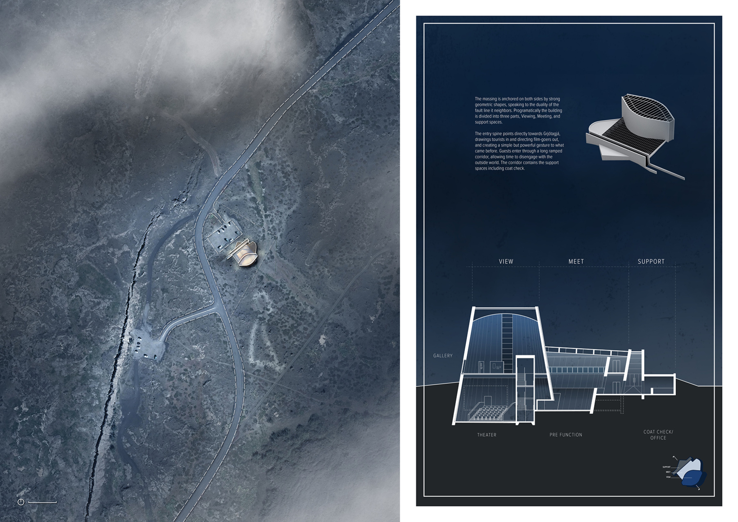 The presentation sheets, like the project itself, are subtle and minimalist in design. The layout makes use of a clever striated organization that allows for both horizontal and vertical full-span images to engage the reader as the project might engage the visitor: undoubtedly horizontal at a global level while vertical within the smaller-scale framed corridors. Read more While the submission is primarily black and white by design the reader seeks to understand the project’s assumed variability: what is the experience under a bright blue sky? The sunset? Cinema is, often, an experience of vivid color, and while the design reveals itself as a muted white backdrop to the animation of projected screenings, the designer should not feel limited by this. Competitions entries all, ultimately, also need to inspire. The project would benefit from more concise text and a larger font. While the text on the final page describes well the variation of experiences, the introductory text on the first sheet is lengthy for a competition proposal. It is possible to be both poetic and brief! Finally, it is recommended that the author further develop the sail detail, which is the primary project constructive detail but which is not represented clearly here. Can the thin sail really stand, structurally speaking, against the harsh Icelandic winds?