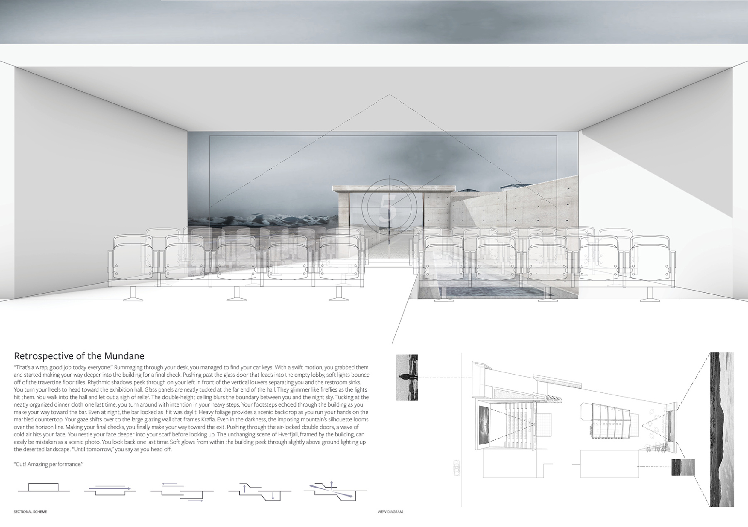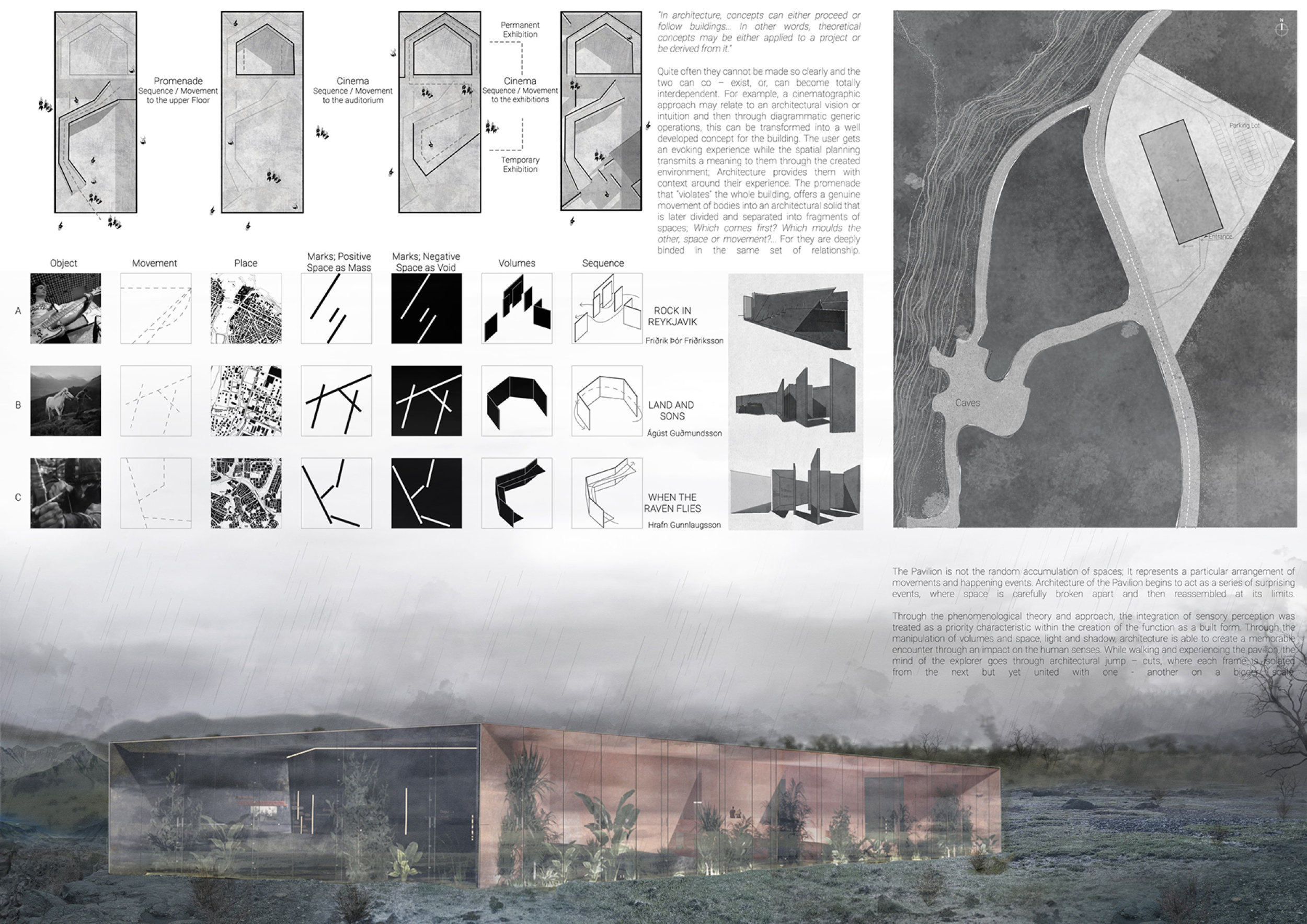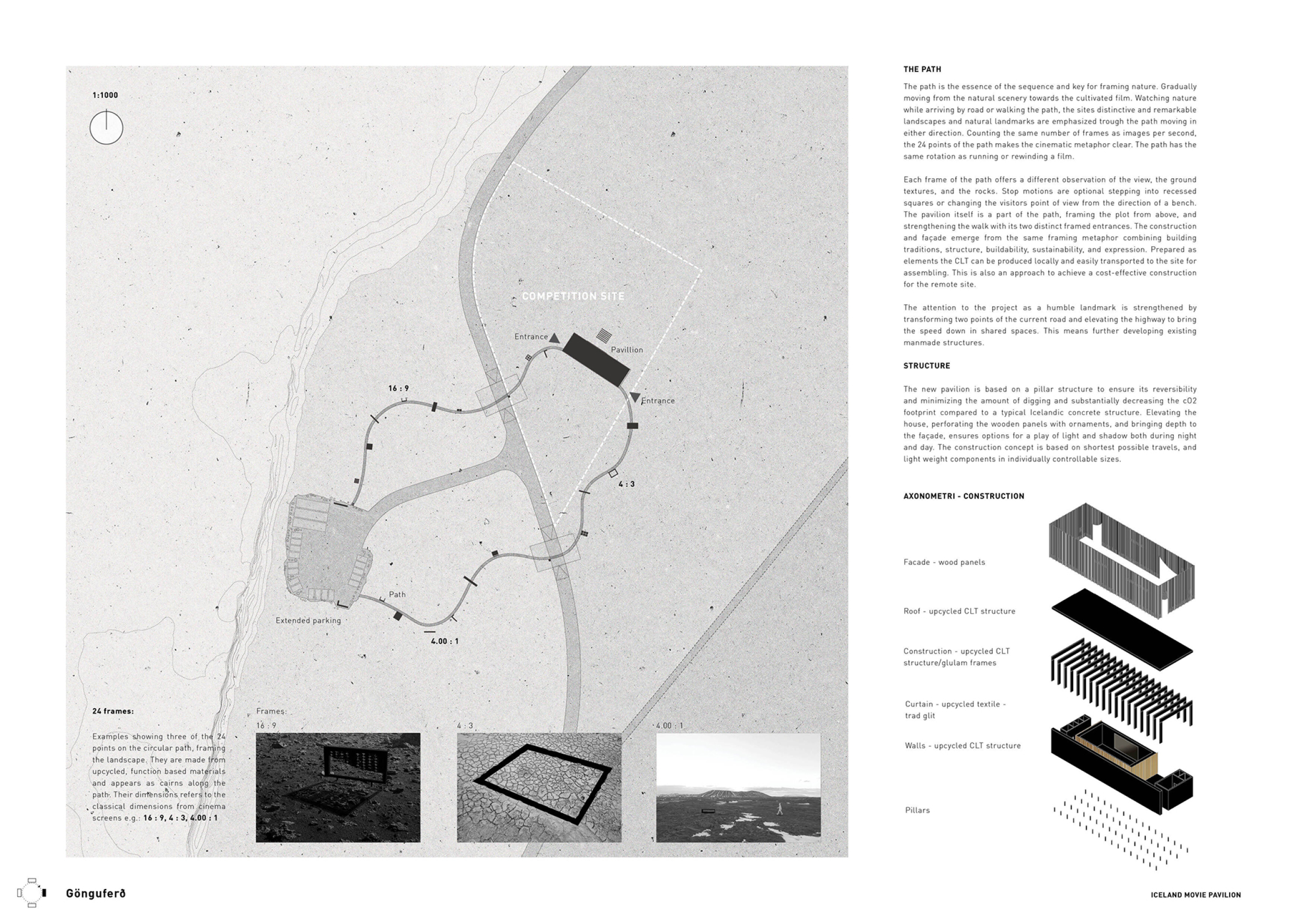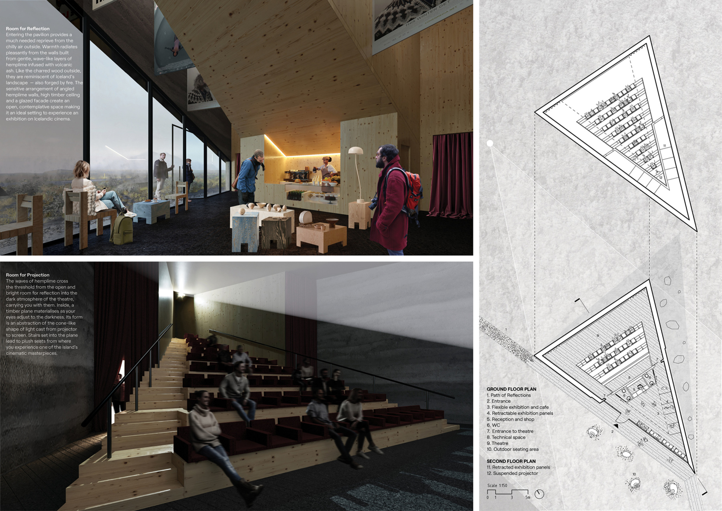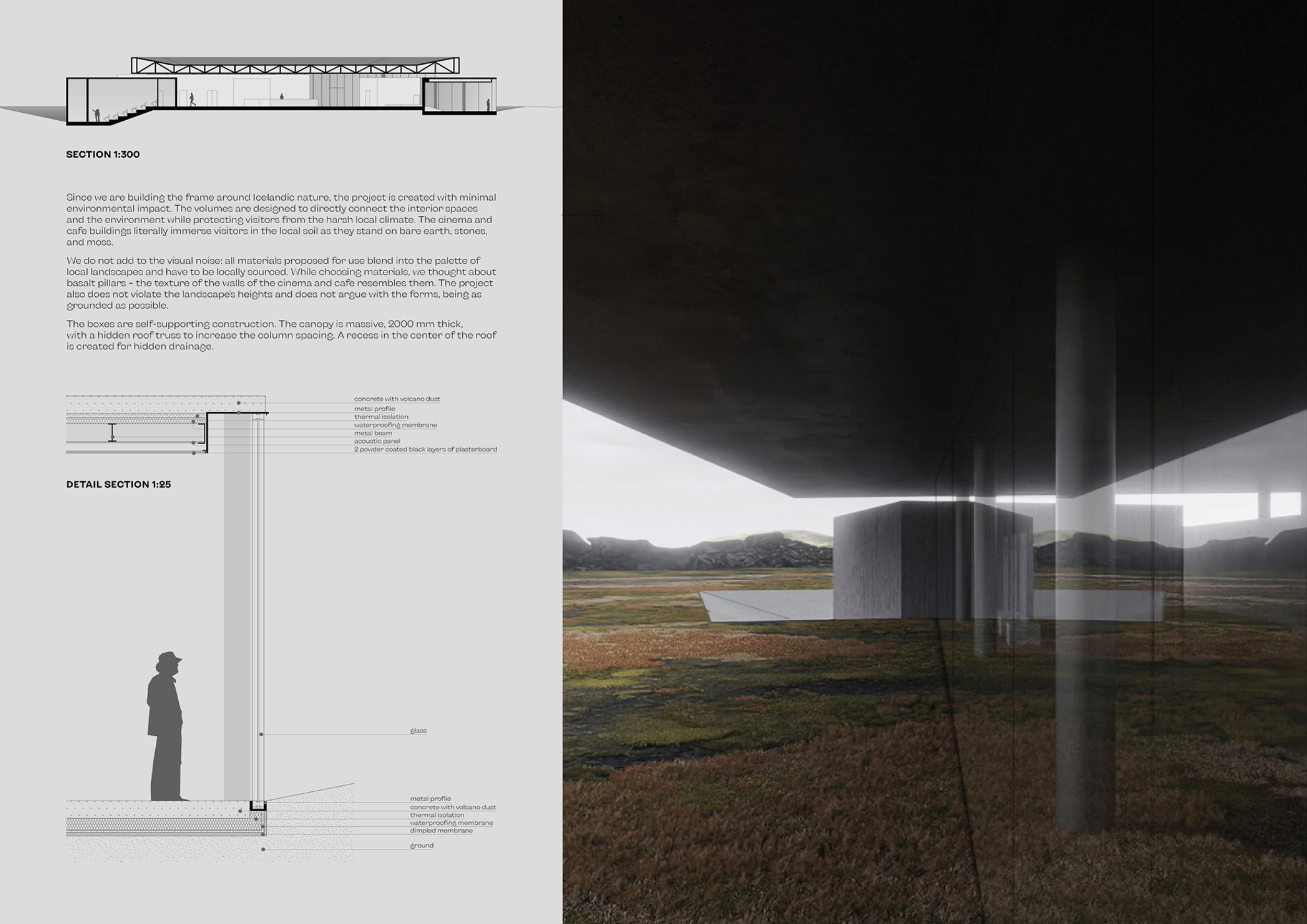 The presentation sheets, like the project itself, are subtle and minimalist in design. The layout makes use of a clever striated organization that allows for both horizontal and vertical full-span images to engage the reader as the project might engage the visitor: undoubtedly horizontal at a global level while vertical within the smaller-scale framed corridors. Read more While the submission is primarily black and white by design the reader seeks to understand the project’s assumed variability: what is the experience under a bright blue sky? The sunset? Cinema is, often, an experience of vivid color, and while the design reveals itself as a muted white backdrop to the animation of projected screenings, the designer should not feel limited by this. Competitions entries all, ultimately, also need to inspire. The project would benefit from more concise text and a larger font. While the text on the final page describes well the variation of experiences, the introductory text on the first sheet is lengthy for a competition proposal. It is possible to be both poetic and brief! Finally, it is recommended that the author further develop the sail detail, which is the primary project constructive detail but which is not represented clearly here. Can the thin sail really stand, structurally speaking, against the harsh Icelandic winds?
