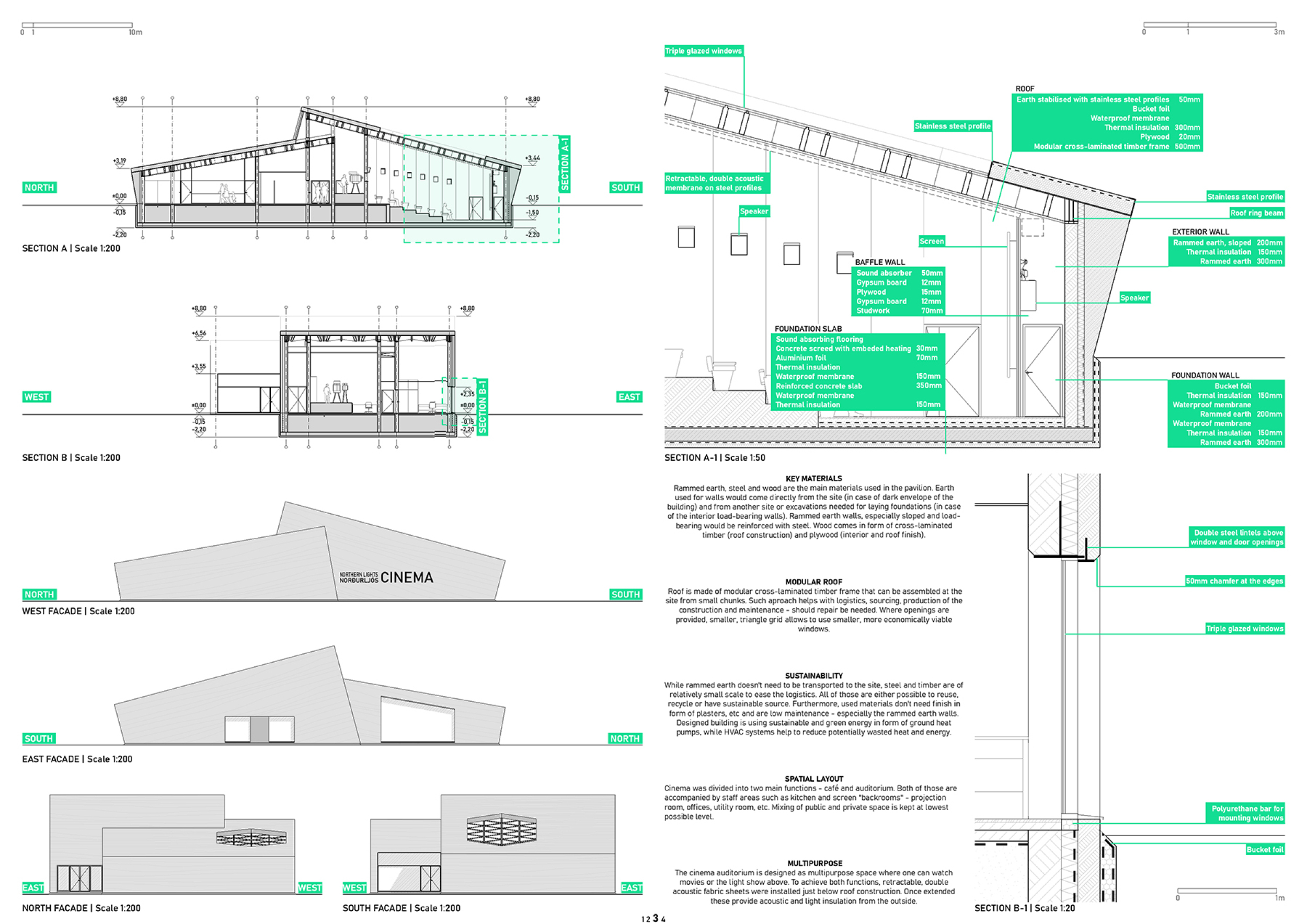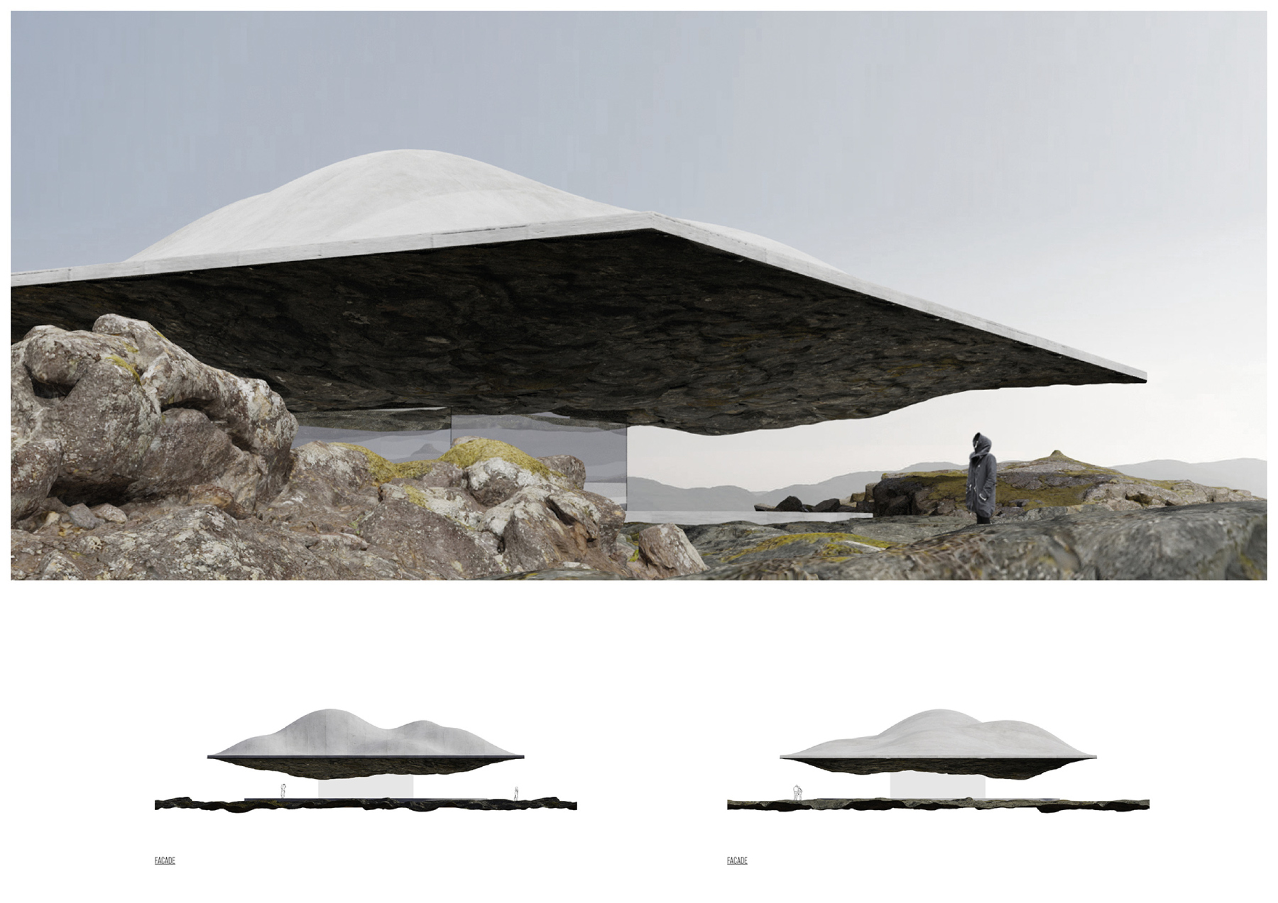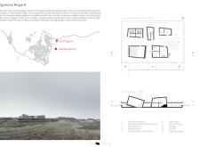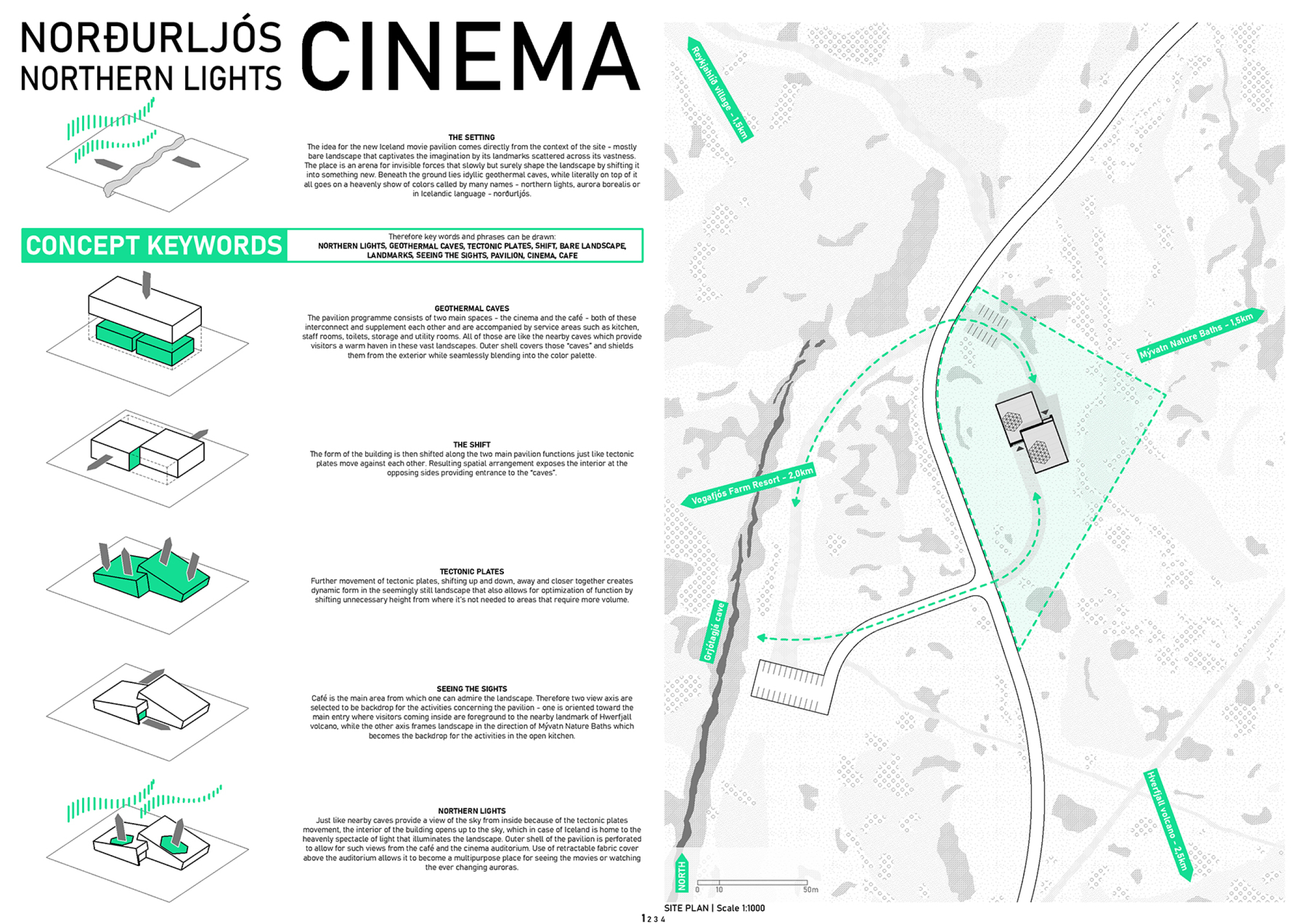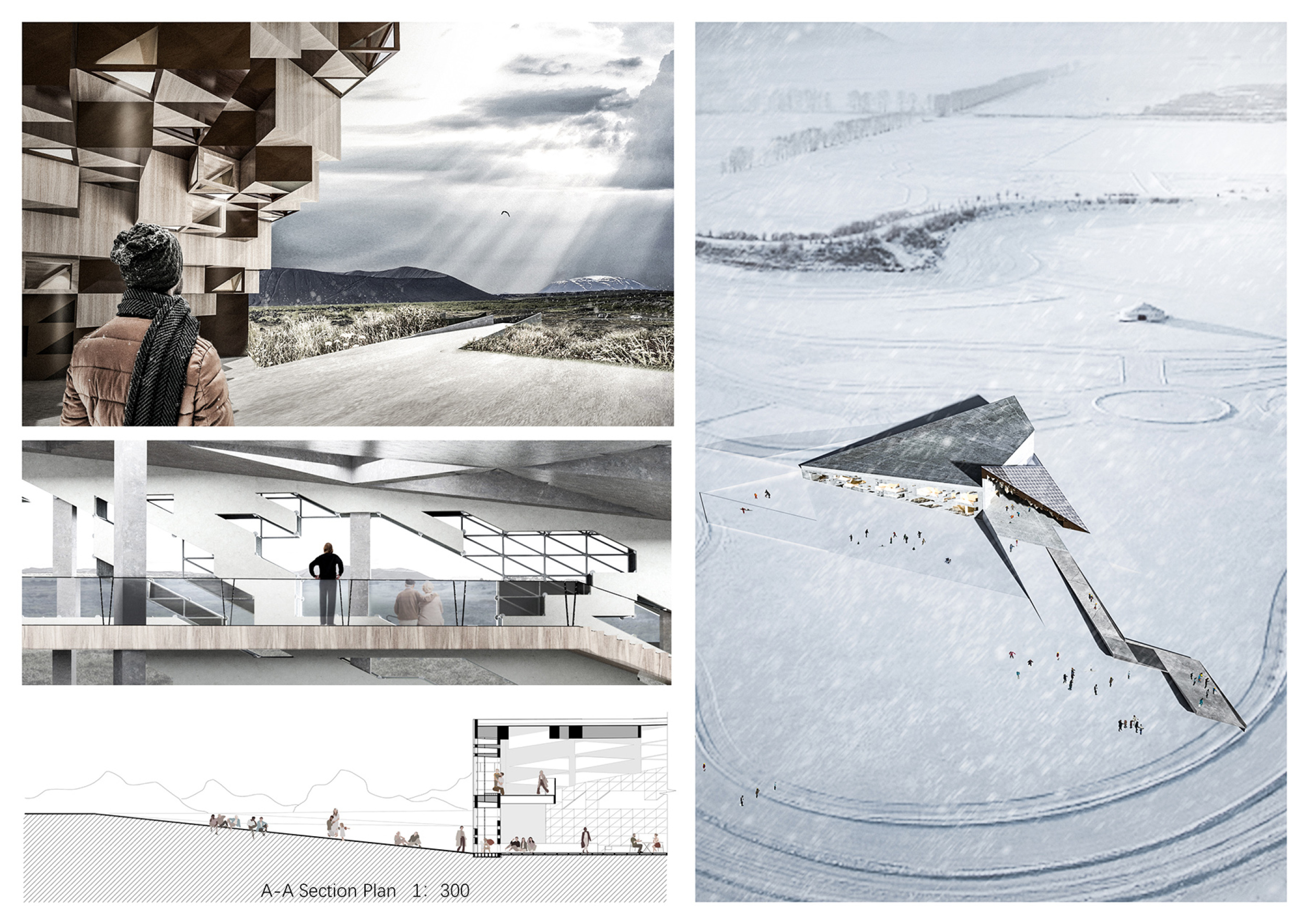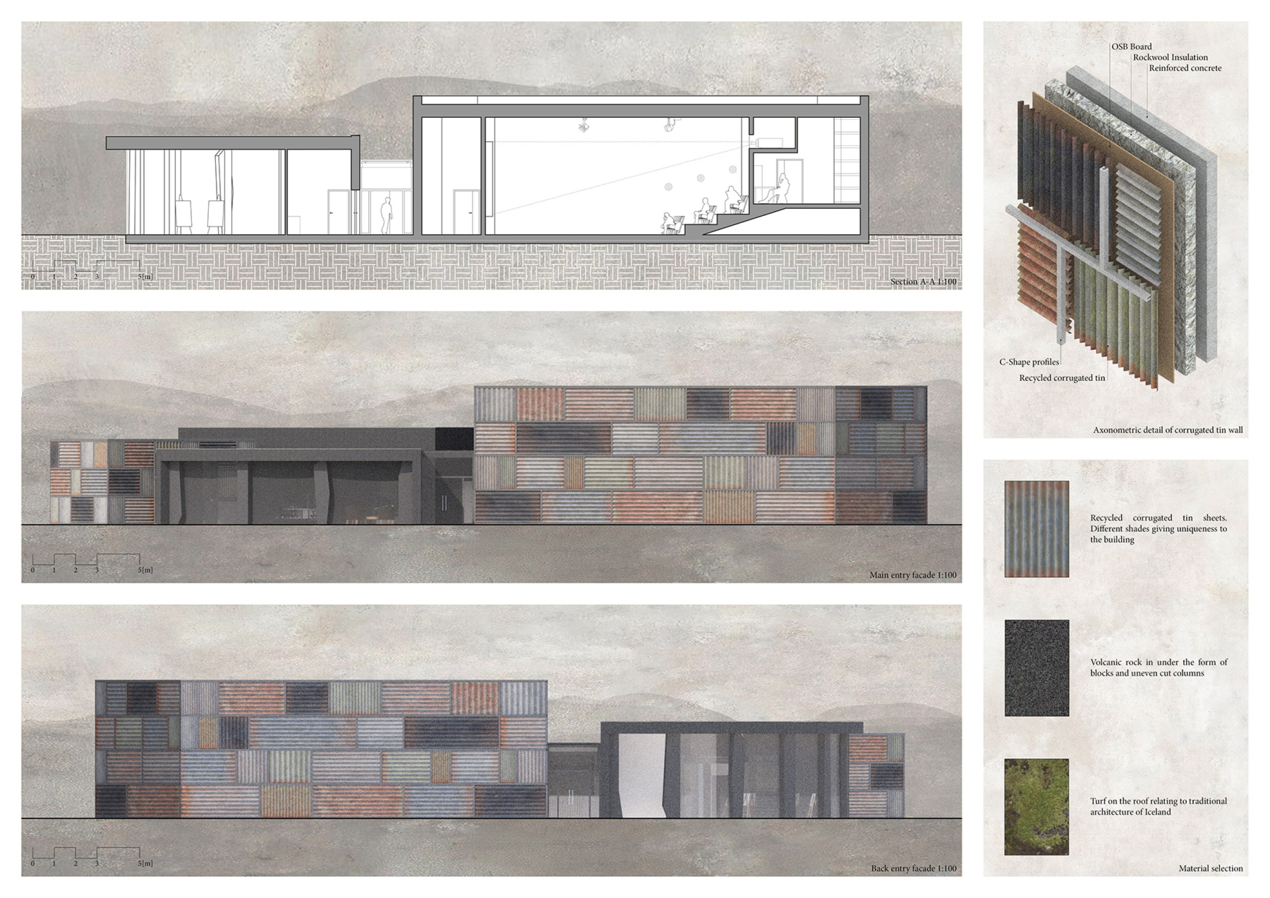 The presentation sheets, like the project itself, are subtle and minimalist in design. The layout makes use of a clever striated organization that allows for both horizontal and vertical full-span images to engage the reader as the project might engage the visitor: undoubtedly horizontal at a global level while vertical within the smaller-scale framed corridors. Read more While the submission is primarily black and white by design the reader seeks to understand the project’s assumed variability: what is the experience under a bright blue sky? The sunset? Cinema is, often, an experience of vivid color, and while the design reveals itself as a muted white backdrop to the animation of projected screenings, the designer should not feel limited by this. Competitions entries all, ultimately, also need to inspire. The project would benefit from more concise text and a larger font. While the text on the final page describes well the variation of experiences, the introductory text on the first sheet is lengthy for a competition proposal. It is possible to be both poetic and brief! Finally, it is recommended that the author further develop the sail detail, which is the primary project constructive detail but which is not represented clearly here. Can the thin sail really stand, structurally speaking, against the harsh Icelandic winds?