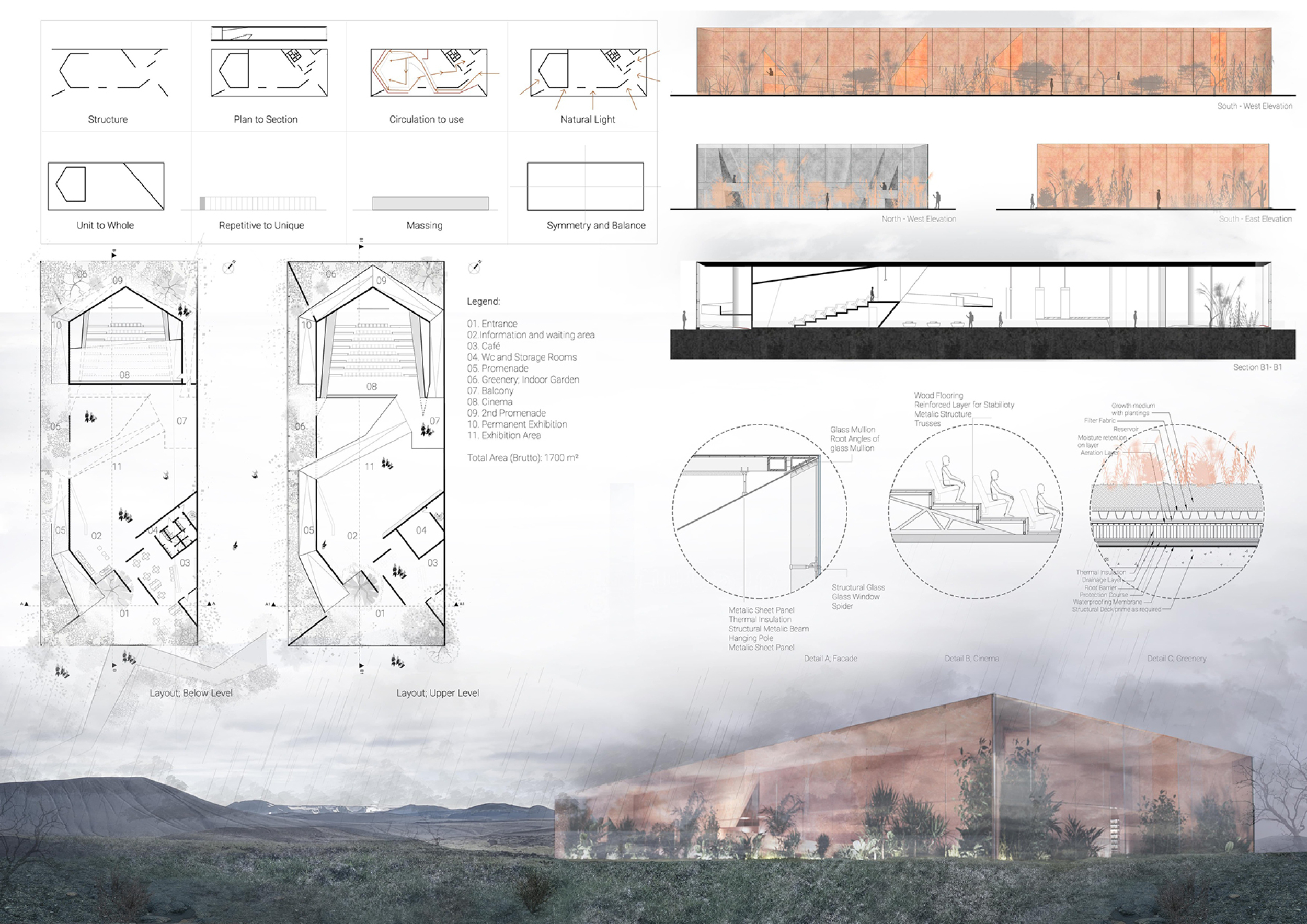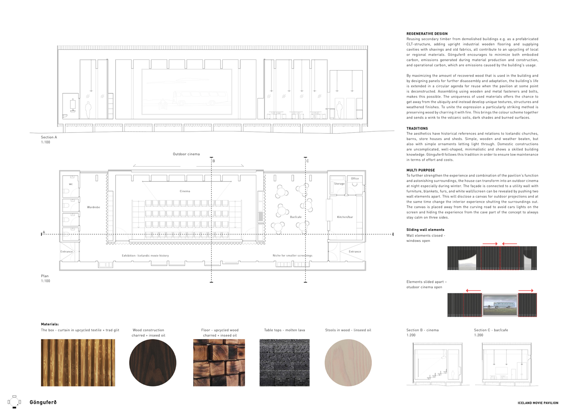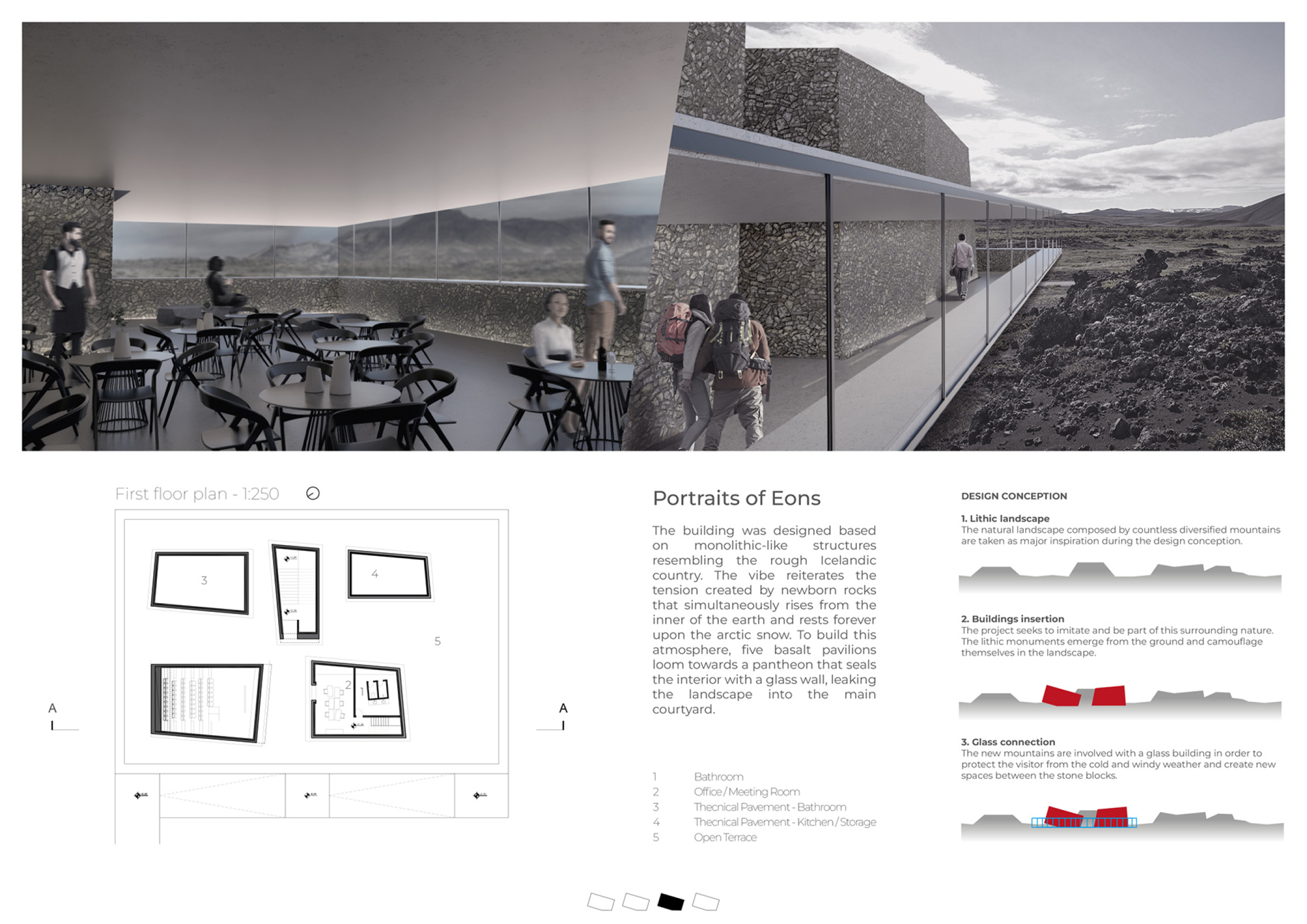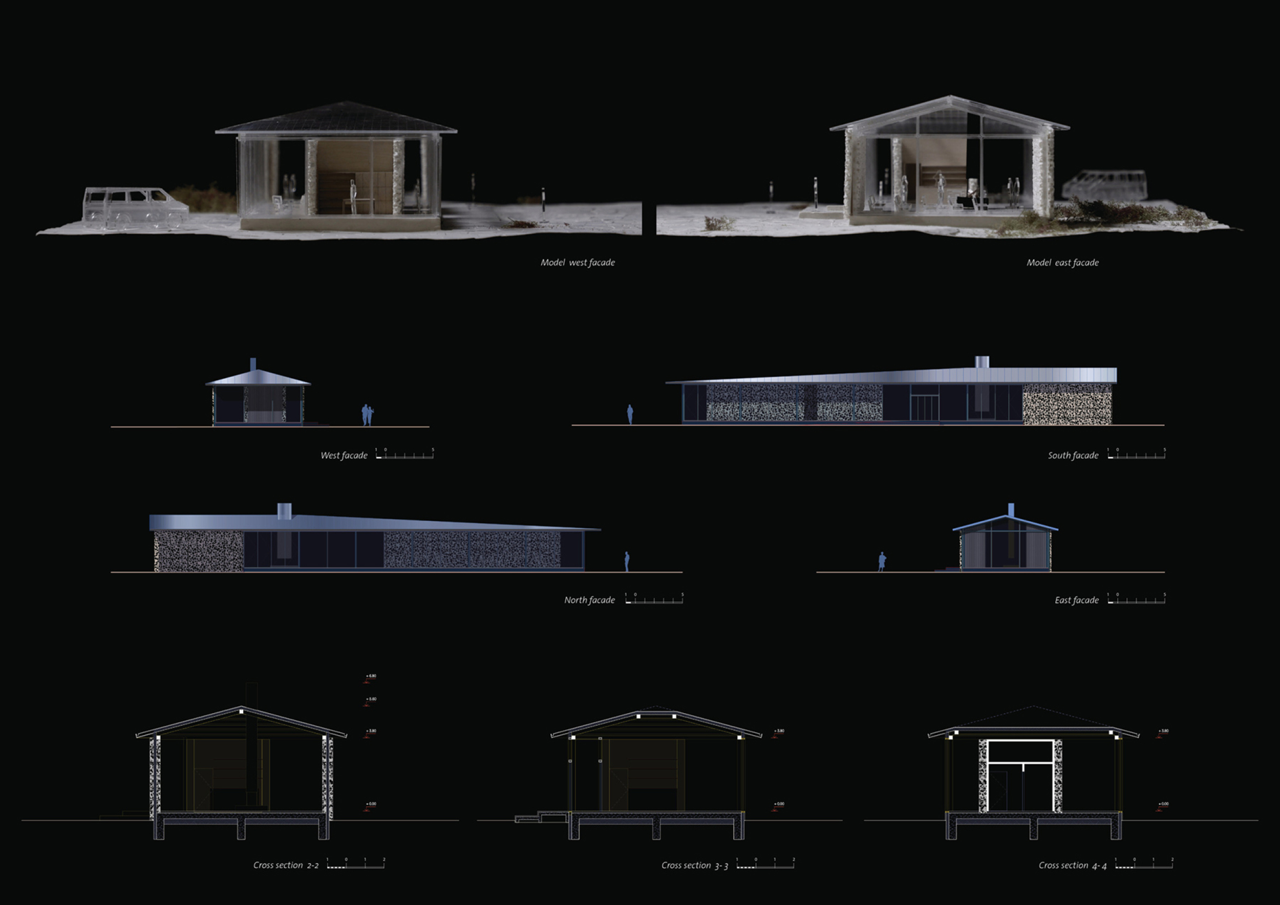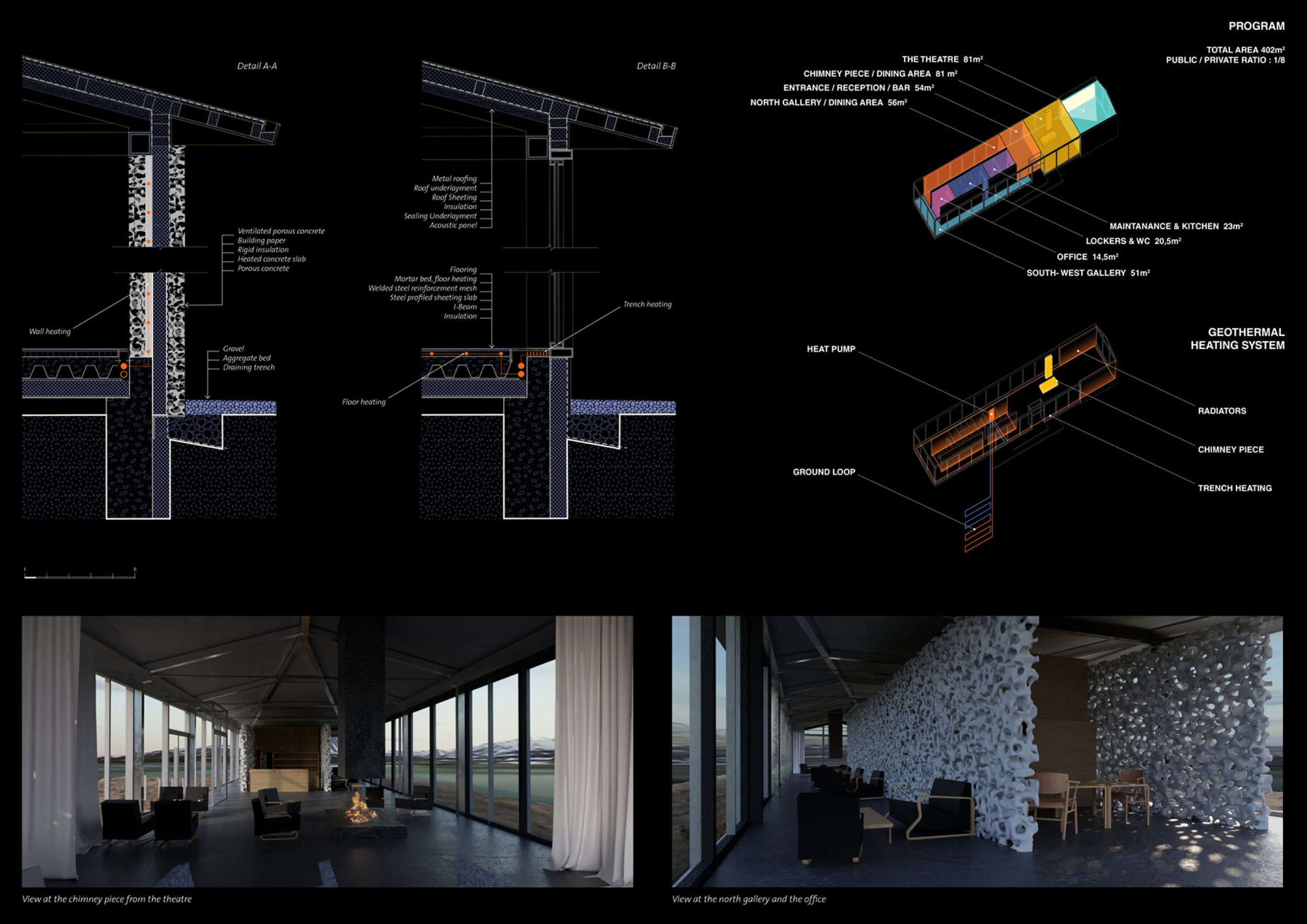 The presentation sheets, like the project itself, are subtle and minimalist in design. The layout makes use of a clever striated organization that allows for both horizontal and vertical full-span images to engage the reader as the project might engage the visitor: undoubtedly horizontal at a global level while vertical within the smaller-scale framed corridors. Read more While the submission is primarily black and white by design the reader seeks to understand the project’s assumed variability: what is the experience under a bright blue sky? The sunset? Cinema is, often, an experience of vivid color, and while the design reveals itself as a muted white backdrop to the animation of projected screenings, the designer should not feel limited by this. Competitions entries all, ultimately, also need to inspire. The project would benefit from more concise text and a larger font. While the text on the final page describes well the variation of experiences, the introductory text on the first sheet is lengthy for a competition proposal. It is possible to be both poetic and brief! Finally, it is recommended that the author further develop the sail detail, which is the primary project constructive detail but which is not represented clearly here. Can the thin sail really stand, structurally speaking, against the harsh Icelandic winds?