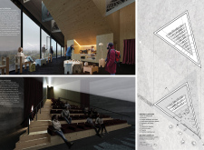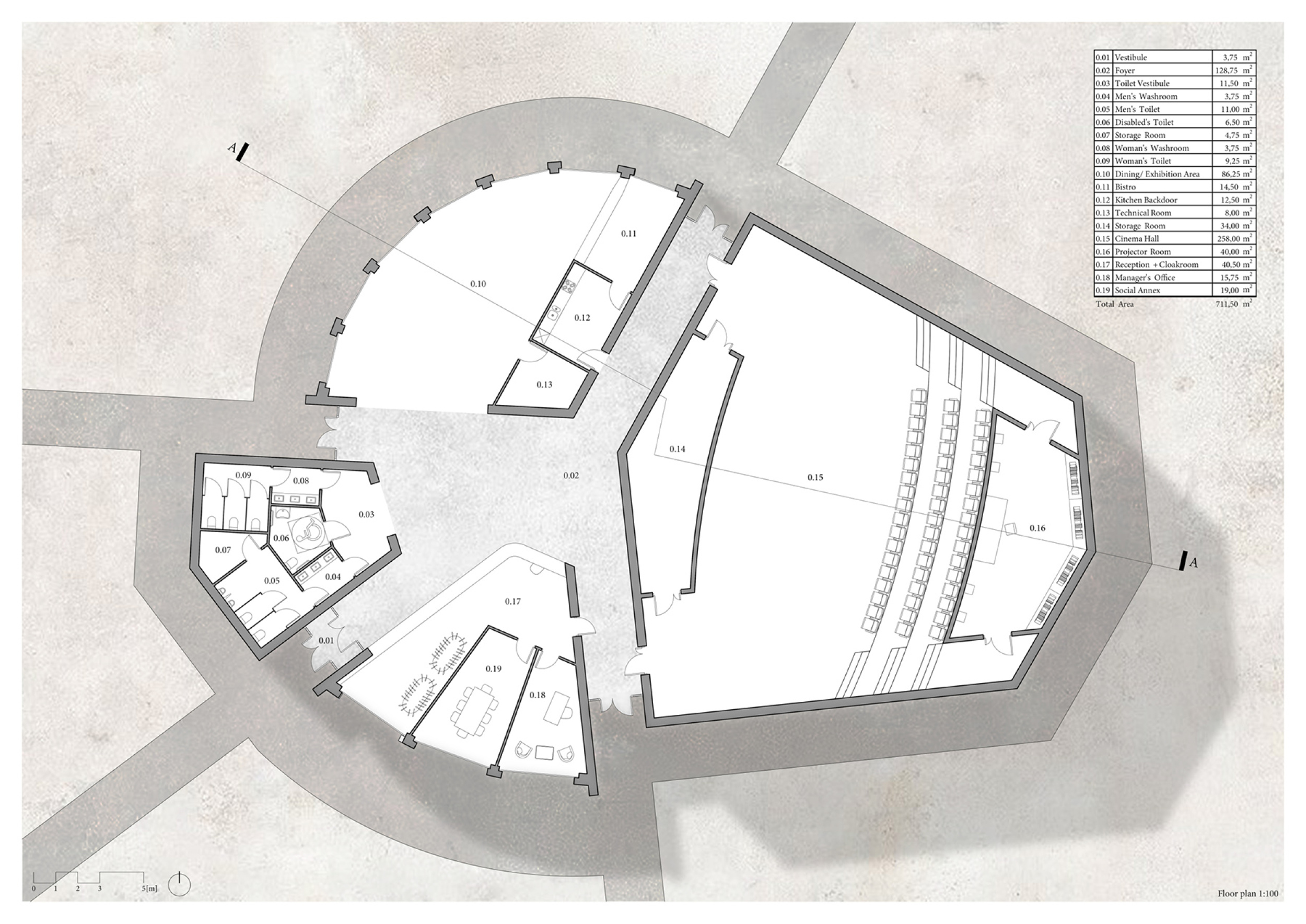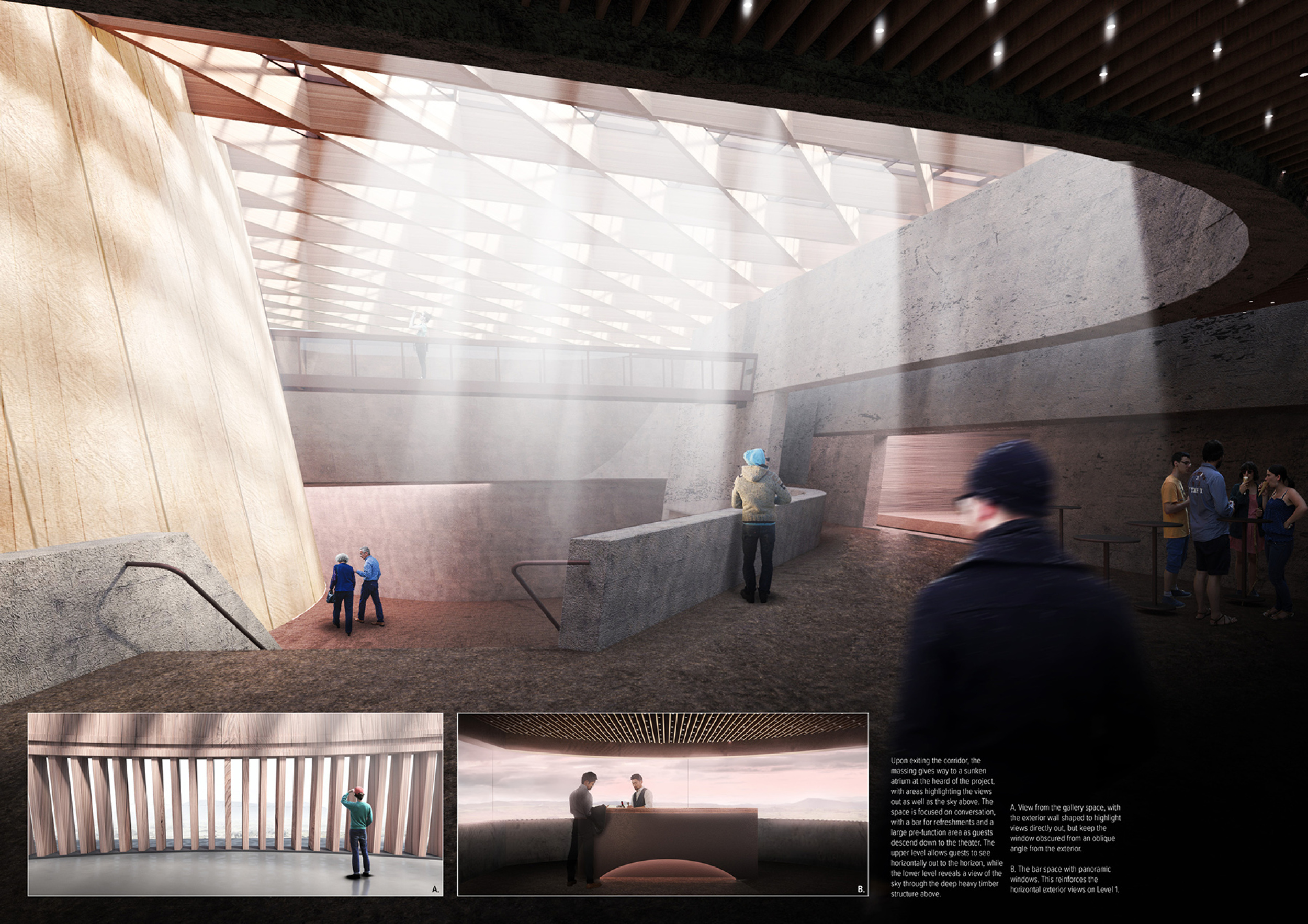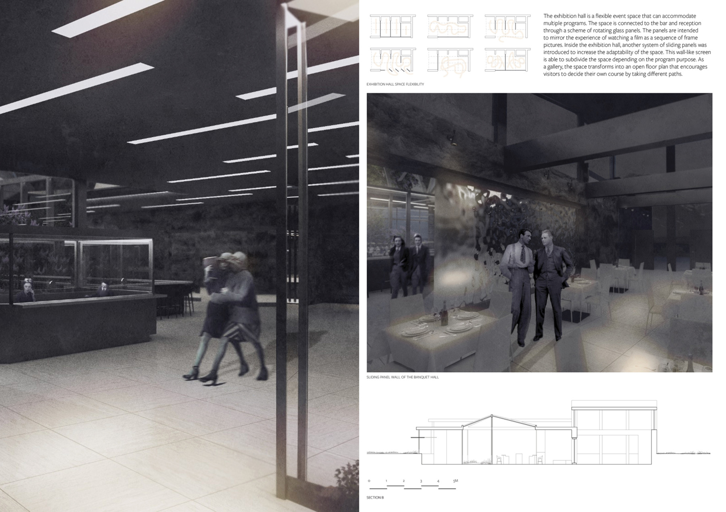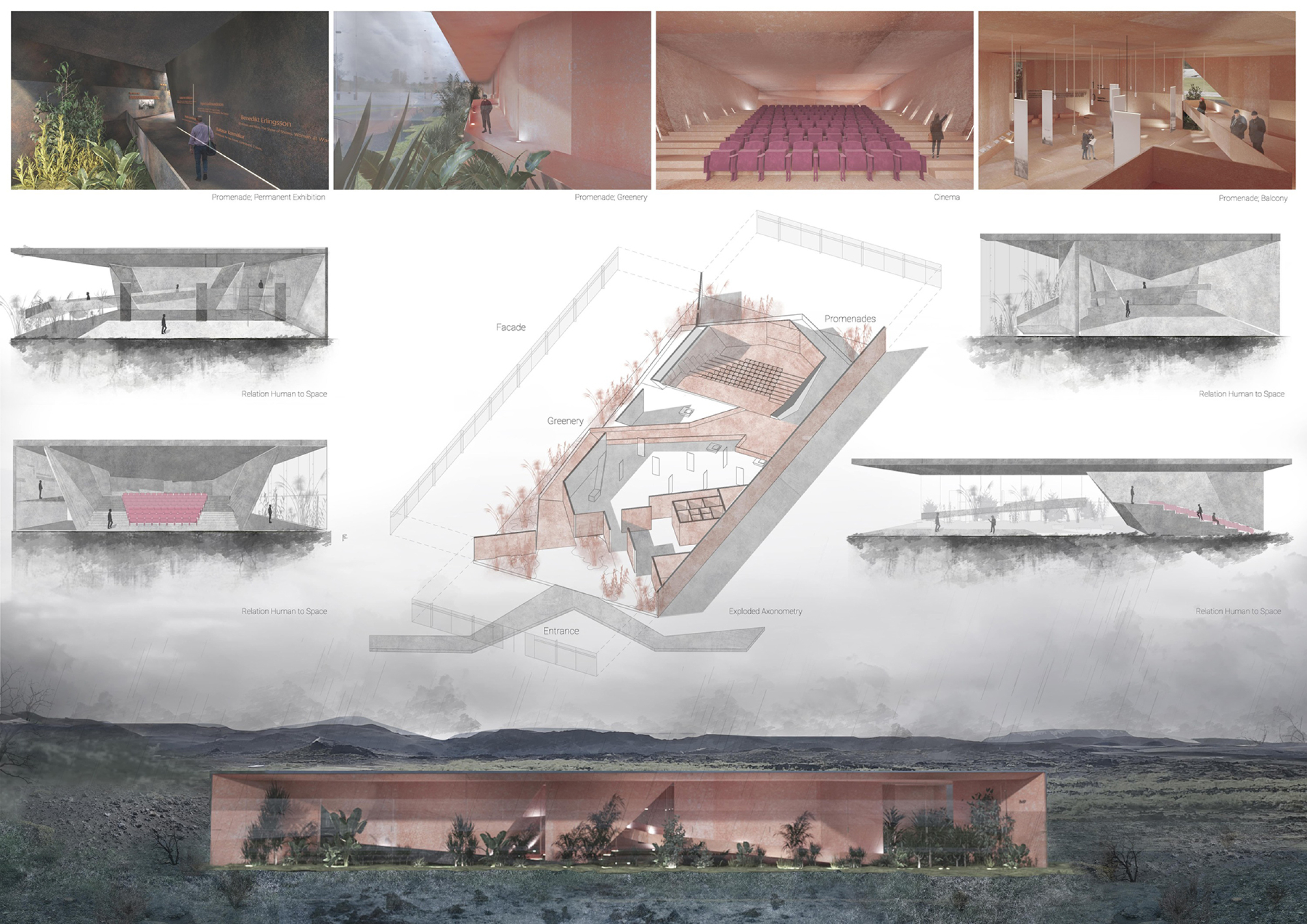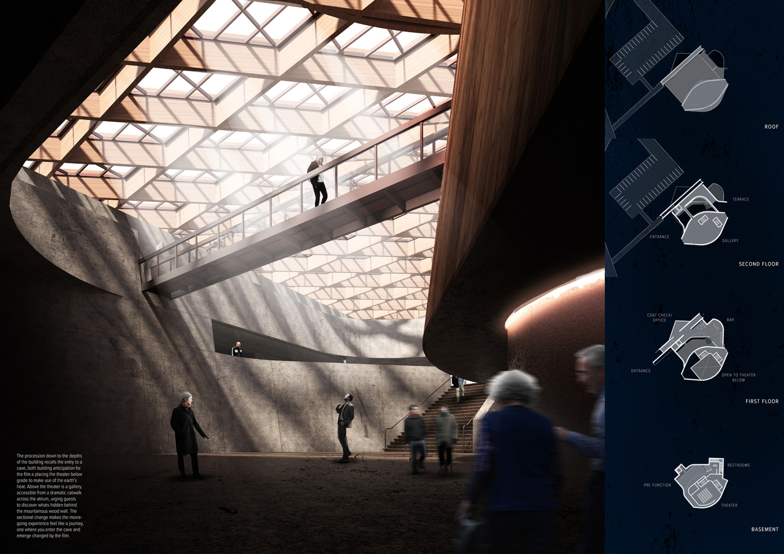 A poetic yet immersive proposal. The sketches are alive as well as the overall solution that conveys a fresh and unexpected interpretation and answer to the tectonic and cinematic existence.