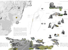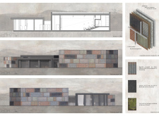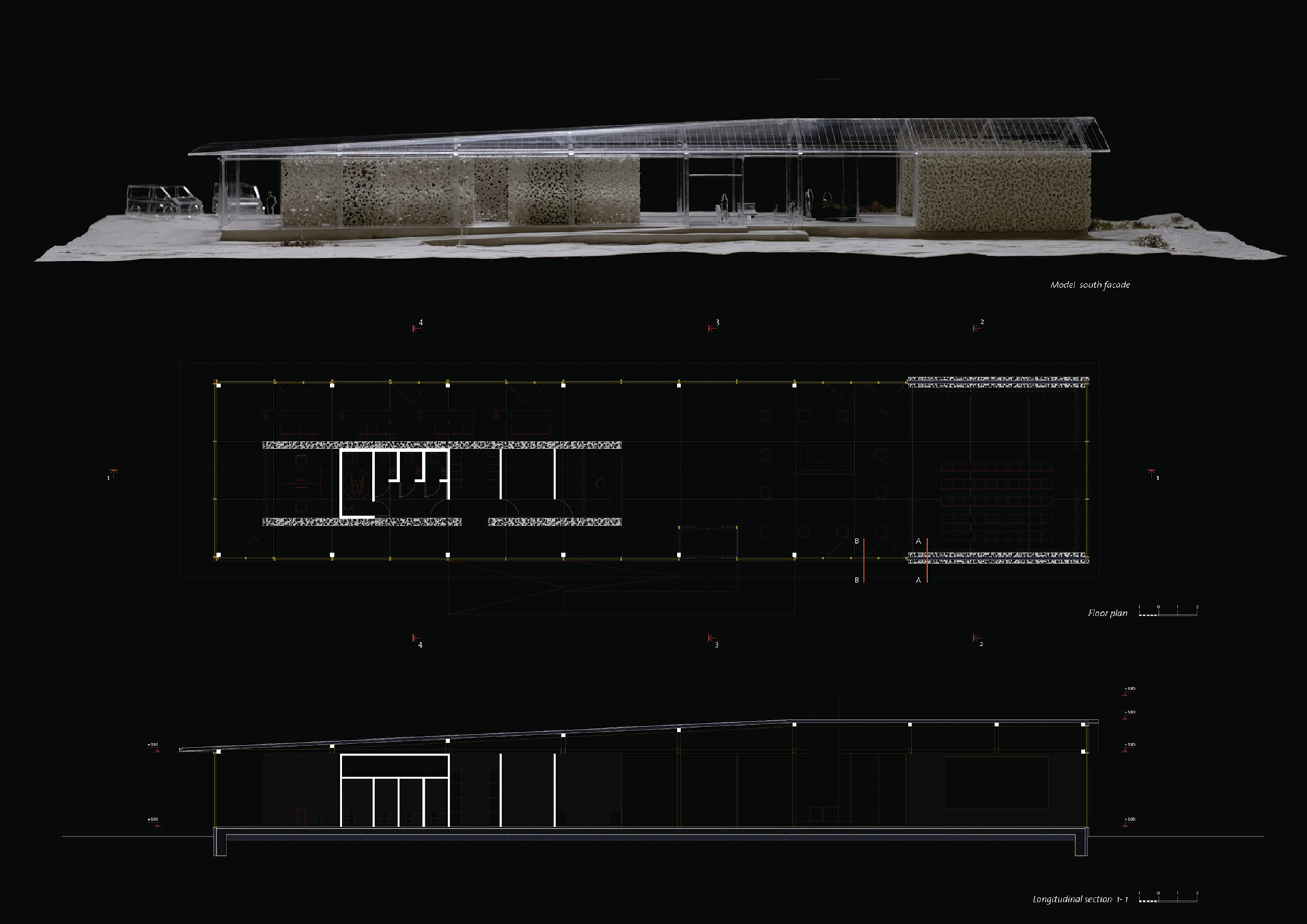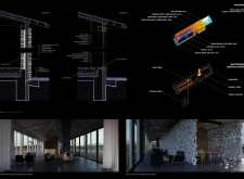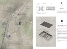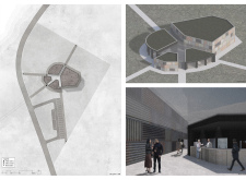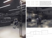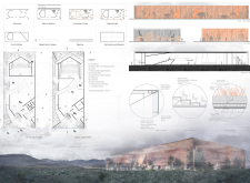 The submission has used an excellent, simple layout to emphasize large and convincing rendered perspectives, of which there are an appropriately selected number. The remaining white space is used for text and simple diagrams. As a whole the presentation is clean and communicative of the key ideas. The simplicity of the drawings do fall into the trap of being undeveloped. In particular the building plan and section represent walls and roofs as single black lines, all of a standard thickness. Read more The submission would benefit from an increased level of analysis and complexity in its detailing, to make it more thoroughly convincing as an architectural project. At a presentation level such complexity would also yield nuances in the design that would make the sheets more varied and interesting. As with many projects the text is rather long and winding and it is recommended that the author edit this to more precise statements.
