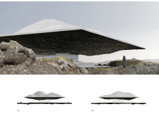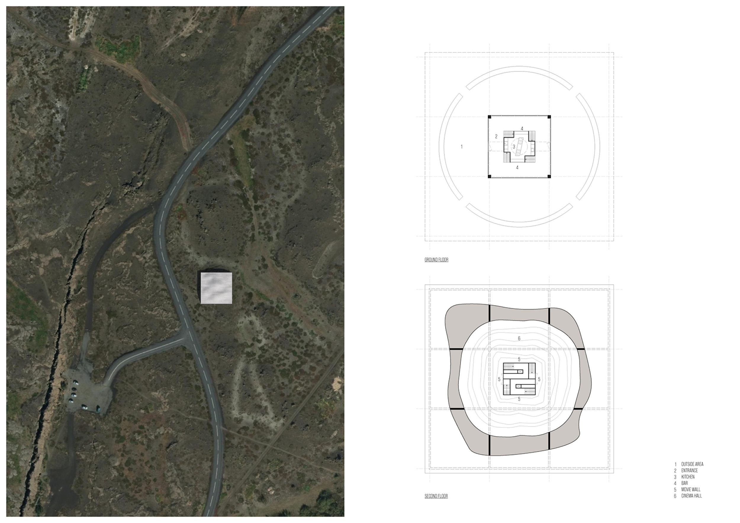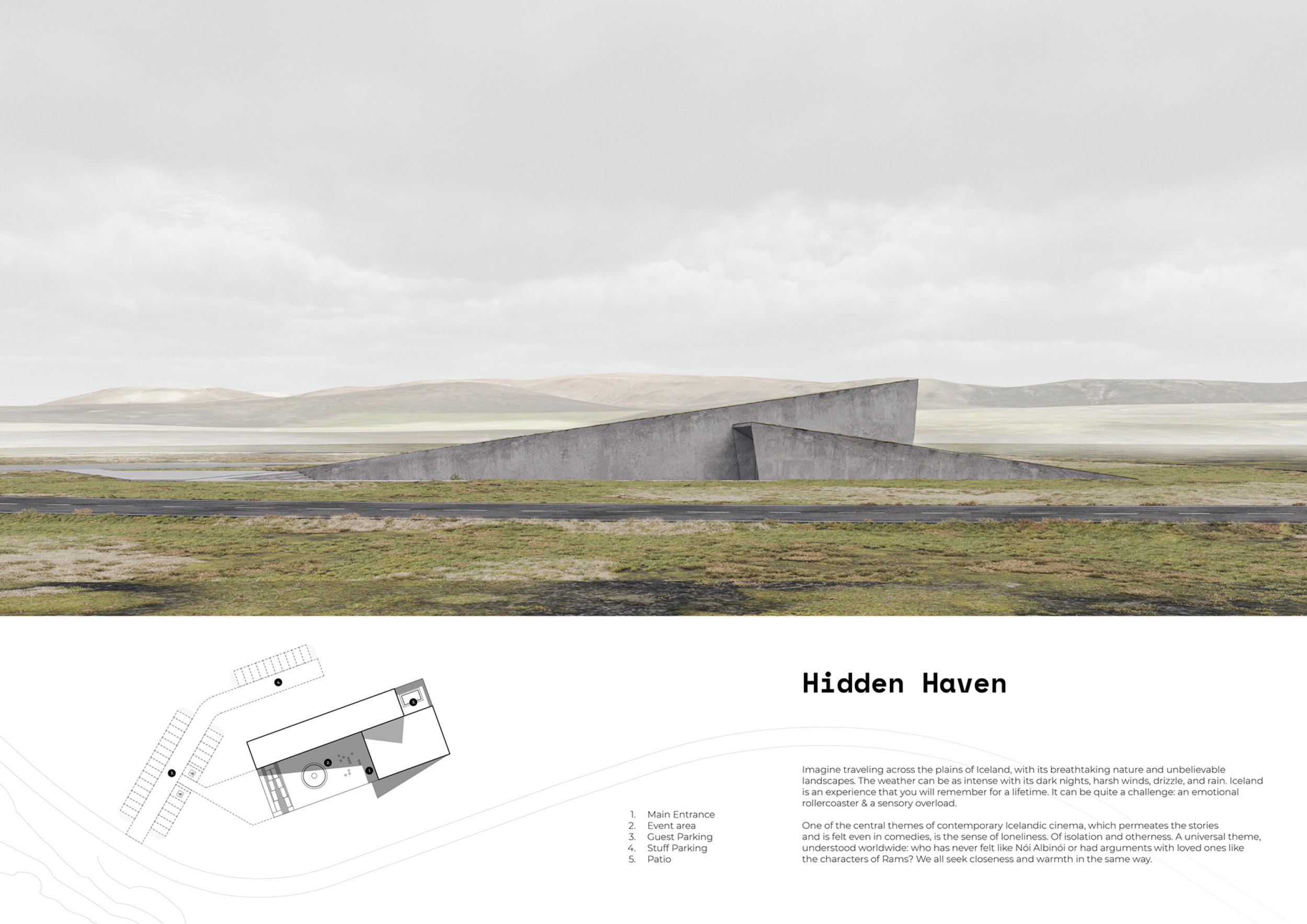 Hidden Haven draws from human isolation and loneliness and the search for comfort and warmth, a theme often present in film. The pavilion is designed as a safe shelter (similar to the nearby caves), a solid construction amidst a stark and harsh landscape, and above all a welcoming place for the sharing of common stories by filmmakers. The pavilion is split into two blocks of different sizes - one a cinema hall, the other a cafe and exhibition space. Read more The blocks are sunken within the earth and emerge from the landscape as if mountains, directed in opposing directions to offer views of the surrounding landscape.