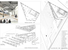 The author has successfully found a solution for taking advantage of a four-sheet presentation with large, clear images which guide hierarchy, balance and visual appeal. The site plan on the second sheet is especially strong and stands out from the many other presentations received. There are four recommendations to improve the presentation. Read more The first concerns the building plan and section on the third sheet - the author would benefit from more varied line weights to describe cut versus projection lines. As drawn there is no hierarchy among the lines making the drawings relatively difficult to read. The second point concerns the use of text - as with many presentations we recommend this be made as concise as possible. Given many submissions are received, a juror will only read such lengthy text in full if it is determined the submission is among the strongest and one which requires an especially detailed review. The third recommendation is to include a more detailed analysis and design of the timber envelope, which the project certainly lacks. The last point concerns the final rendering. The author would benefit from additional detail and a ‘crisper image’ To achieve this the author might consider lightening the image so it is not so somber.