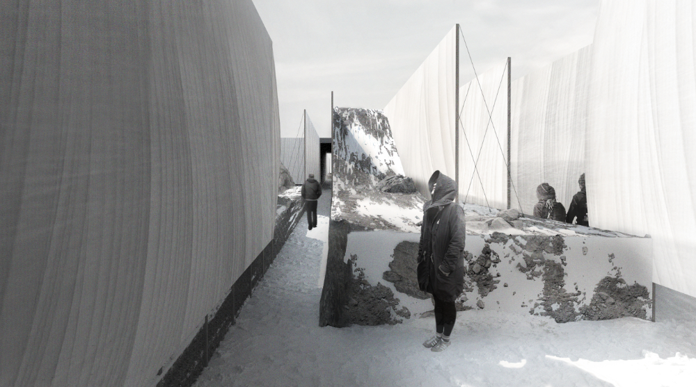 Third prize winners Viktoriia Savchenko, Oleksandra Zavada, Khrystyna Vus and Nikolay Dotsenko, from the Ukrainian company Balbek Bureau, designed a pavilion split into two spaces, sunken into the earth and emerging from the landscape as if part of the mountains.
