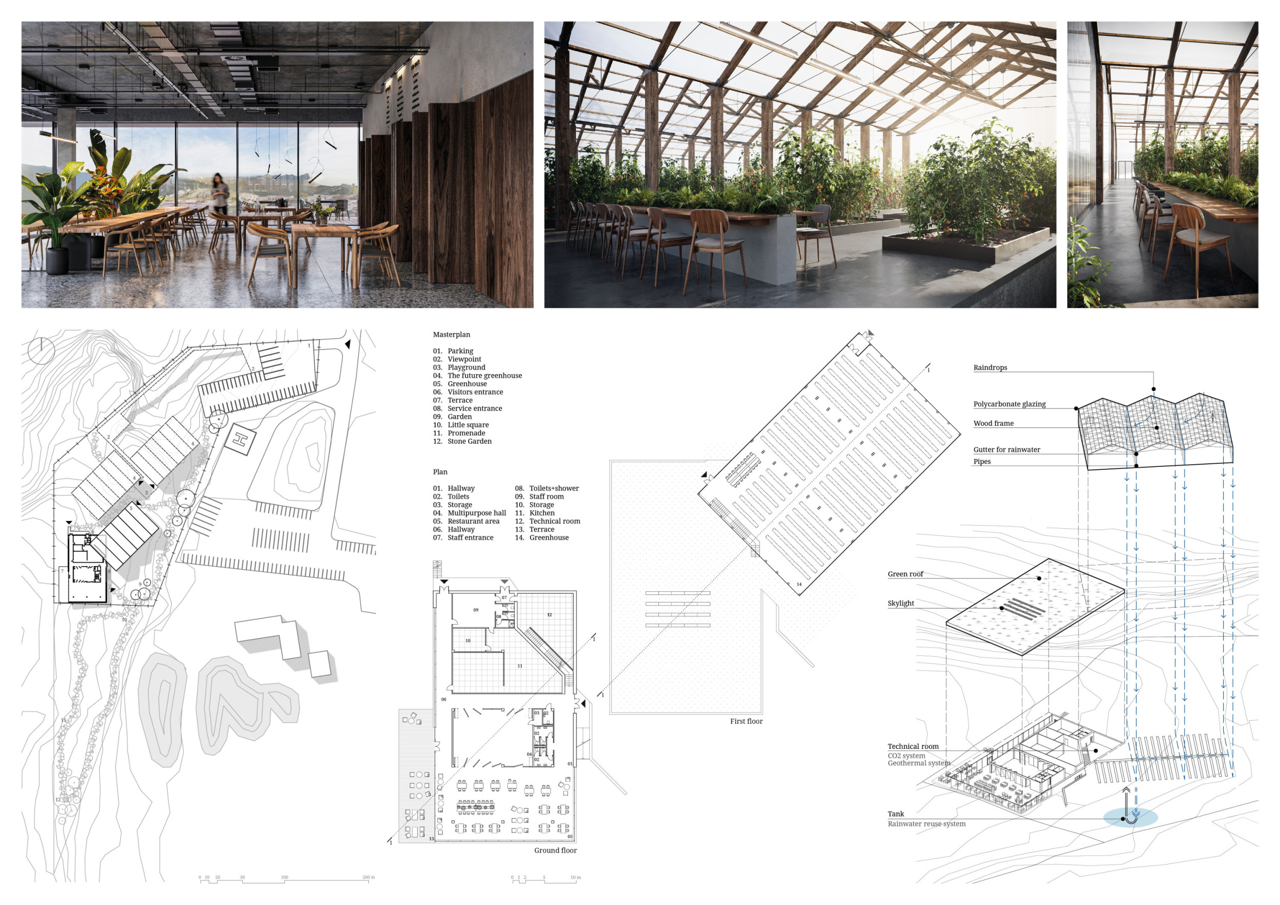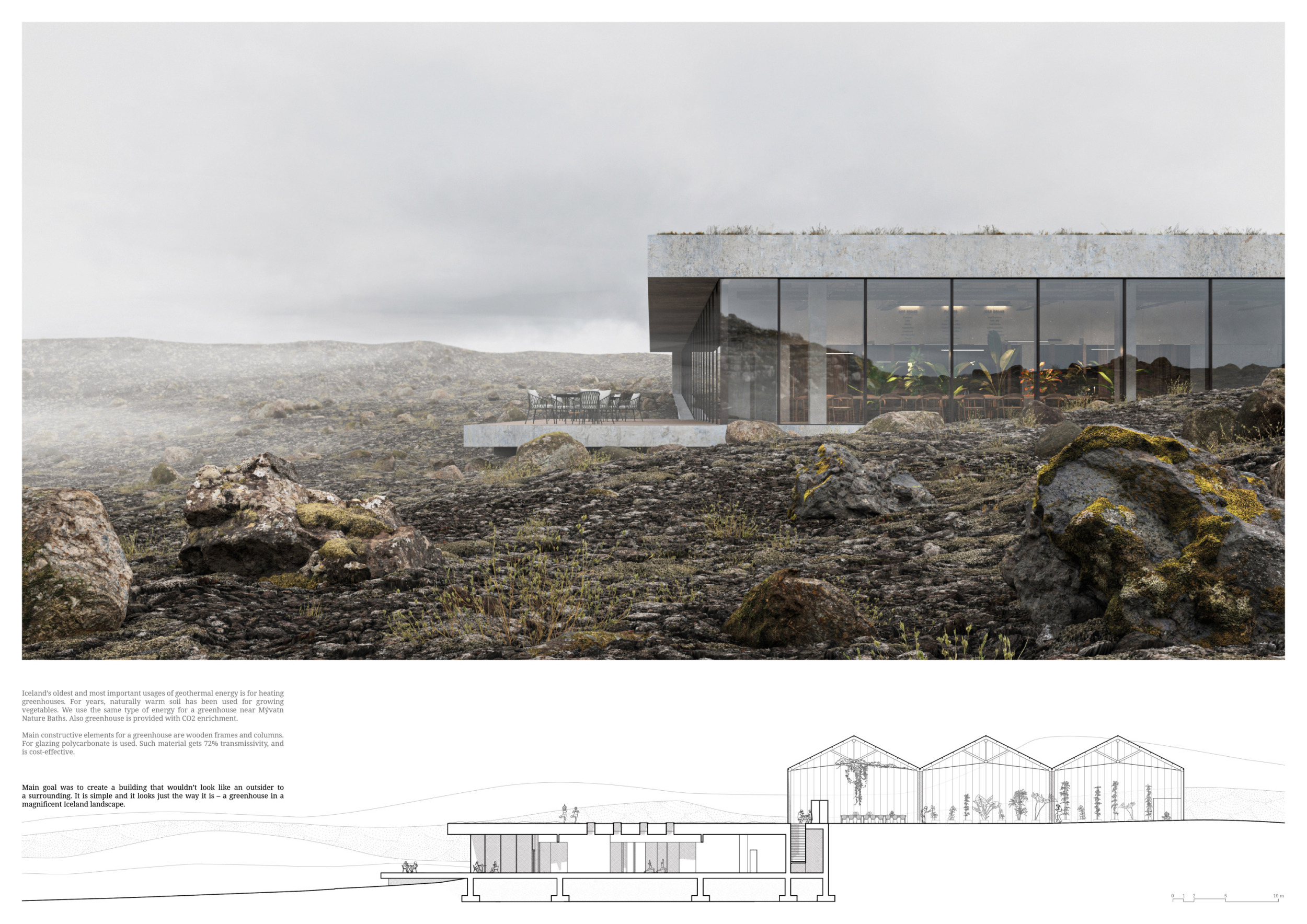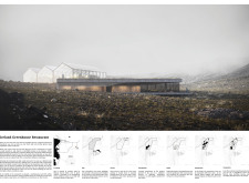 How We Do/What We Do is based on the use of local materials. It takes a triangulated building form vernacular to Iceland and extrudes it along the site. The single mass is divided into two parts, one opaque to contain the restaurant, and the other glazed to enclose the farming program. Its plan is linear and its construction method is practical for its location.