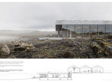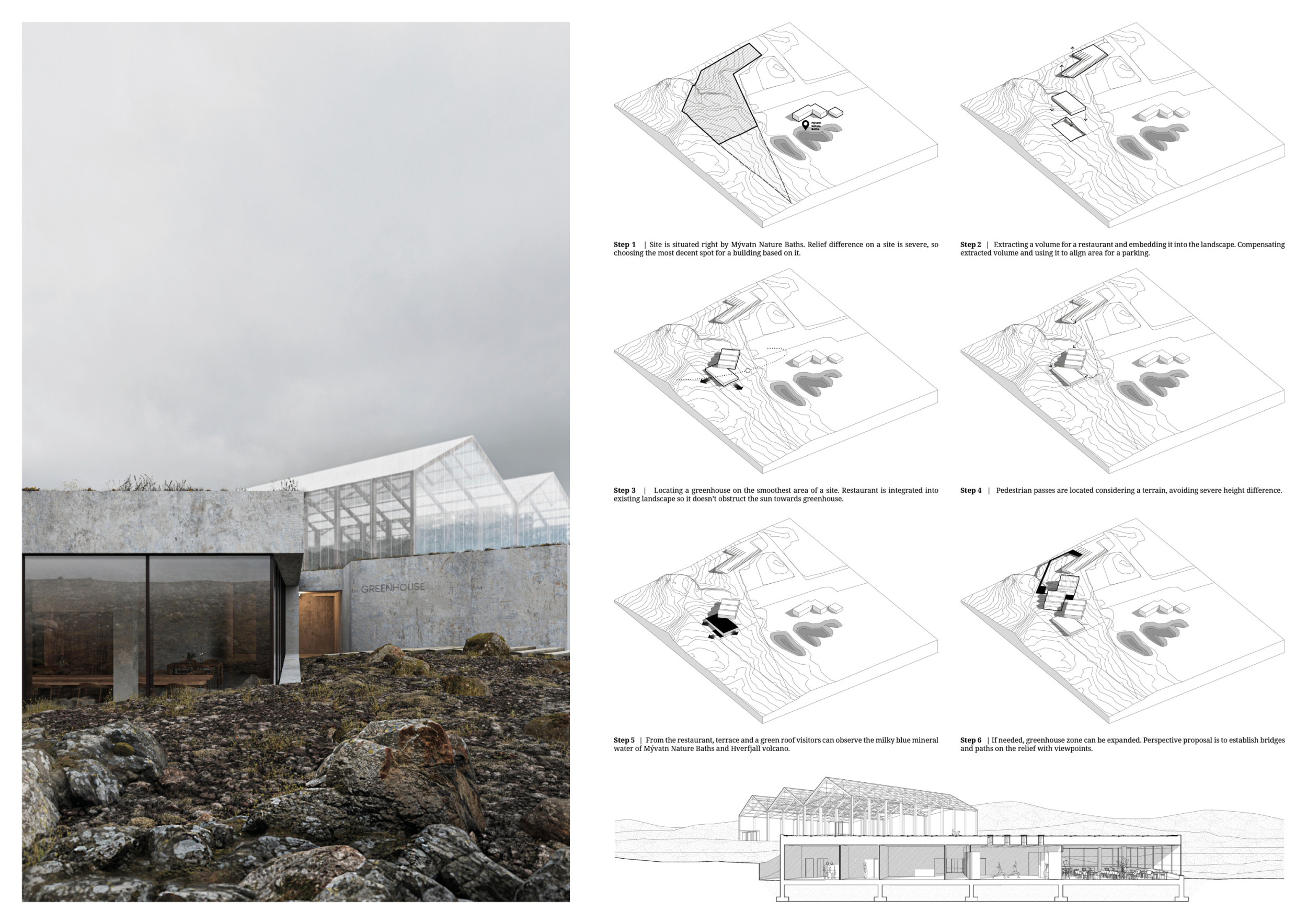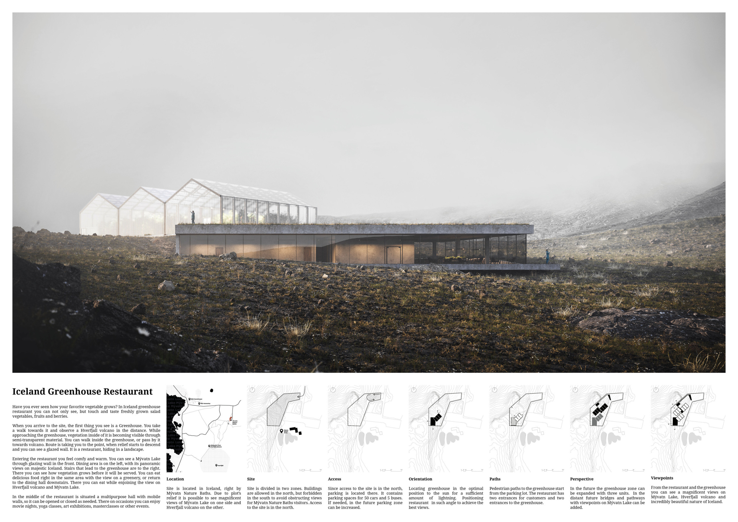 For this competition, participants were tasked with designing a greenhouse concept restaurant. With fresh, locally grown foods scarce in Iceland, particularly during the winter months, this competition called for submissions to design a greenhouse that would also function as a dine-in restaurant. Such a greenhouse would allow Vogafjós Farm to grow salad vegetables, fruits, and berries that could then be served, offering the guests an immersive experience as well as locally-produced food. The brief sought sustainable designs to accommodate 100 guests and which included standard amenities: an appropriately-sized kitchen, storage facilities, and toilets. The owners expressed interest in developing a restaurant where customers could witness first-hand the processes of production, as well as including larger programs such as a multipurpose hall to be used for events like film showings and yoga classes.