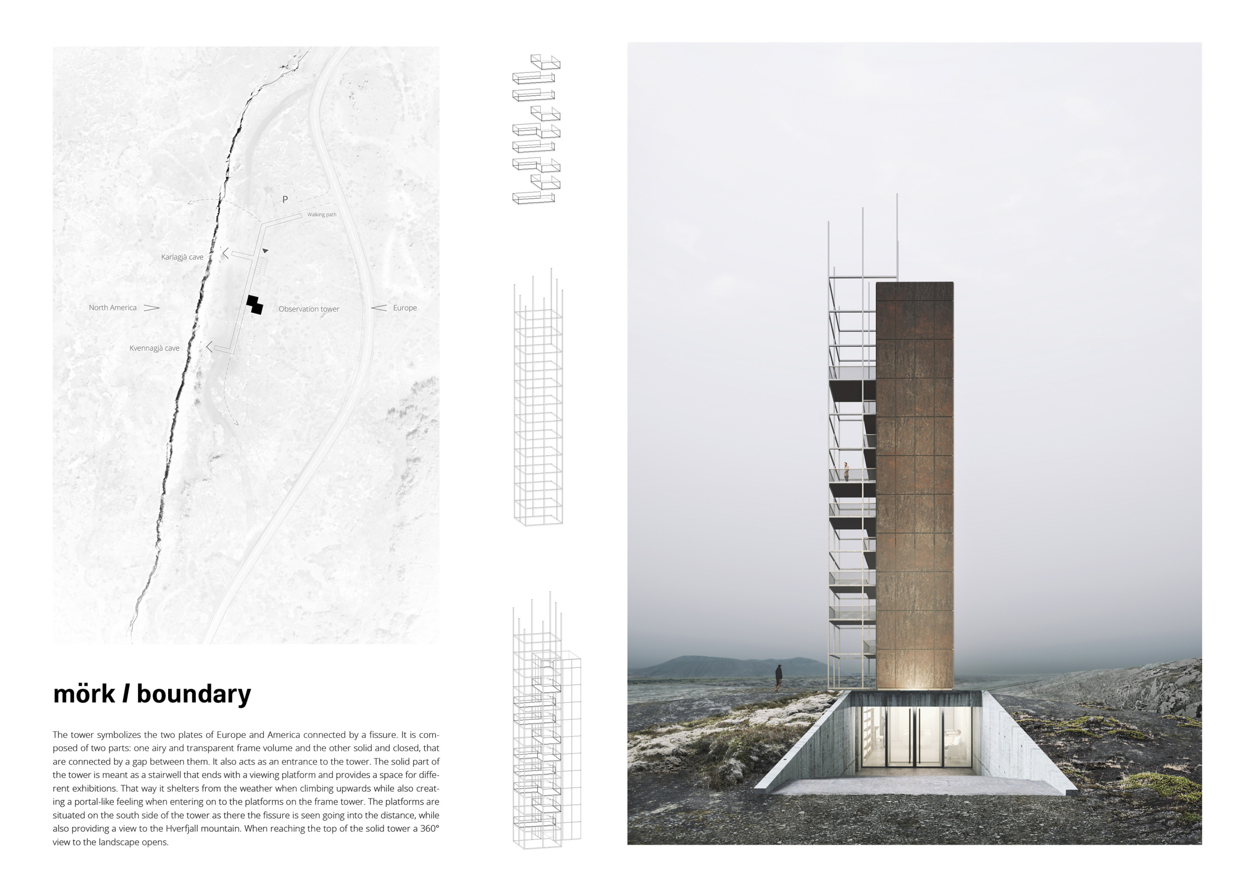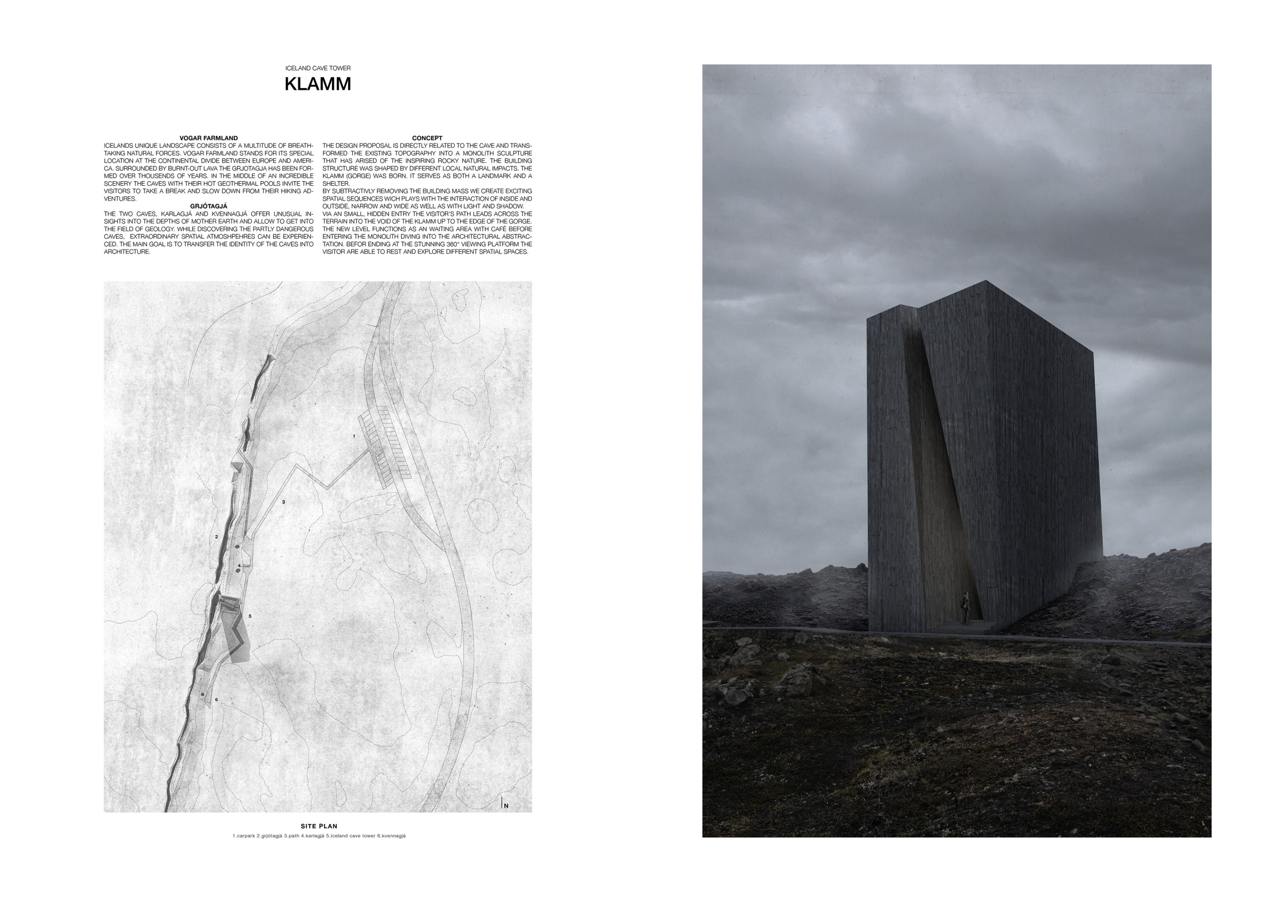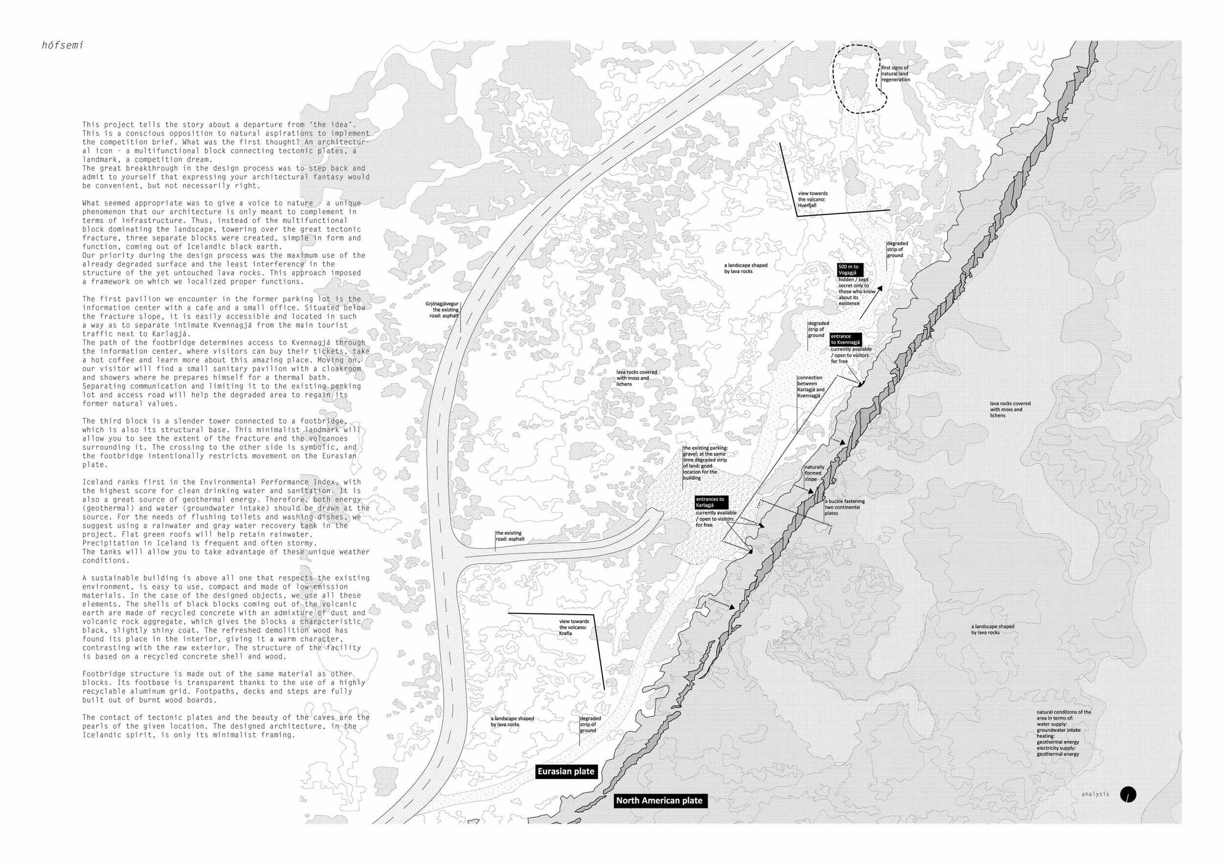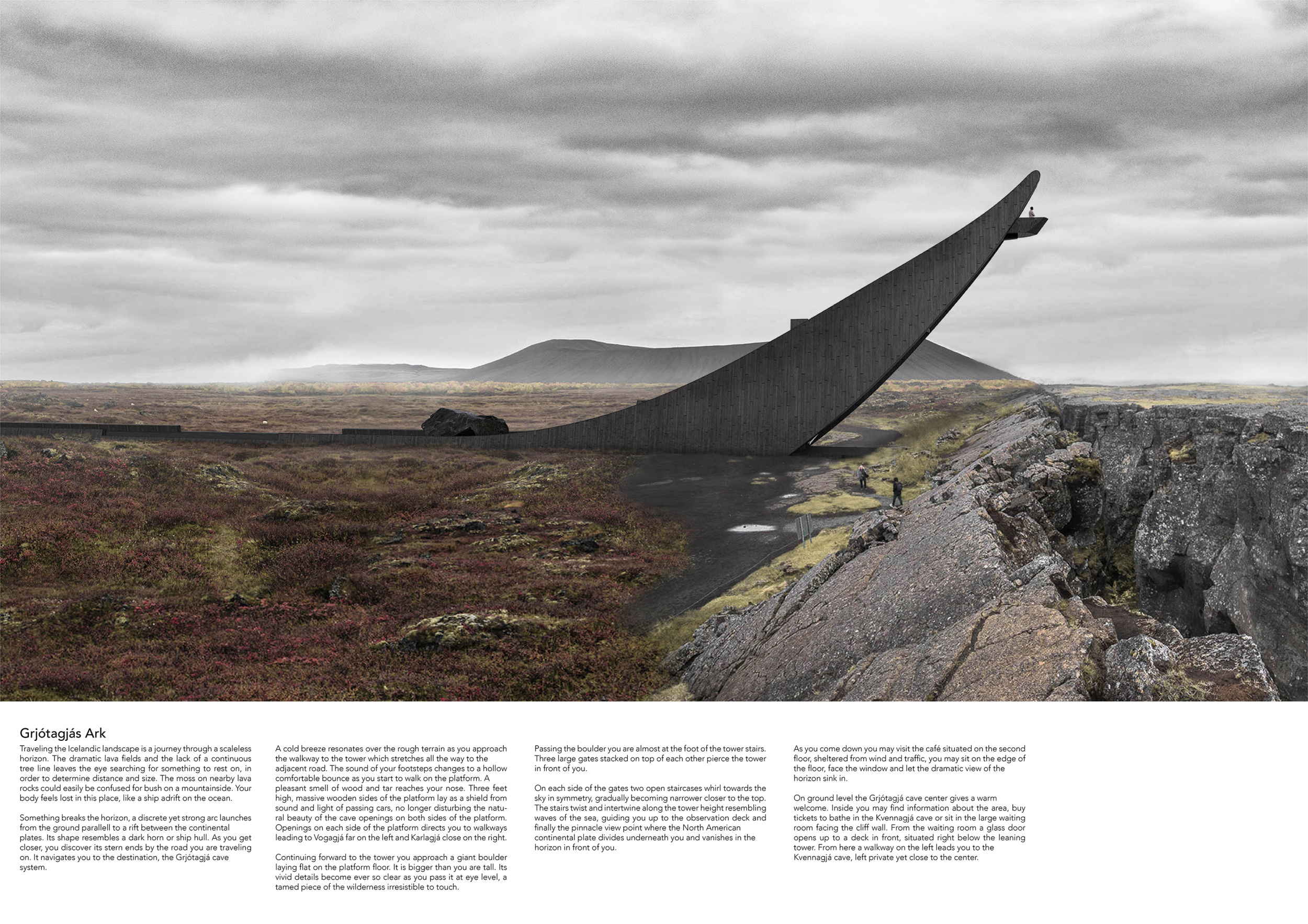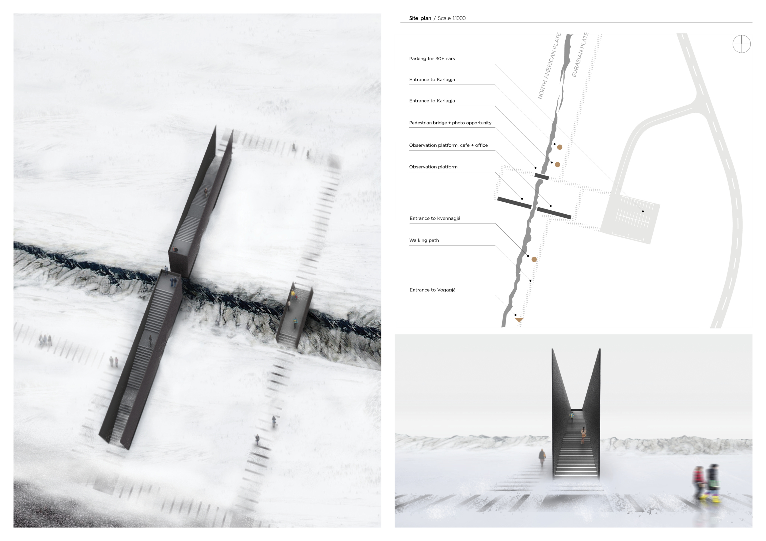 Participants were tasked with submitting proposals for an observation point accommodating a small visitor center on the farmland’s site overlooking Vogagjá – a spectacular ground fissure resulting from seismic activity. The fissure is especially significant as a marker of the boundary between the two tectonic plates of the European and North American continents.