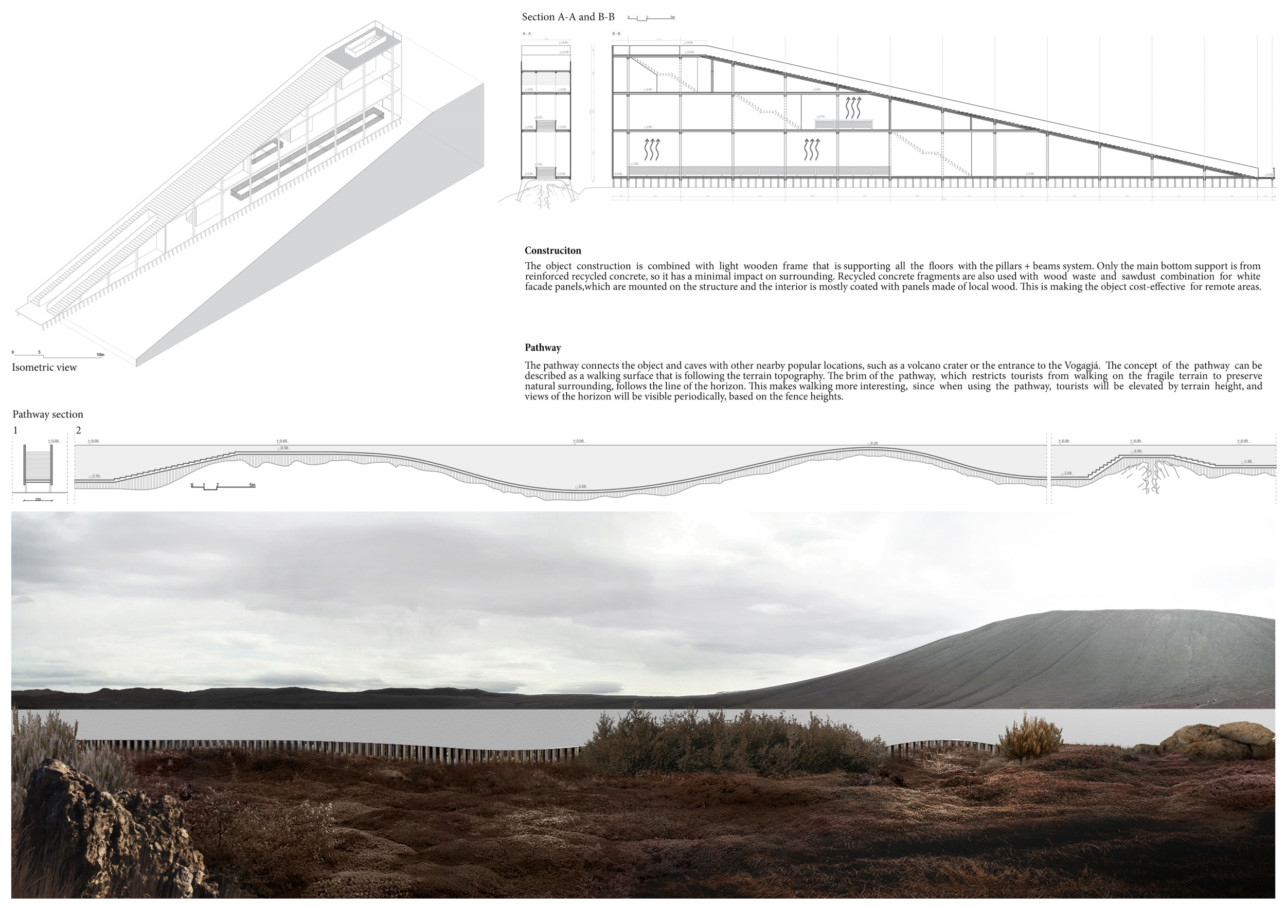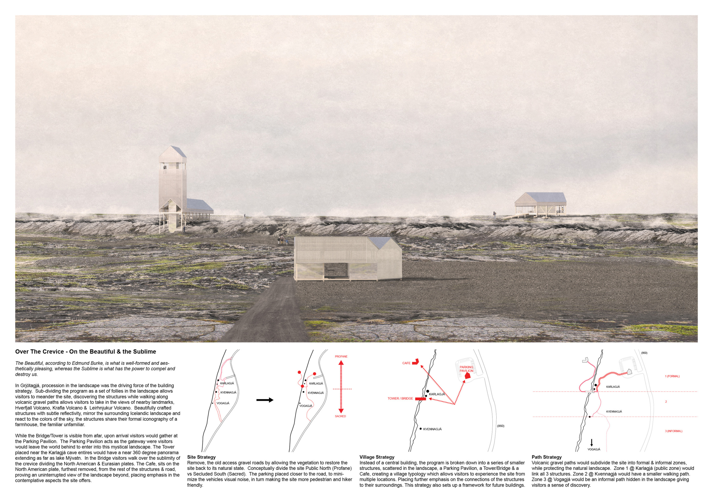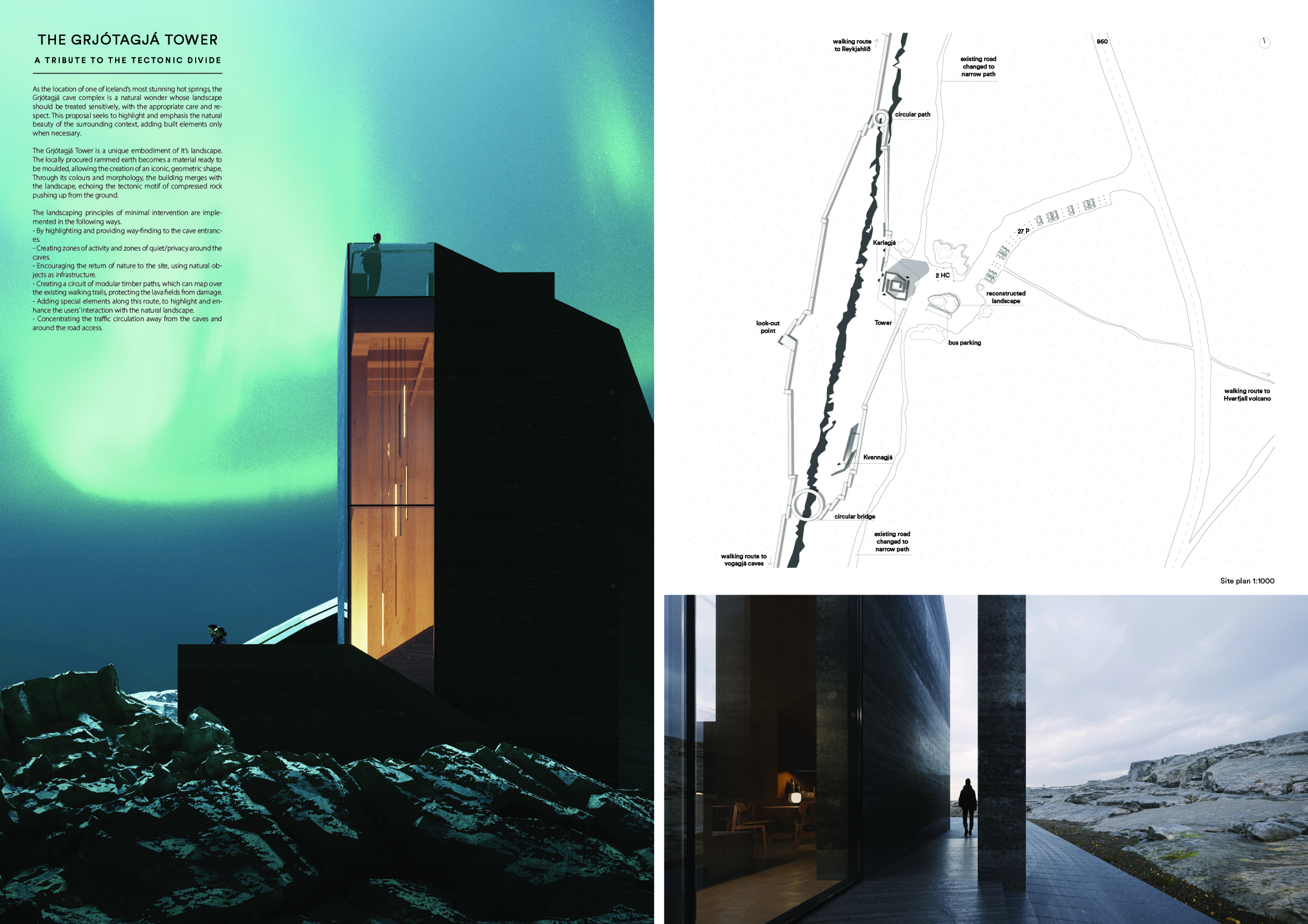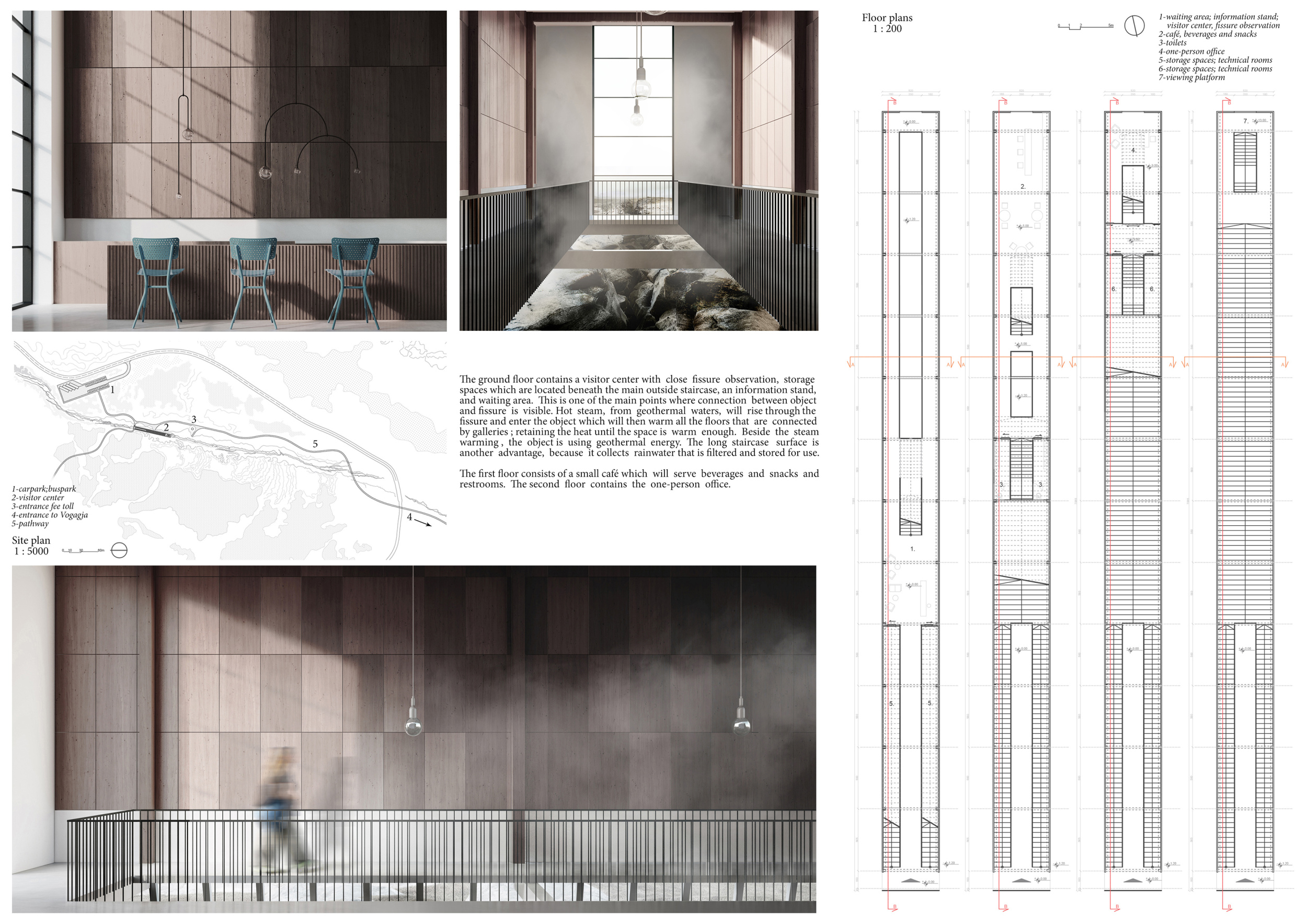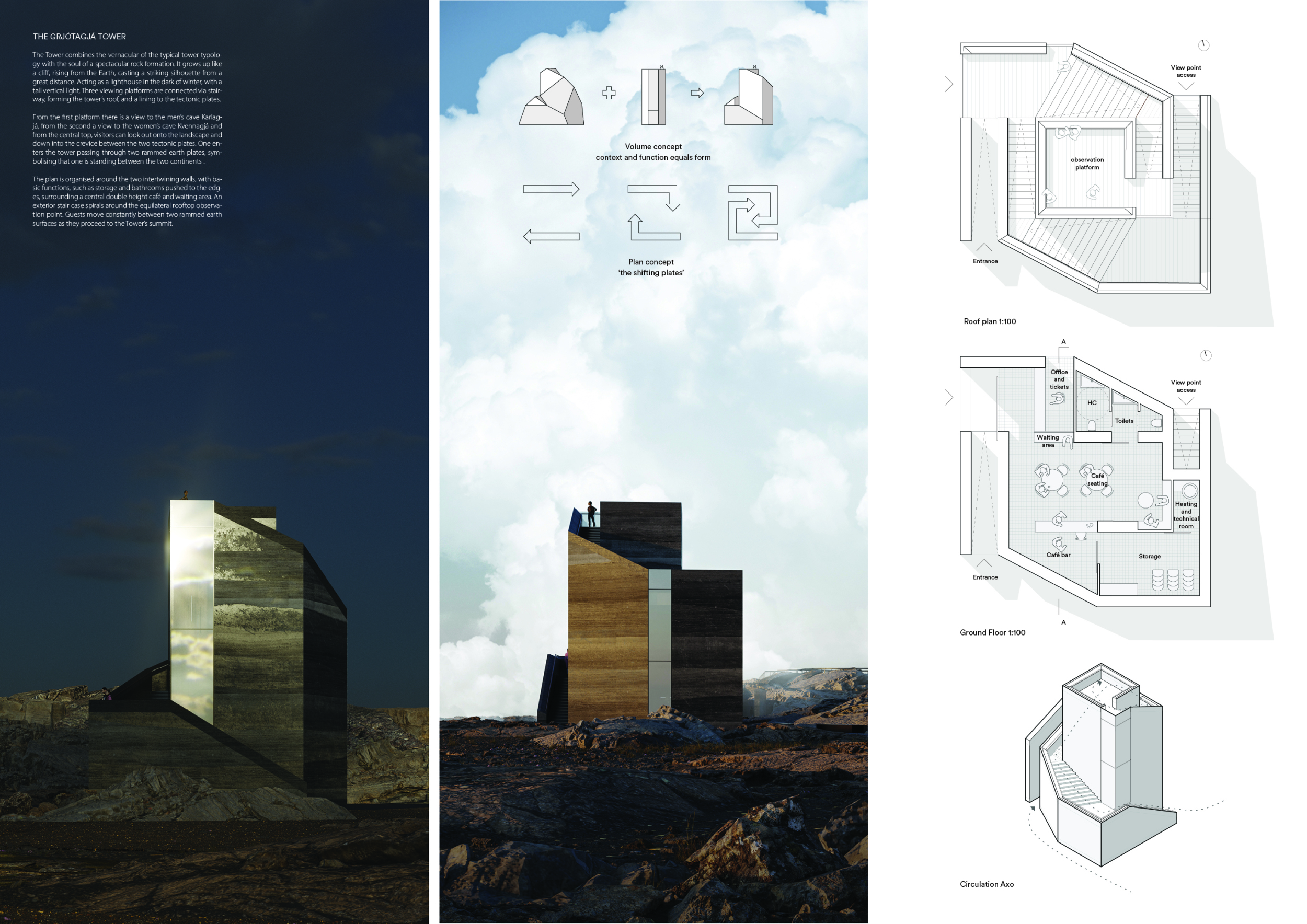 Participants were tasked with submitting proposals for an observation point accommodating a small visitor center on the farmland’s site overlooking Vogagjá – a spectacular ground fissure resulting from seismic activity. The fissure is especially significant as a marker of the boundary between the two tectonic plates of the European and North American continents.