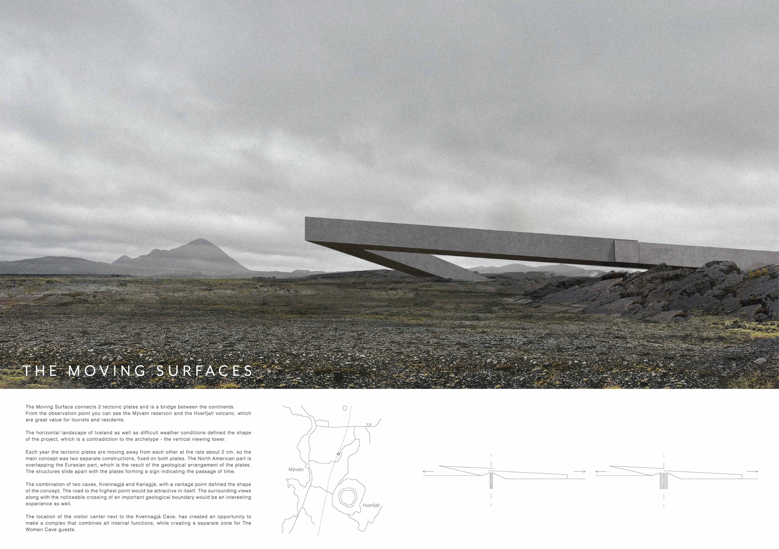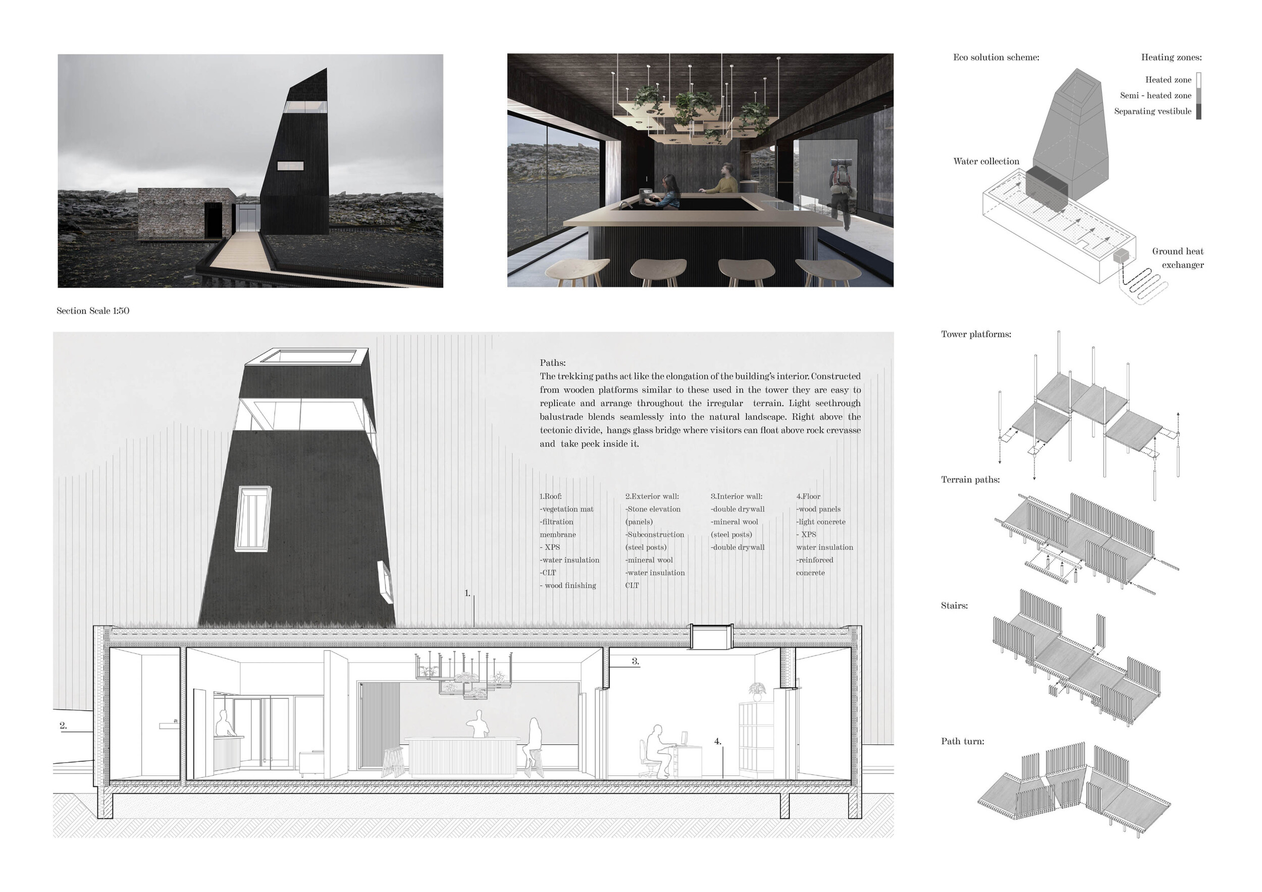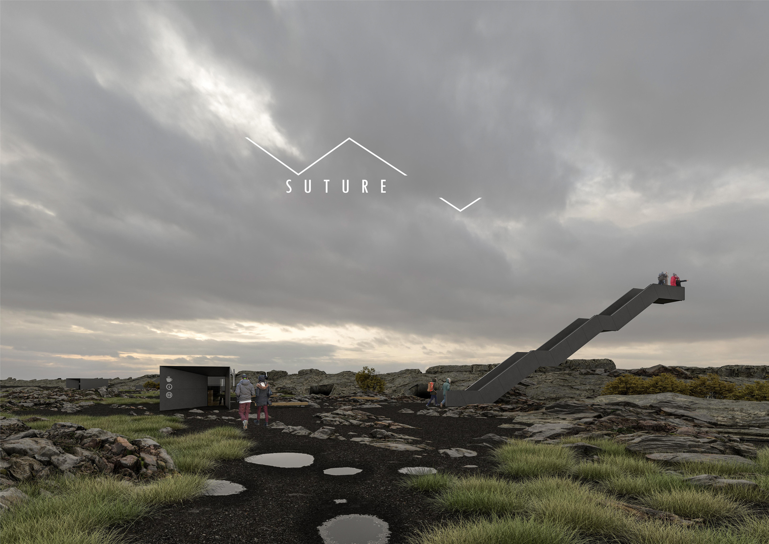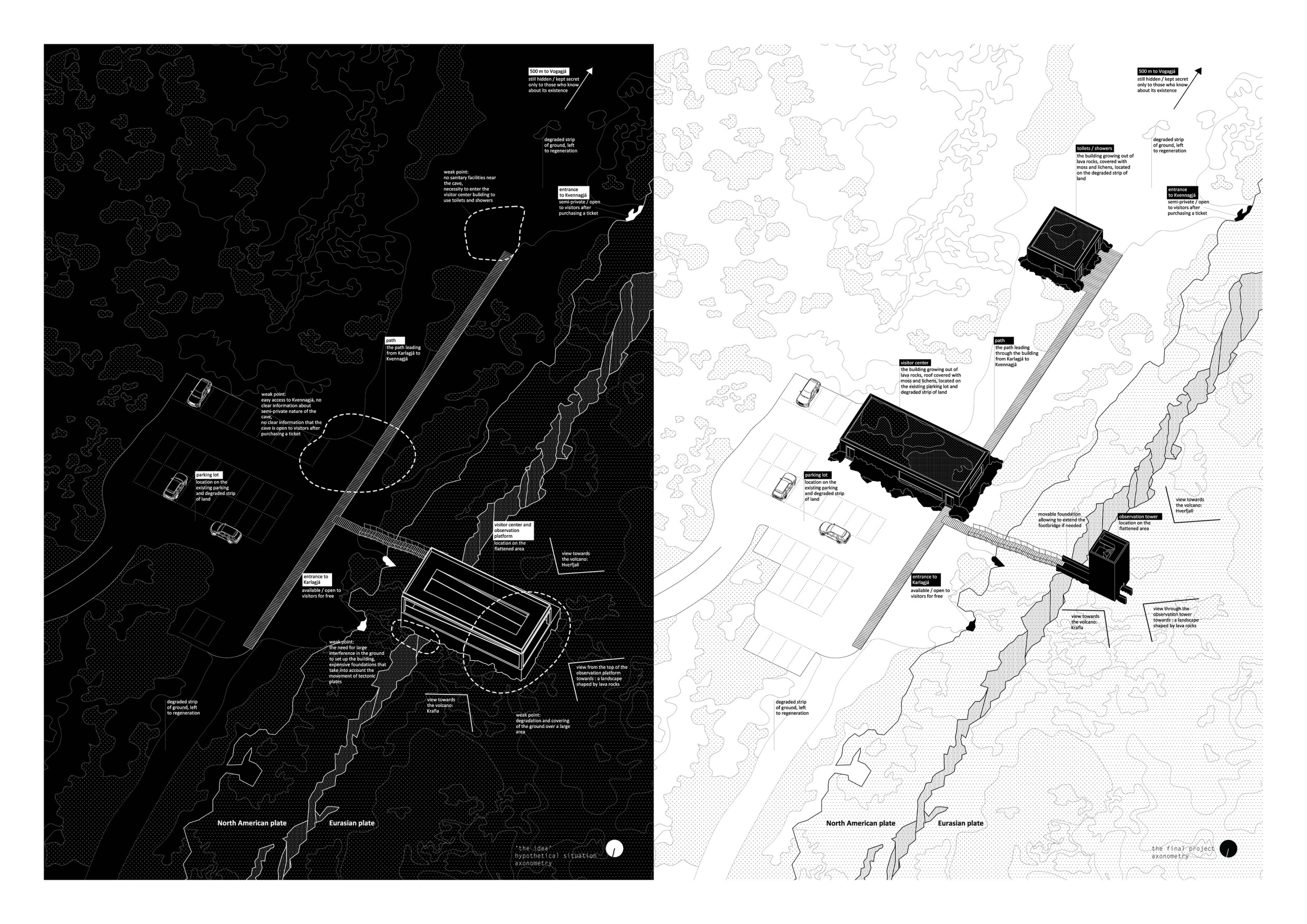 Participants were tasked with submitting proposals for an observation point accommodating a small visitor center on the farmland’s site overlooking Vogagjá – a spectacular ground fissure resulting from seismic activity. The fissure is especially significant as a marker of the boundary between the two tectonic plates of the European and North American continents.