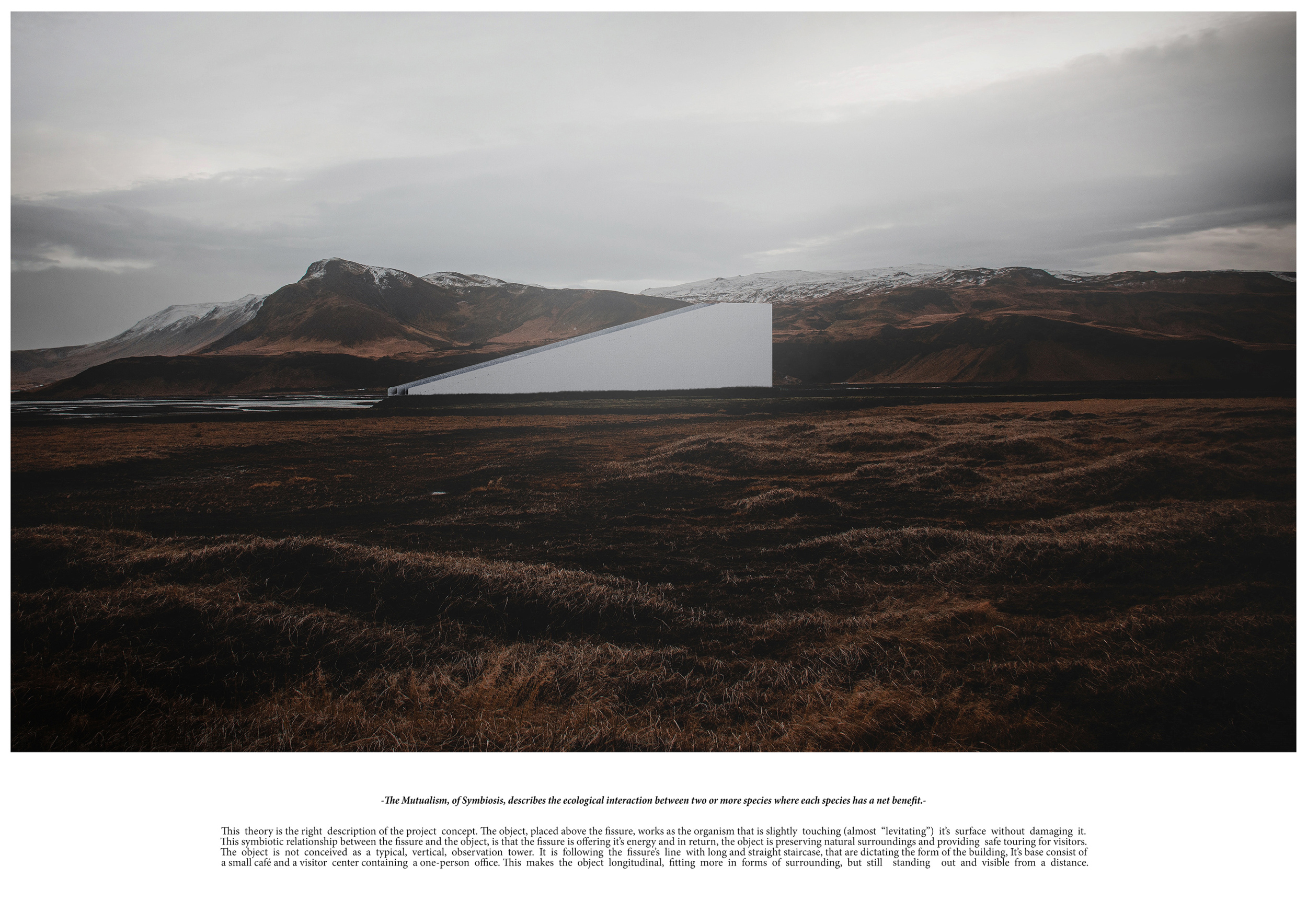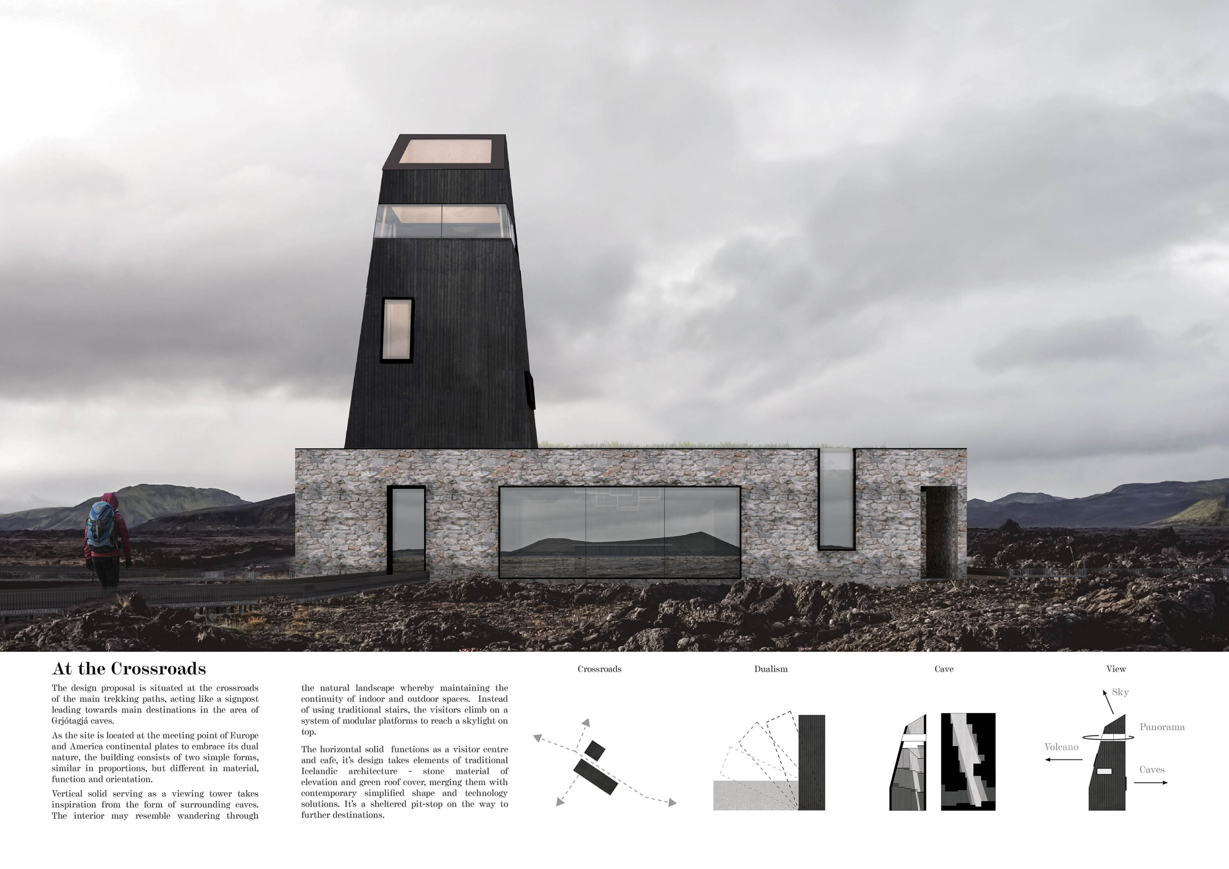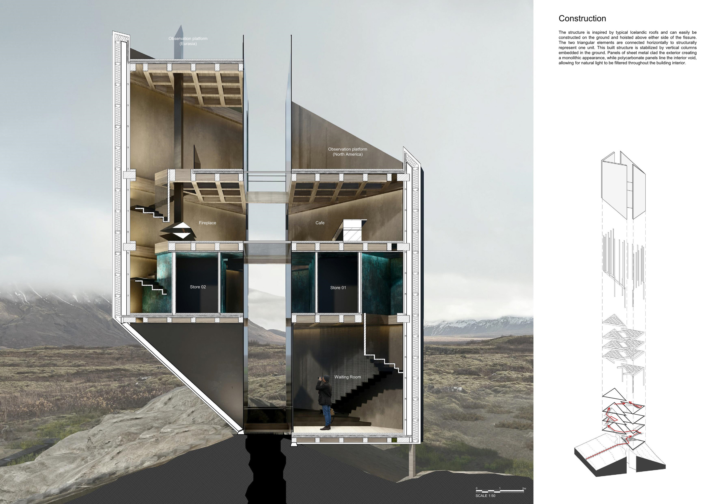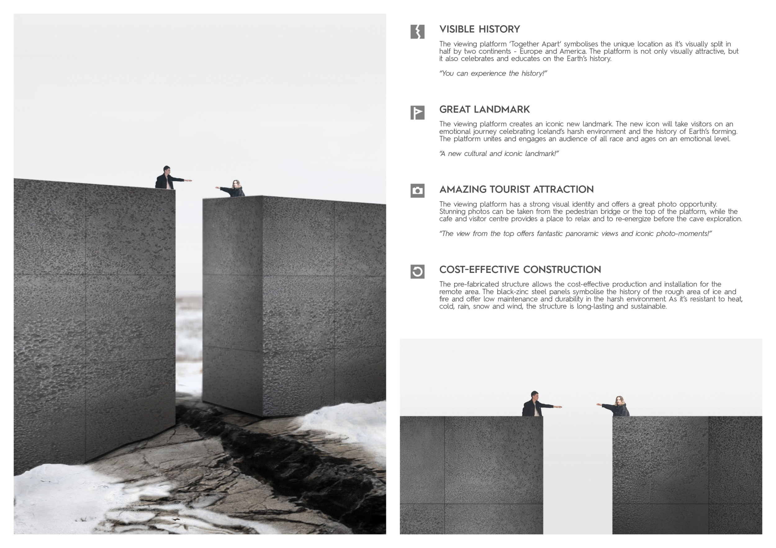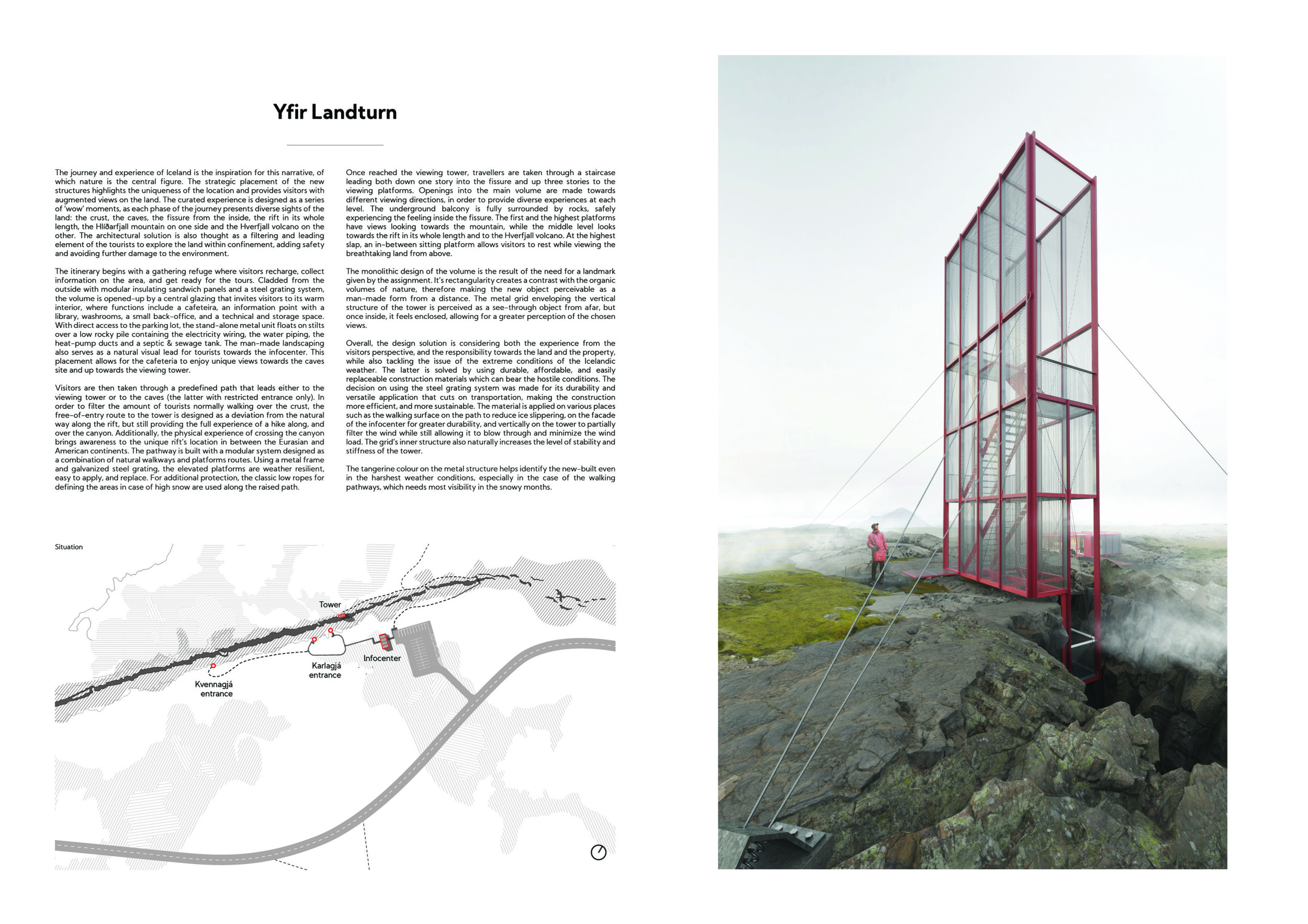 Participants were tasked with submitting proposals for an observation point accommodating a small visitor center on the farmland’s site overlooking Vogagjá – a spectacular ground fissure resulting from seismic activity. The fissure is especially significant as a marker of the boundary between the two tectonic plates of the European and North American continents.