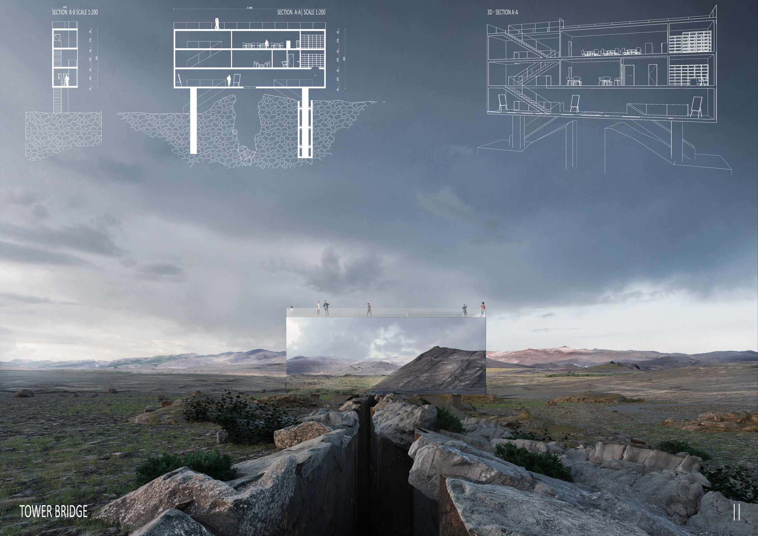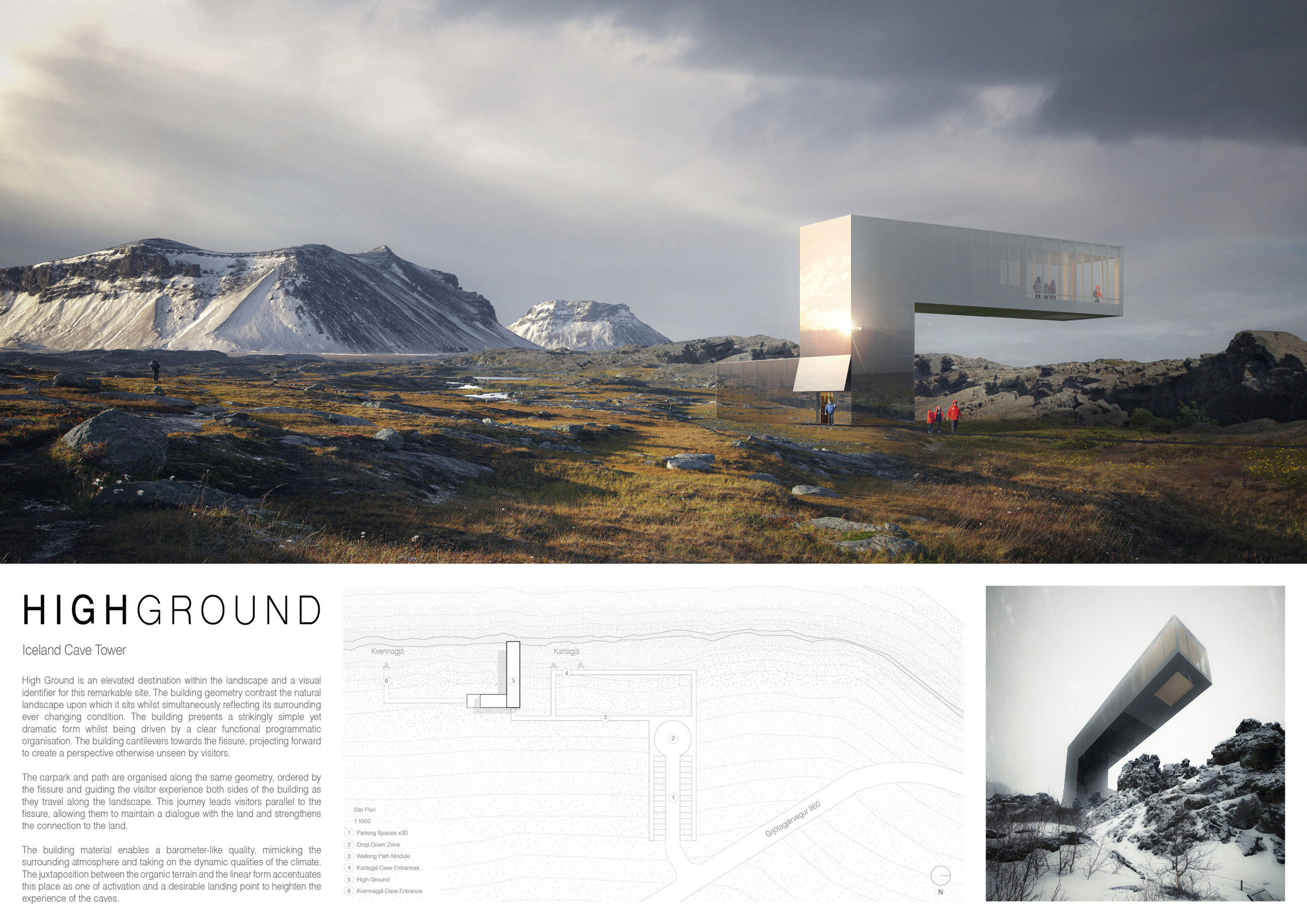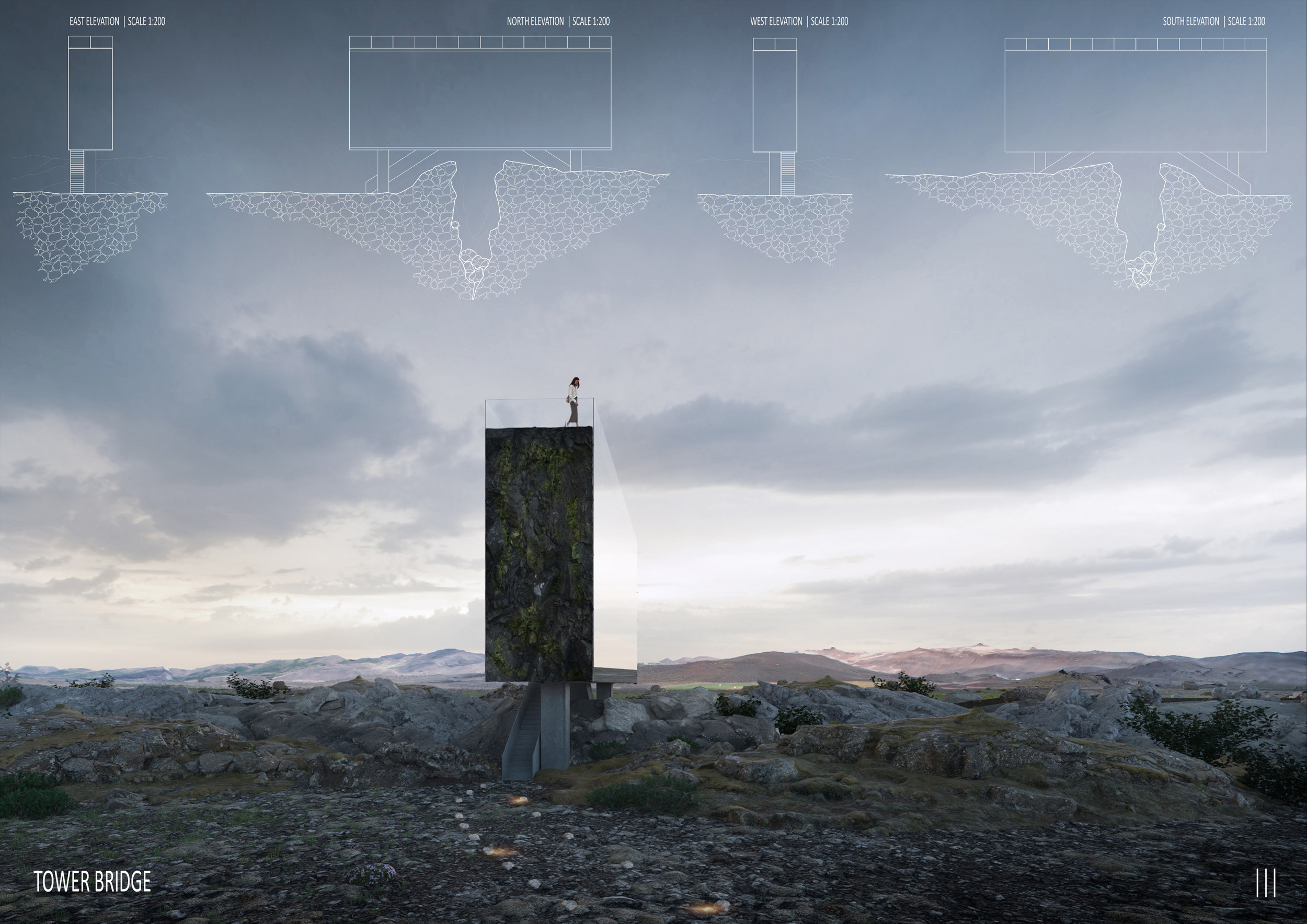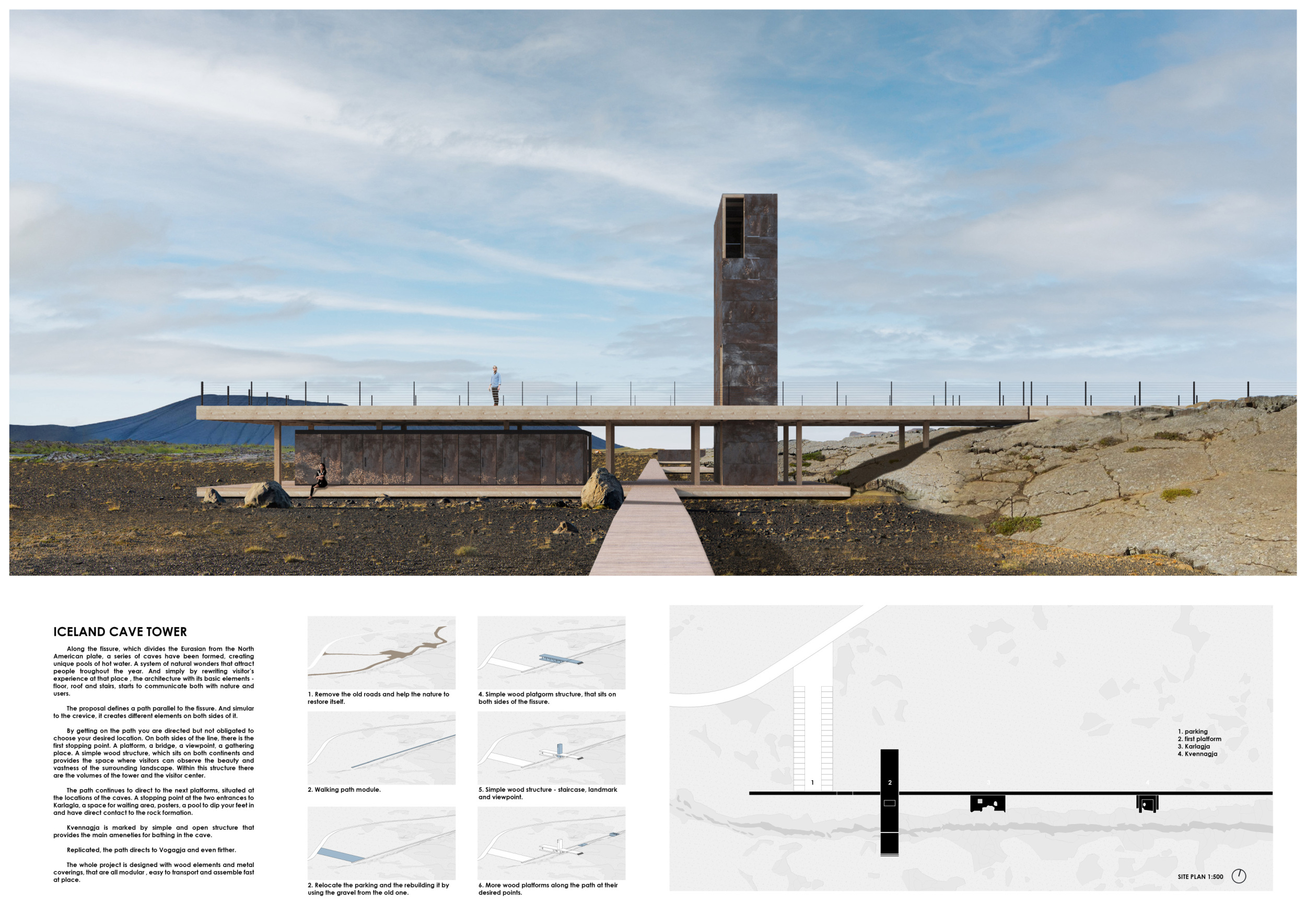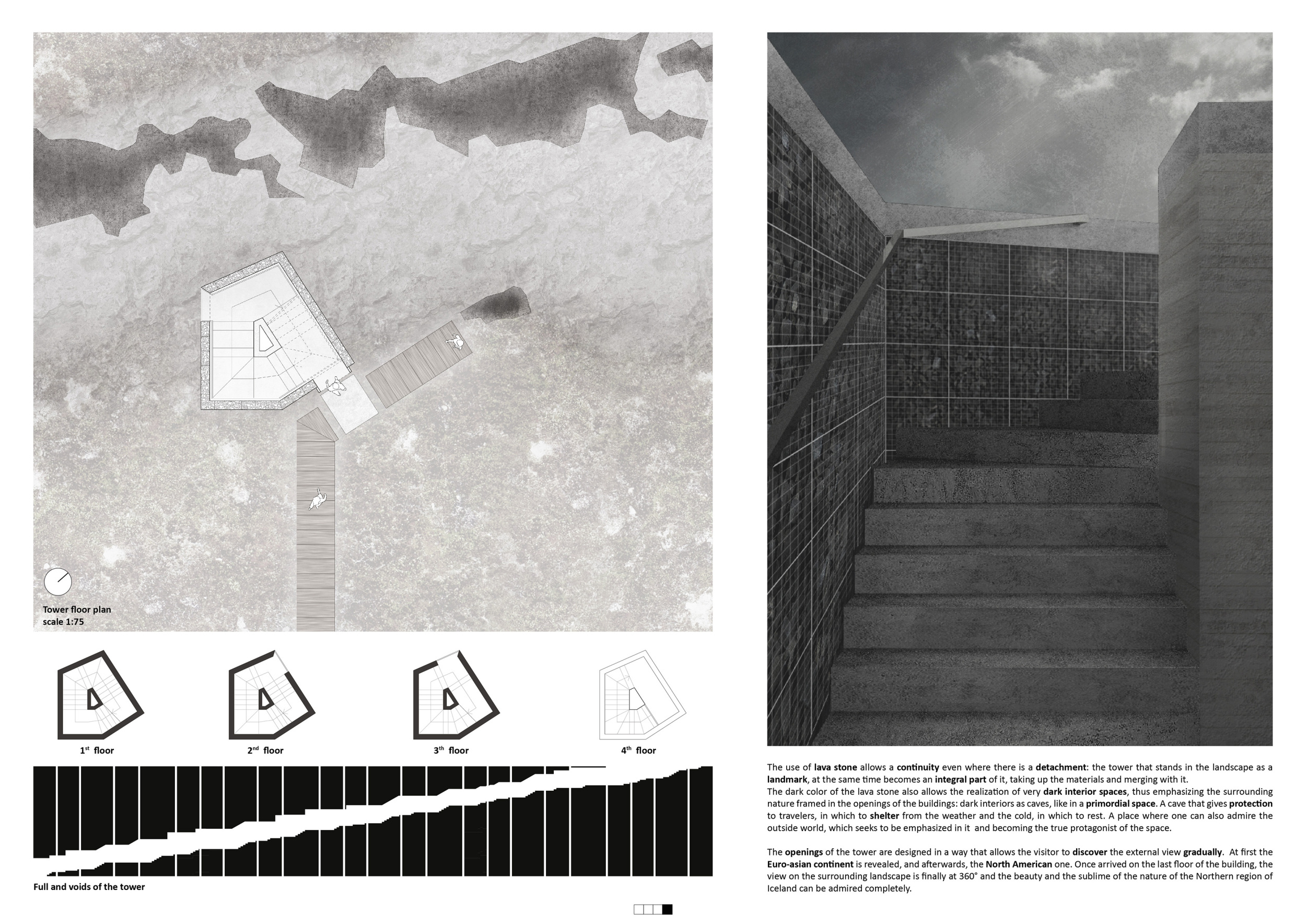 Participants were tasked with submitting proposals for an observation point accommodating a small visitor center on the farmland’s site overlooking Vogagjá – a spectacular ground fissure resulting from seismic activity. The fissure is especially significant as a marker of the boundary between the two tectonic plates of the European and North American continents.