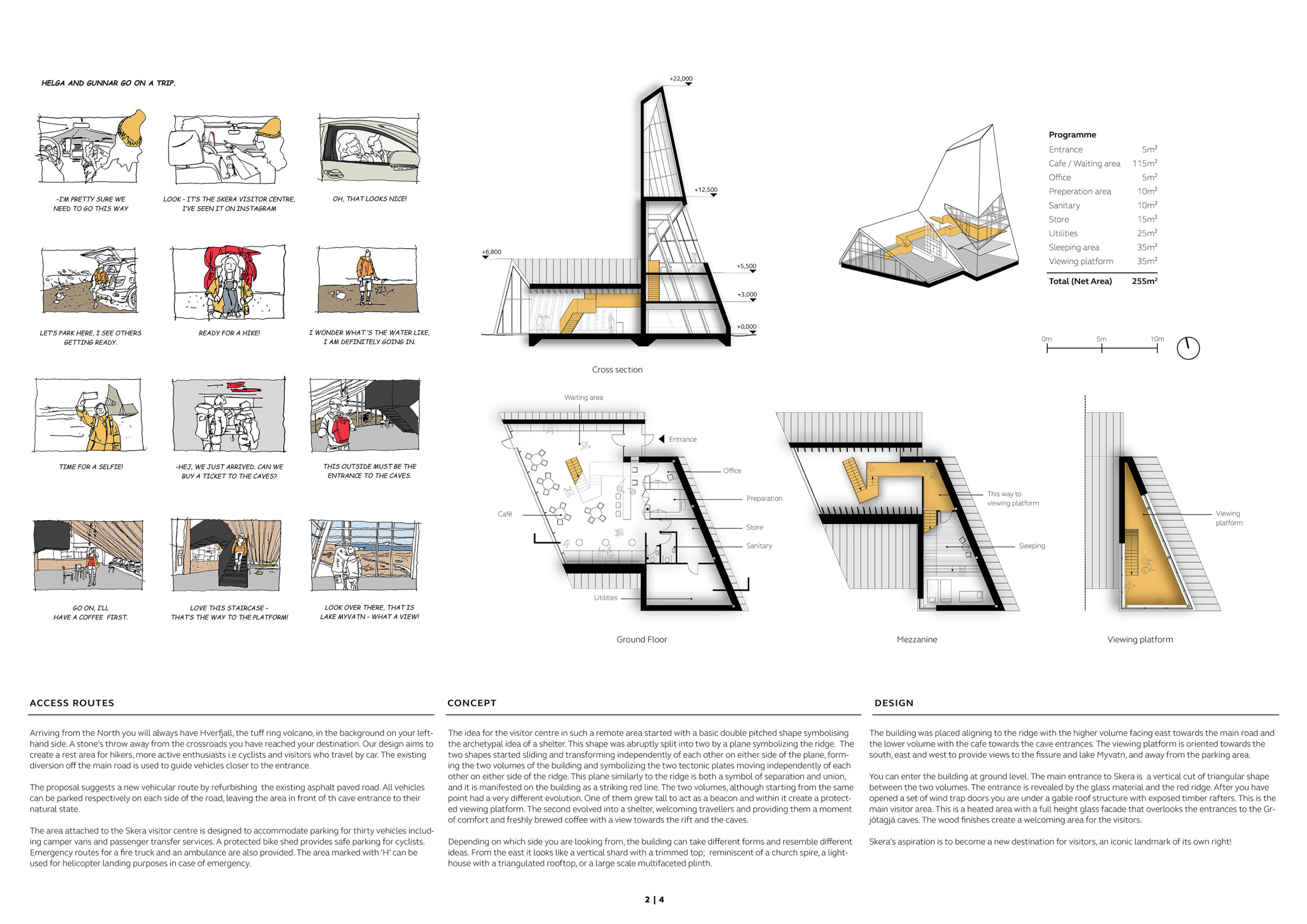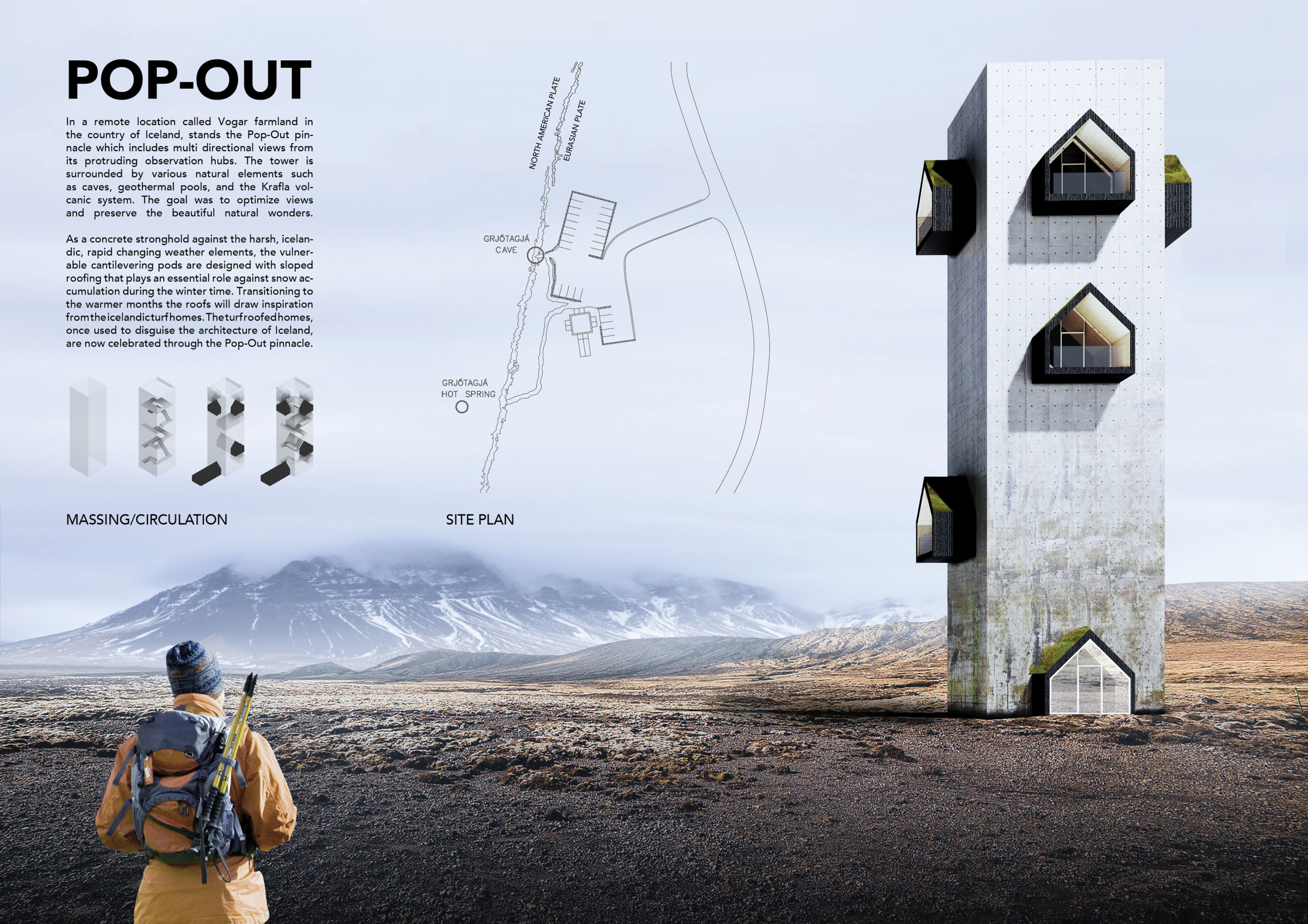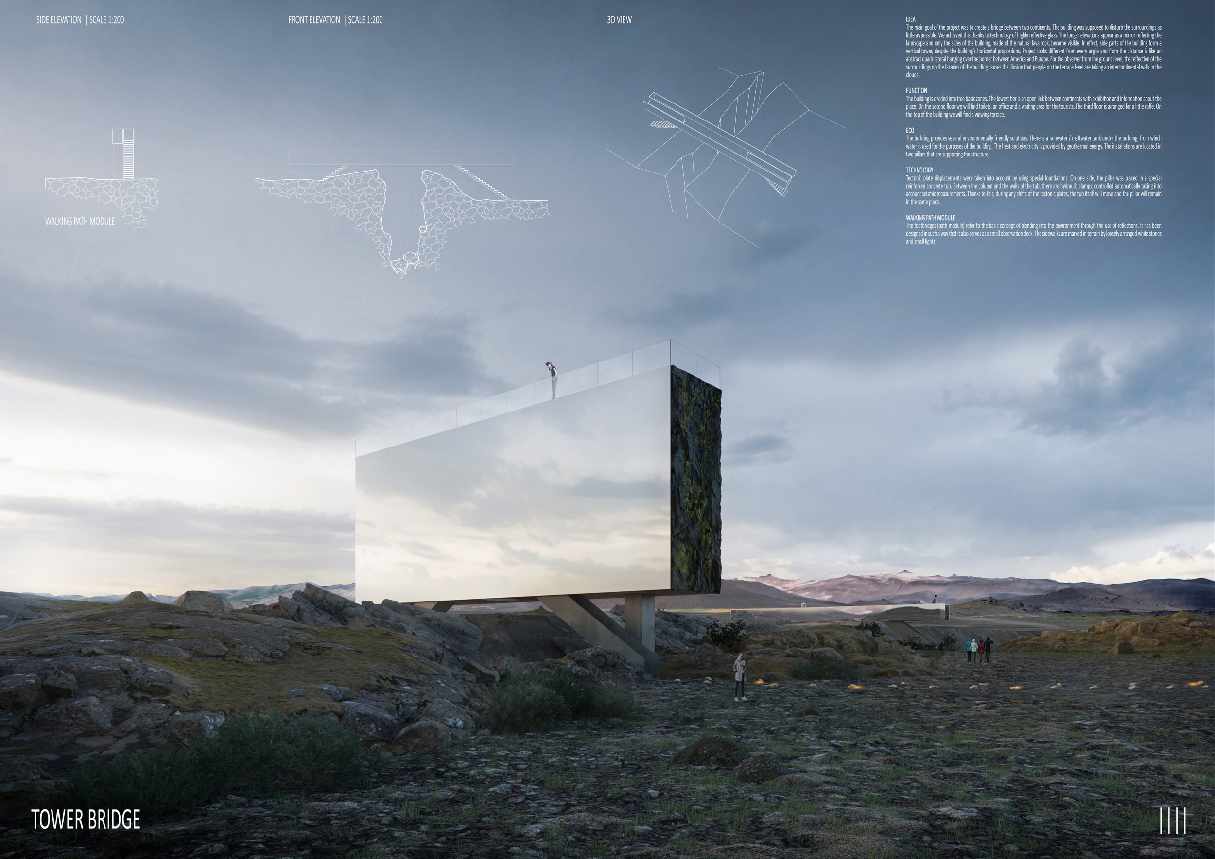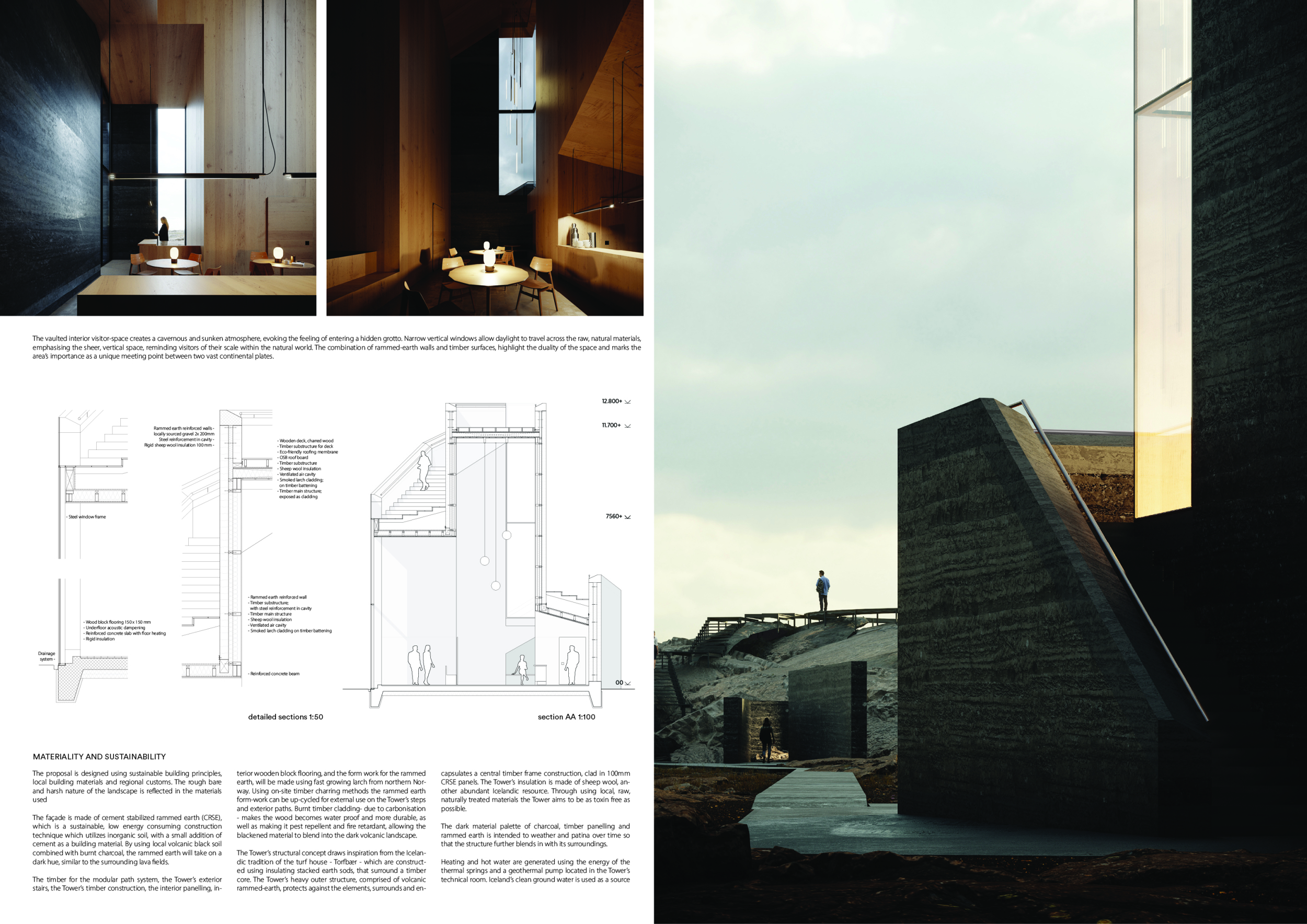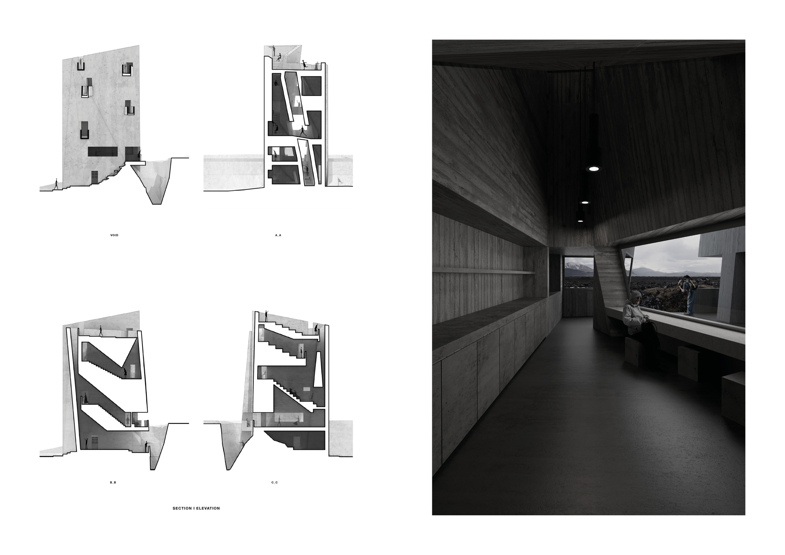 Participants were tasked with submitting proposals for an observation point accommodating a small visitor center on the farmland’s site overlooking Vogagjá – a spectacular ground fissure resulting from seismic activity. The fissure is especially significant as a marker of the boundary between the two tectonic plates of the European and North American continents.