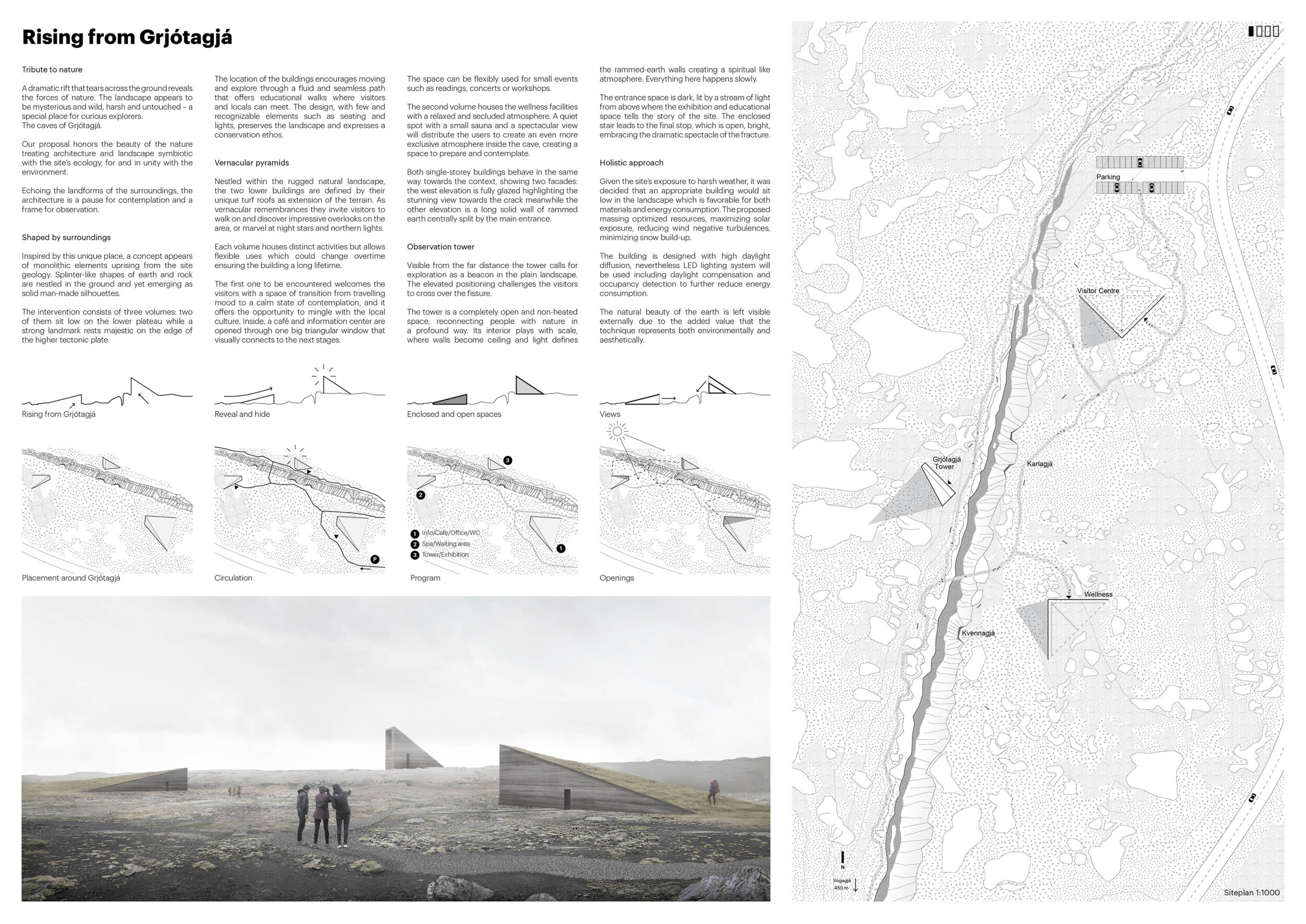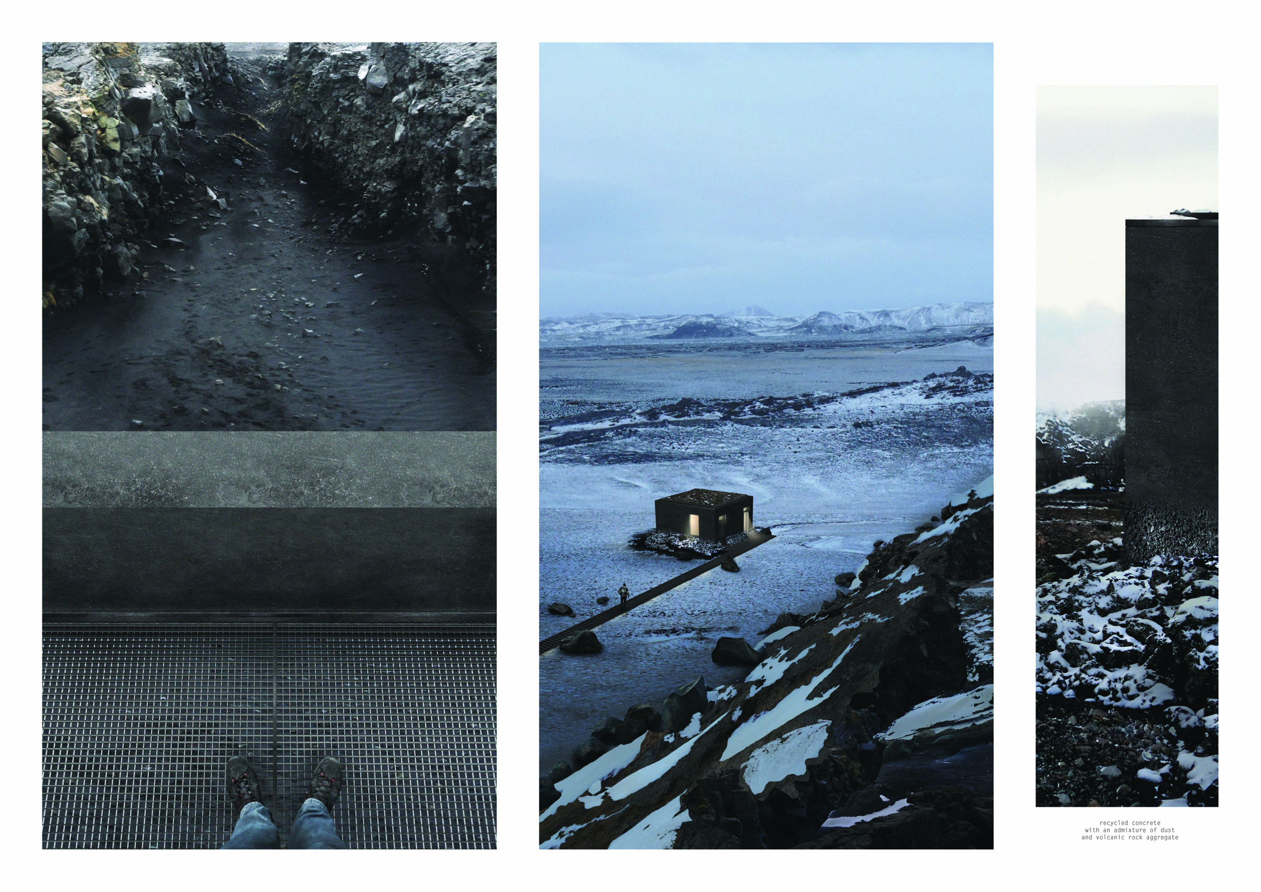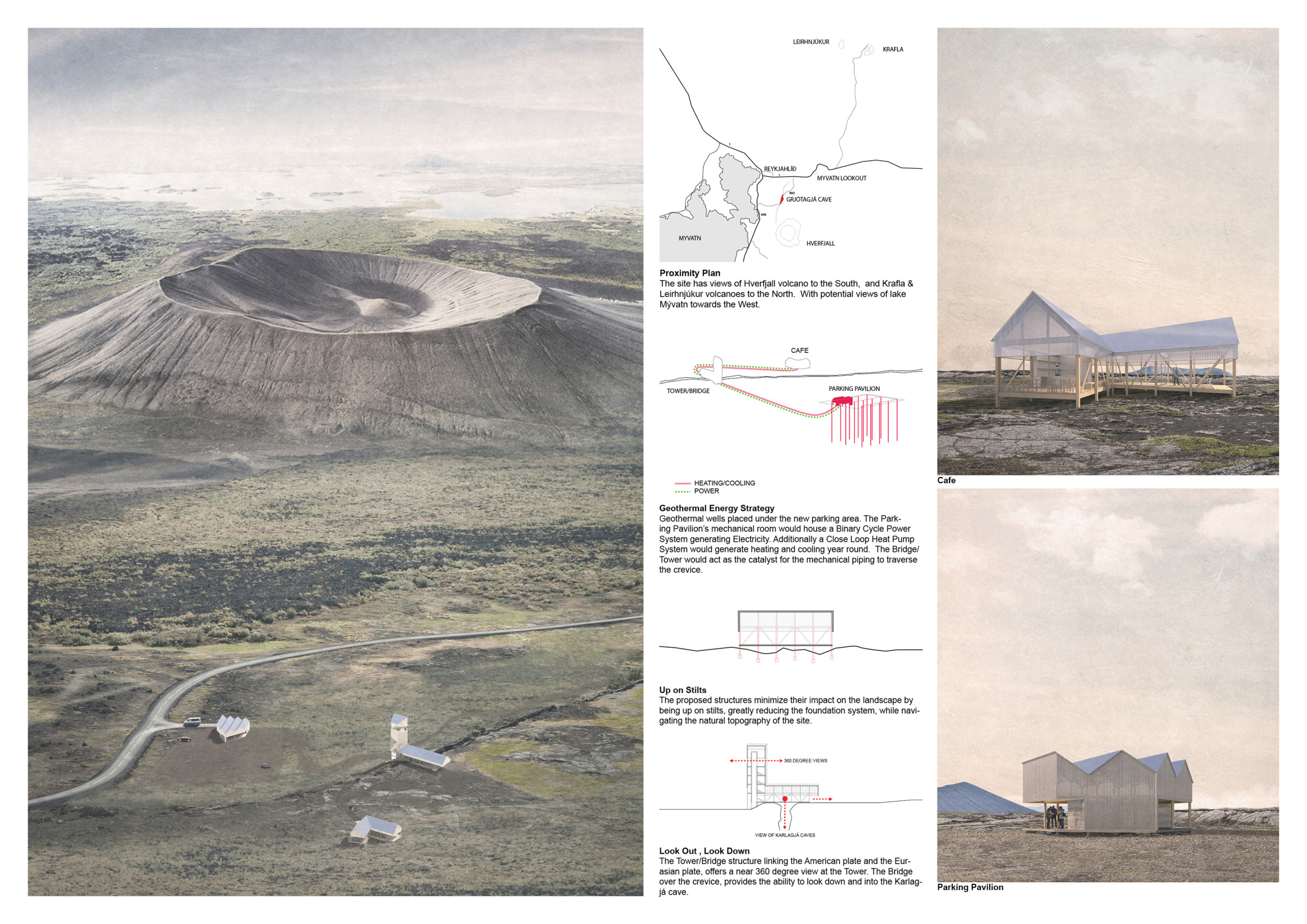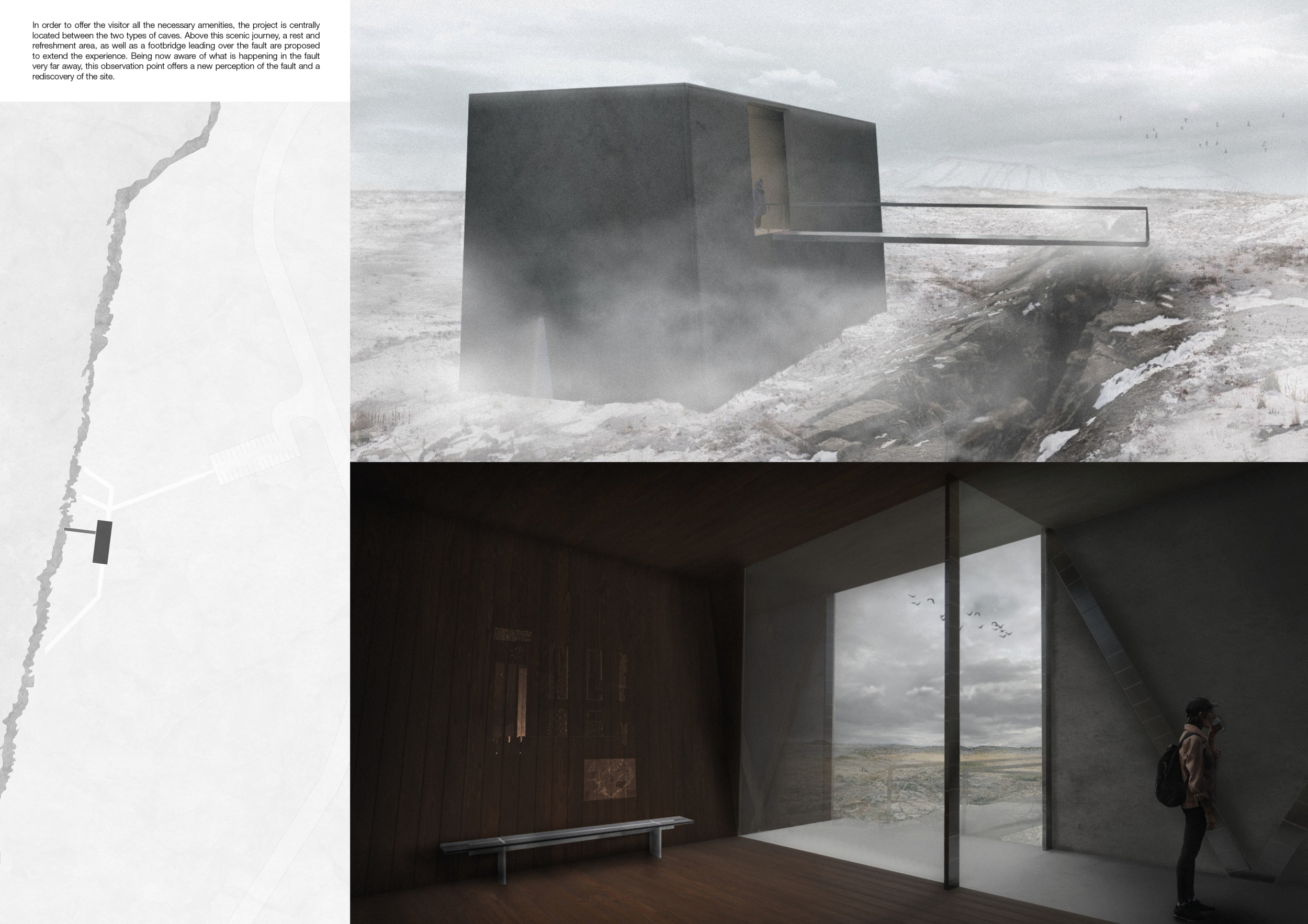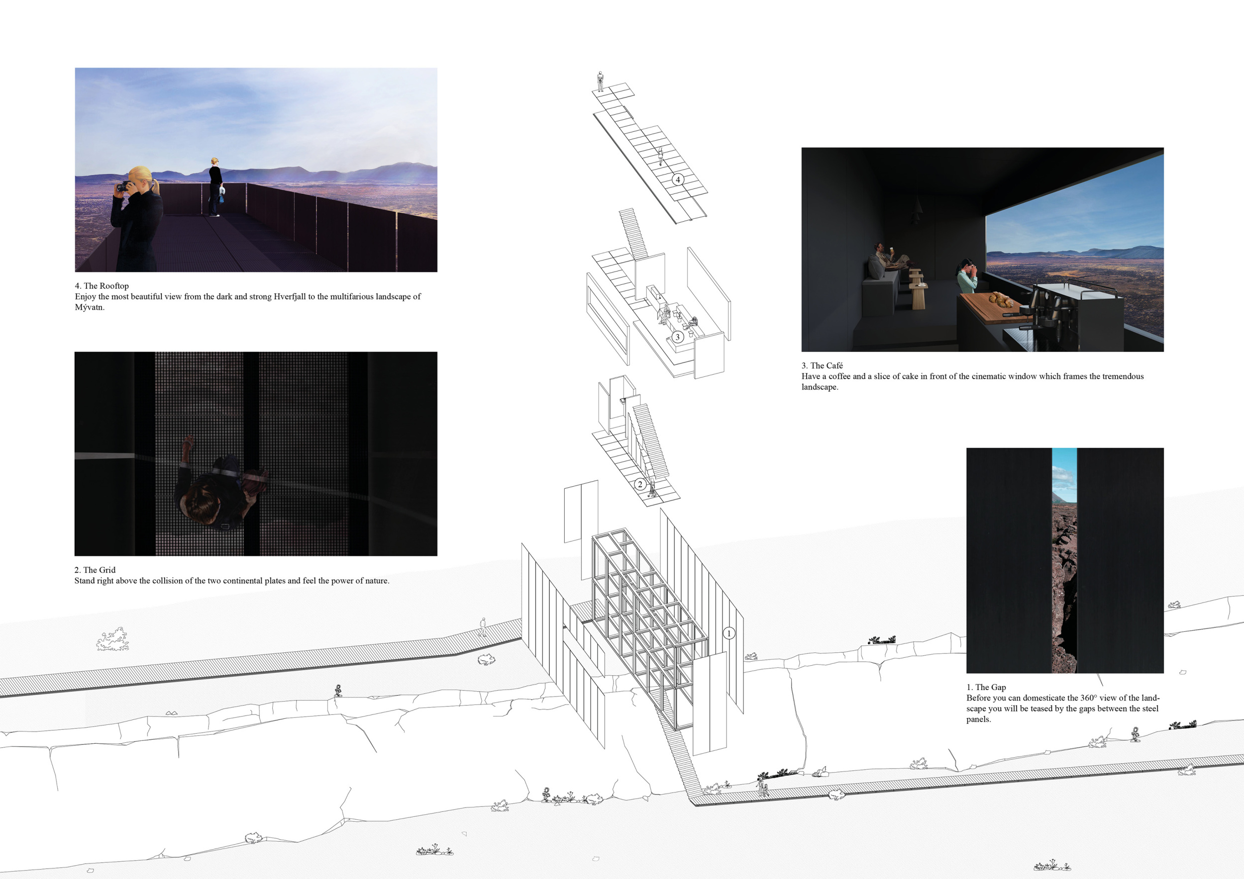 Rising from Grjótagjá installs three individual volumes, connected by a system of paths spanning the tectonic divide. These buildings connect the visitor to the two continents in a subtle and gentle way. The volumes play into the Icelandic landscape and become manmade extensions of nature. The volumes are related formally, and their different functions suggest that the visitor can move among them to explore the site and feel the grandness of standing at the frontier of two continents.
