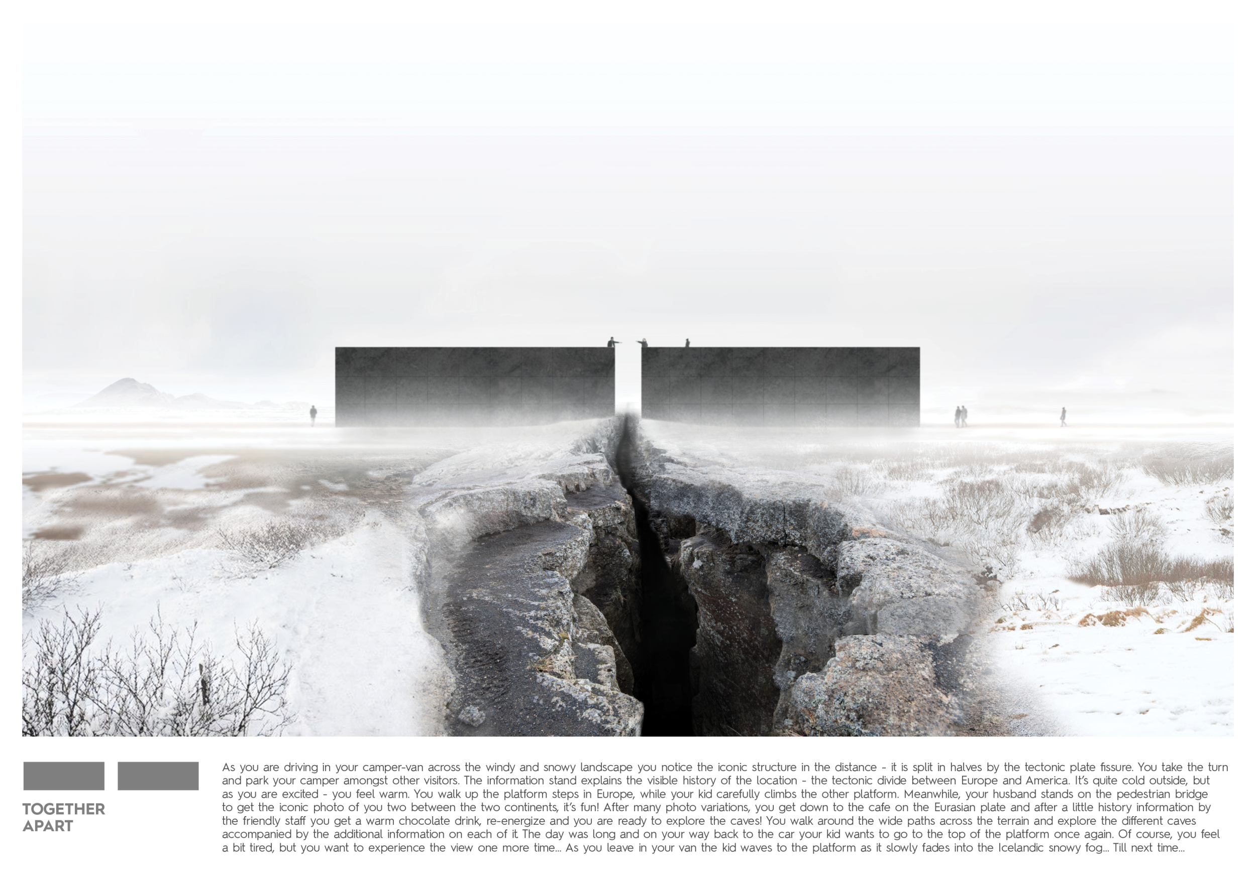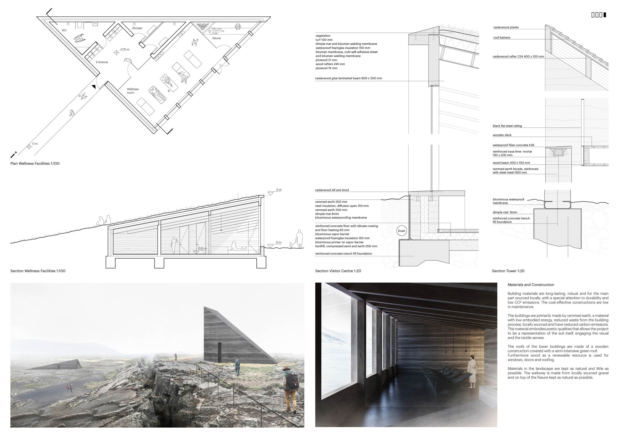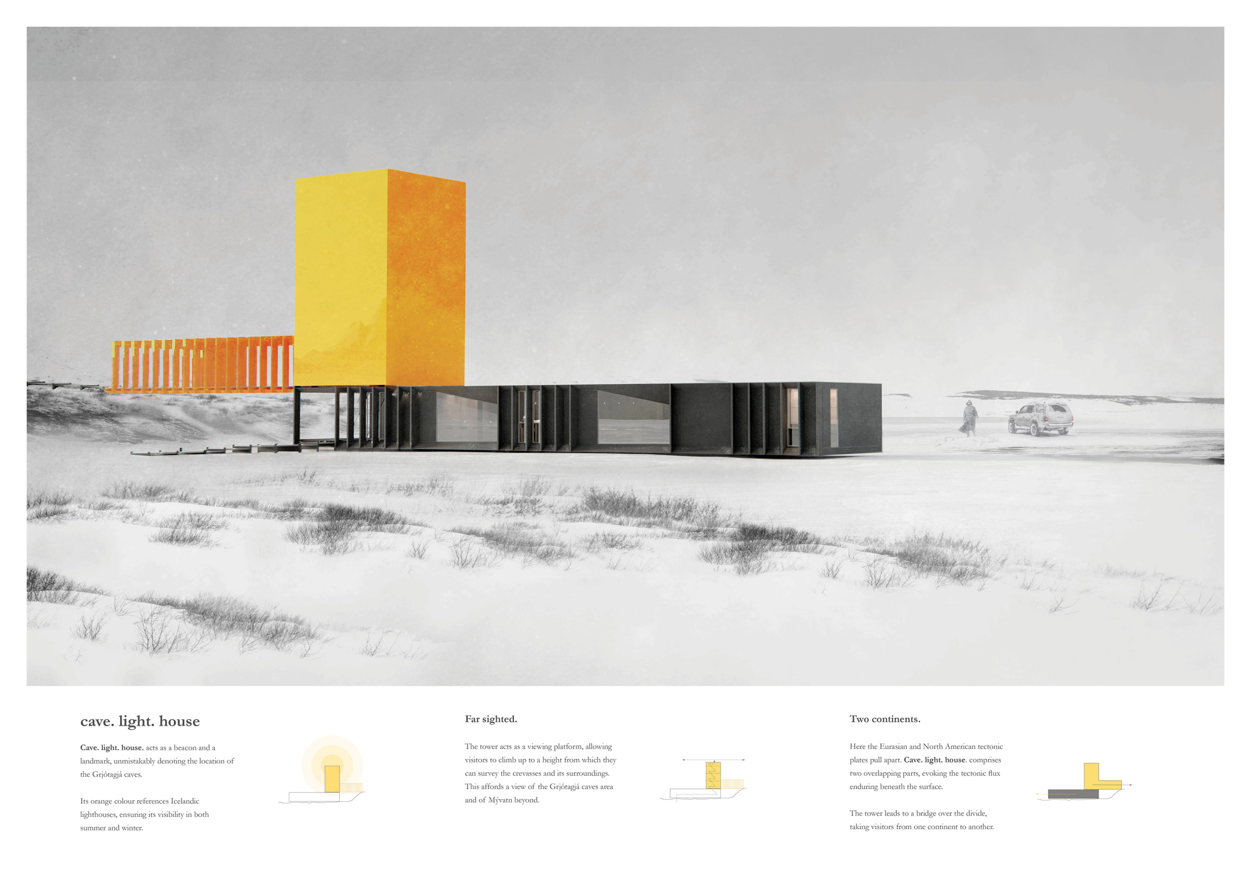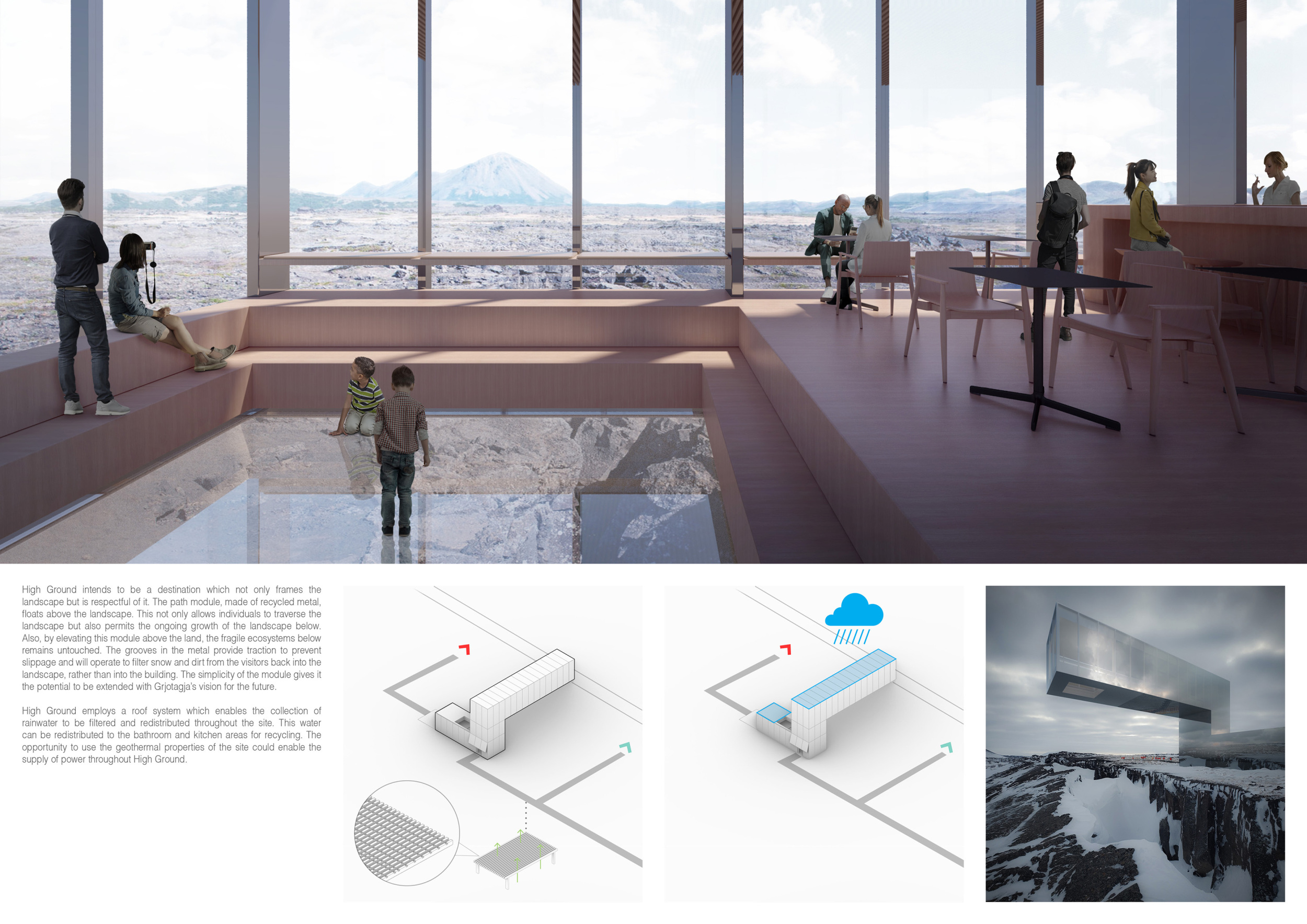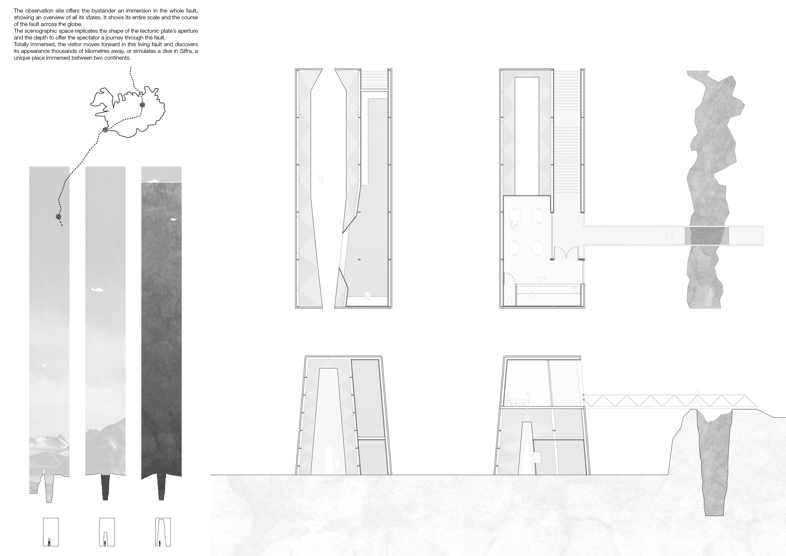 Rising from Grjótagjá installs three individual volumes, connected by a system of paths spanning the tectonic divide. These buildings connect the visitor to the two continents in a subtle and gentle way. The volumes play into the Icelandic landscape and become manmade extensions of nature. The volumes are related formally, and their different functions suggest that the visitor can move among them to explore the site and feel the grandness of standing at the frontier of two continents.