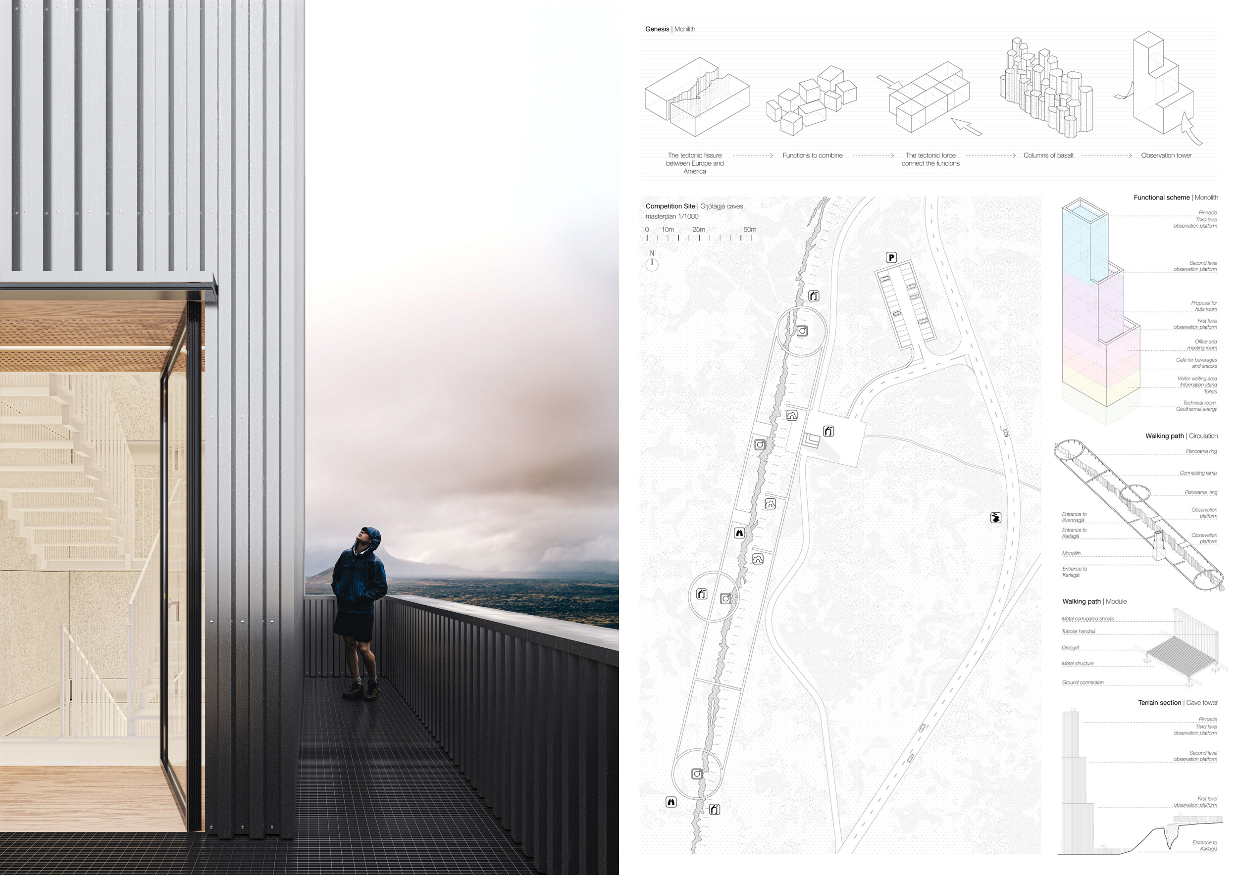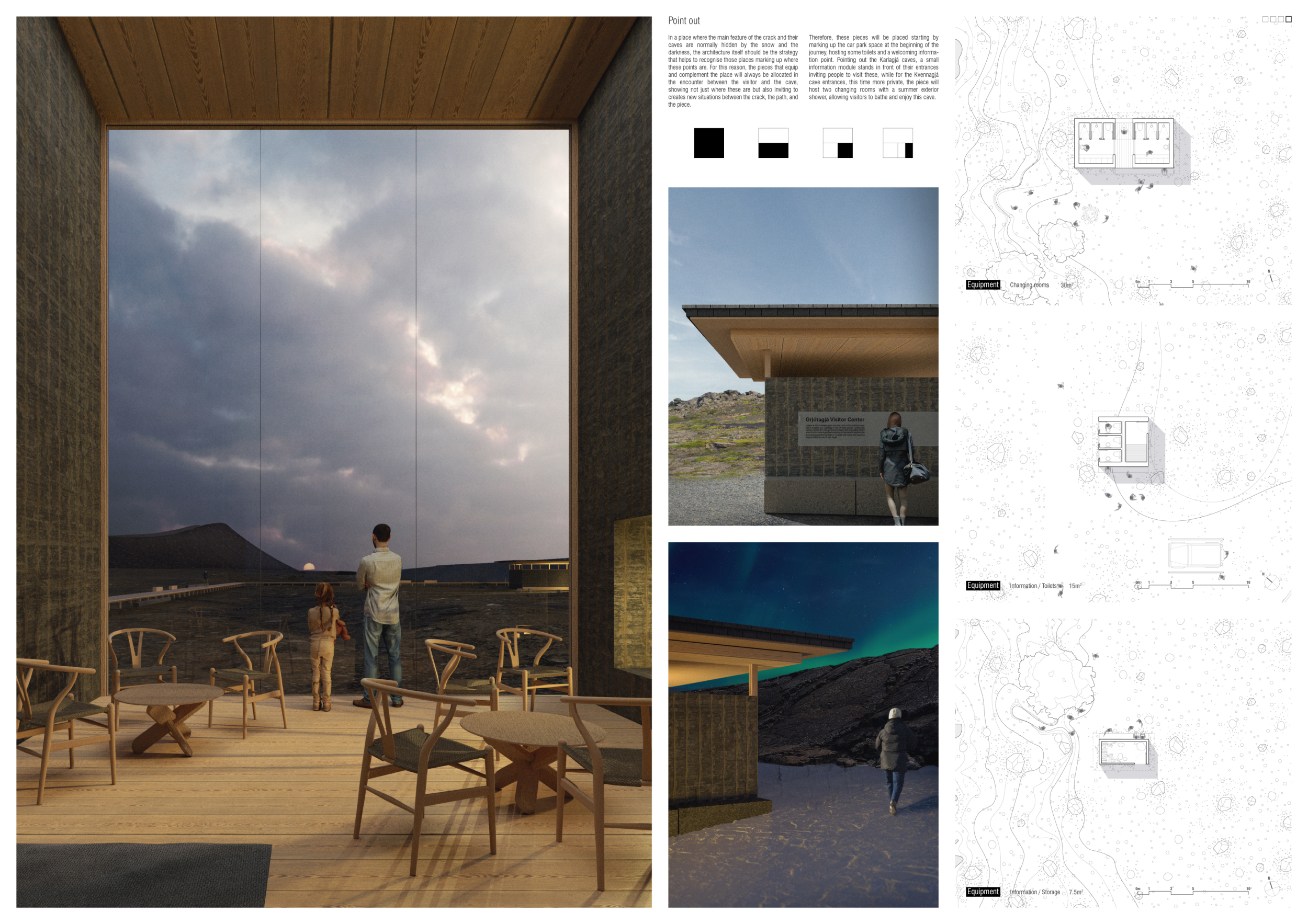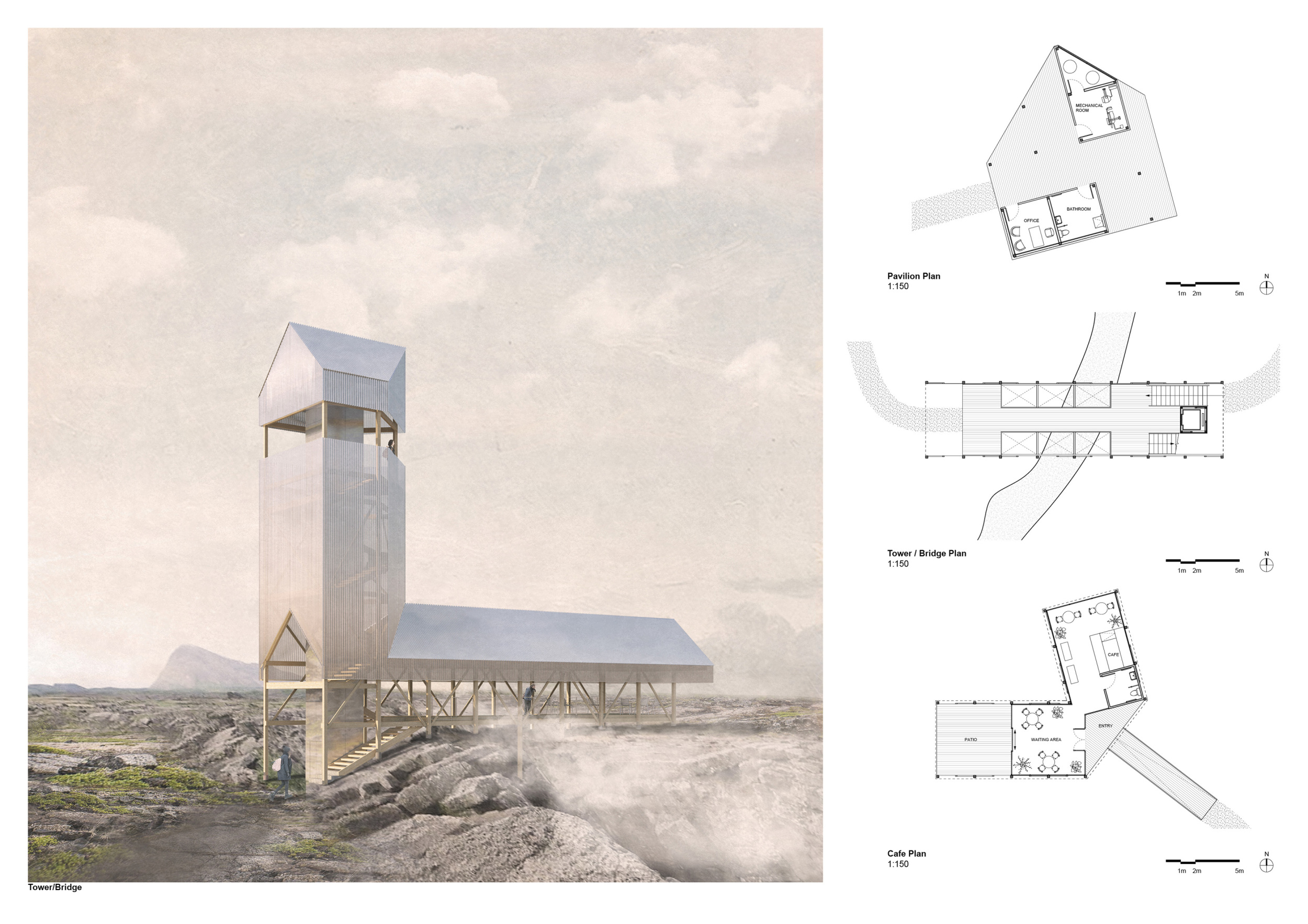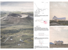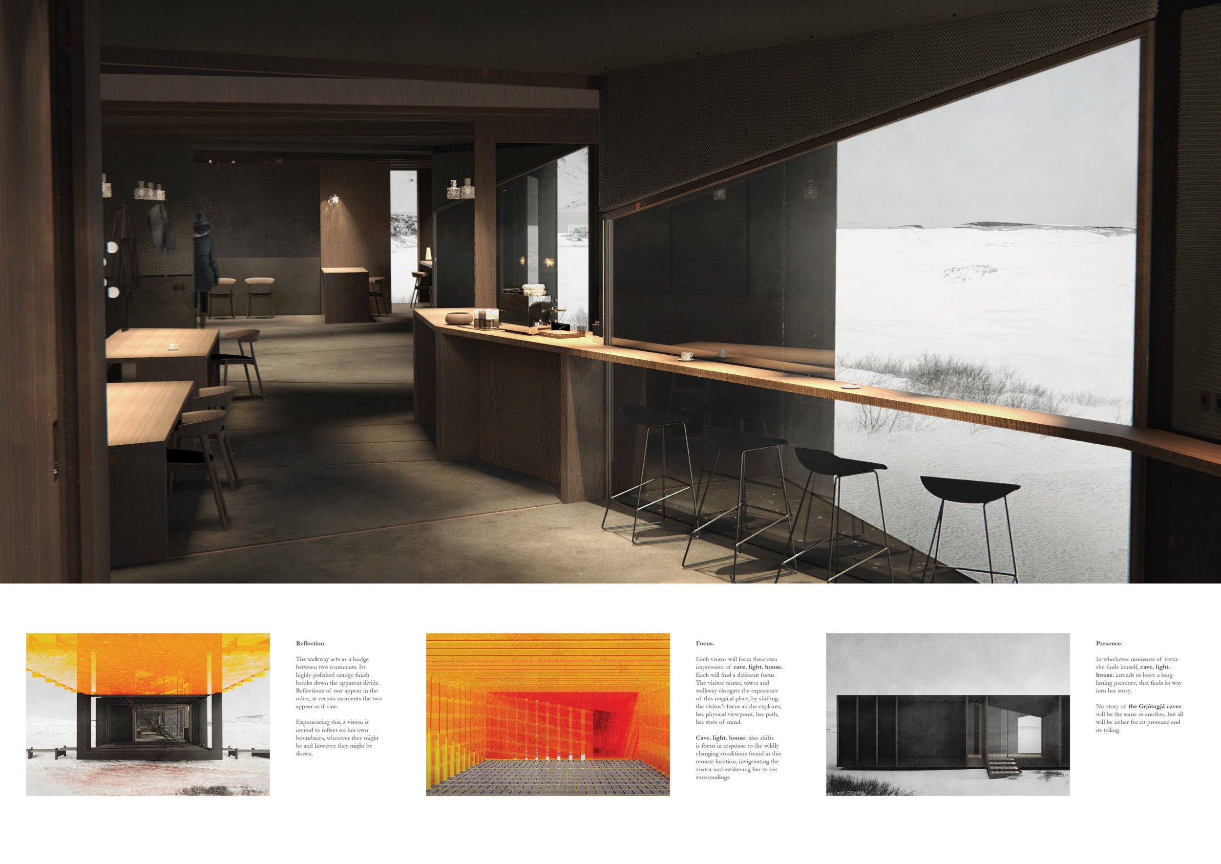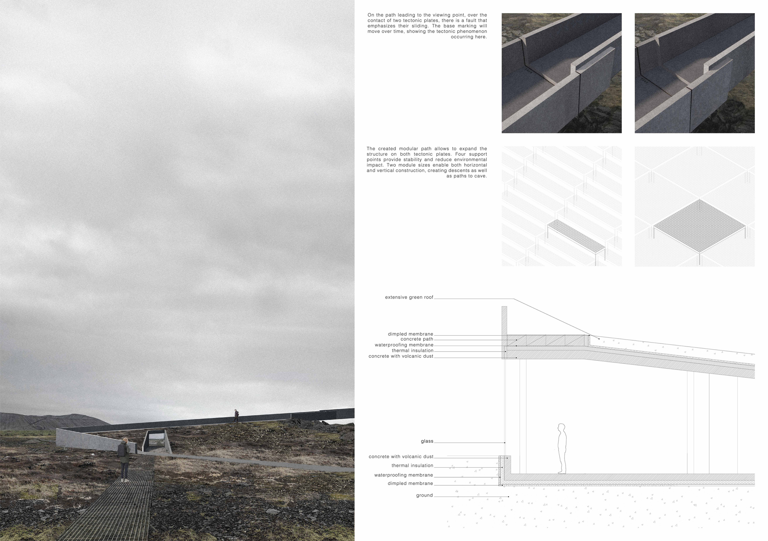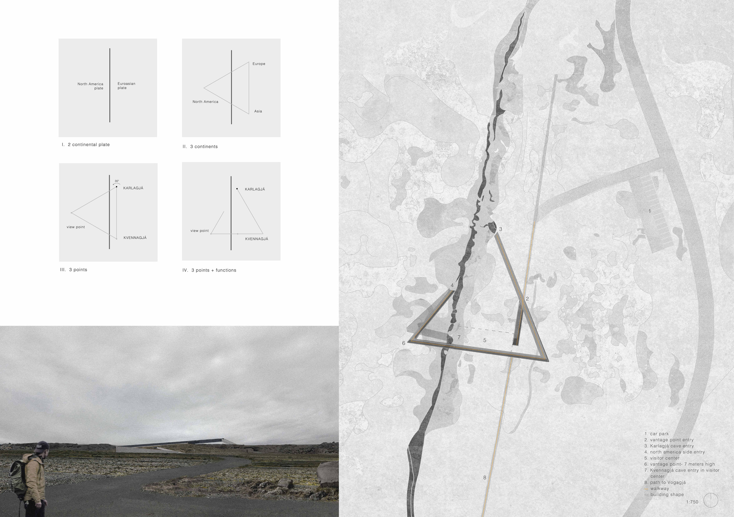 Rising from Grjótagjá installs three individual volumes, connected by a system of paths spanning the tectonic divide. These buildings connect the visitor to the two continents in a subtle and gentle way. The volumes play into the Icelandic landscape and become manmade extensions of nature. The volumes are related formally, and their different functions suggest that the visitor can move among them to explore the site and feel the grandness of standing at the frontier of two continents.