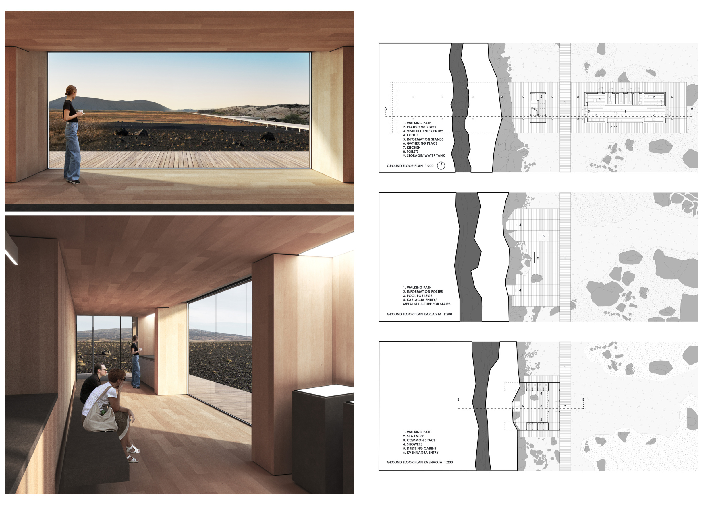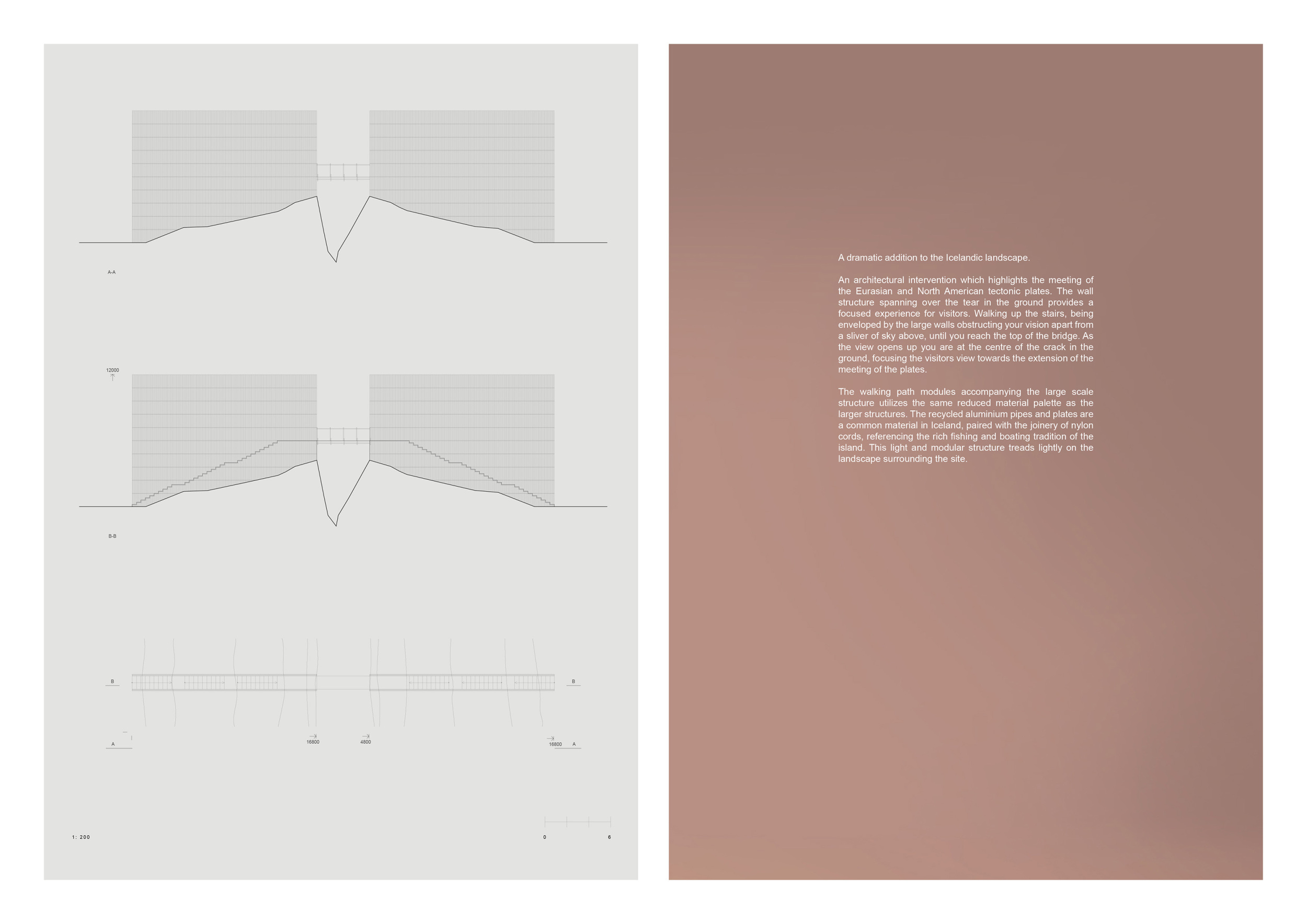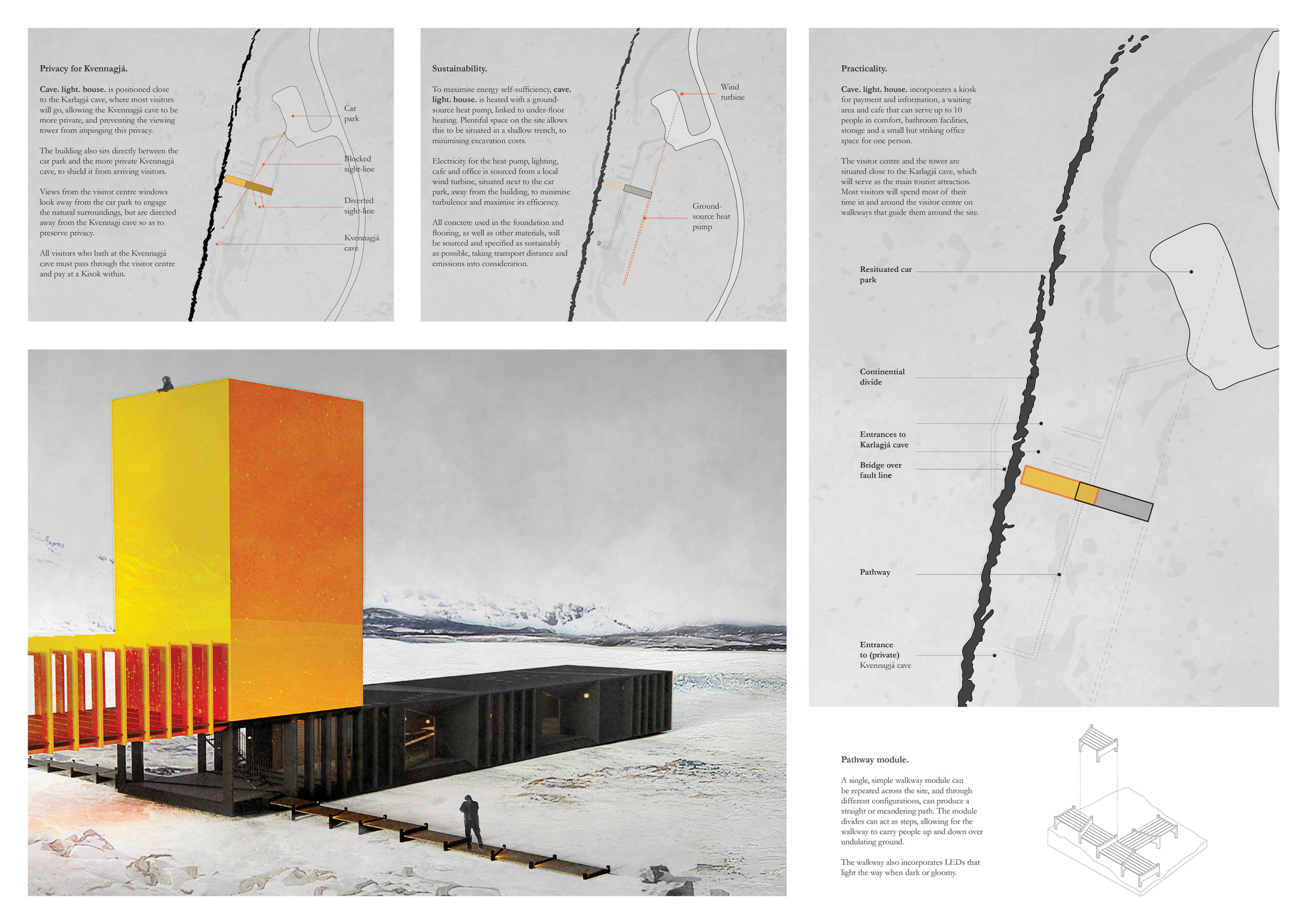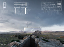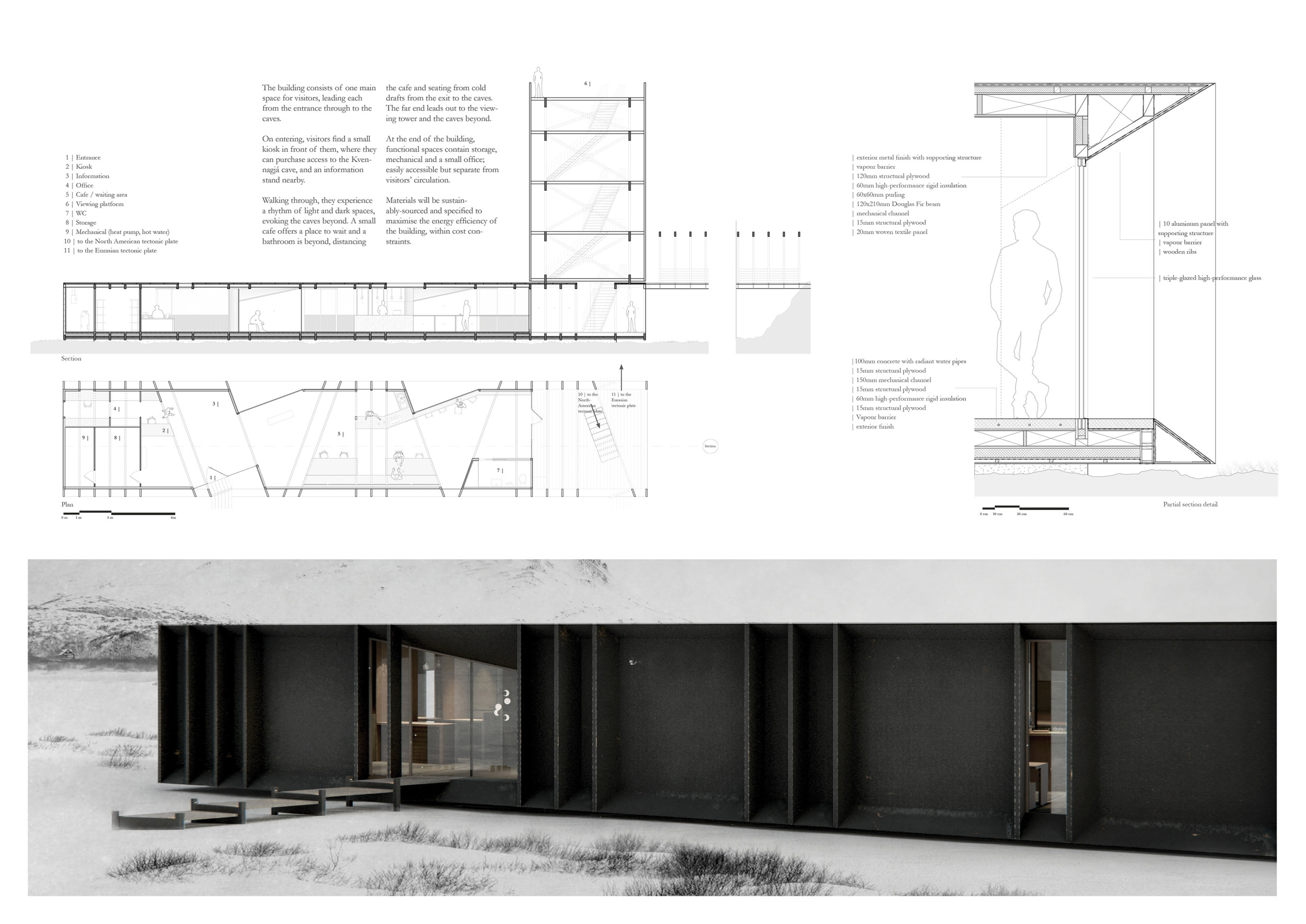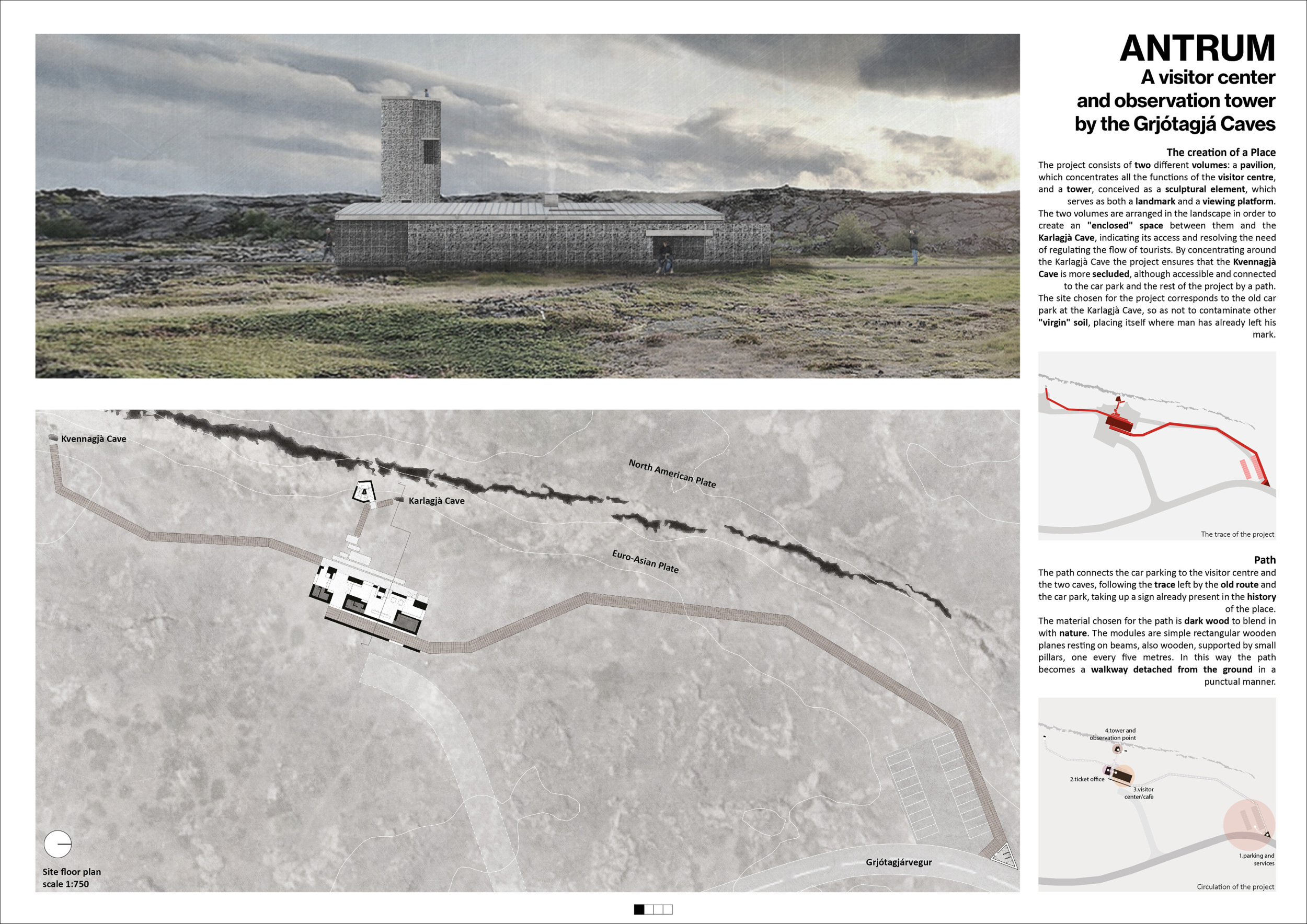 Rising from Grjótagjá installs three individual volumes, connected by a system of paths spanning the tectonic divide. These buildings connect the visitor to the two continents in a subtle and gentle way. The volumes play into the Icelandic landscape and become manmade extensions of nature. The volumes are related formally, and their different functions suggest that the visitor can move among them to explore the site and feel the grandness of standing at the frontier of two continents.