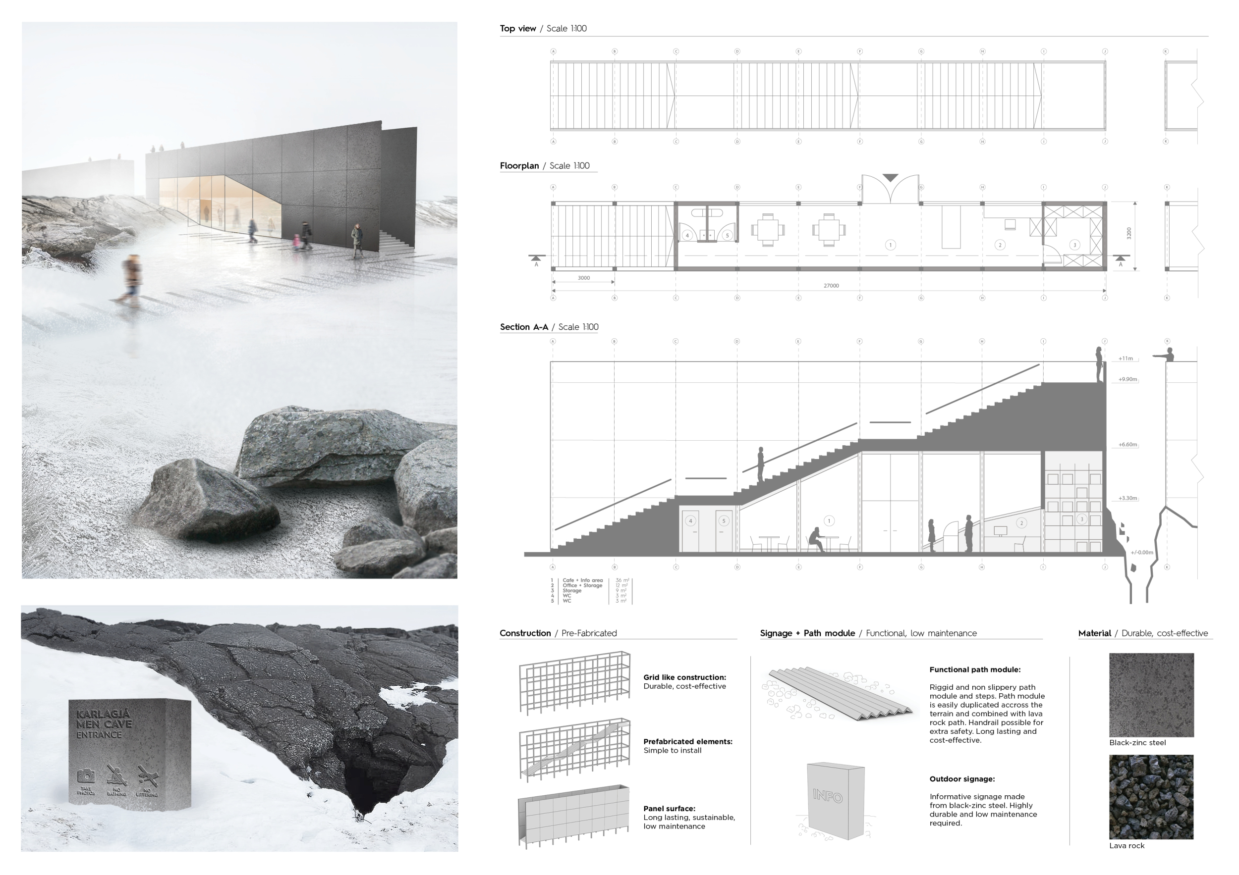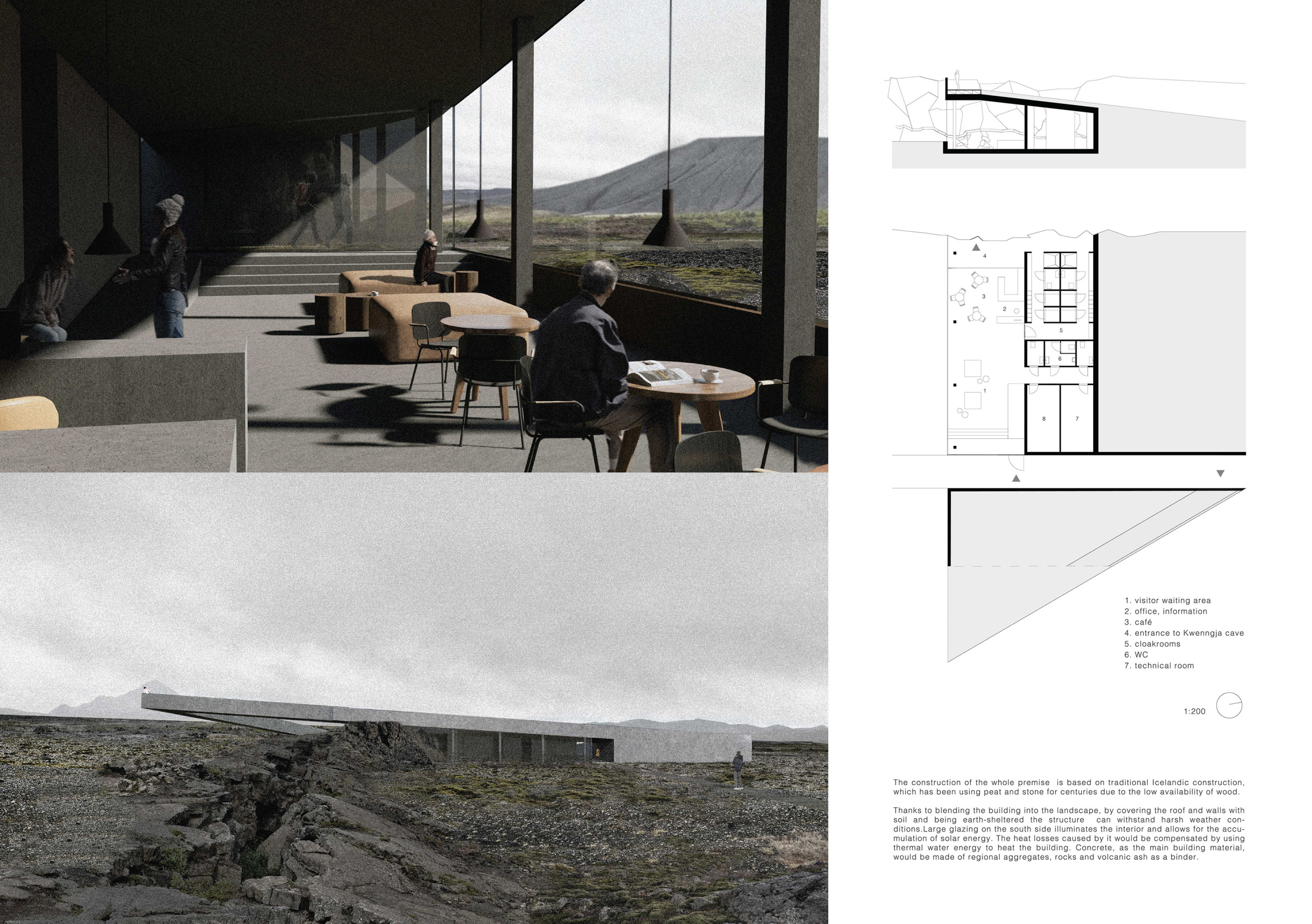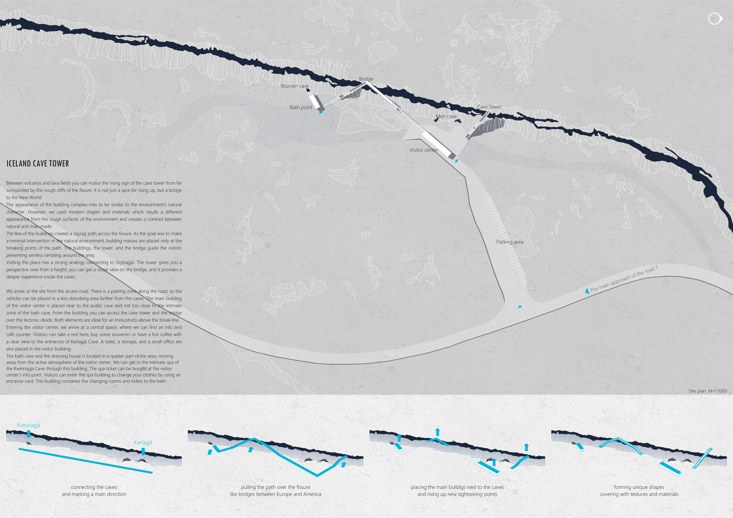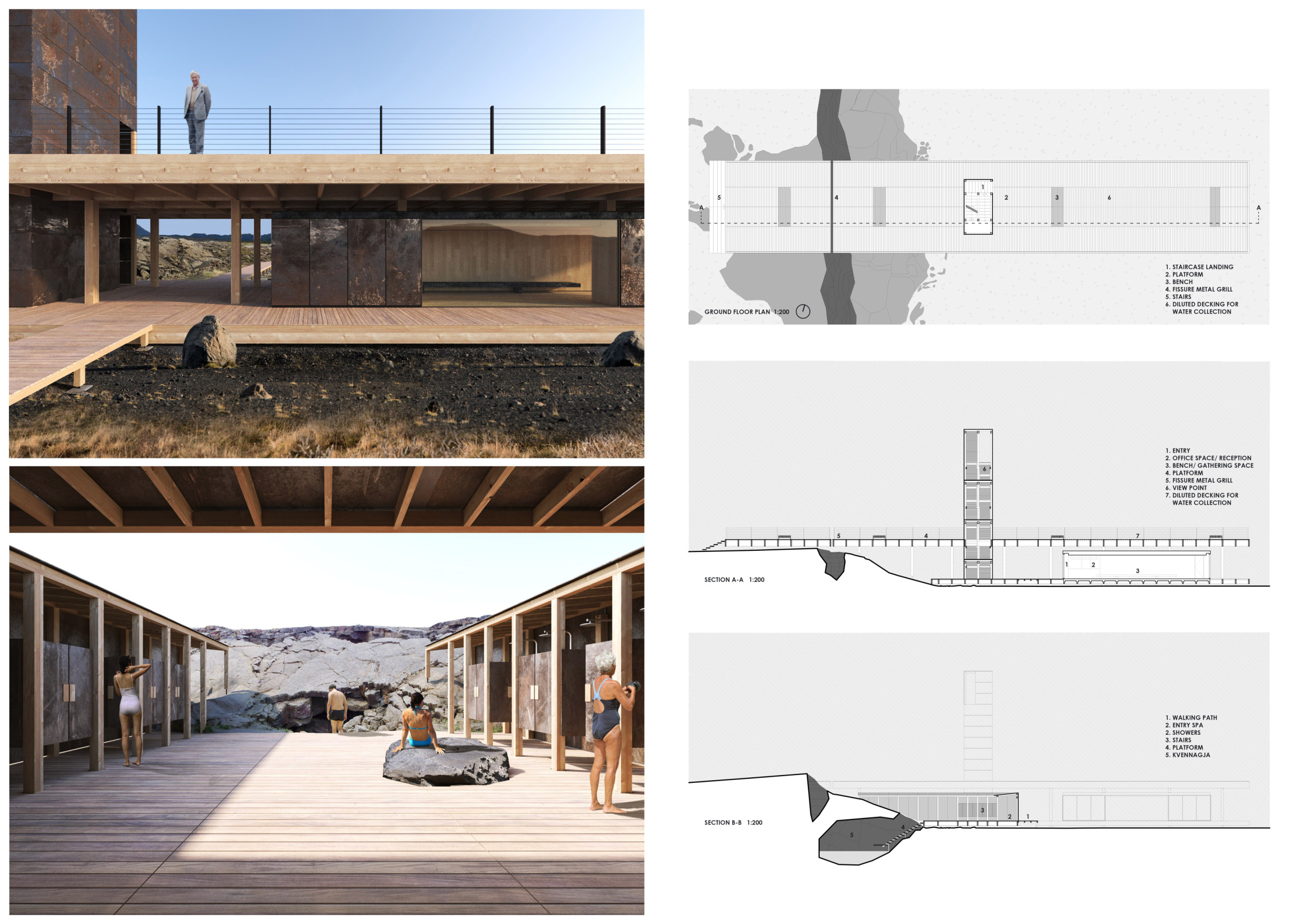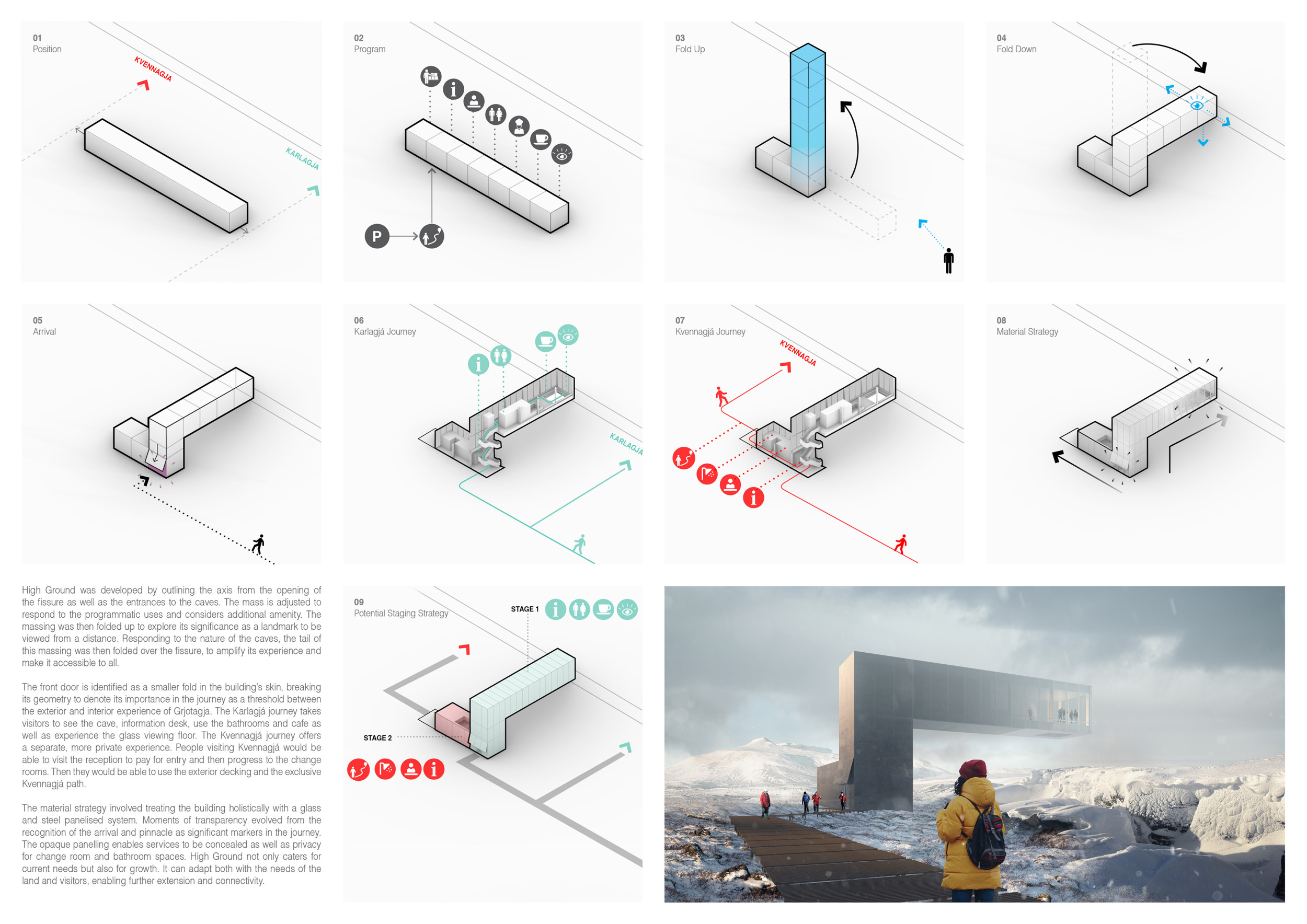 Rising from Grjótagjá installs three individual volumes, connected by a system of paths spanning the tectonic divide. These buildings connect the visitor to the two continents in a subtle and gentle way. The volumes play into the Icelandic landscape and become manmade extensions of nature. The volumes are related formally, and their different functions suggest that the visitor can move among them to explore the site and feel the grandness of standing at the frontier of two continents.