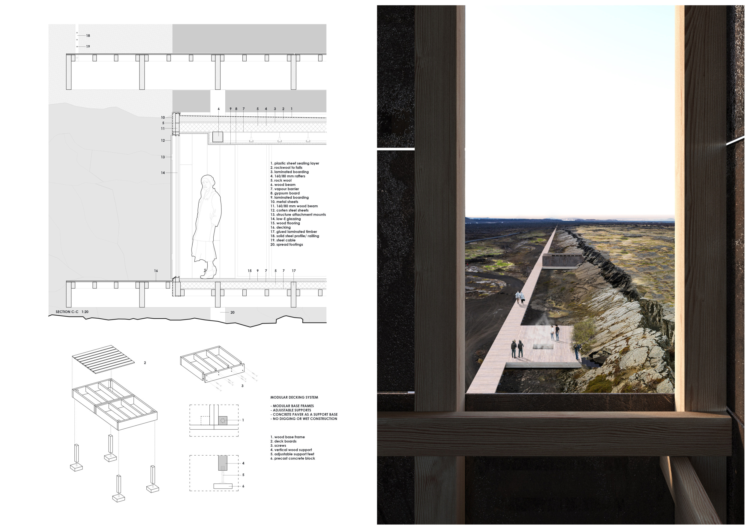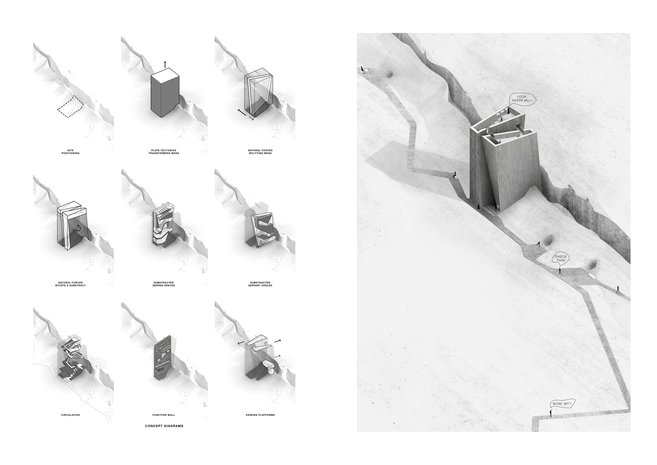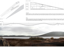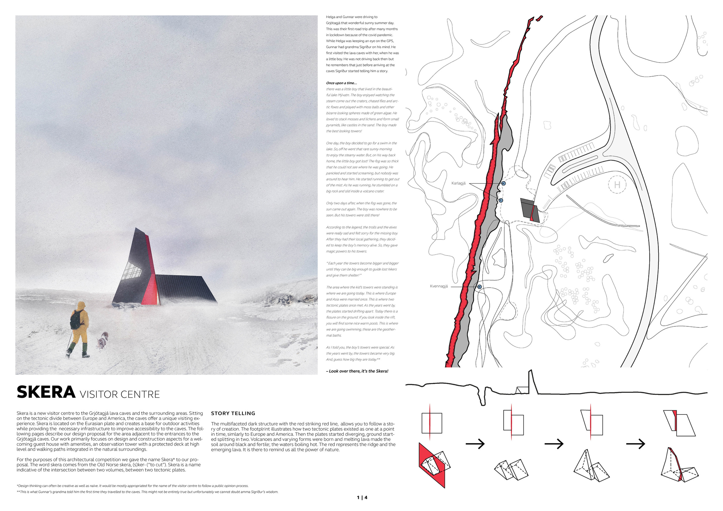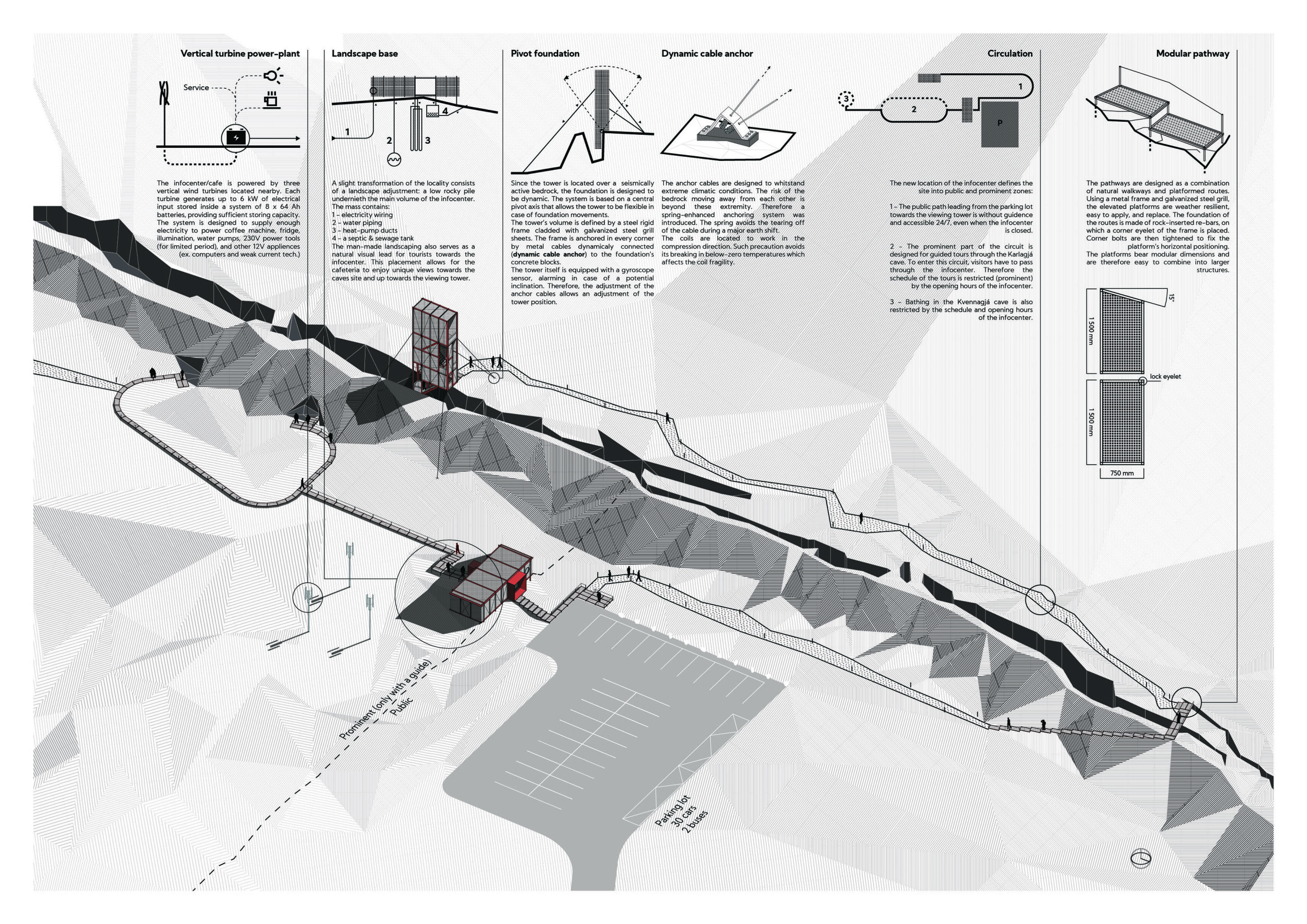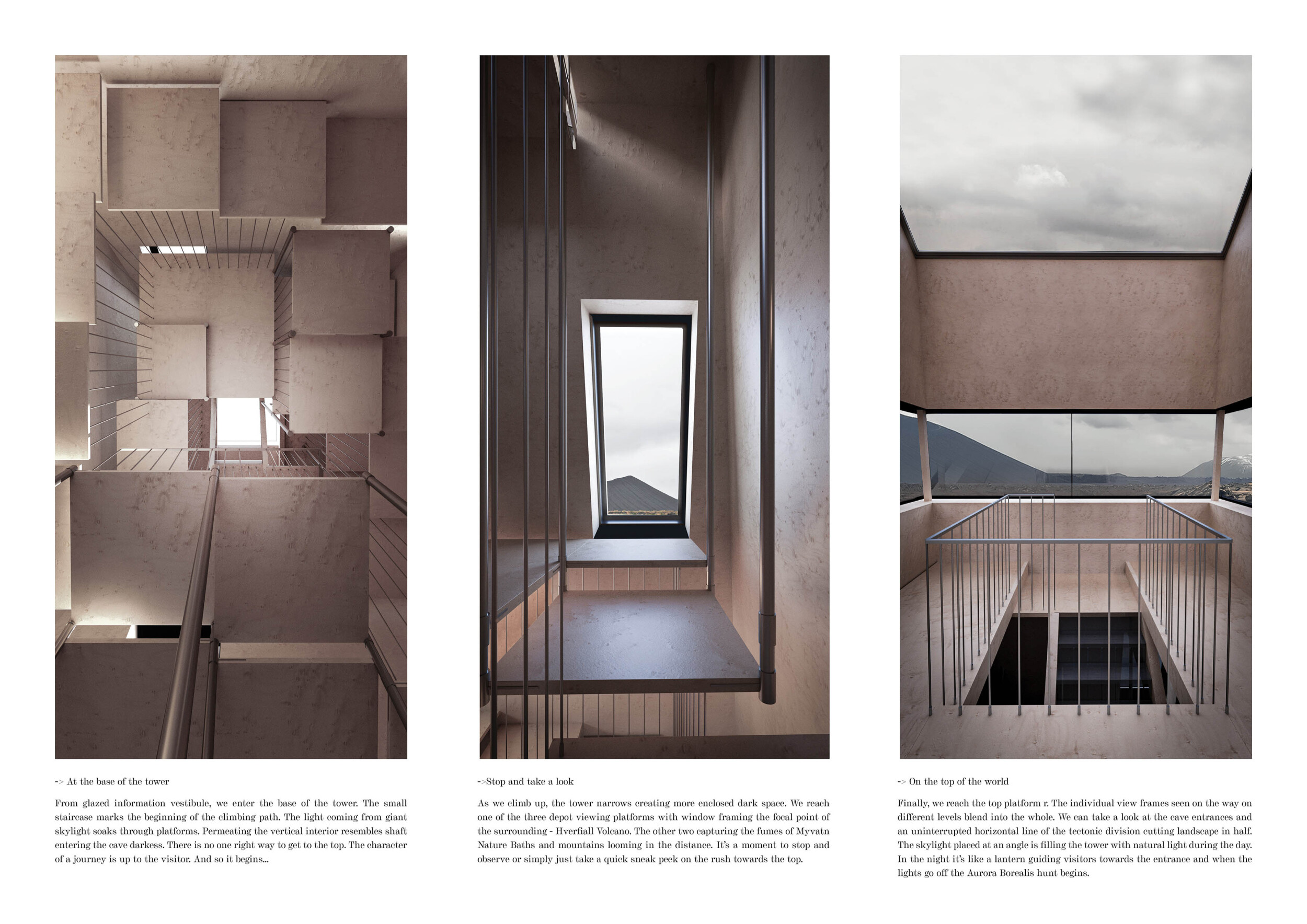 Rising from Grjótagjá installs three individual volumes, connected by a system of paths spanning the tectonic divide. These buildings connect the visitor to the two continents in a subtle and gentle way. The volumes play into the Icelandic landscape and become manmade extensions of nature. The volumes are related formally, and their different functions suggest that the visitor can move among them to explore the site and feel the grandness of standing at the frontier of two continents.