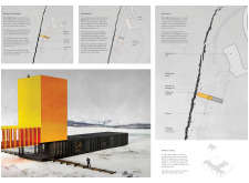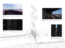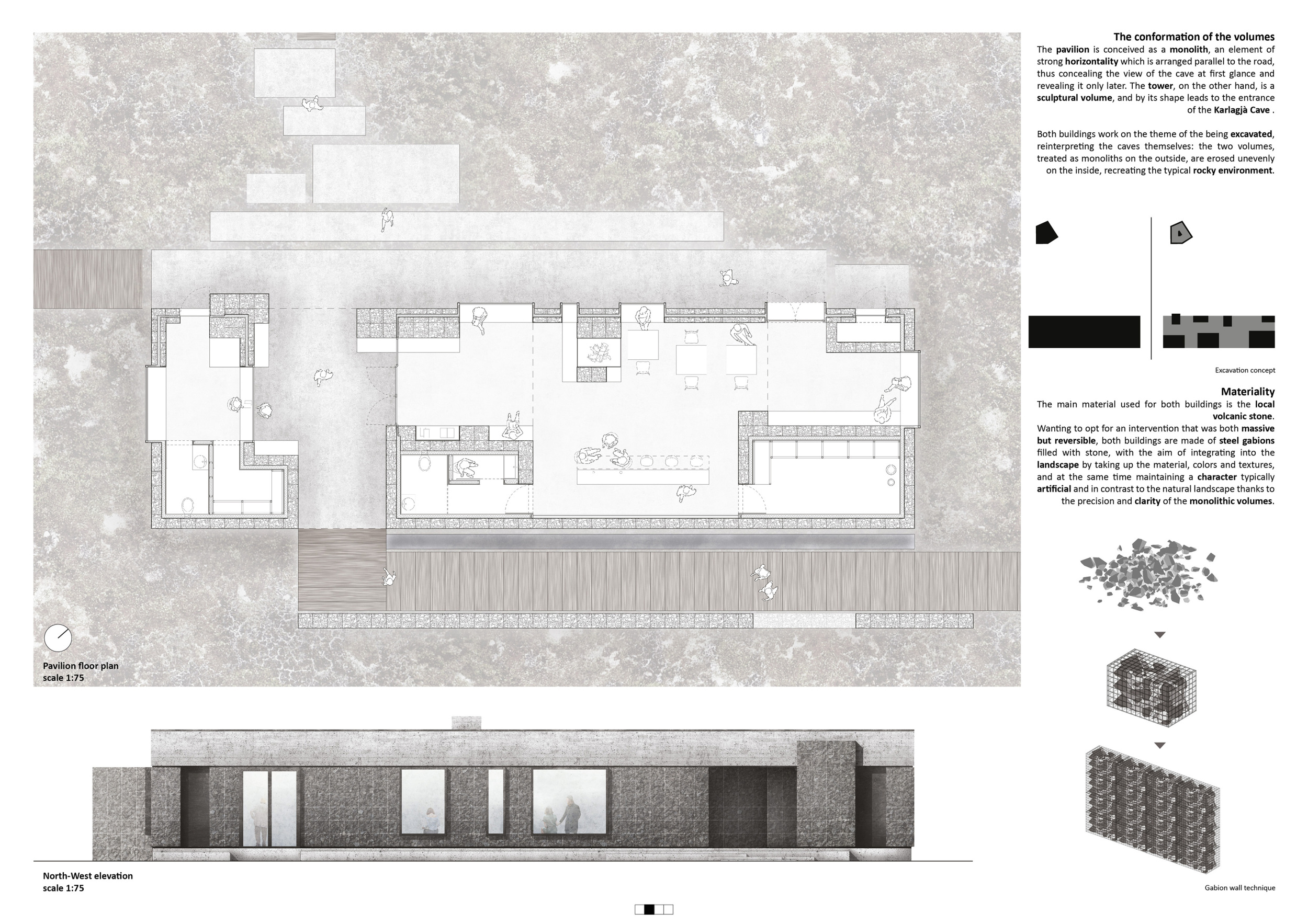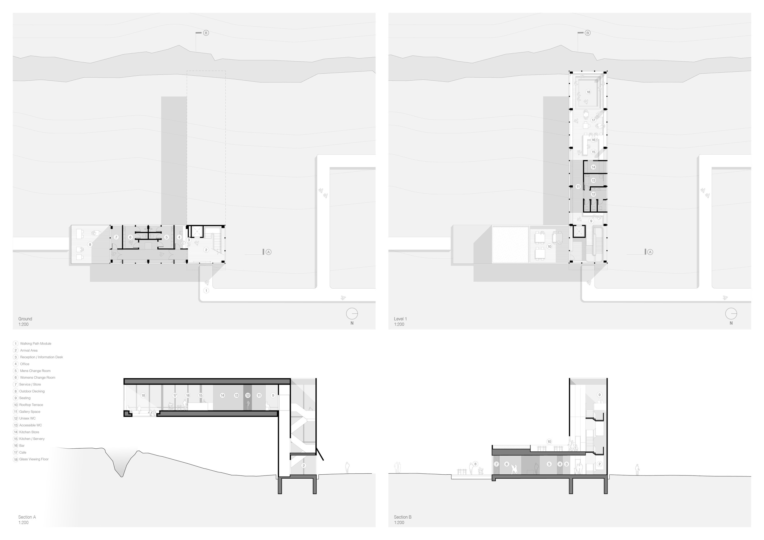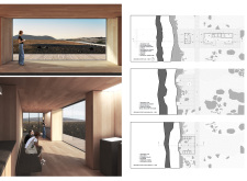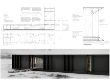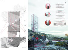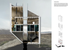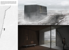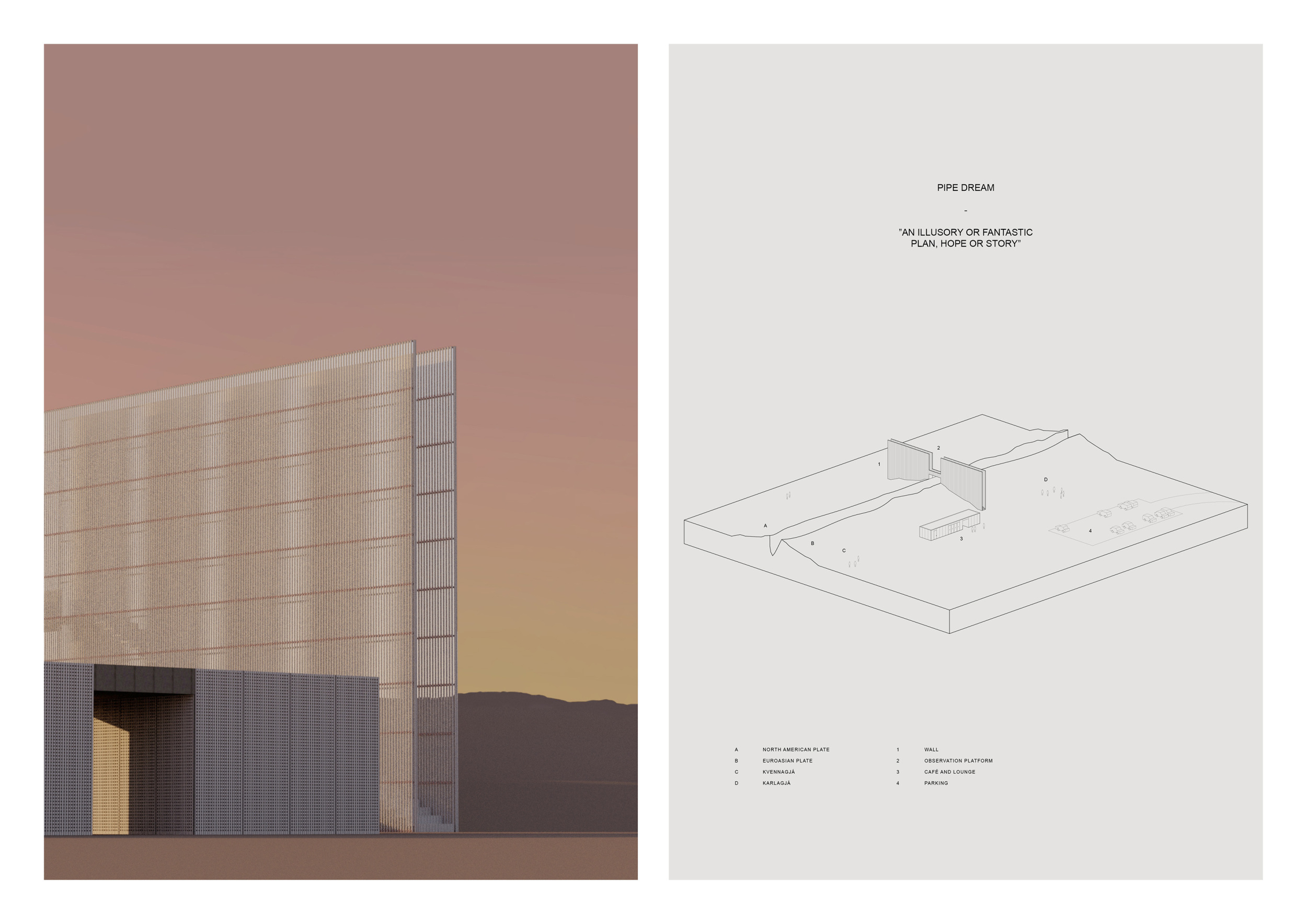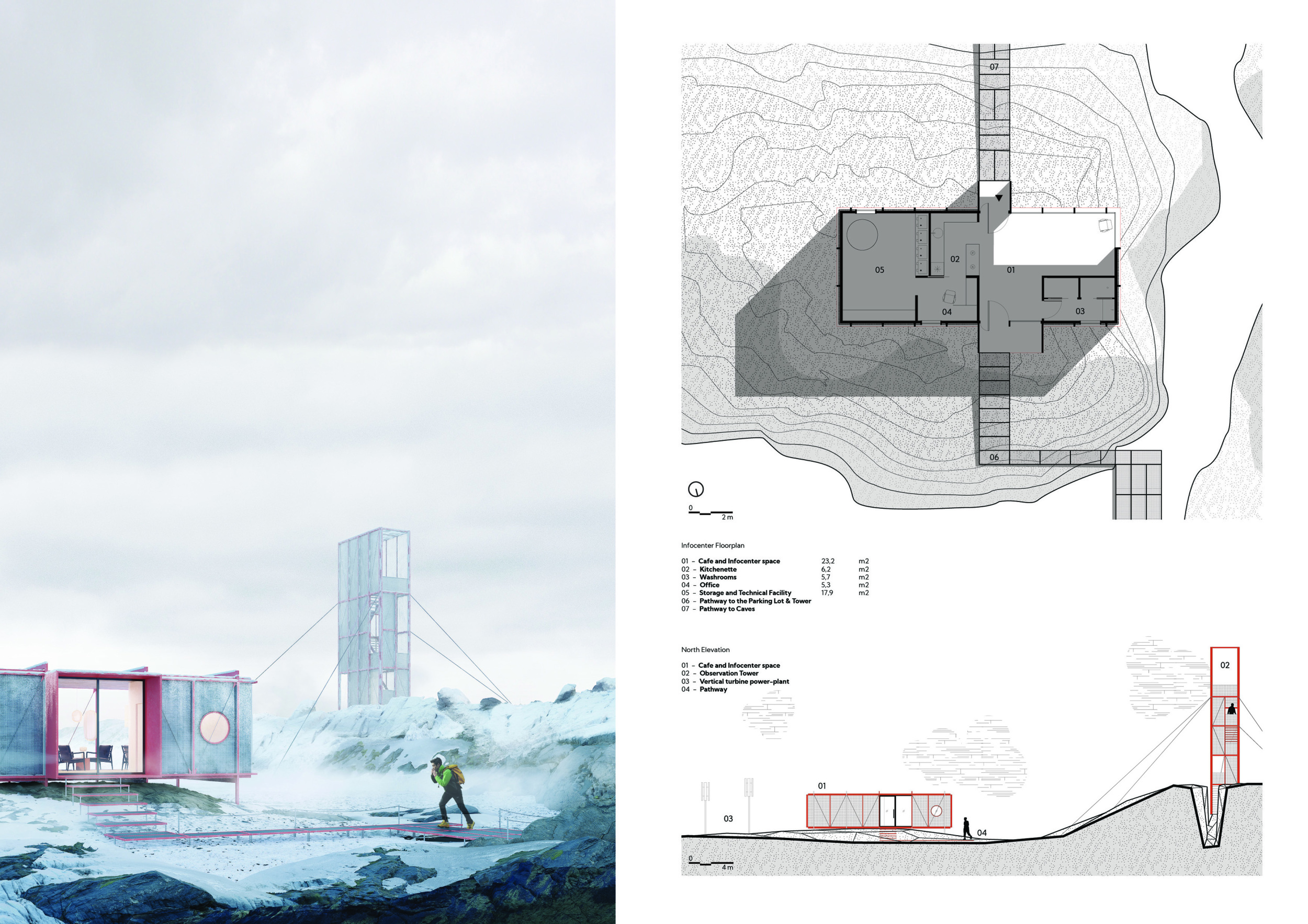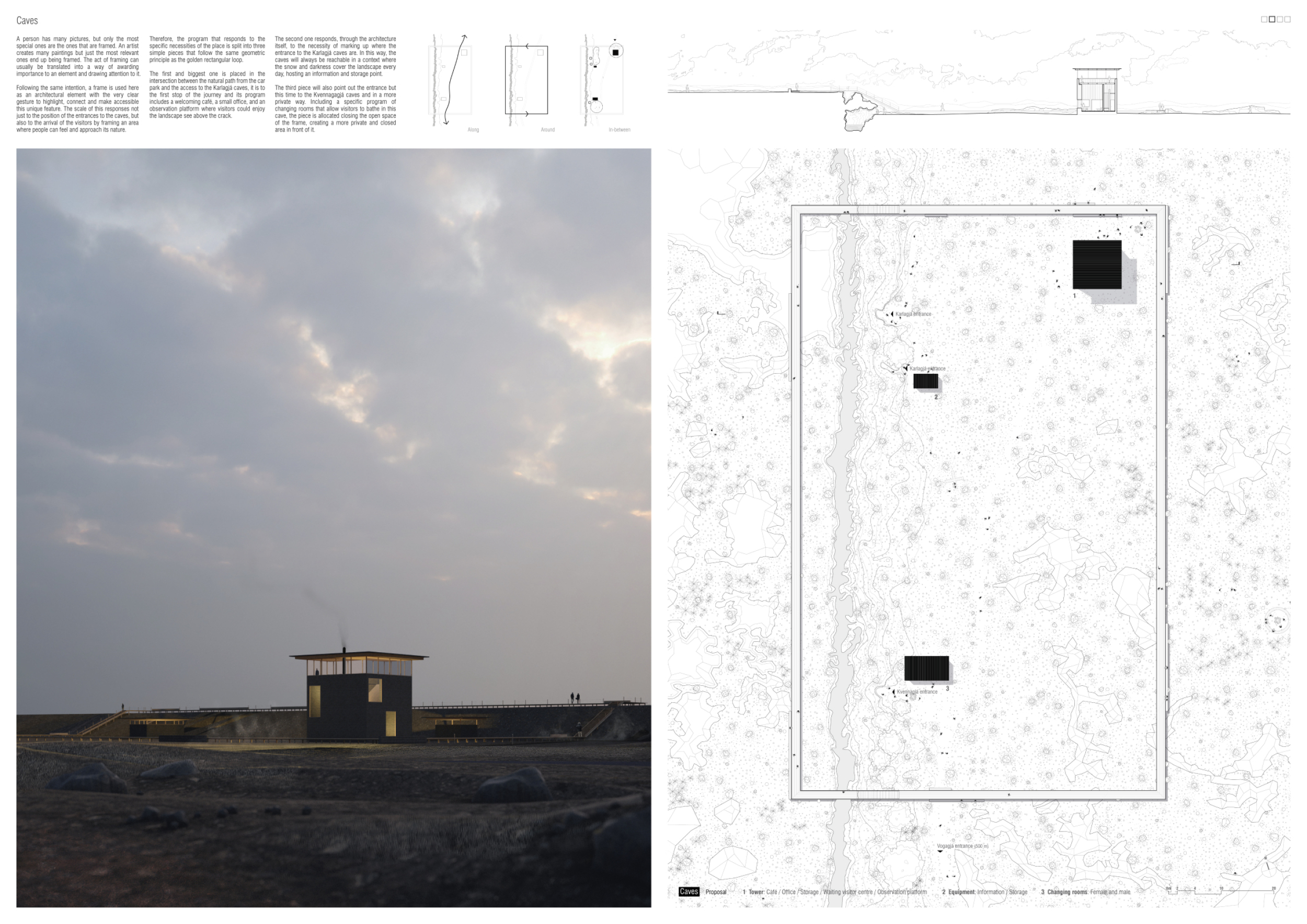 Rising from Grjótagjá installs three individual volumes, connected by a system of paths spanning the tectonic divide. These buildings connect the visitor to the two continents in a subtle and gentle way. The volumes play into the Icelandic landscape and become manmade extensions of nature. The volumes are related formally, and their different functions suggest that the visitor can move among them to explore the site and feel the grandness of standing at the frontier of two continents.