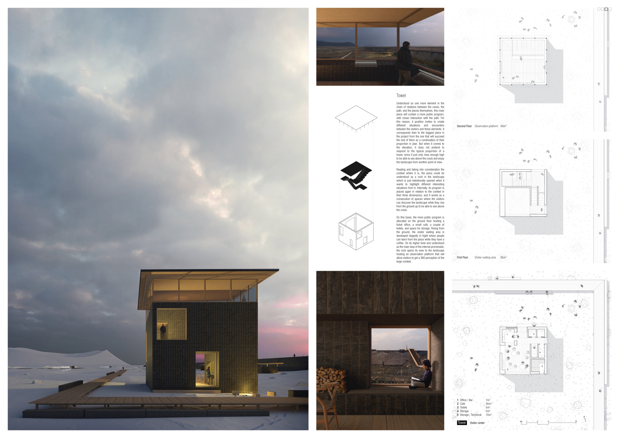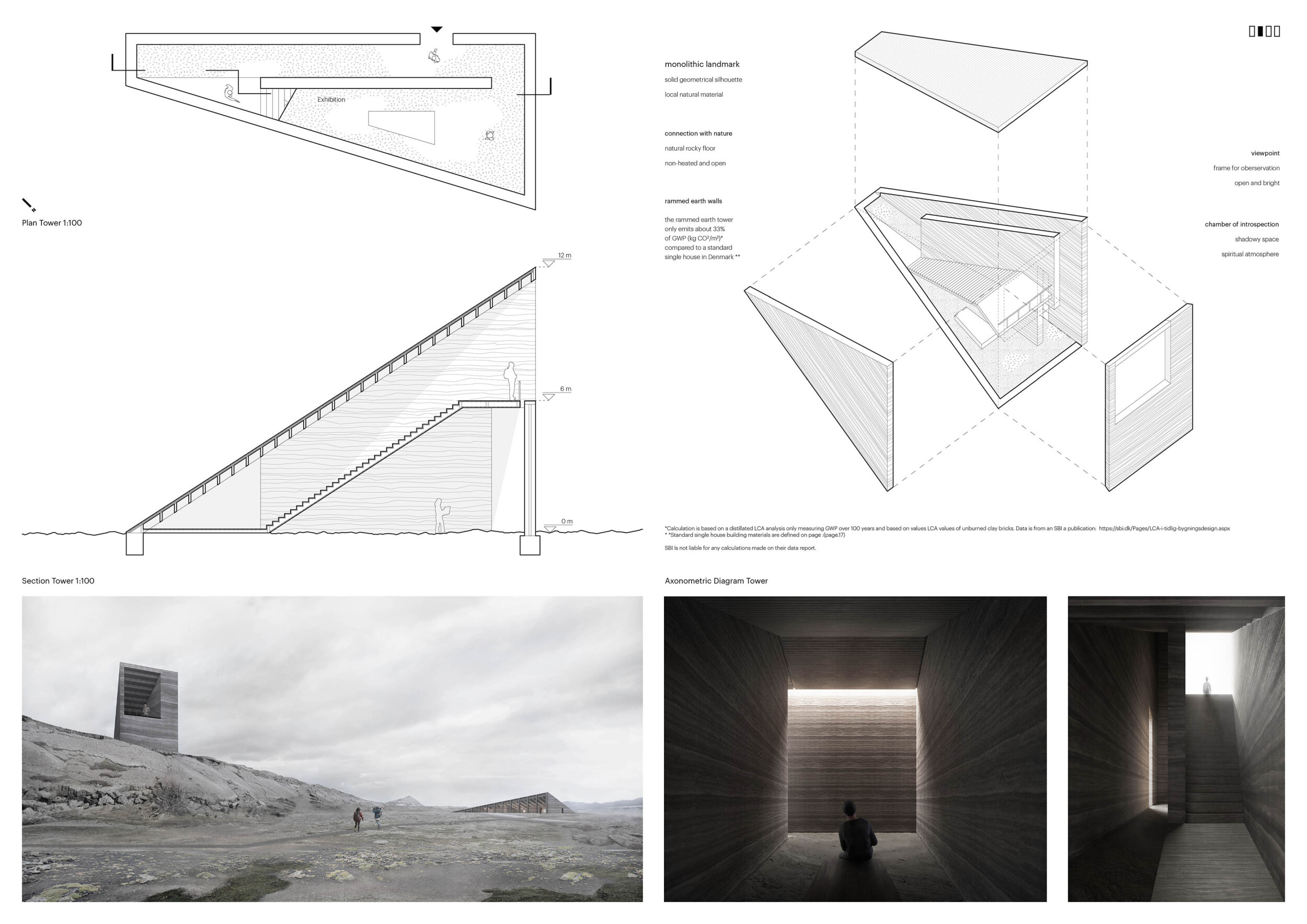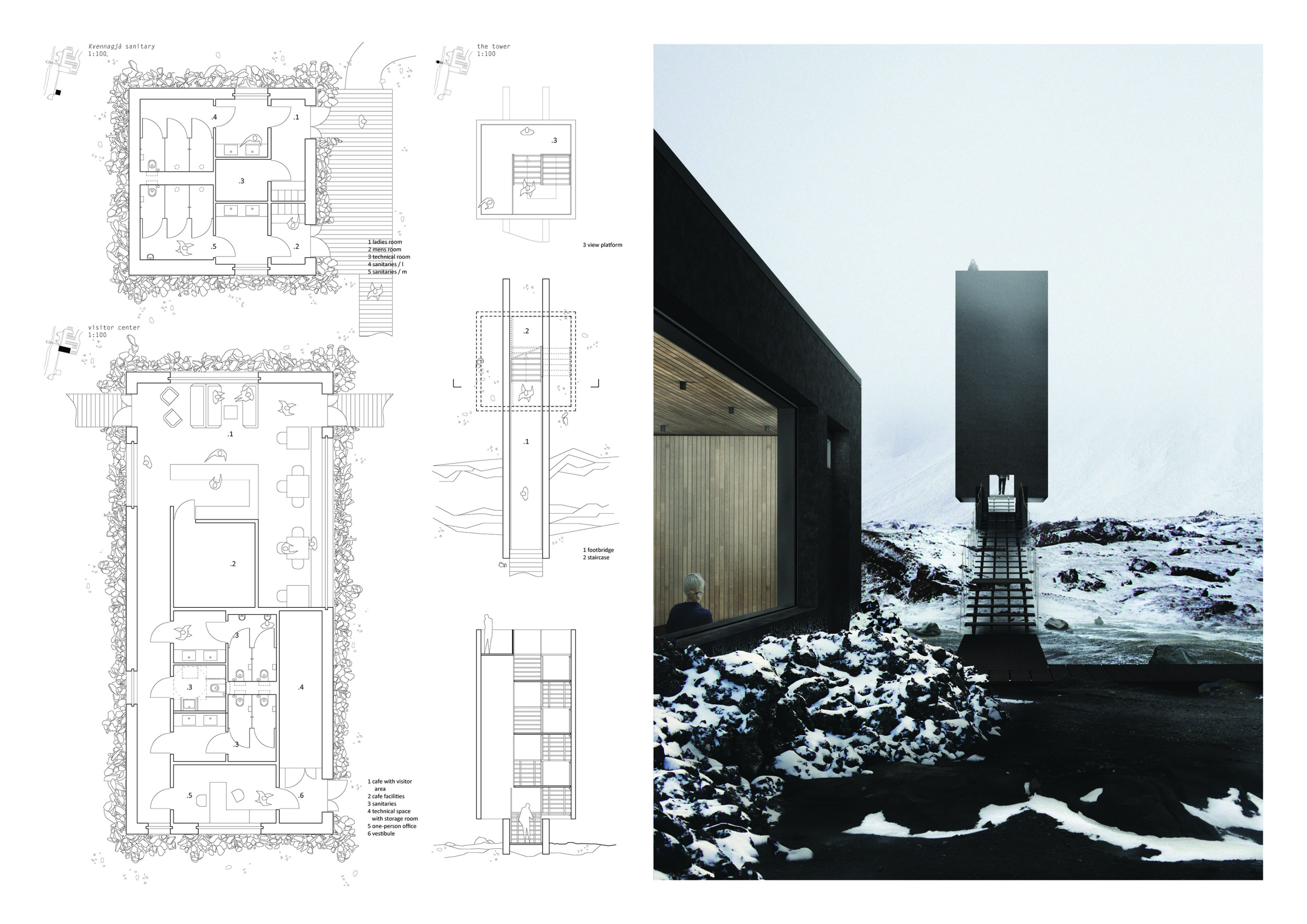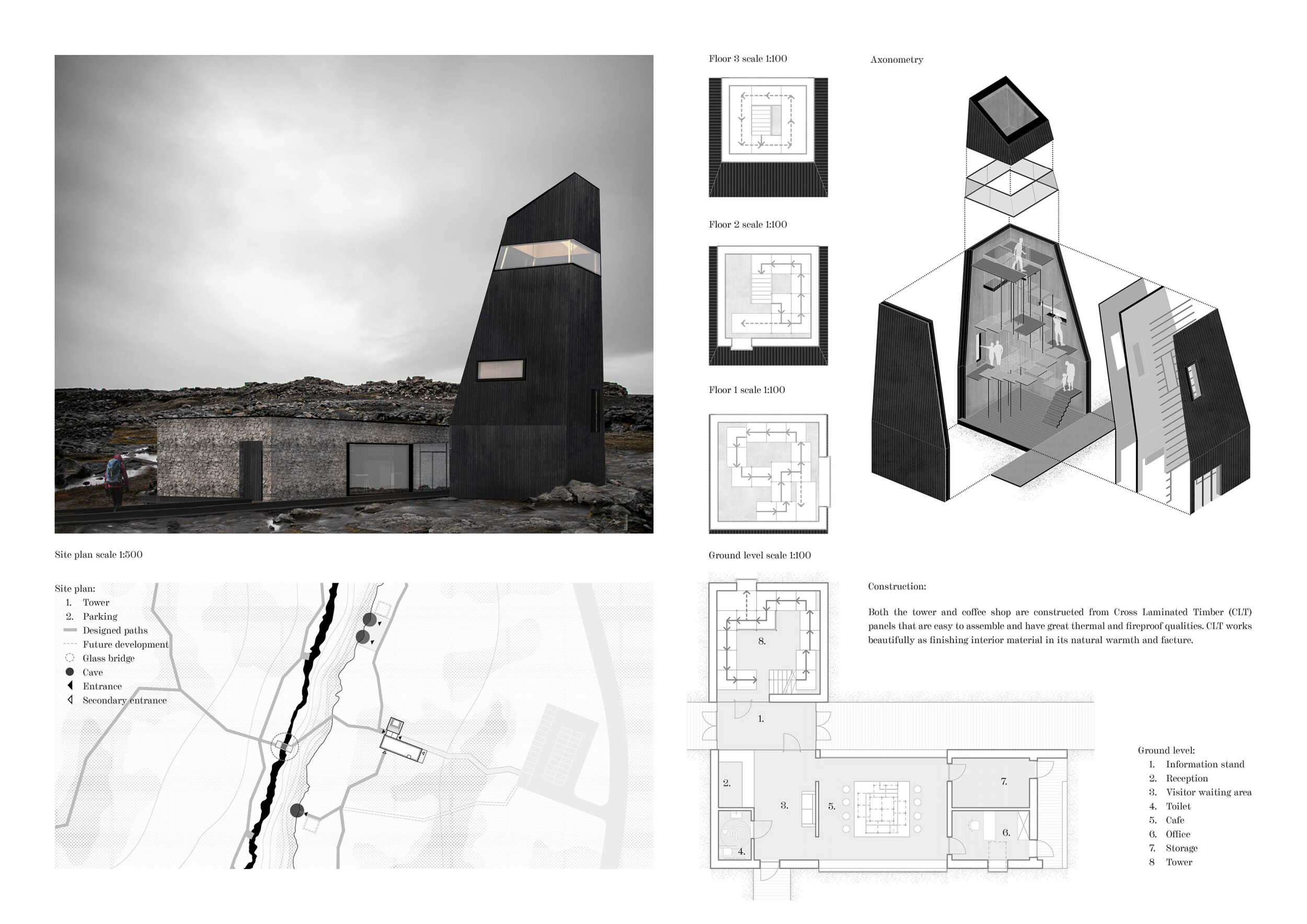 Hófsemi (translation = moderation) is a well-resolved proposal with a strong connection to the surrounding landscape and a unique lookout point. The project proposes three distinct blackened box-forms housing the toilets and showers, a visitor center, and an observation platform.