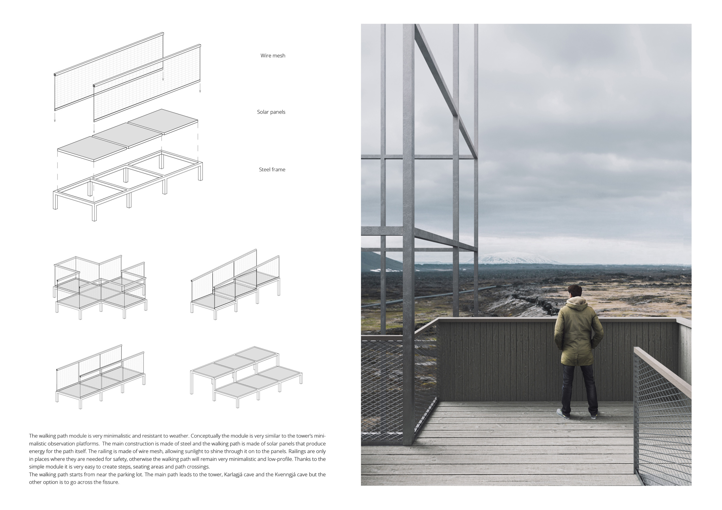 The Vogagjá fissure also houses caves that have become popular bathing spots, with waters naturally heated by volcanic flows. The caves receive thousands of annual visitors, and while the remote site of Vogar farmland has become a popular destination, its surrounding lava fields have unfortunately sustained significant damage in recent years. In addition to an observation point to identify the site, the landowners seek a modular design solution for walking paths to better preserve the fragile natural surroundings.