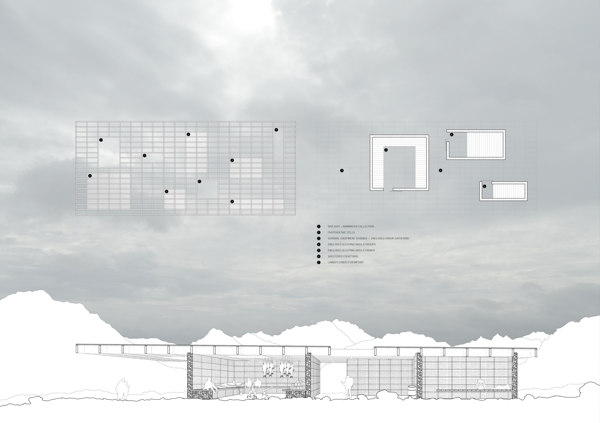 First place is awarded to a project distinguished by its clever articulation of the most basic elements of shelter — the roof and wall — to create a fully immersive experience. The shelter presents itself as an expansive roof, allowing the textured landscape to permeate through. Supporting the roof, gabion walls from local stone rise from the ground, appearing as pre existing relics in the landscape.