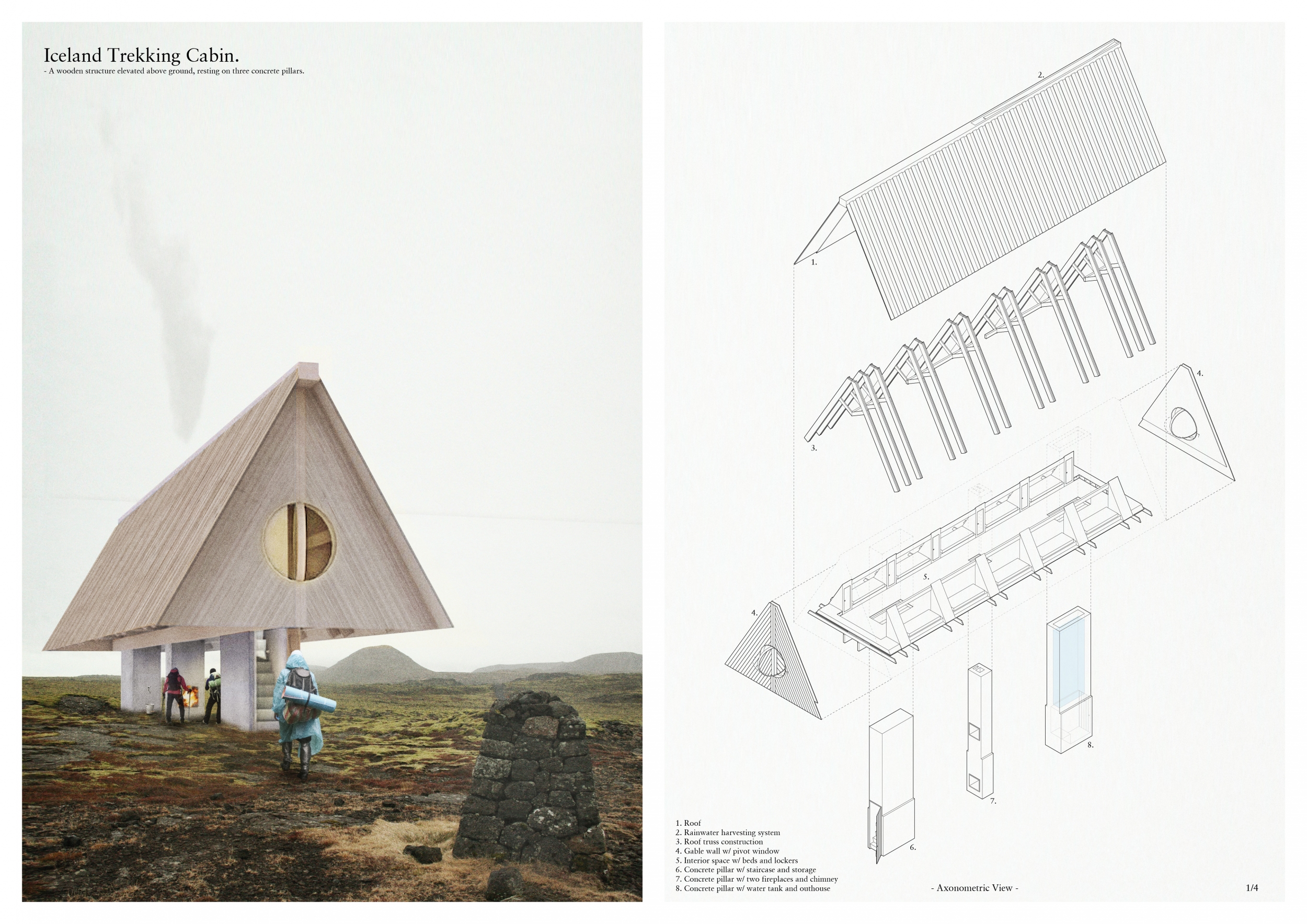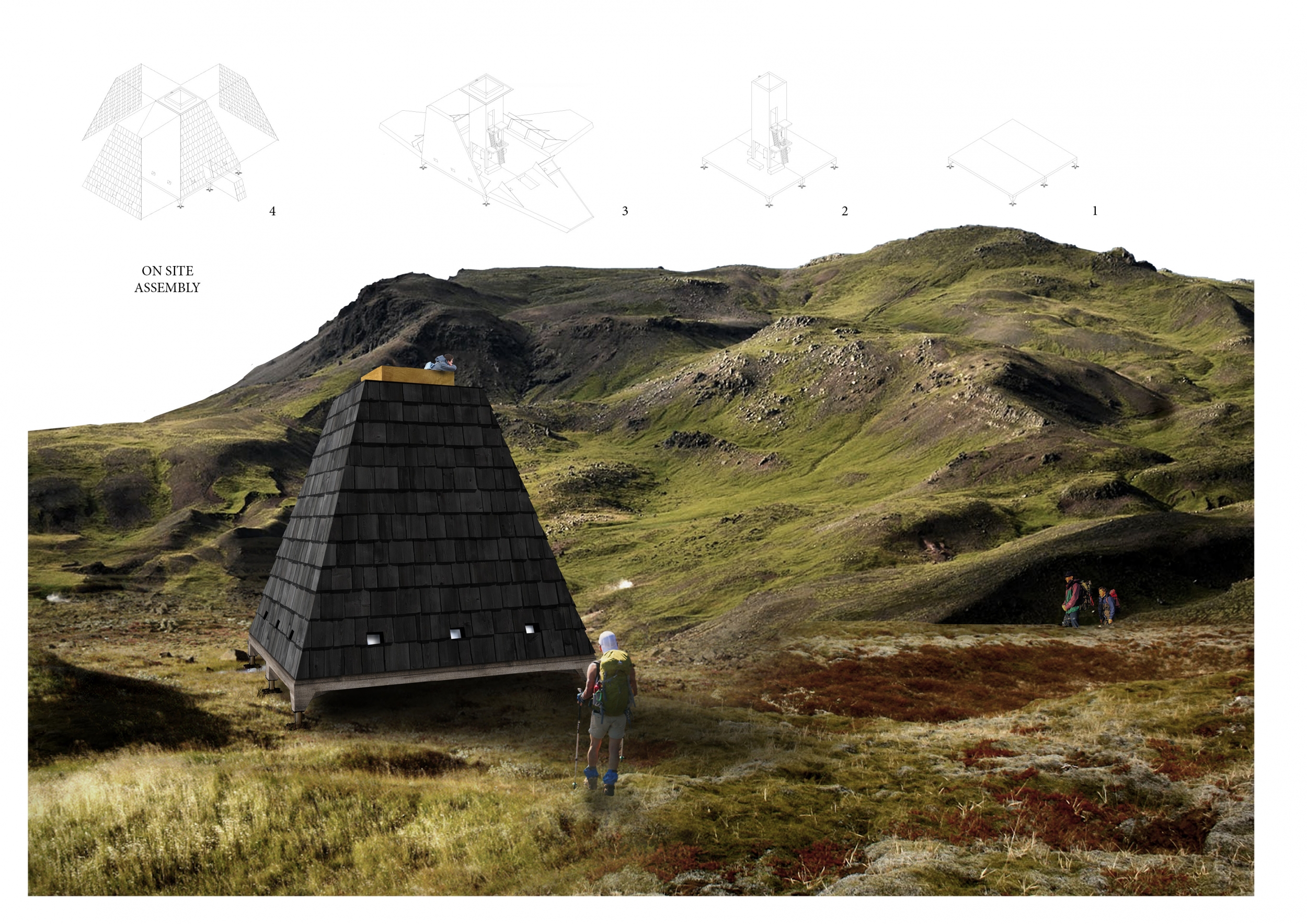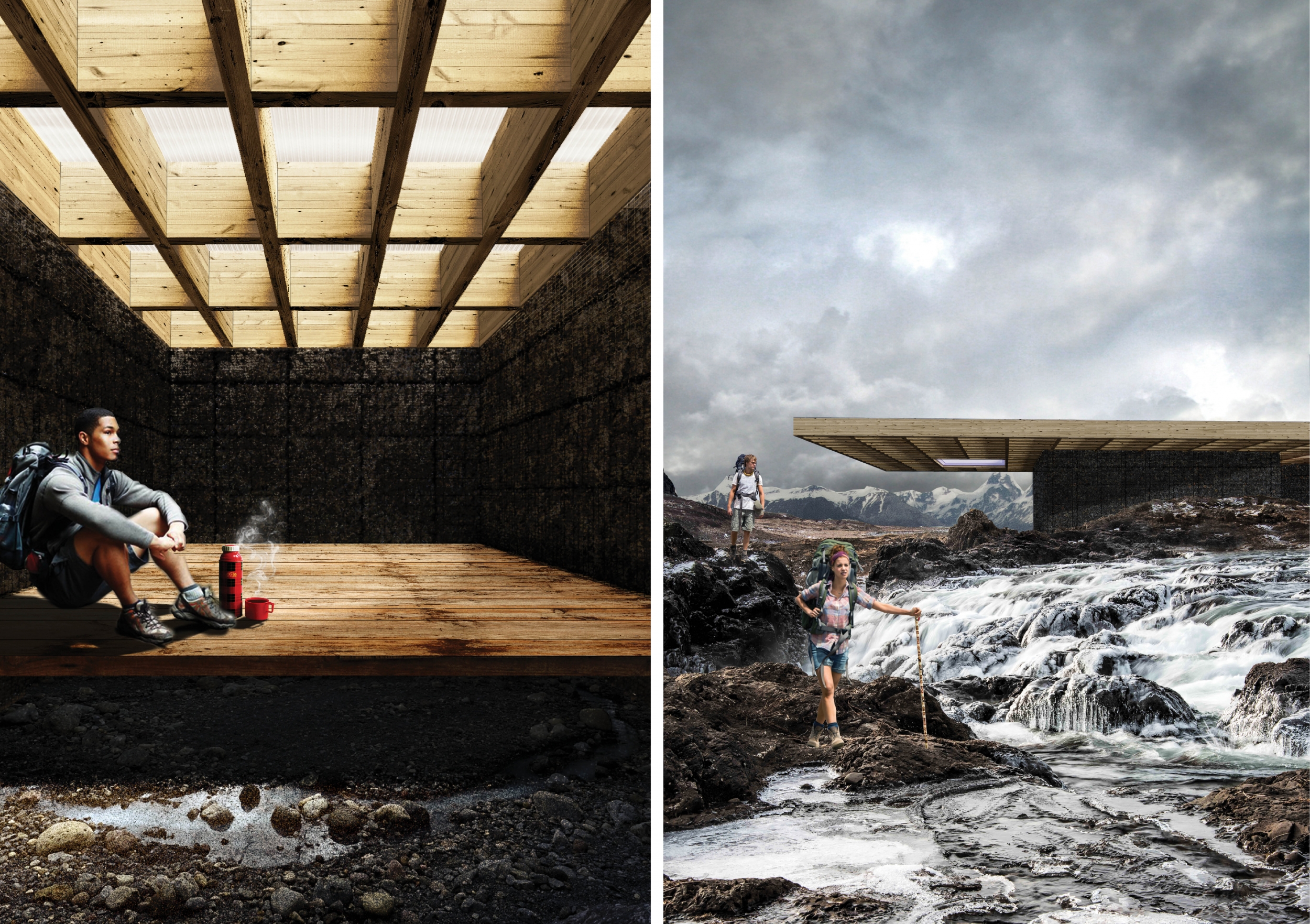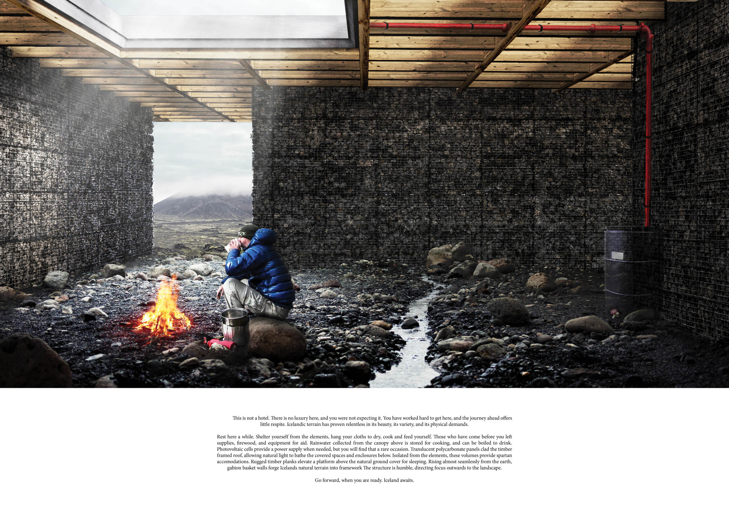 The Iceland Trekking Cabin provokes consideration of architecture's rudiments. This includes most specifically provision for enclosure, place, and social collectivity. These three issues form the conceptual framework and challenge of the brief. The project requires entrants to imagine a versatile architecture for sheltering travelers in a vast, dynamic landscape defined by topographic contrast and ecological variation; associated with cultural folklore, wonder and imagination. As a structure for nomads and backpackers, the project is culturally precedented, although urbanely by the hostel. Within the context of fjords, lava fields, glaciers, and mountains, and accompanied by the respective trekking ethos, leaving only footprints, the nearest architectural paradigm is perhaps that of a tent.