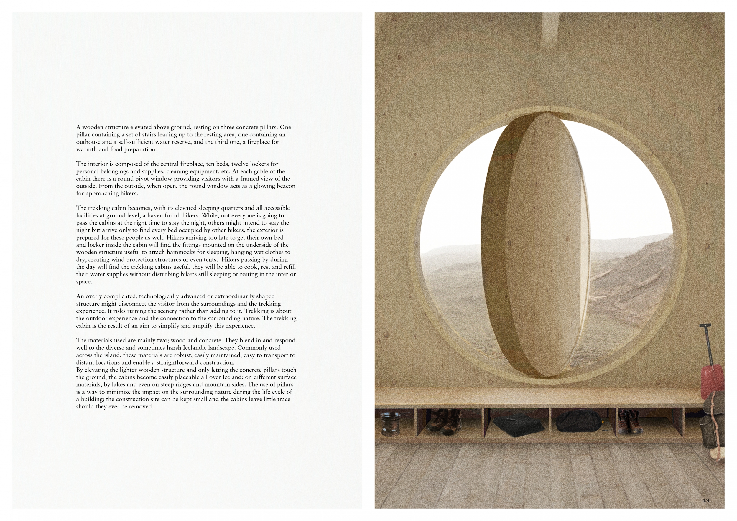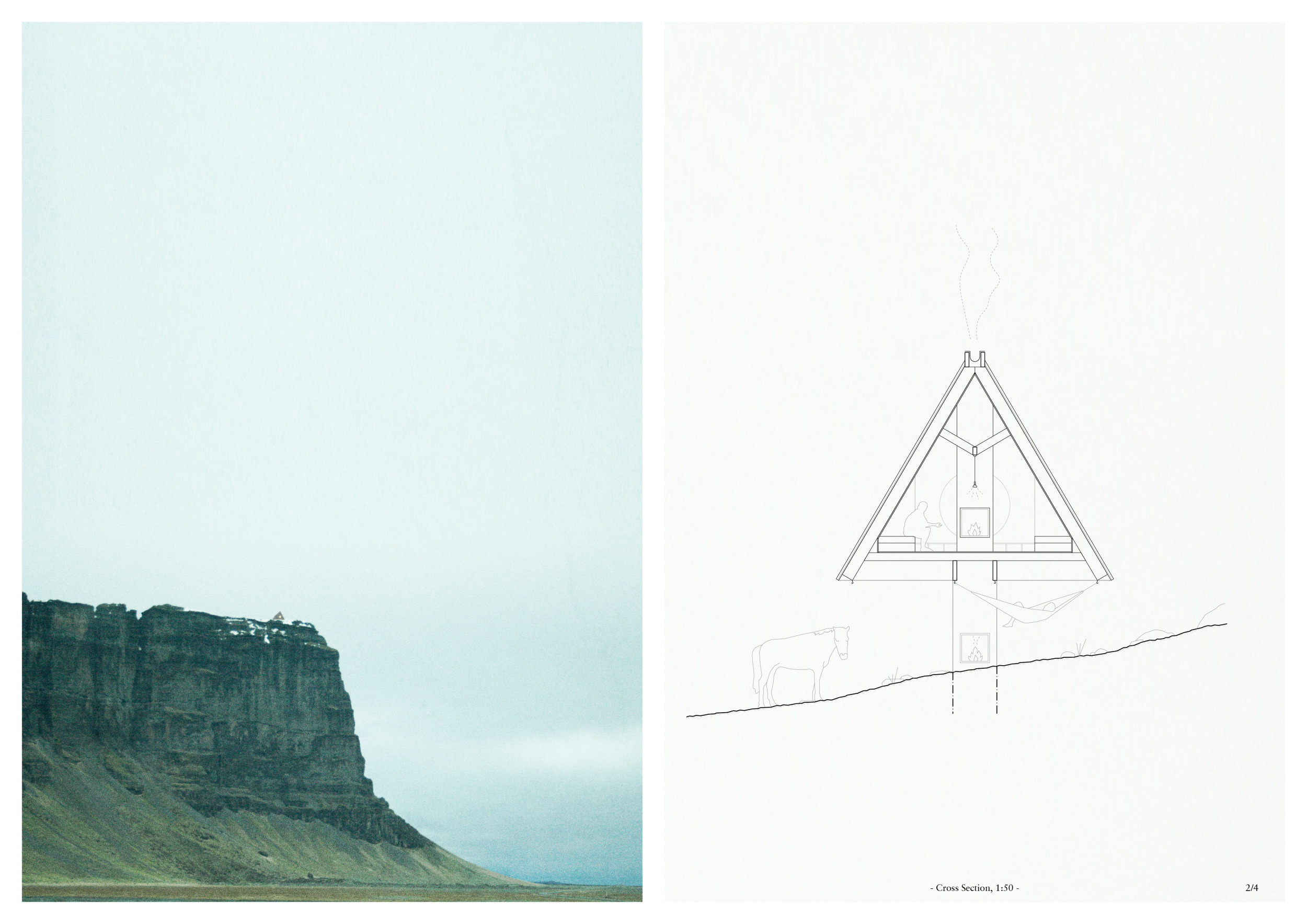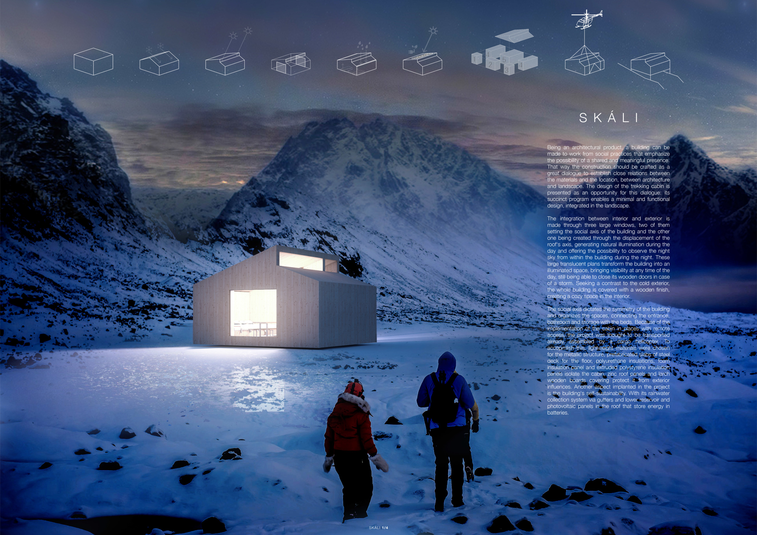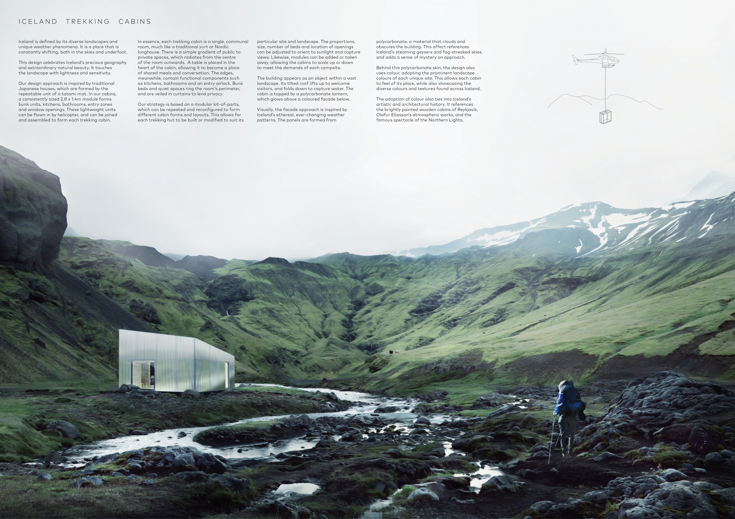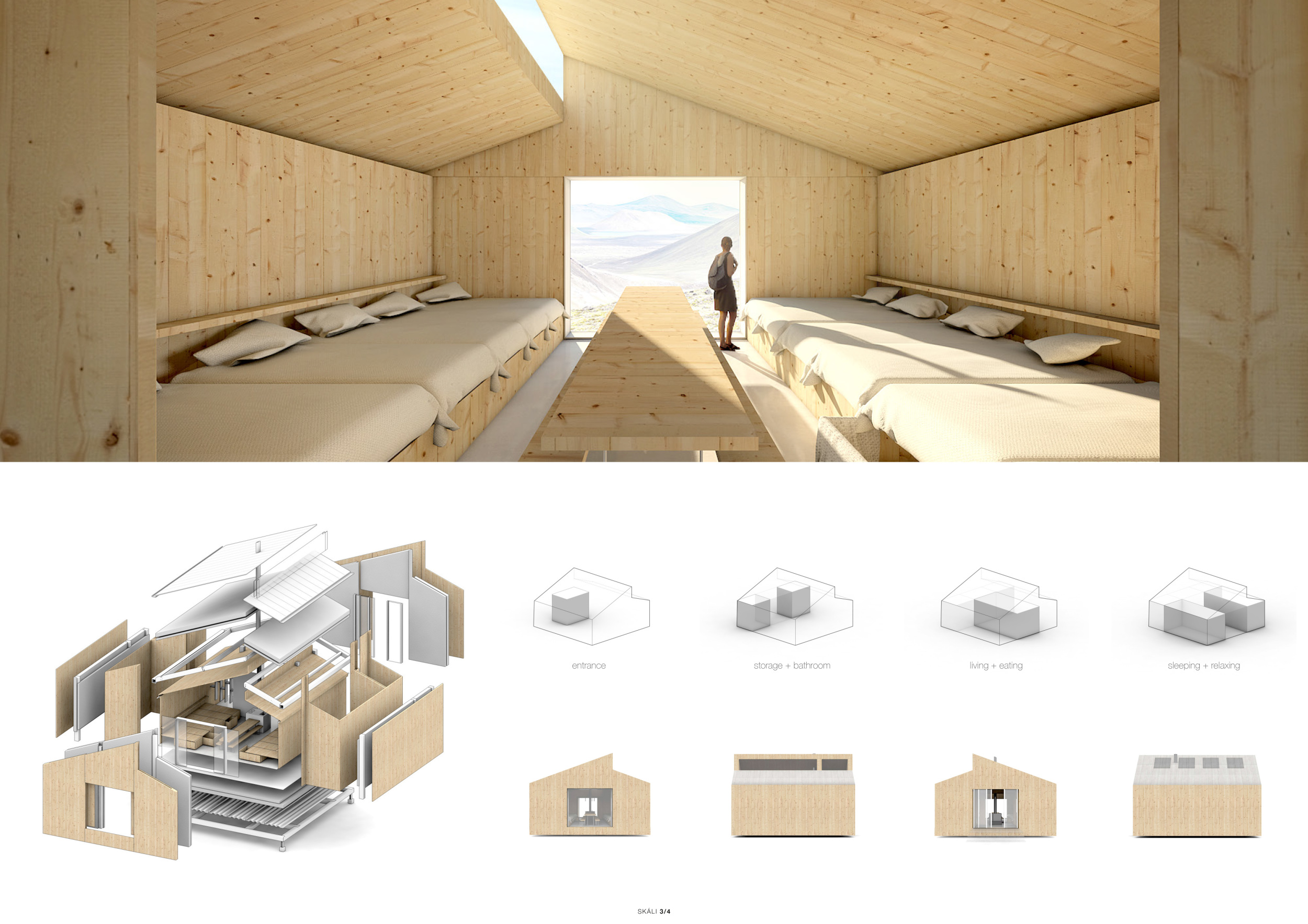 The Iceland Trekking Cabin provokes consideration of architecture's rudiments. This includes most specifically provision for enclosure, place, and social collectivity. These three issues form the conceptual framework and challenge of the brief. The project requires entrants to imagine a versatile architecture for sheltering travelers in a vast, dynamic landscape defined by topographic contrast and ecological variation; associated with cultural folklore, wonder and imagination. As a structure for nomads and backpackers, the project is culturally precedented, although urbanely by the hostel. Within the context of fjords, lava fields, glaciers, and mountains, and accompanied by the respective trekking ethos, leaving only footprints, the nearest architectural paradigm is perhaps that of a tent.