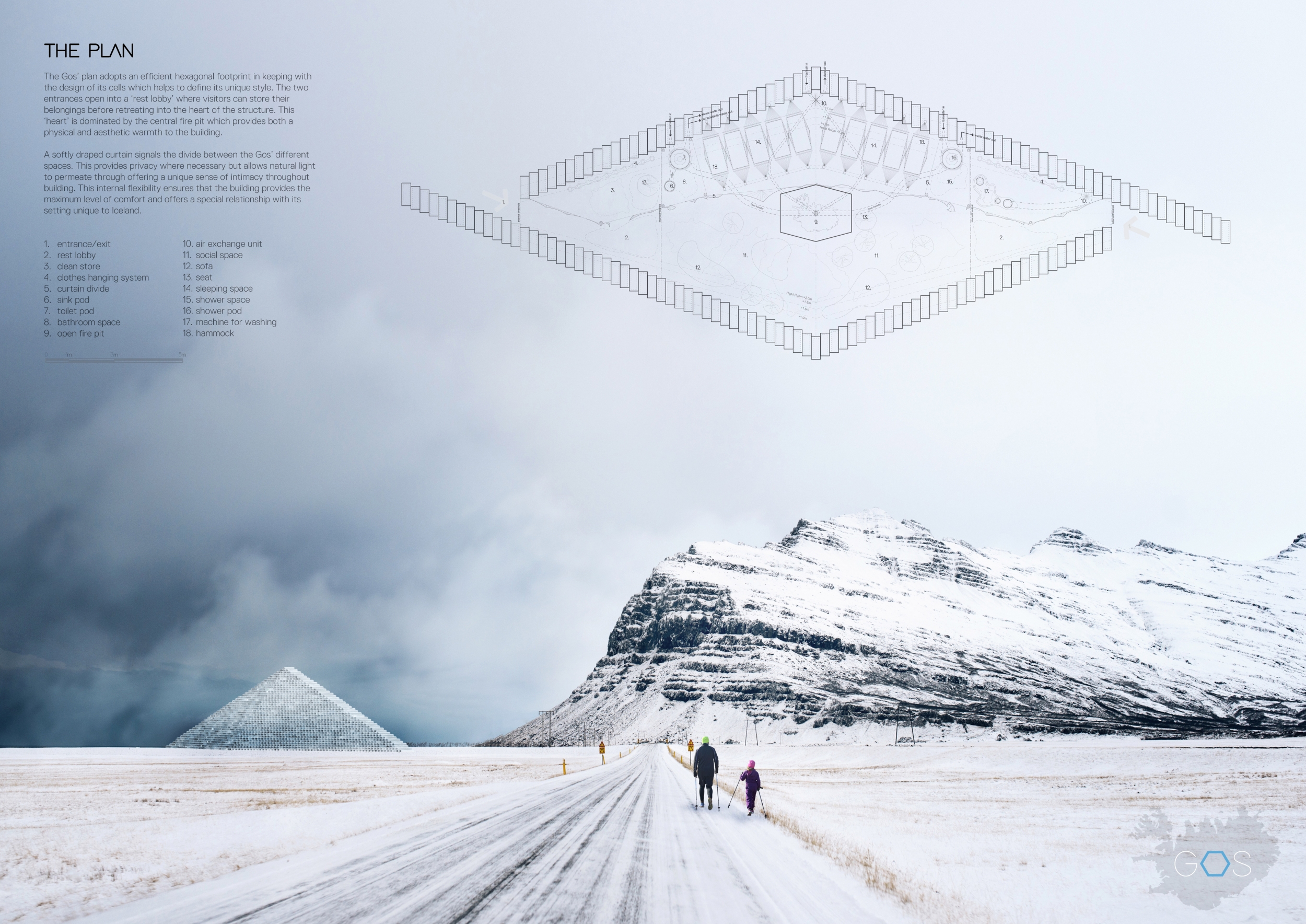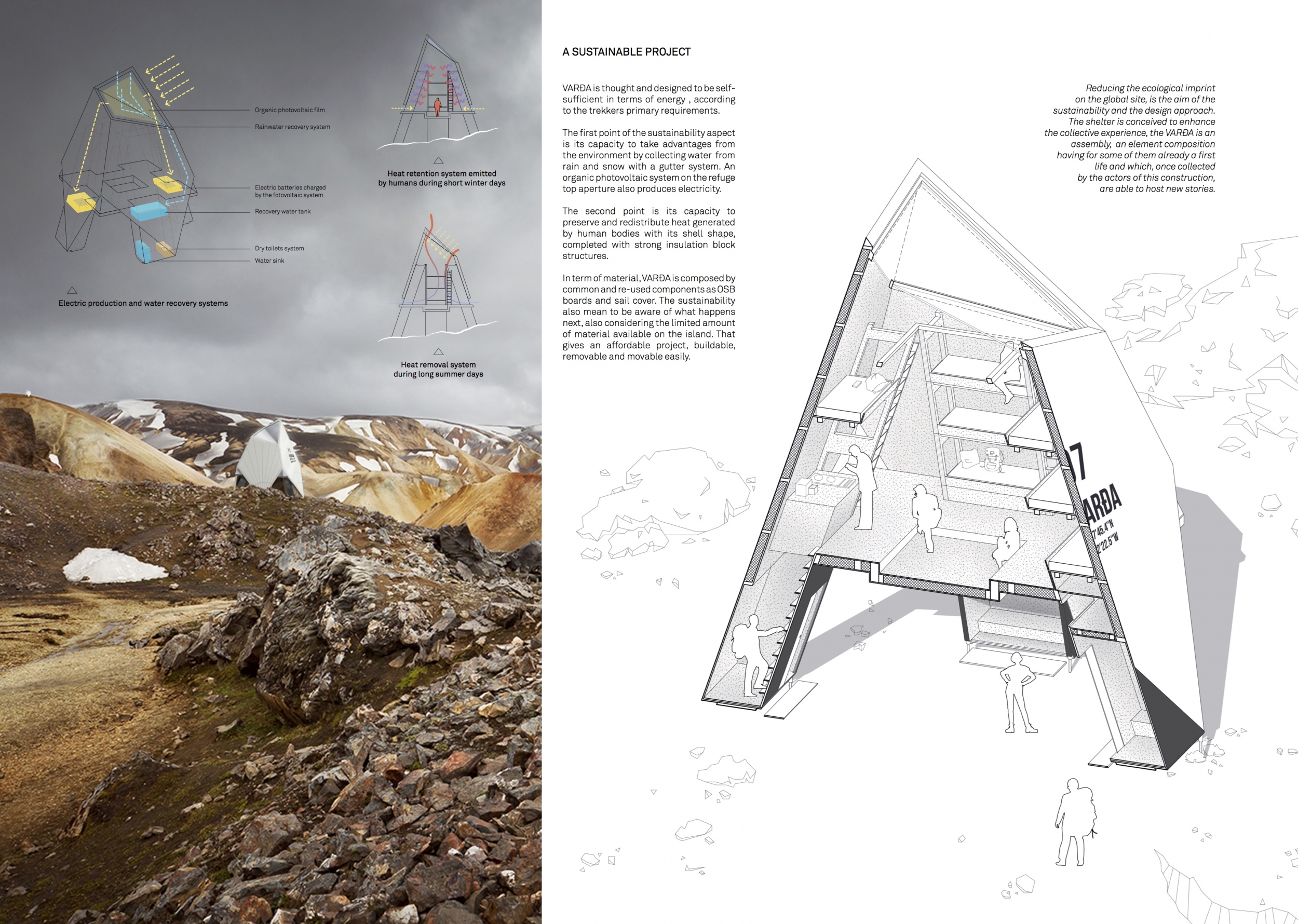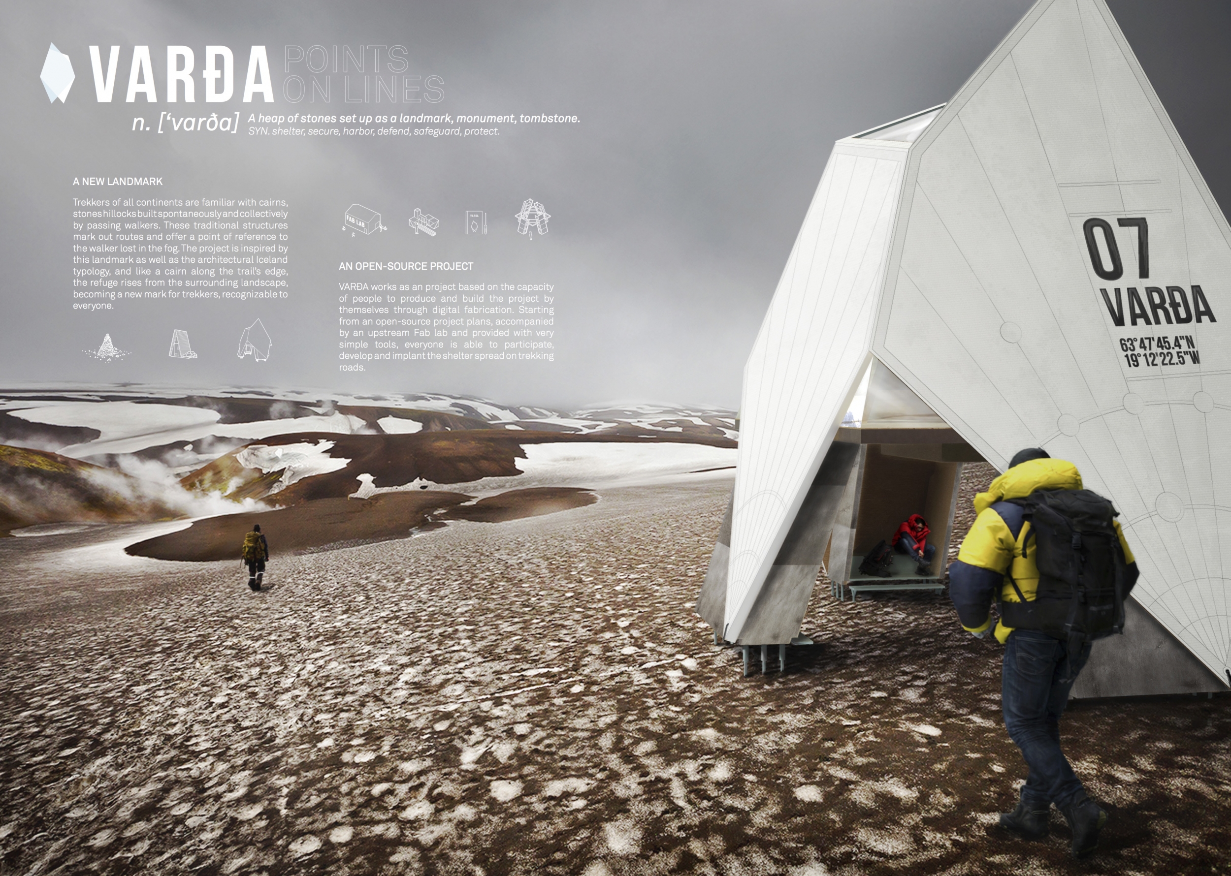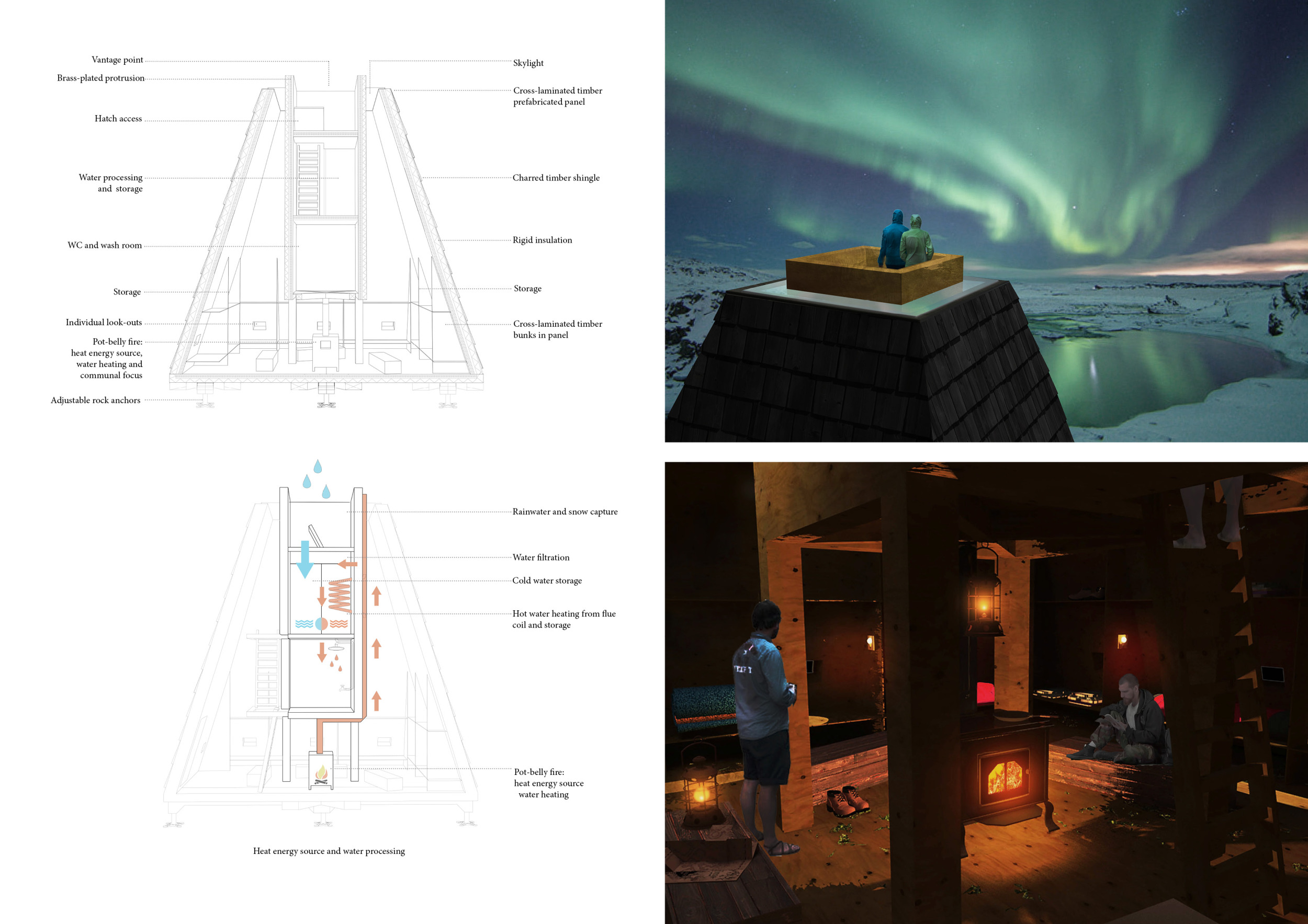 The Iceland Trekking Cabin provokes consideration of architecture's rudiments. This includes most specifically provision for enclosure, place, and social collectivity. These three issues form the conceptual framework and challenge of the brief. The project requires entrants to imagine a versatile architecture for sheltering travelers in a vast, dynamic landscape defined by topographic contrast and ecological variation; associated with cultural folklore, wonder and imagination. As a structure for nomads and backpackers, the project is culturally precedented, although urbanely by the hostel. Within the context of fjords, lava fields, glaciers, and mountains, and accompanied by the respective trekking ethos, leaving only footprints, the nearest architectural paradigm is perhaps that of a tent.