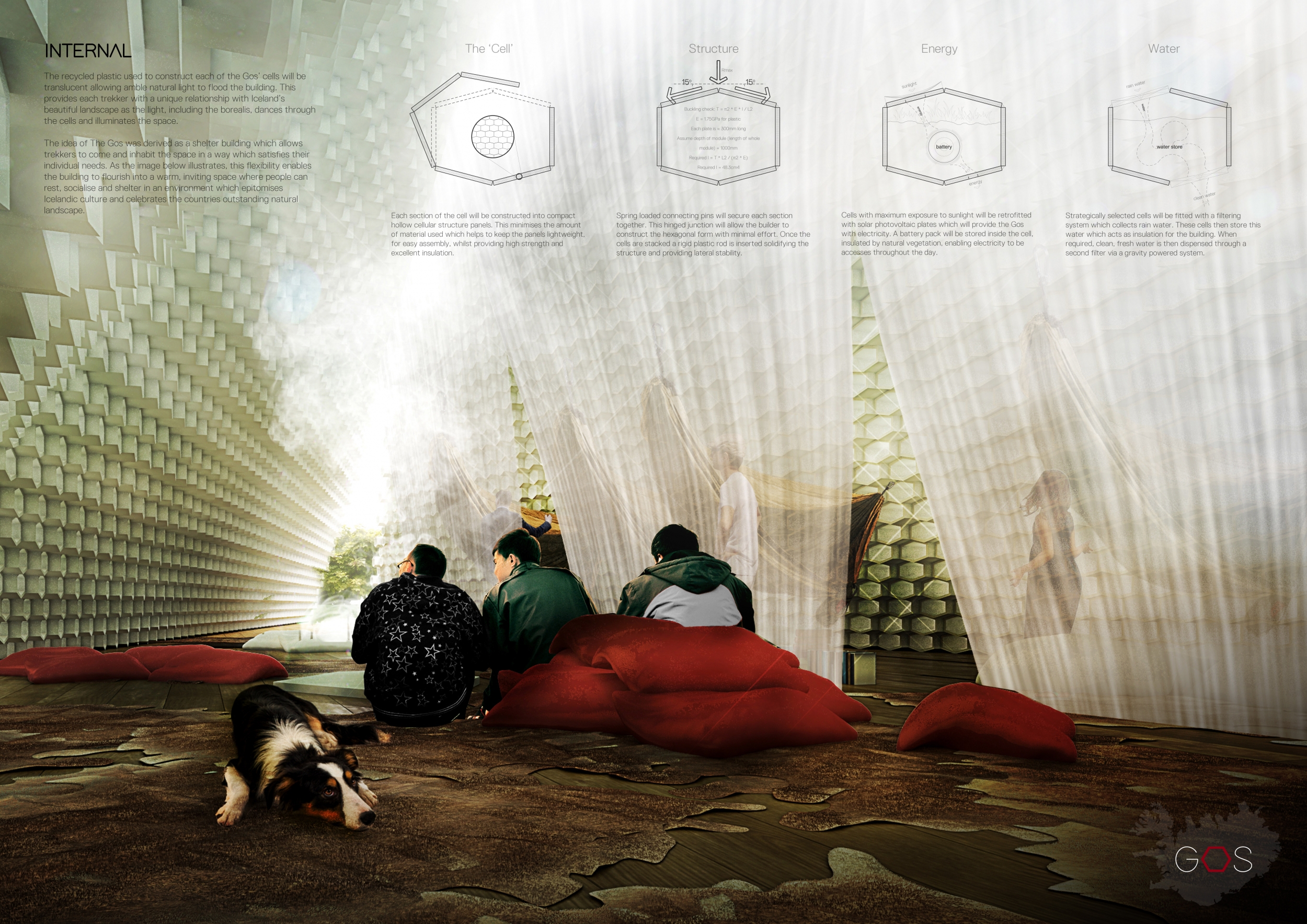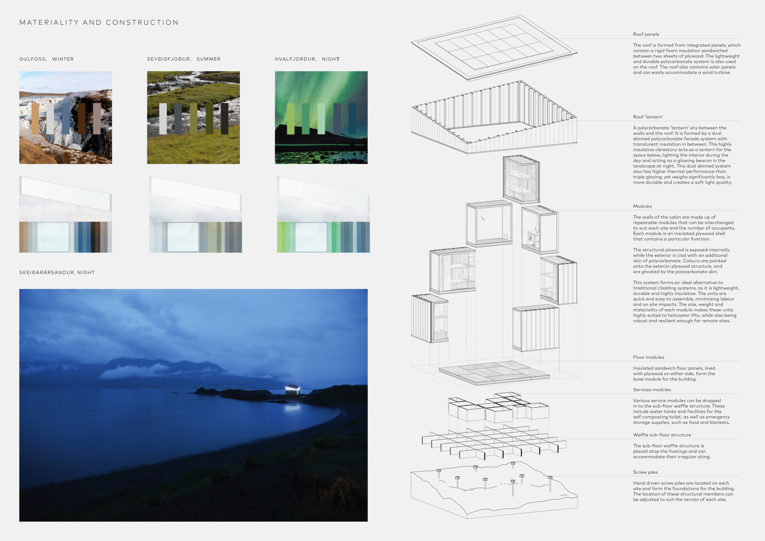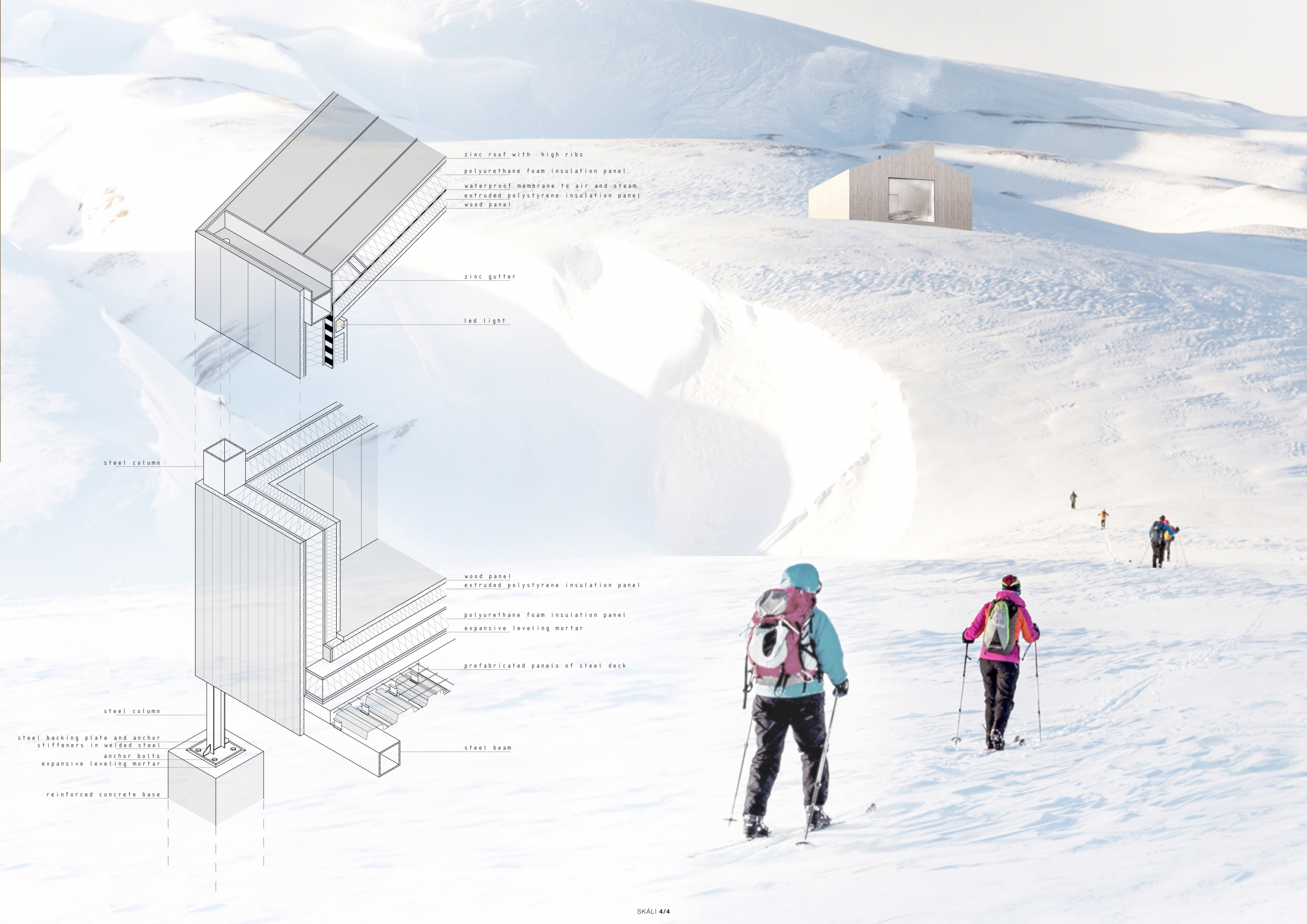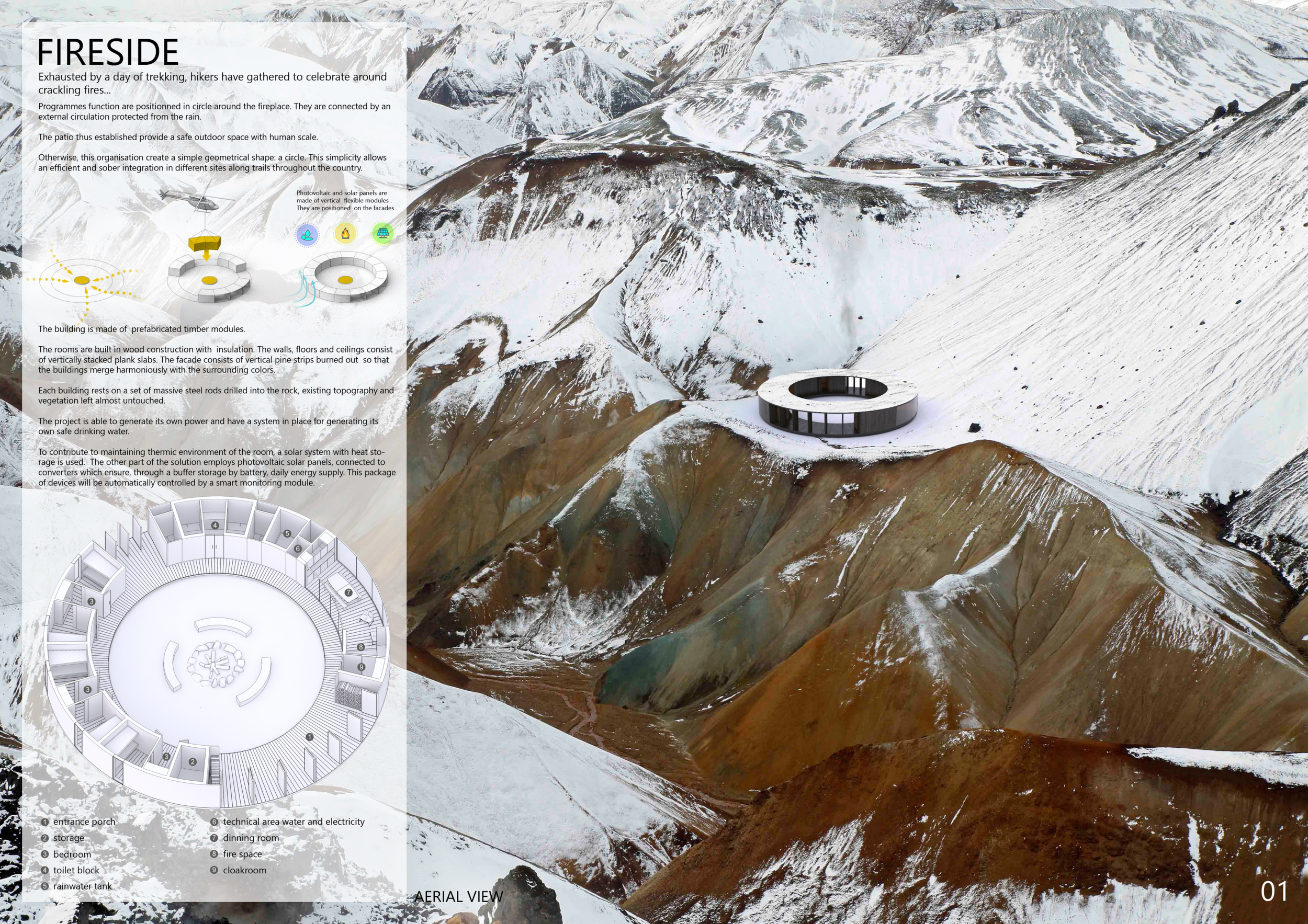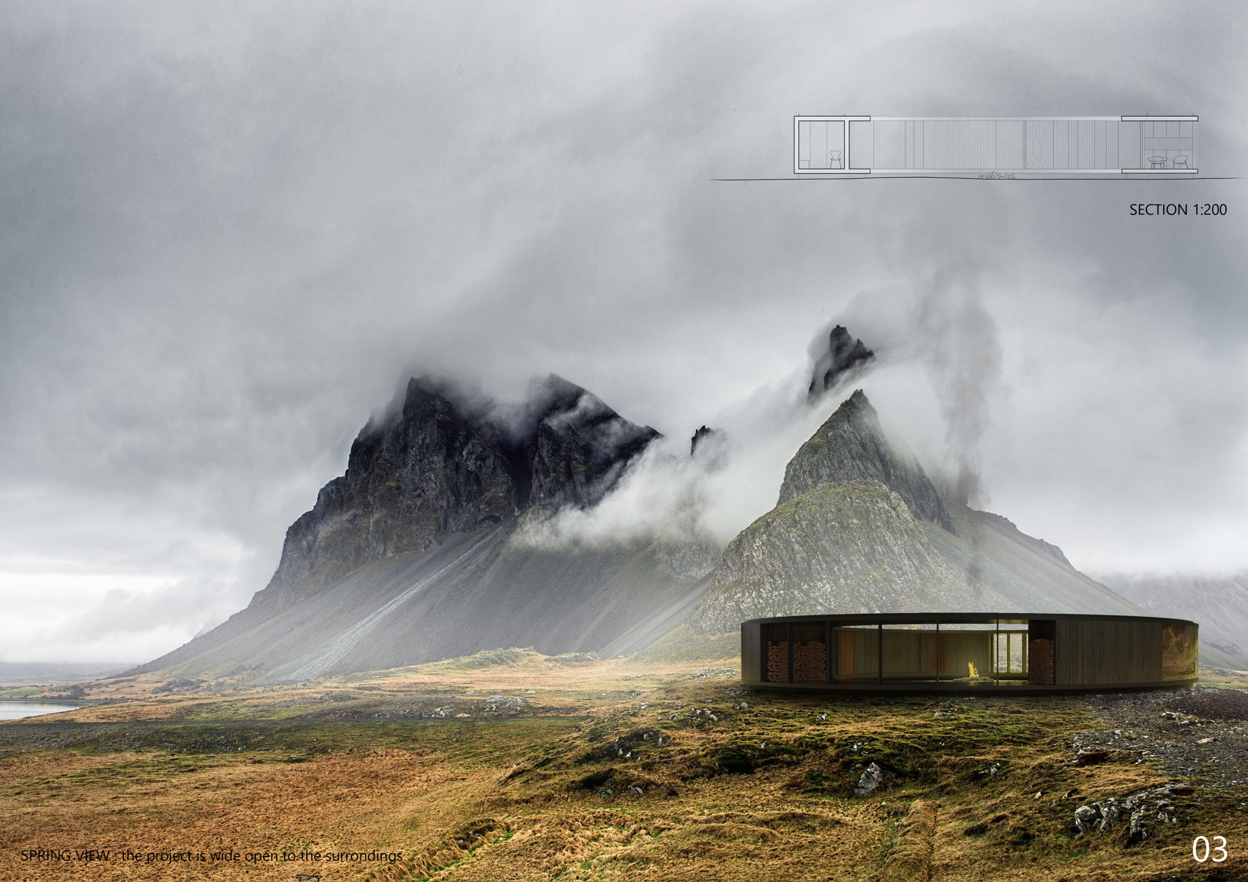 The Iceland Trekking Cabin provokes consideration of architecture's rudiments. This includes most specifically provision for enclosure, place, and social collectivity. These three issues form the conceptual framework and challenge of the brief. The project requires entrants to imagine a versatile architecture for sheltering travelers in a vast, dynamic landscape defined by topographic contrast and ecological variation; associated with cultural folklore, wonder and imagination. As a structure for nomads and backpackers, the project is culturally precedented, although urbanely by the hostel. Within the context of fjords, lava fields, glaciers, and mountains, and accompanied by the respective trekking ethos, leaving only footprints, the nearest architectural paradigm is perhaps that of a tent.