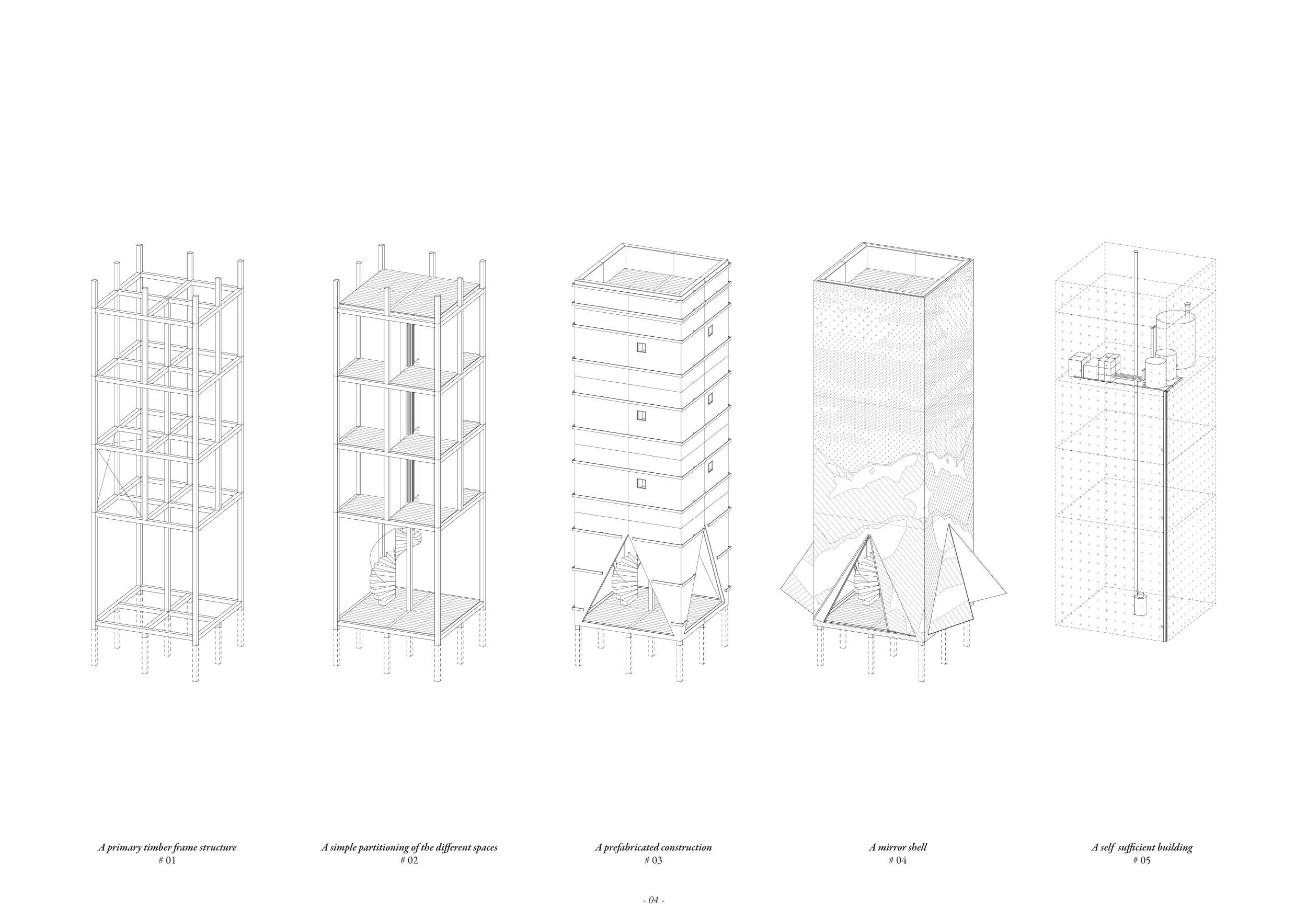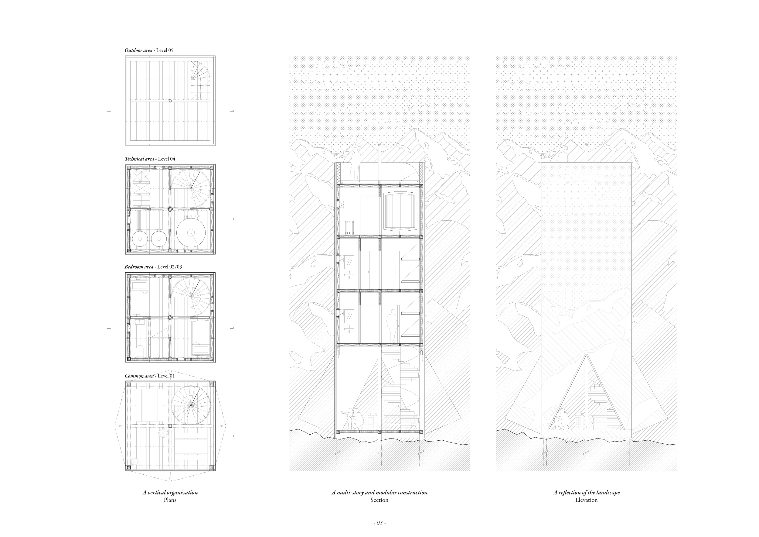 The success of the second place proposal for the Iceland Trekking Cabins competition lies in its simplicity and strength of parti. Three aligned and evenly spaced concrete cores contain the circulation, hearth, and bathroom of the cabin and also serve to elevate the structure above the ground.