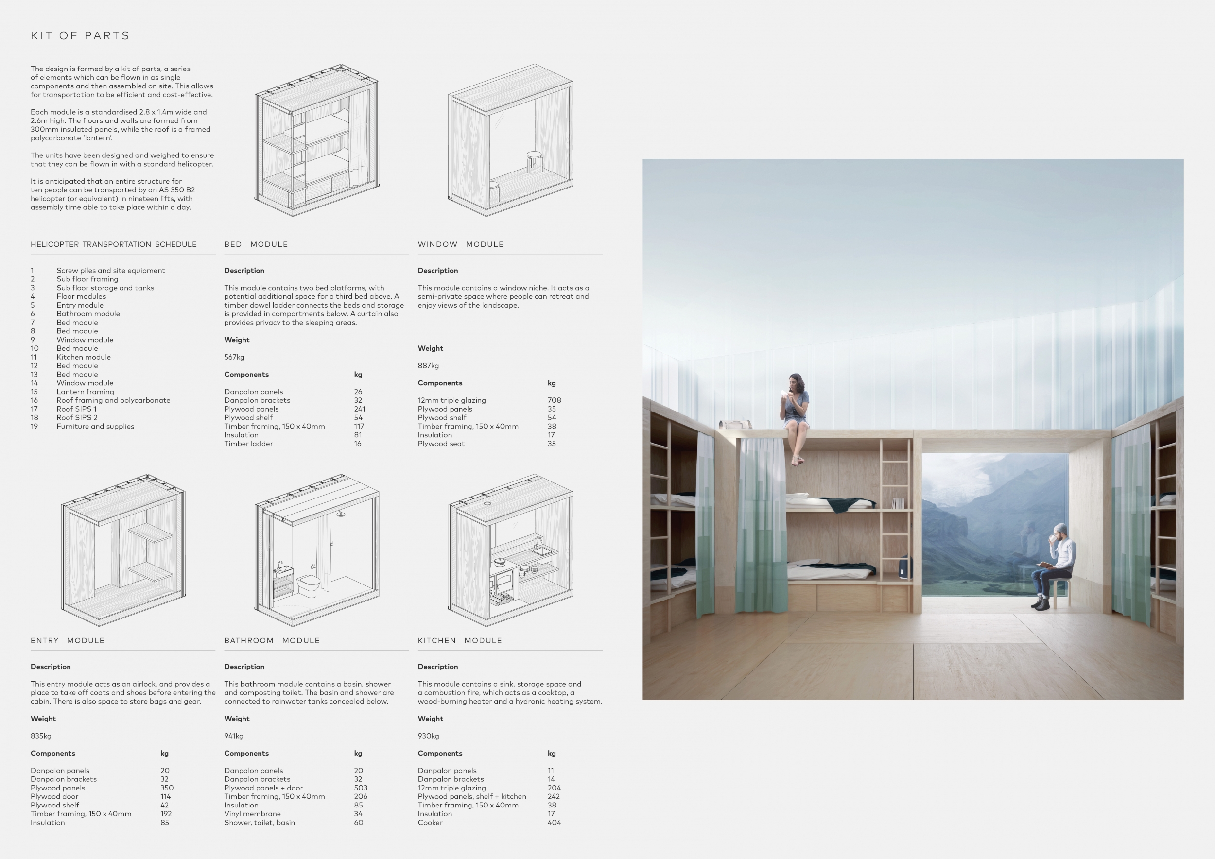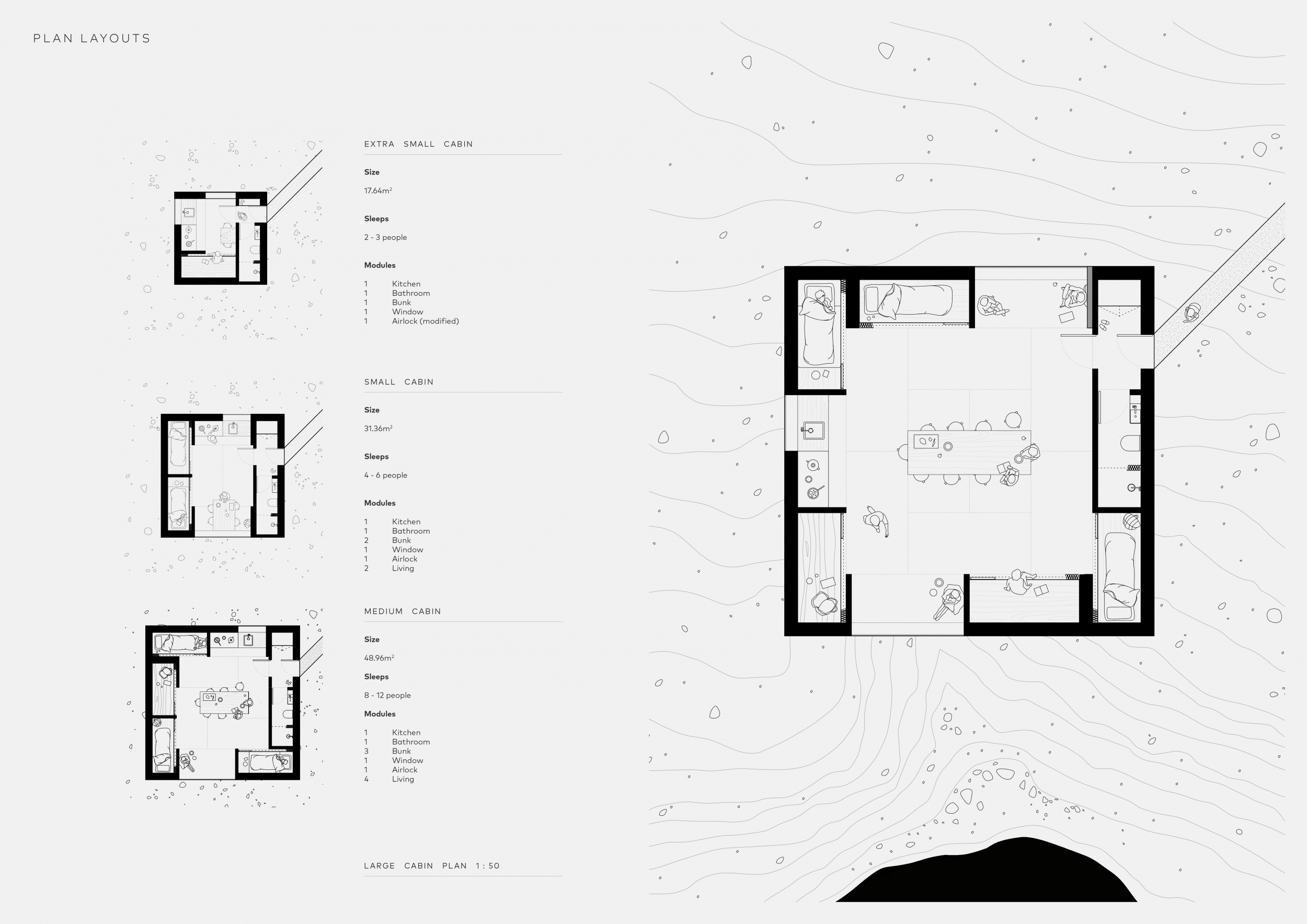 The third place entry for the Iceland trekking cabin proposal sets itself apart in the use of cabinetry as a language to create shelter. Through the dimensional unit of the tatami mat, the project creates a modular furniture system that defines the perimeter of the shared central space, creating a gradient between the common dining area and private sleeping cells.