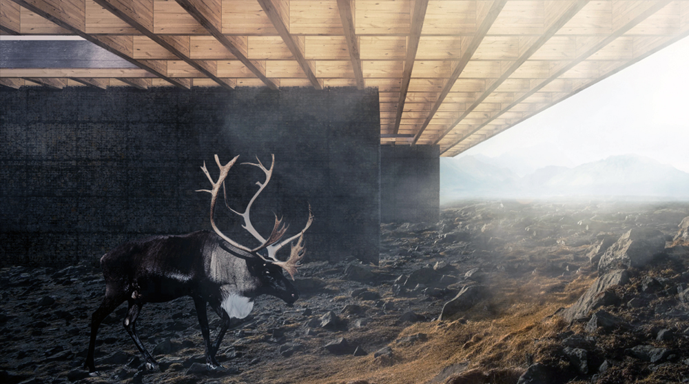 The success of the second place proposal for the Iceland Trekking Cabins competition from a team in Sweden, lies in its simplicity and strength of parti. With three aligned and evenly spaced concrete cores that contain the circulation, hearth, and bathroom of the cabin, these elements allow for extra shelter beneath the structure to create a public gathering space while solving the difficult problem of maintenance under heavy snow conditions.