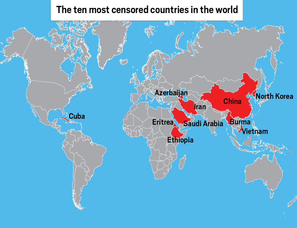 Different ideas and aspects of free speech are censored in different countries, and a surprisingly high number of countries censor their internet in some way. Countries with well-known strict regimes such as North Korea are amongst the most controlling. In fact, alongside Eritrea, North Korea is one of the top two most censored countries in the world, according to a list compiled by the Committee to Protect Journalists of the 10 countries where the press is most restricted. In North Korea, all websites are under government control and only about 4% of the population has access to the internet.