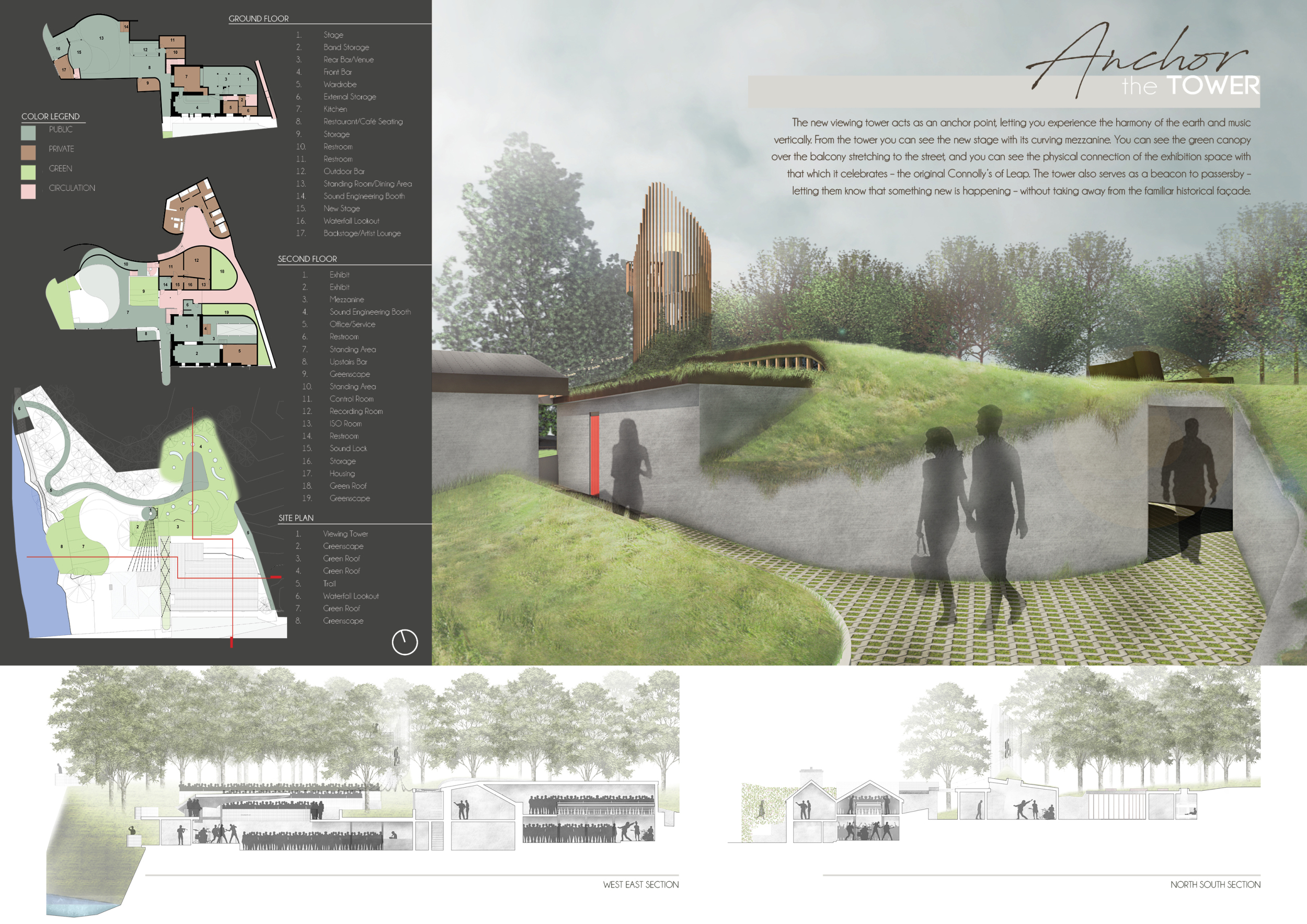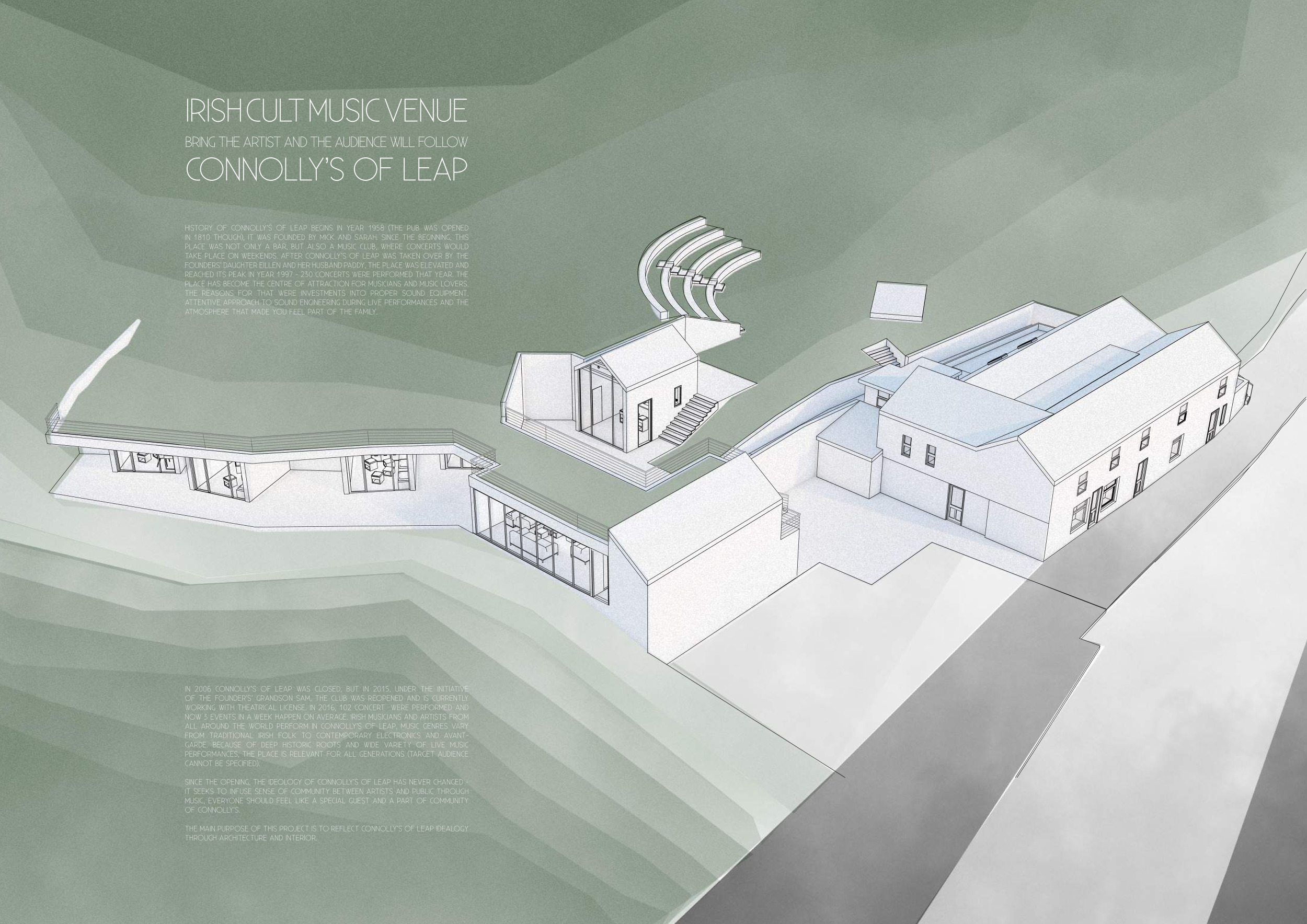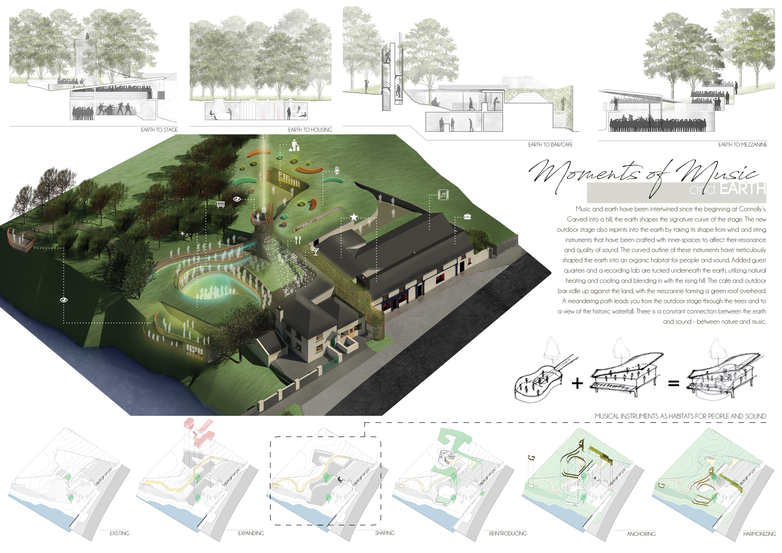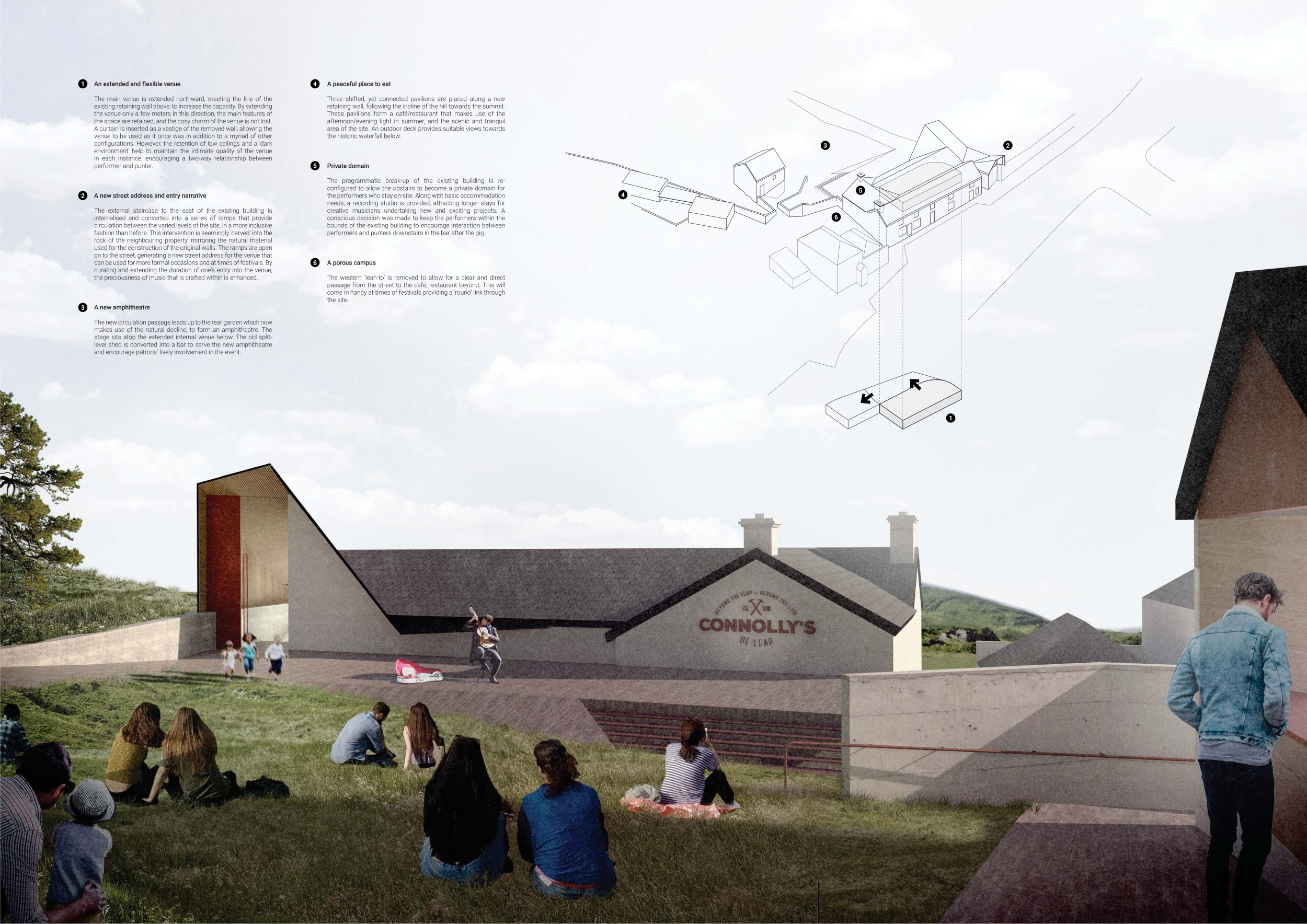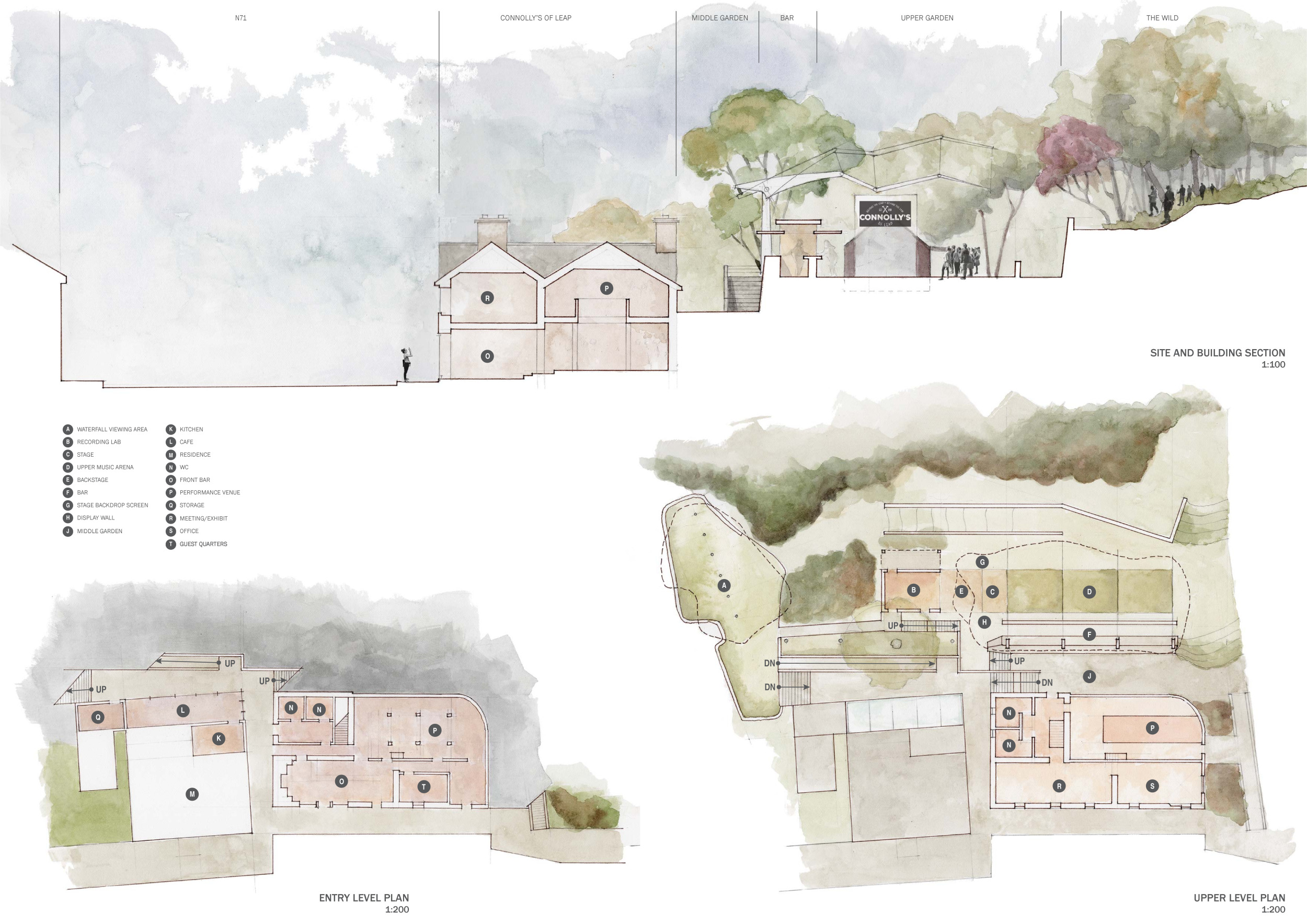 This competition tasked participants with envisioning a concept for a renovation and programmatic extension of the Connolly’s of Leap venue. The site, located on a steep hill next to the storied ravine and a waterfall, contains the existing music venue building and family quarters, as well as a collection of outbuildings today used for storage. Participants were challenged to re-think the site and its ability to offer a unique setting for musical performance in two ways: first the refurbishment of the existing venue with the possibility of altering it with design interventions; and second, an expansion within the site to include the following recommended programs: an external performance zone with a bar, a cafe or restaurant, external seating area, a recording lab, management offices, a creative workshop and studio spaces, exhibition spaces, a waterfall viewing deck, parking, guest quarters for visiting artists, and a sound engineering booth for stage. This list of programs was left open to interpretation and modification by each participant.