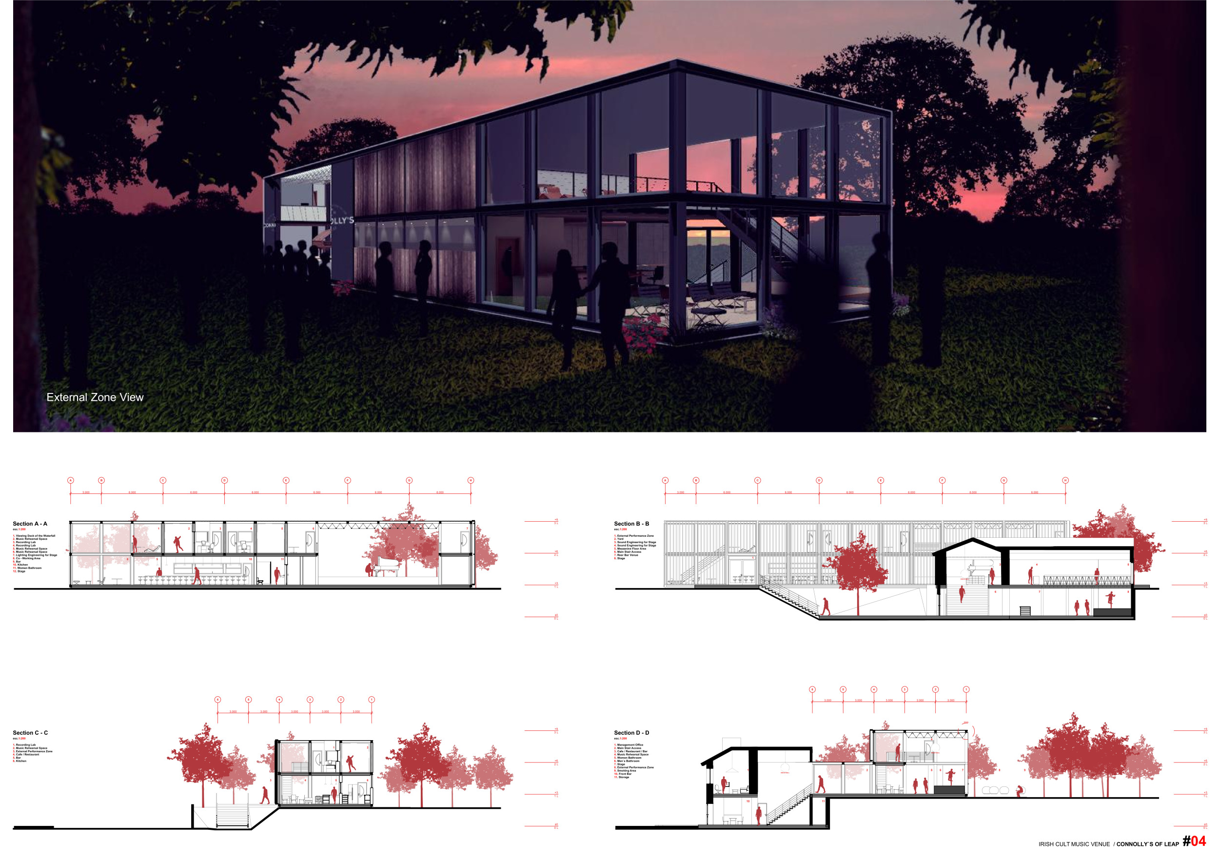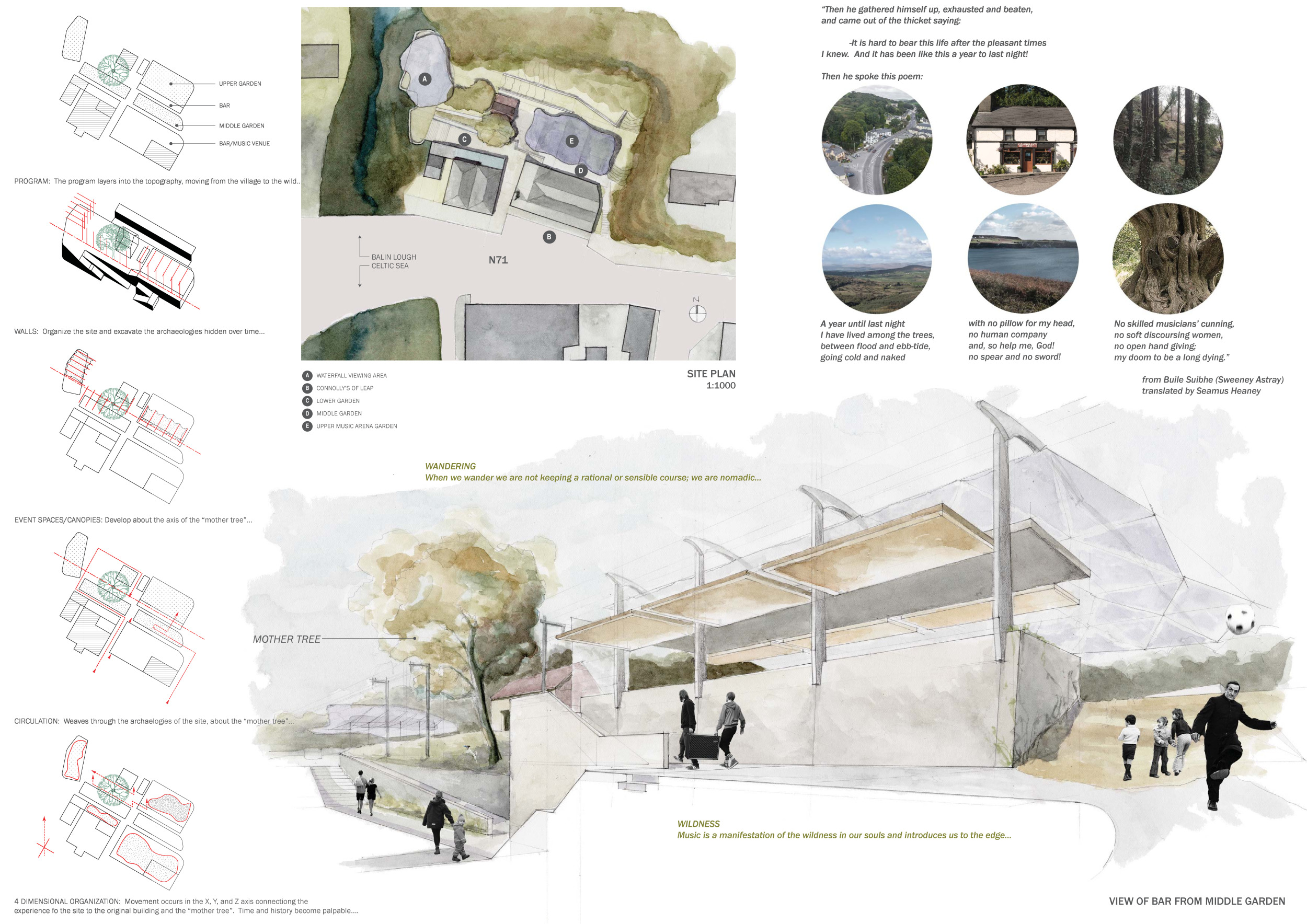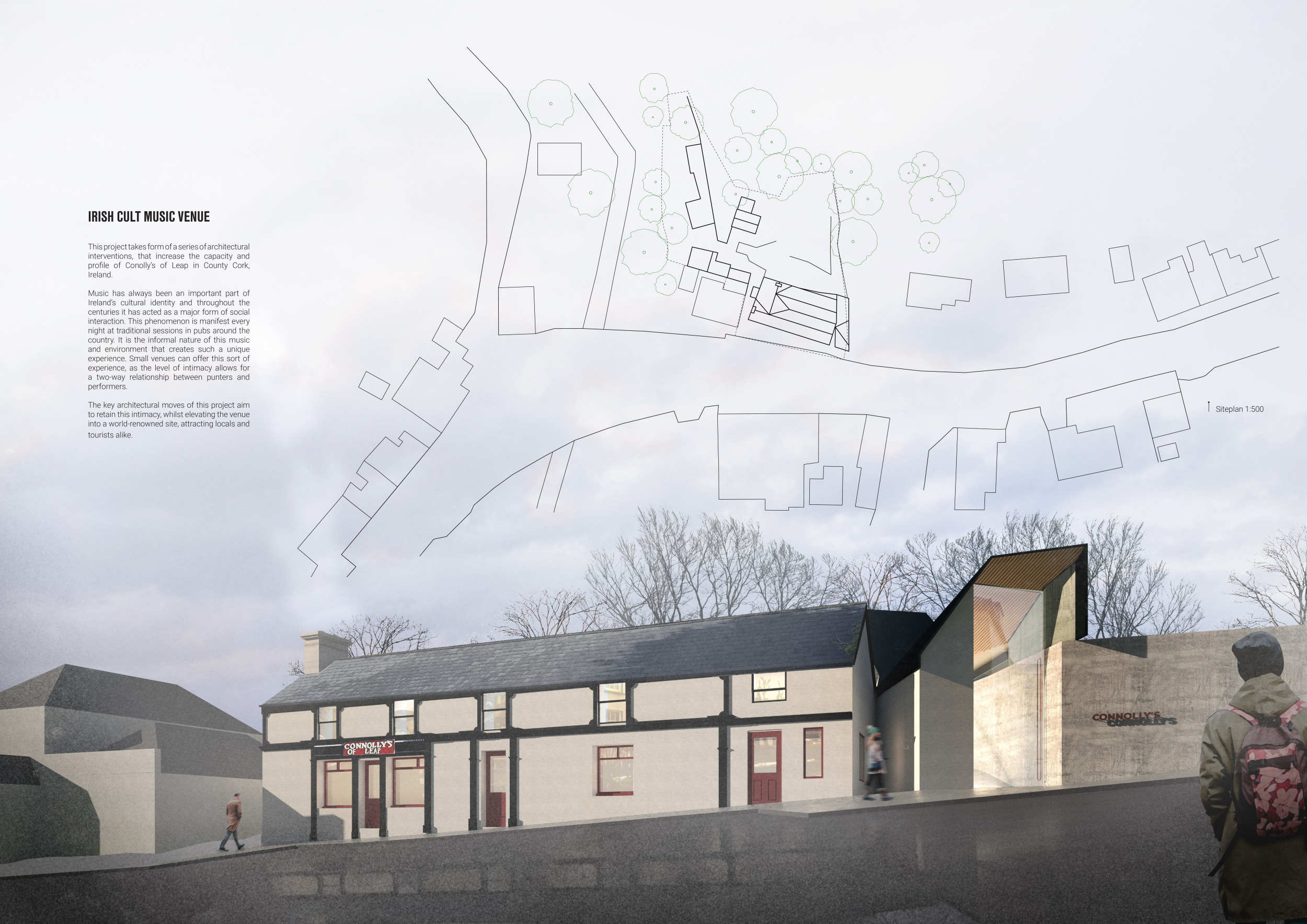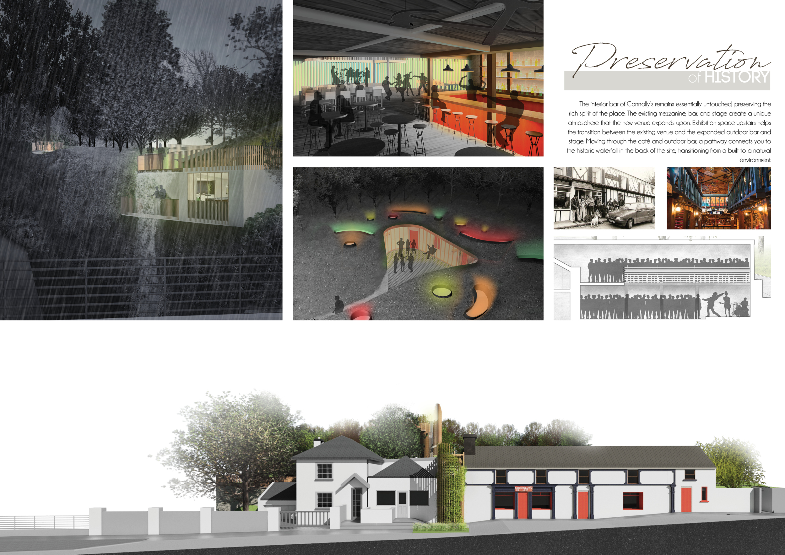 This competition tasked participants with envisioning a concept for a renovation and programmatic extension of the Connolly’s of Leap venue. The site, located on a steep hill next to the storied ravine and a waterfall, contains the existing music venue building and family quarters, as well as a collection of outbuildings today used for storage. Participants were challenged to re-think the site and its ability to offer a unique setting for musical performance in two ways: first the refurbishment of the existing venue with the possibility of altering it with design interventions; and second, an expansion within the site to include the following recommended programs: an external performance zone with a bar, a cafe or restaurant, external seating area, a recording lab, management offices, a creative workshop and studio spaces, exhibition spaces, a waterfall viewing deck, parking, guest quarters for visiting artists, and a sound engineering booth for stage. This list of programs was left open to interpretation and modification by each participant.