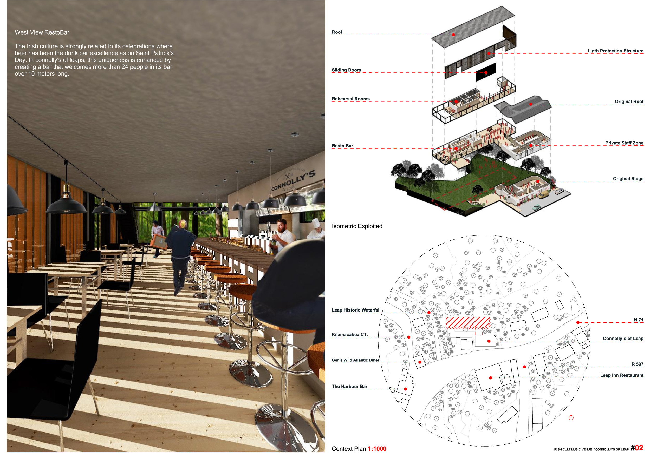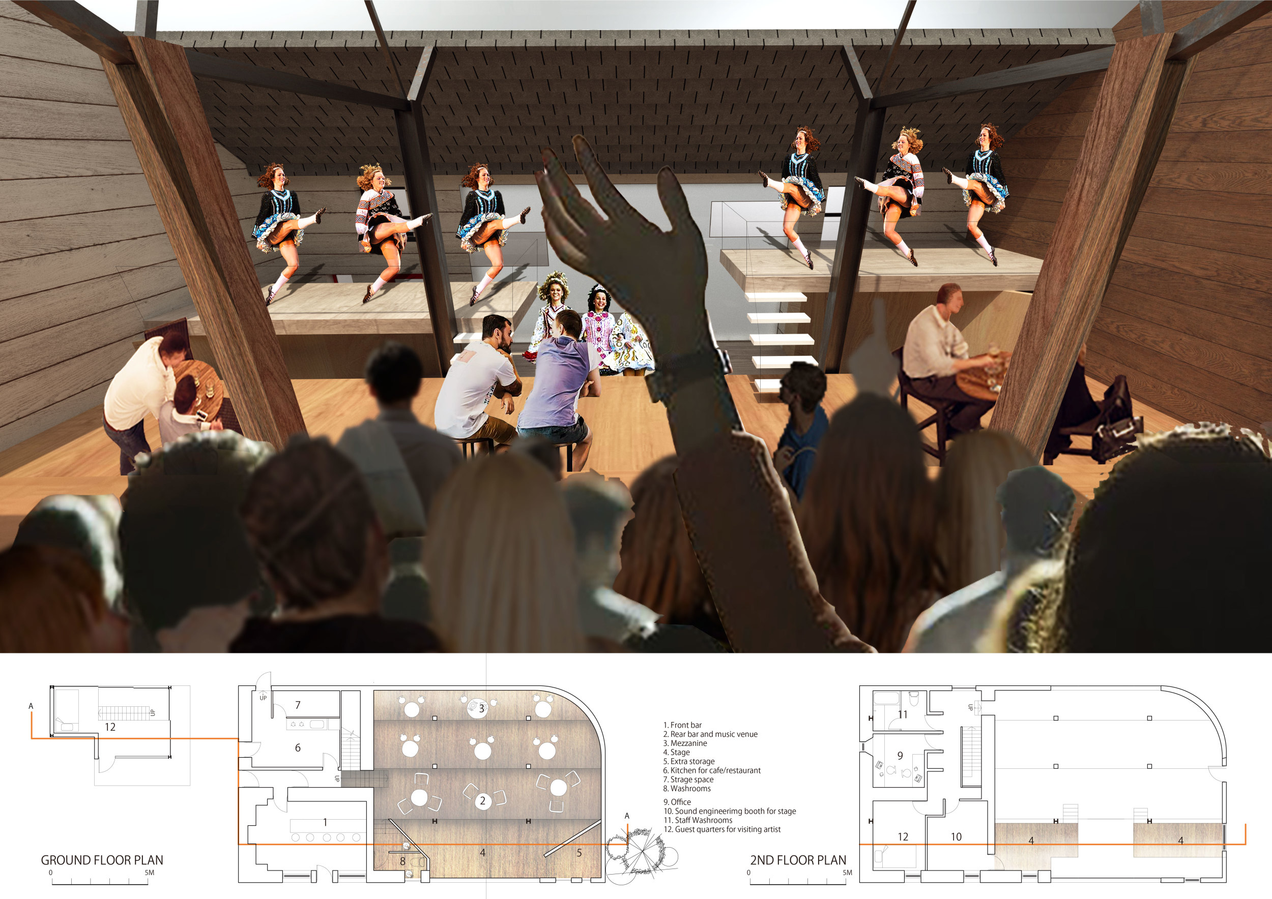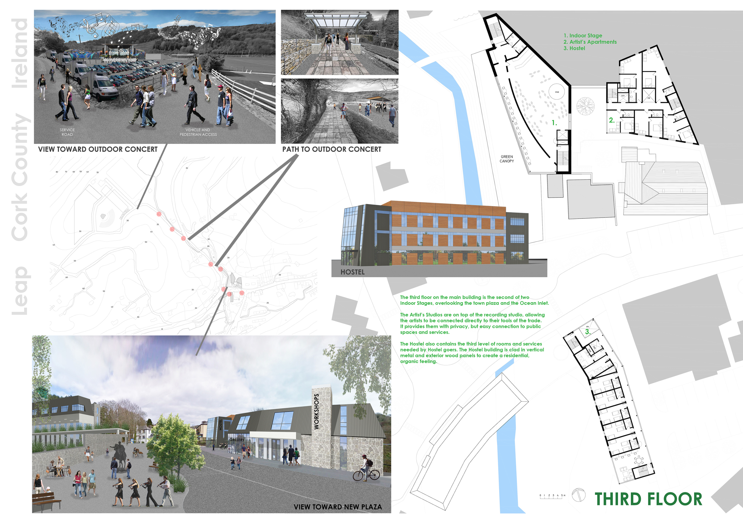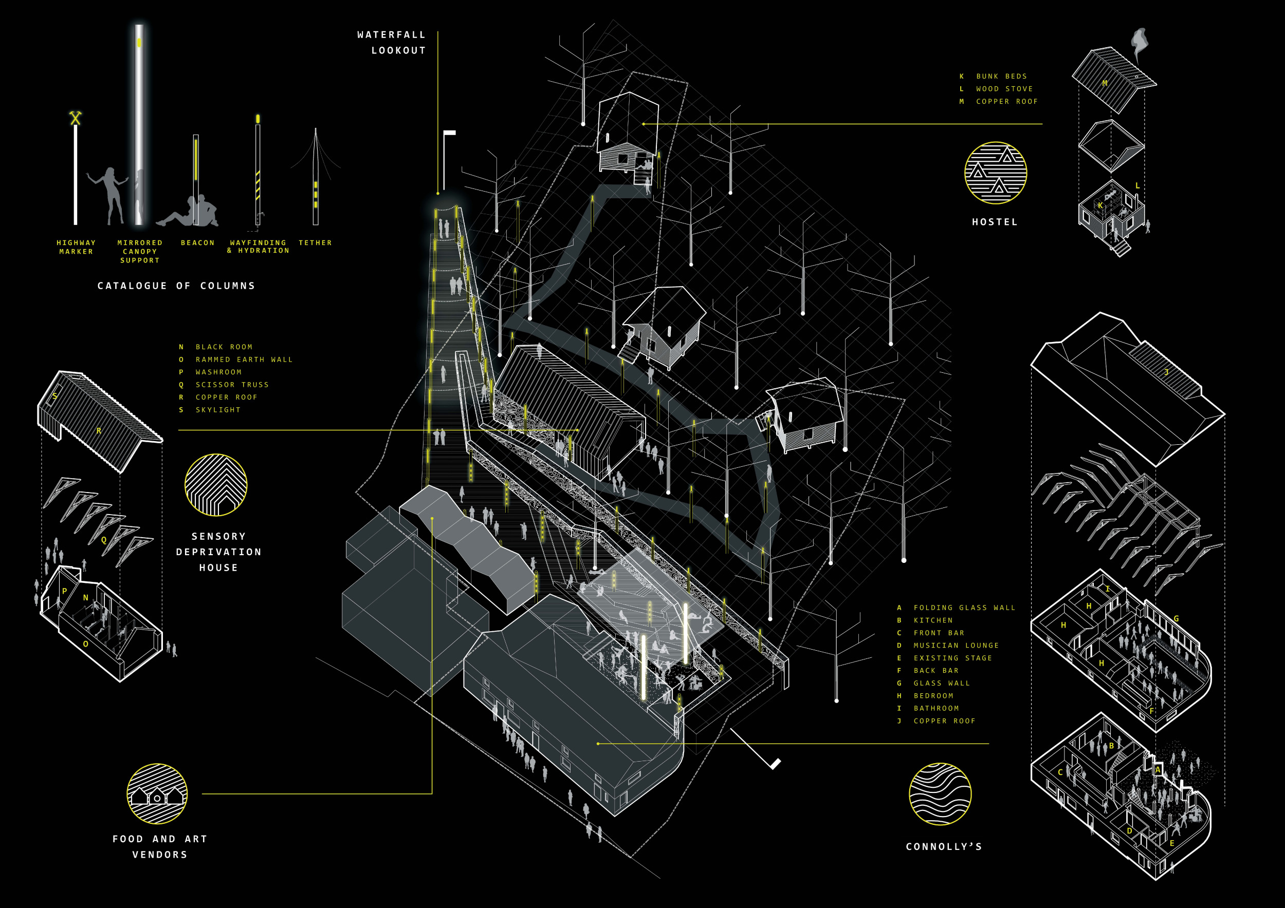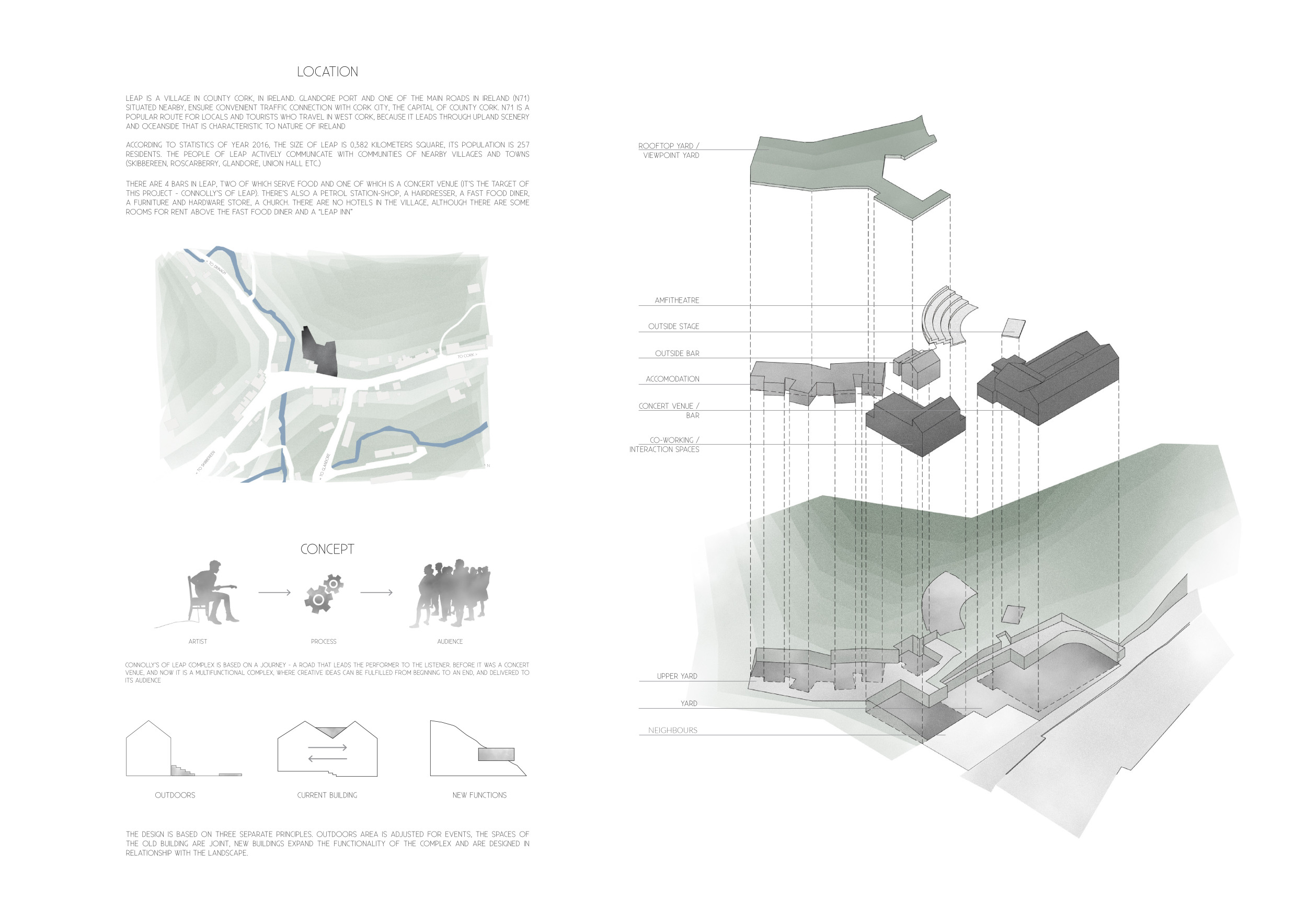 This competition tasked participants with envisioning a concept for a renovation and programmatic extension of the Connolly’s of Leap venue. The site, located on a steep hill next to the storied ravine and a waterfall, contains the existing music venue building and family quarters, as well as a collection of outbuildings today used for storage. Participants were challenged to re-think the site and its ability to offer a unique setting for musical performance in two ways: first the refurbishment of the existing venue with the possibility of altering it with design interventions; and second, an expansion within the site to include the following recommended programs: an external performance zone with a bar, a cafe or restaurant, external seating area, a recording lab, management offices, a creative workshop and studio spaces, exhibition spaces, a waterfall viewing deck, parking, guest quarters for visiting artists, and a sound engineering booth for stage. This list of programs was left open to interpretation and modification by each participant.