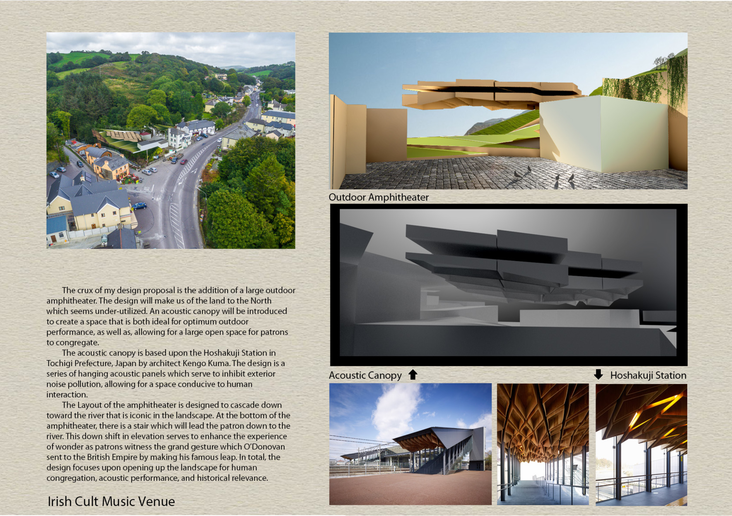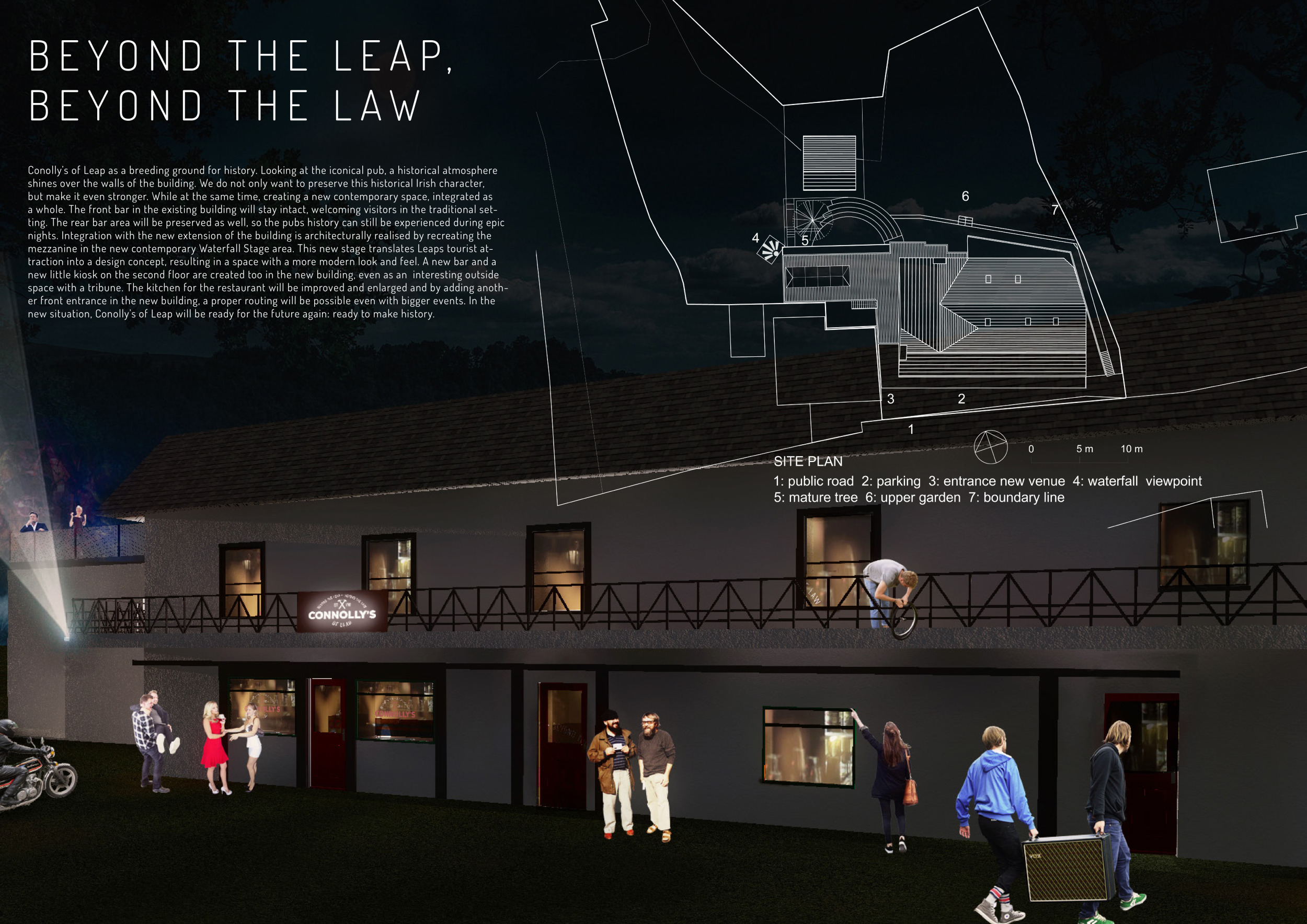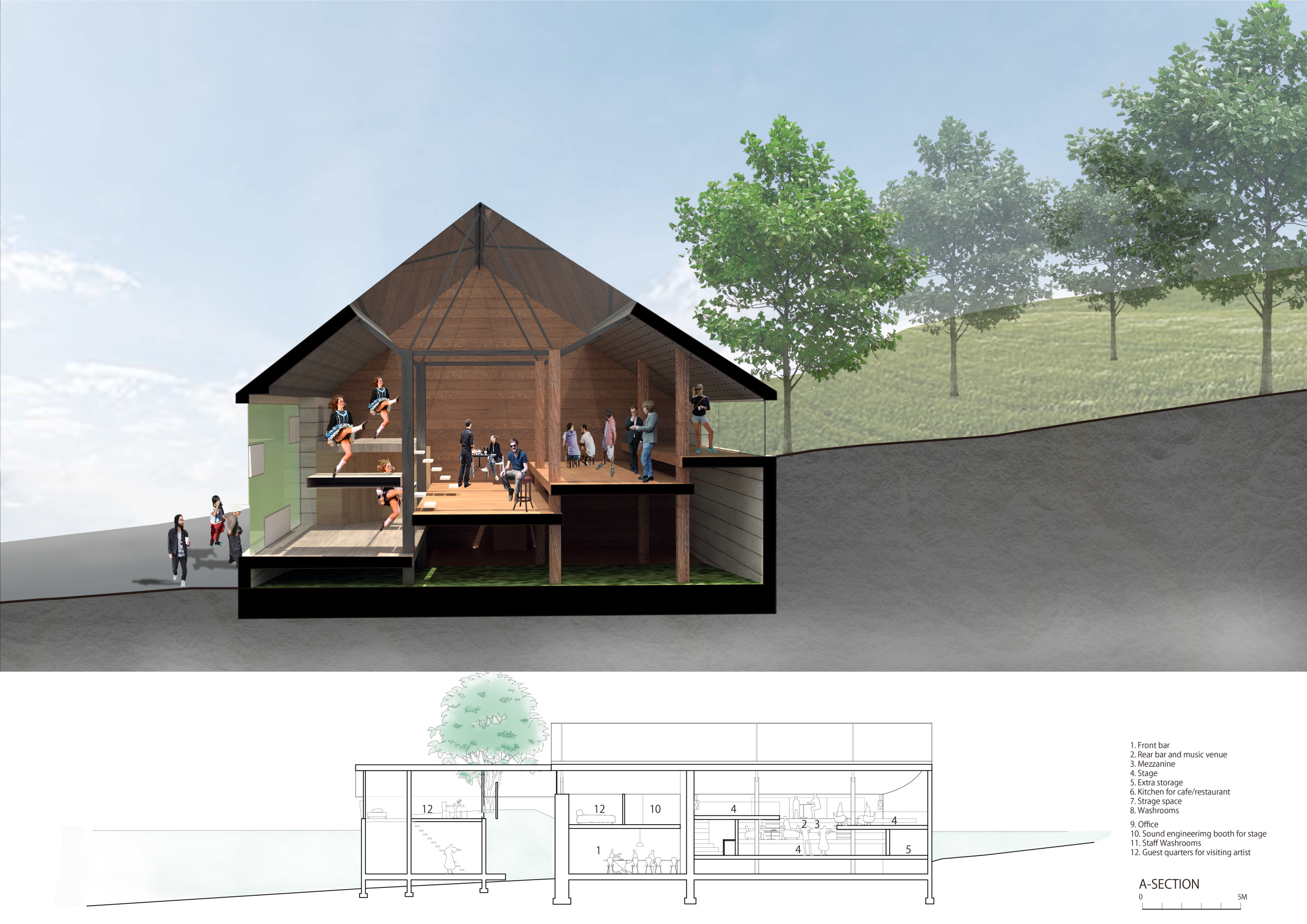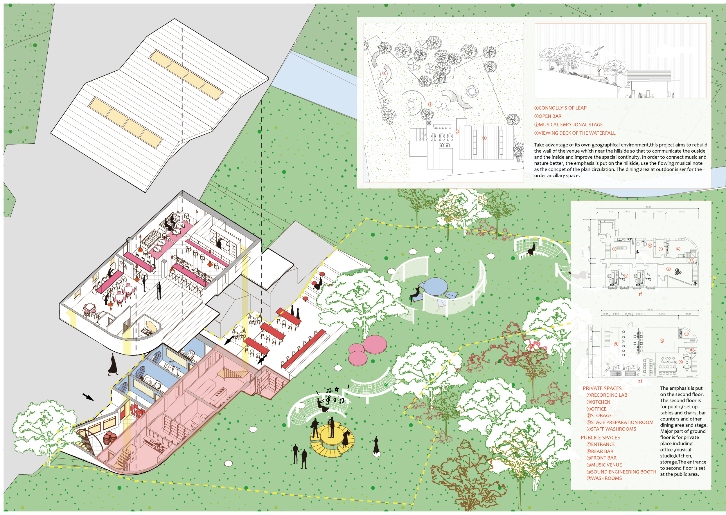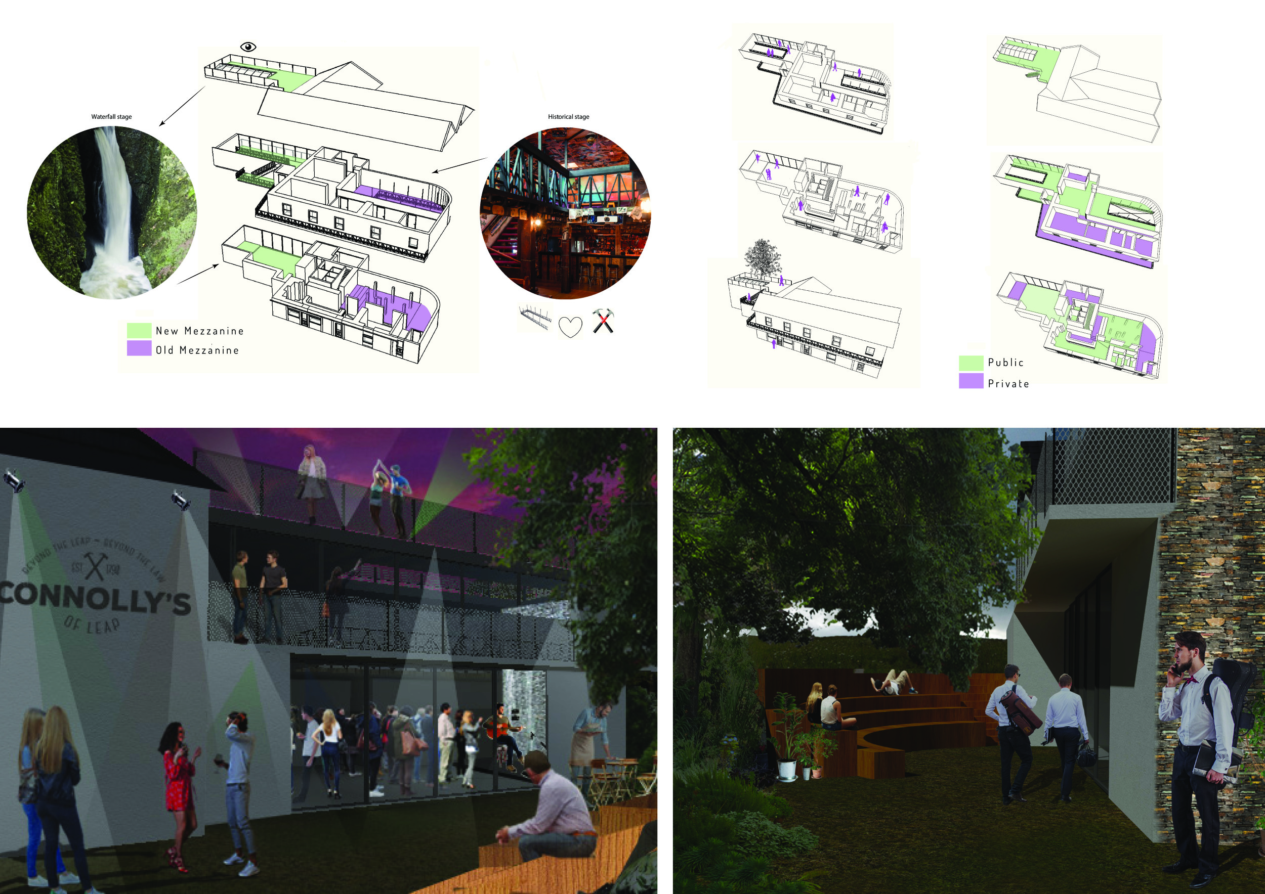 This competition tasked participants with envisioning a concept for a renovation and programmatic extension of the Connolly’s of Leap venue. The site, located on a steep hill next to the storied ravine and a waterfall, contains the existing music venue building and family quarters, as well as a collection of outbuildings today used for storage. Participants were challenged to re-think the site and its ability to offer a unique setting for musical performance in two ways: first the refurbishment of the existing venue with the possibility of altering it with design interventions; and second, an expansion within the site to include the following recommended programs: an external performance zone with a bar, a cafe or restaurant, external seating area, a recording lab, management offices, a creative workshop and studio spaces, exhibition spaces, a waterfall viewing deck, parking, guest quarters for visiting artists, and a sound engineering booth for stage. This list of programs was left open to interpretation and modification by each participant.