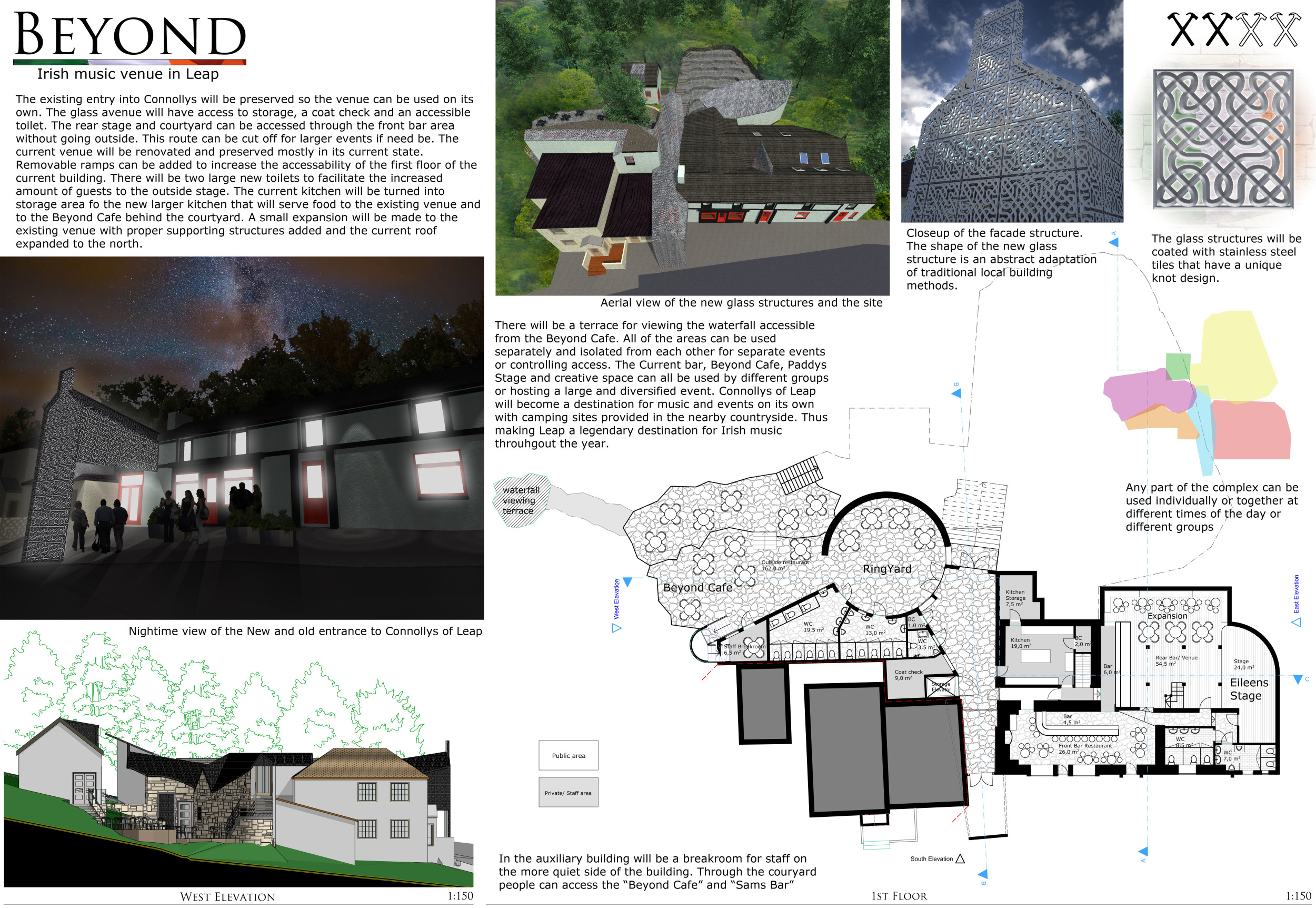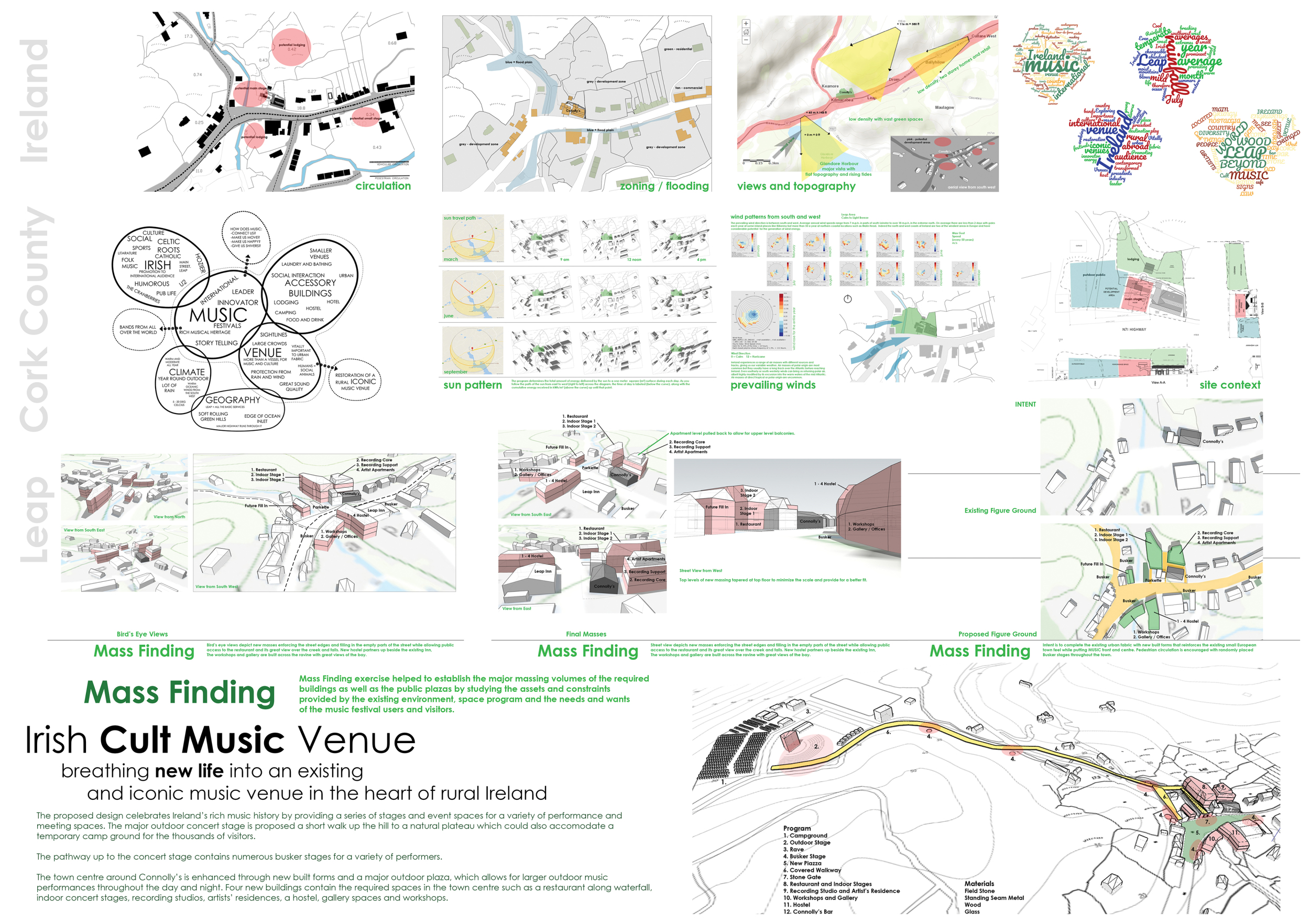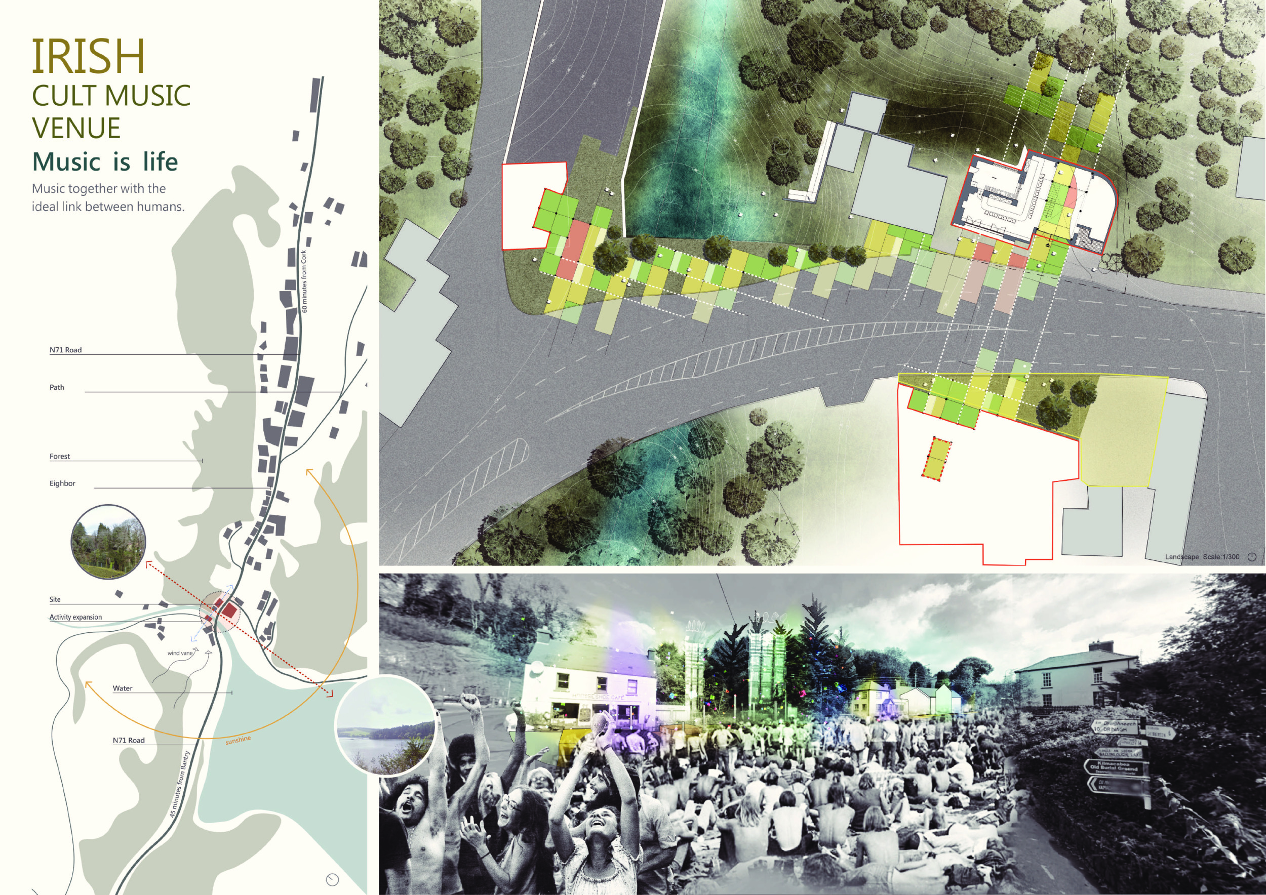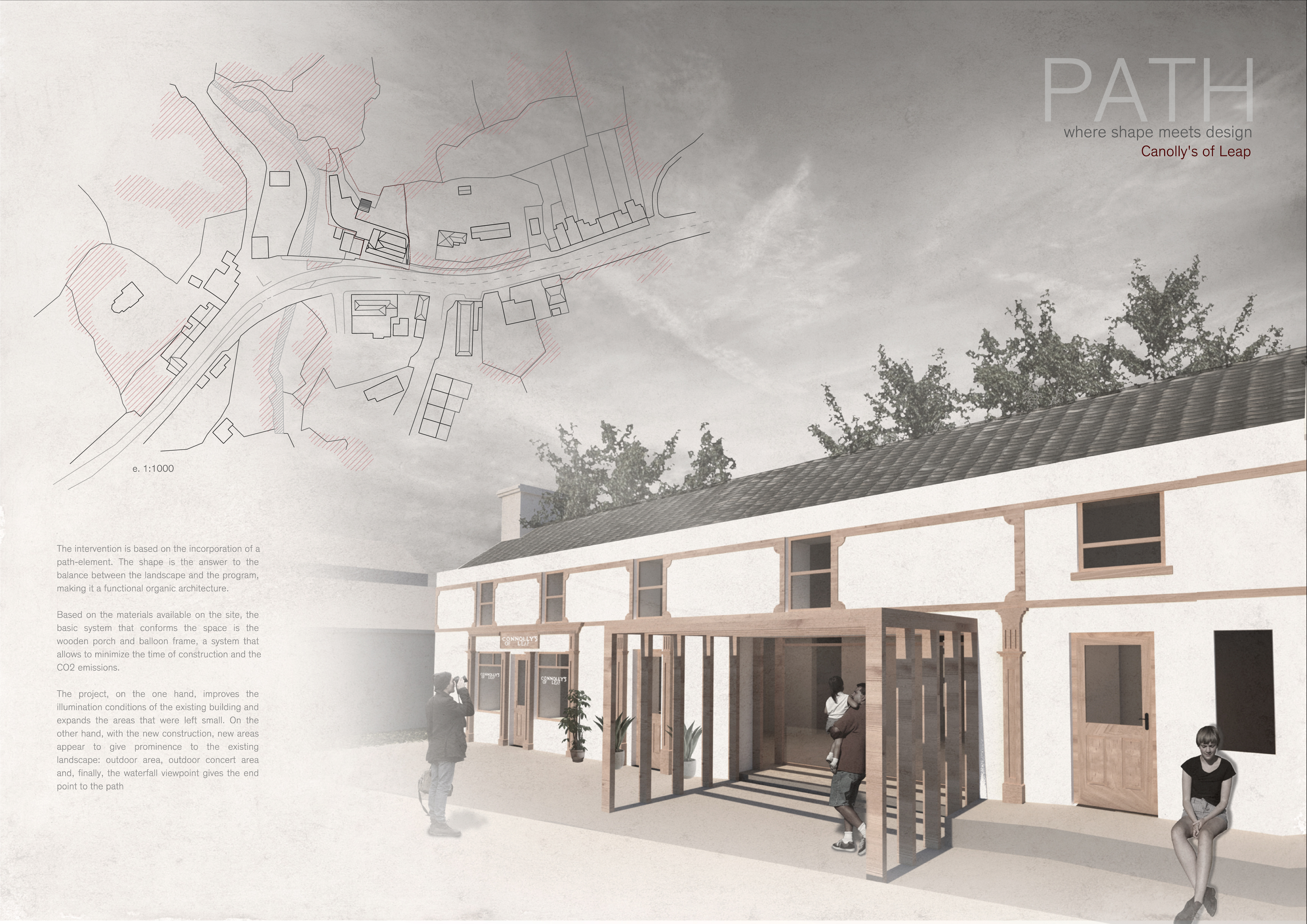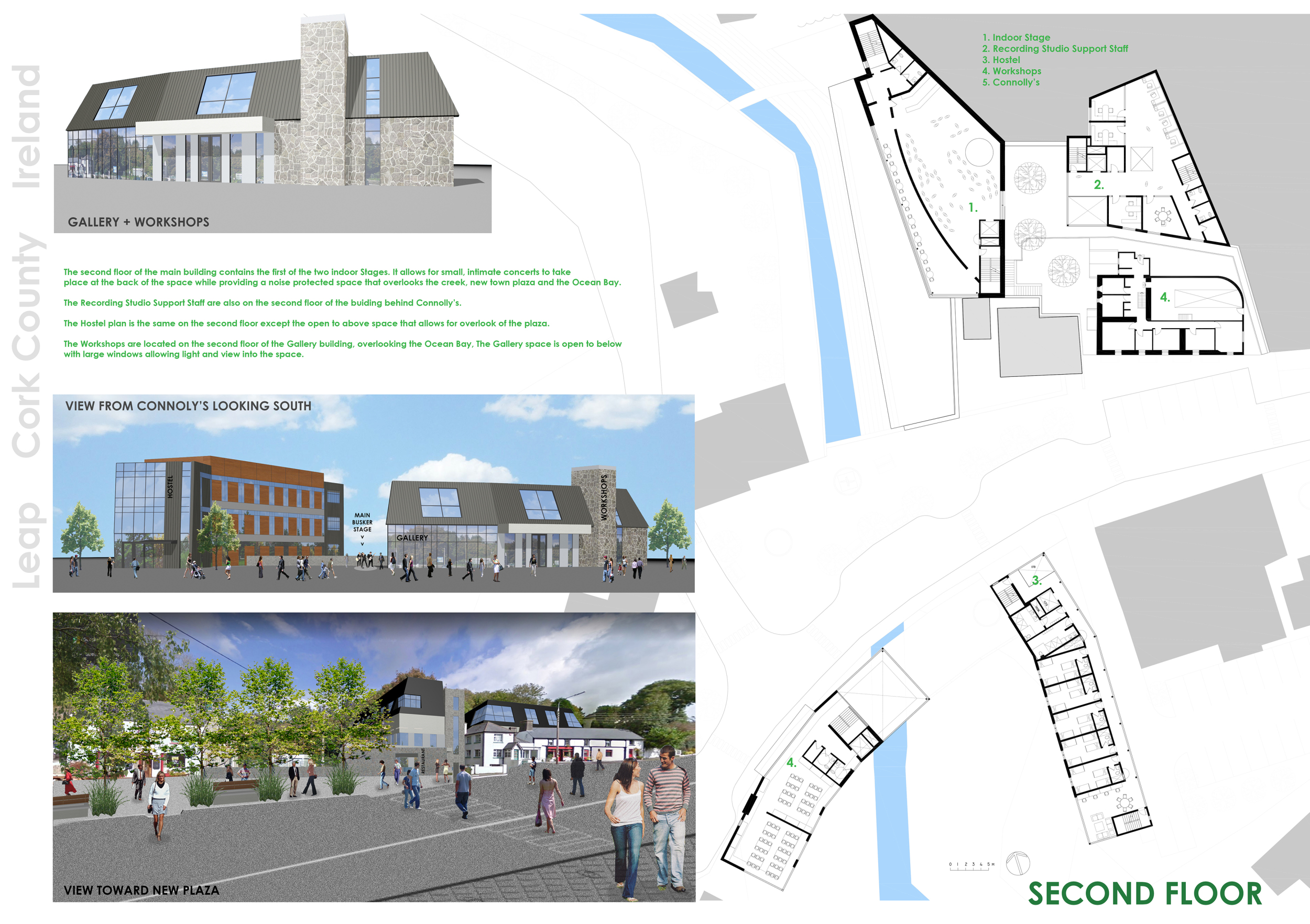 This competition tasked participants with envisioning a concept for a renovation and programmatic extension of the Connolly’s of Leap venue. The site, located on a steep hill next to the storied ravine and a waterfall, contains the existing music venue building and family quarters, as well as a collection of outbuildings today used for storage. Participants were challenged to re-think the site and its ability to offer a unique setting for musical performance in two ways: first the refurbishment of the existing venue with the possibility of altering it with design interventions; and second, an expansion within the site to include the following recommended programs: an external performance zone with a bar, a cafe or restaurant, external seating area, a recording lab, management offices, a creative workshop and studio spaces, exhibition spaces, a waterfall viewing deck, parking, guest quarters for visiting artists, and a sound engineering booth for stage. This list of programs was left open to interpretation and modification by each participant.