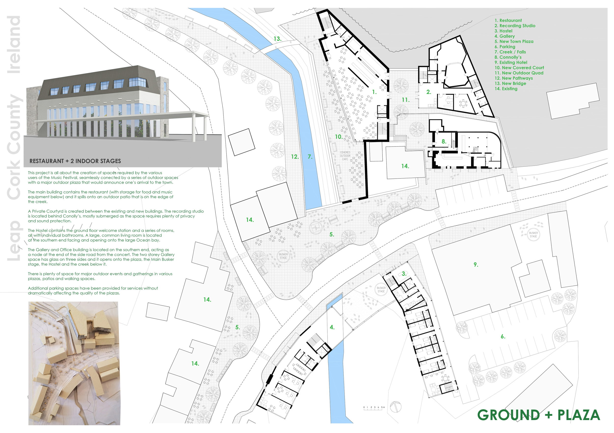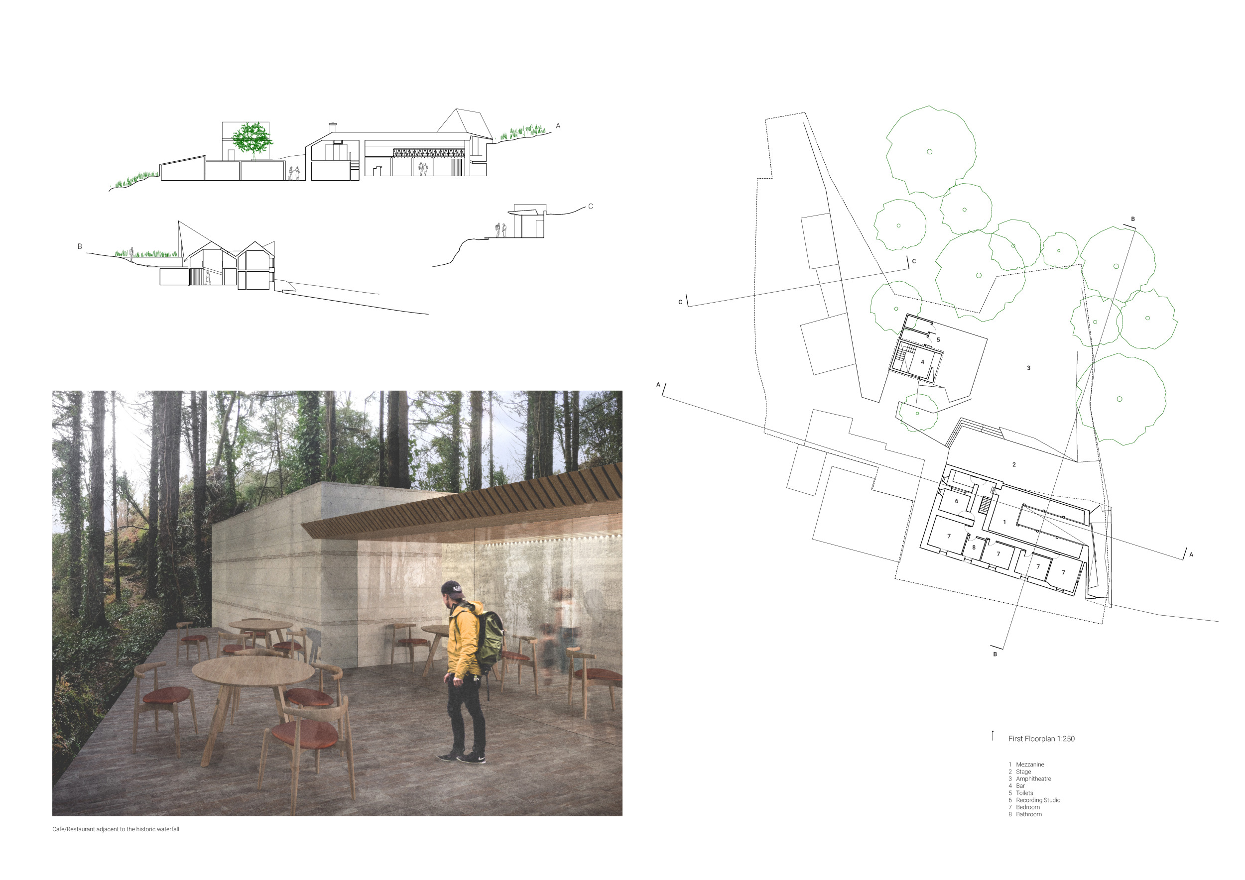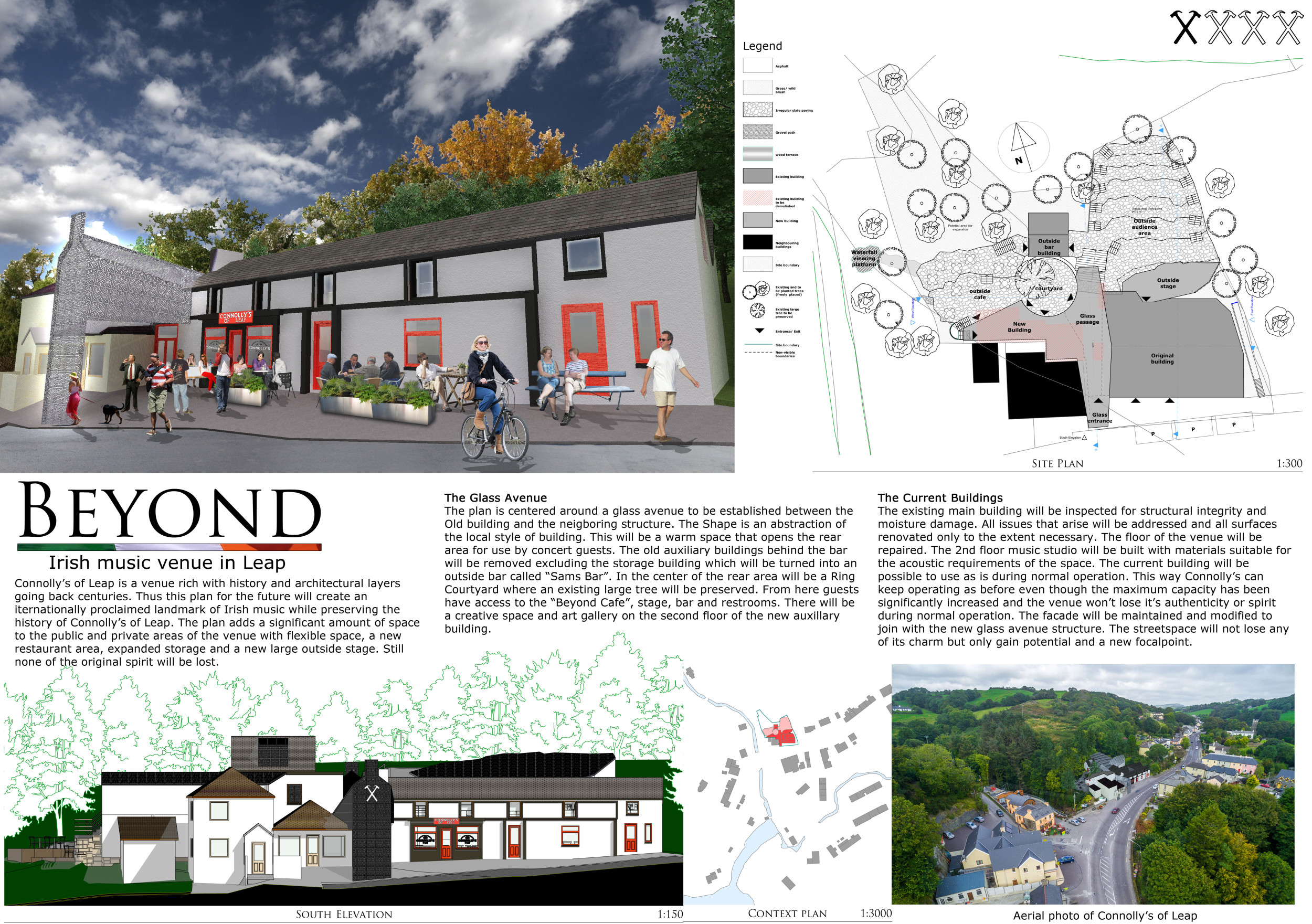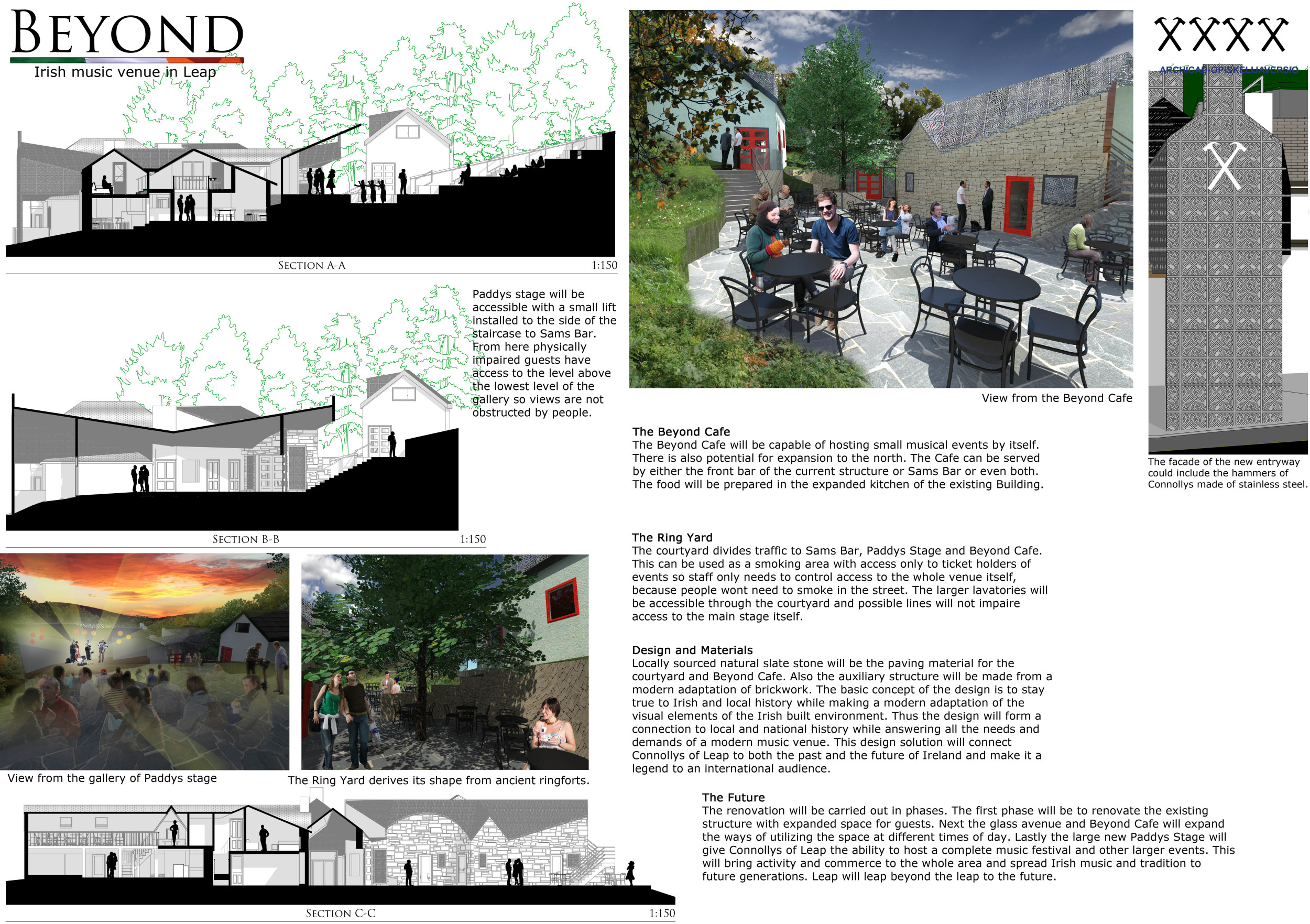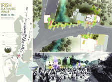 This competition tasked participants with envisioning a concept for a renovation and programmatic extension of the Connolly’s of Leap venue. The site, located on a steep hill next to the storied ravine and a waterfall, contains the existing music venue building and family quarters, as well as a collection of outbuildings today used for storage. Participants were challenged to re-think the site and its ability to offer a unique setting for musical performance in two ways: first the refurbishment of the existing venue with the possibility of altering it with design interventions; and second, an expansion within the site to include the following recommended programs: an external performance zone with a bar, a cafe or restaurant, external seating area, a recording lab, management offices, a creative workshop and studio spaces, exhibition spaces, a waterfall viewing deck, parking, guest quarters for visiting artists, and a sound engineering booth for stage. This list of programs was left open to interpretation and modification by each participant.