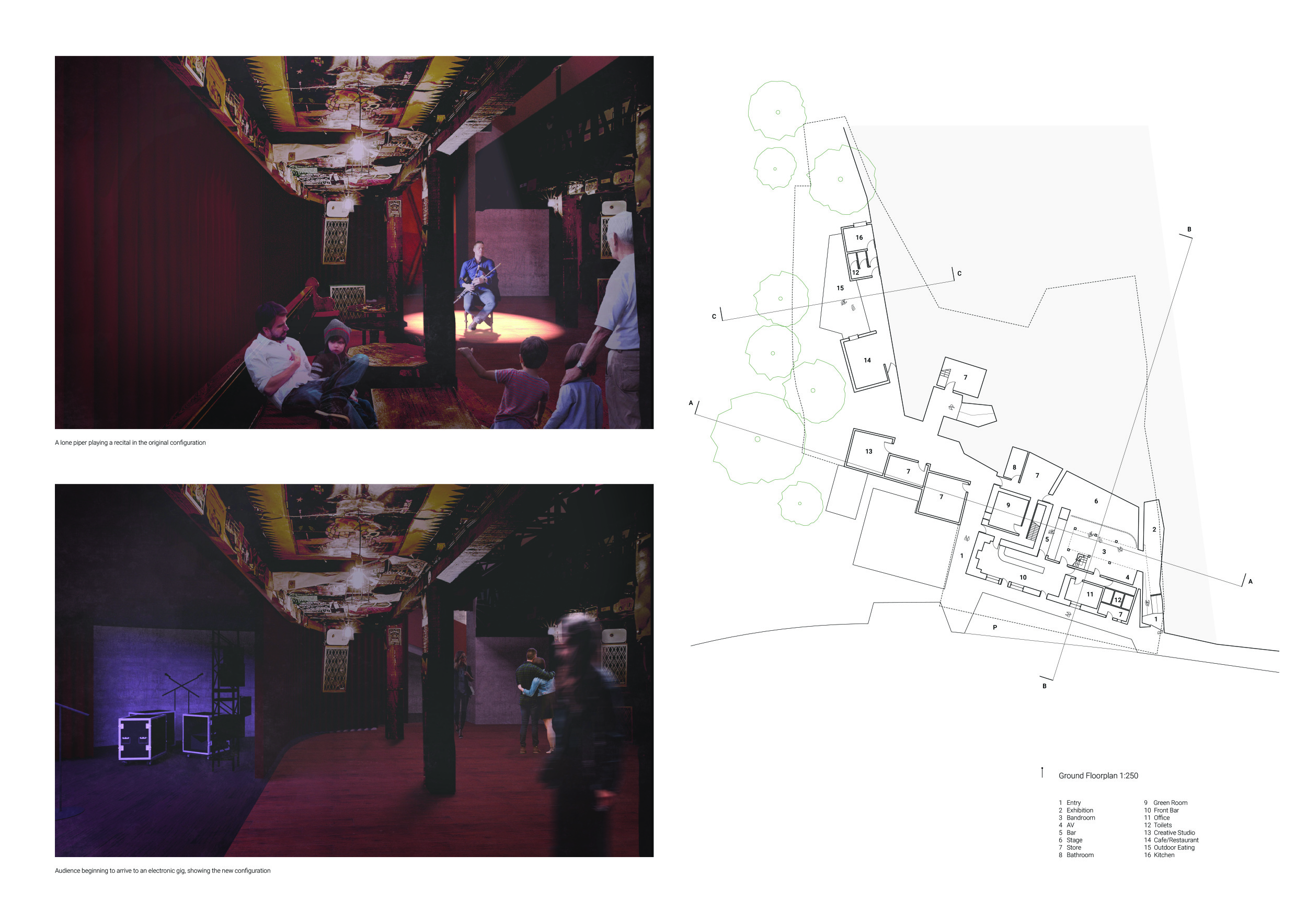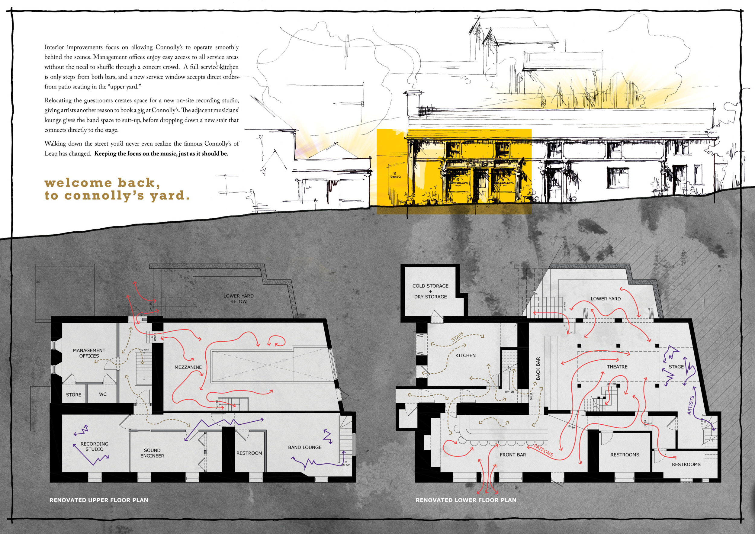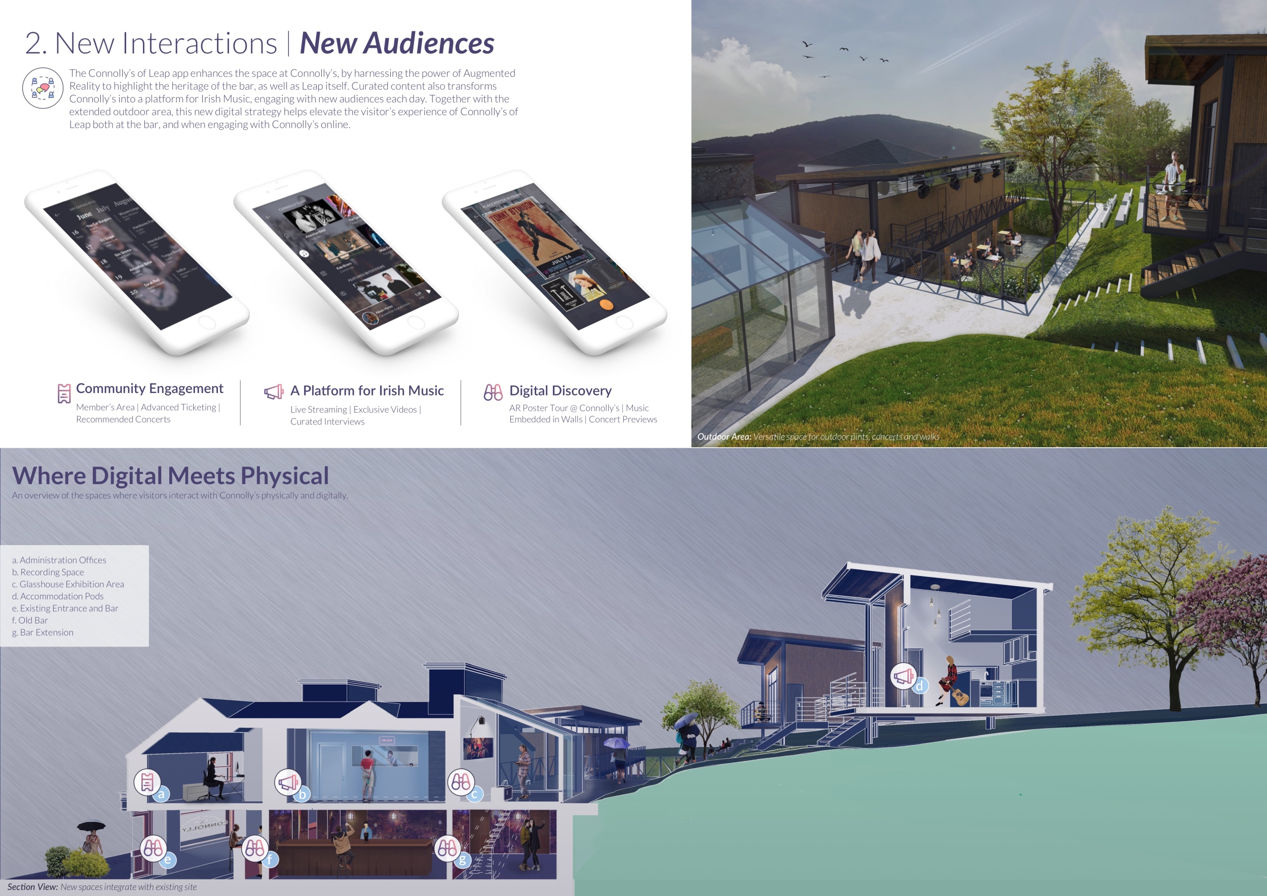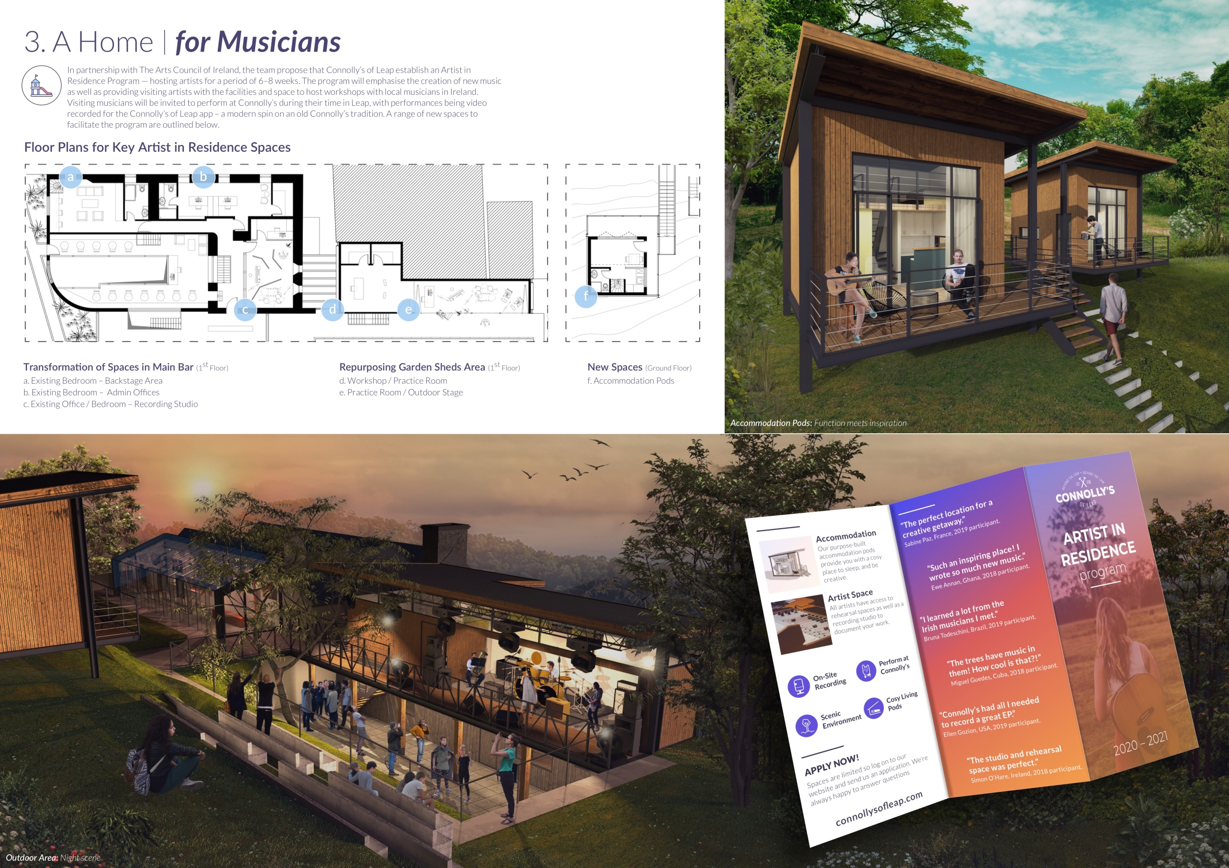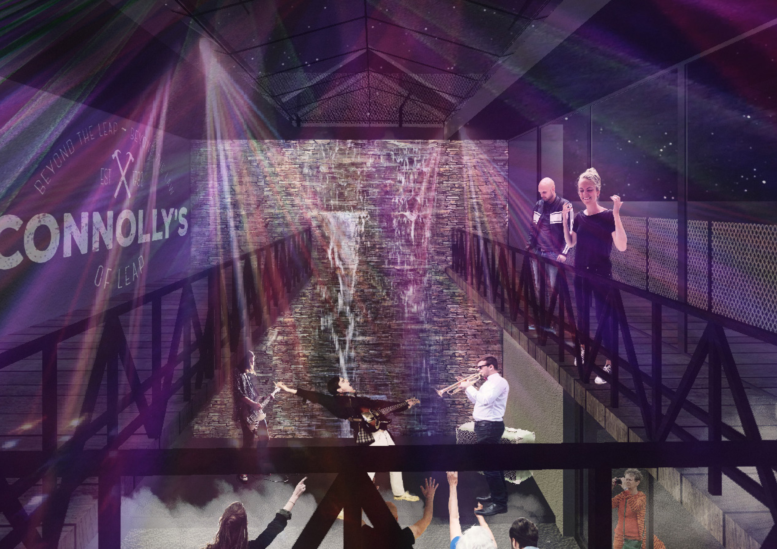 This competition tasked participants with envisioning a concept for a renovation and programmatic extension of the Connolly’s of Leap venue. The site, located on a steep hill next to the storied ravine and a waterfall, contains the existing music venue building and family quarters, as well as a collection of outbuildings today used for storage. Participants were challenged to re-think the site and its ability to offer a unique setting for musical performance in two ways: first the refurbishment of the existing venue with the possibility of altering it with design interventions; and second, an expansion within the site to include the following recommended programs: an external performance zone with a bar, a cafe or restaurant, external seating area, a recording lab, management offices, a creative workshop and studio spaces, exhibition spaces, a waterfall viewing deck, parking, guest quarters for visiting artists, and a sound engineering booth for stage. This list of programs was left open to interpretation and modification by each participant.