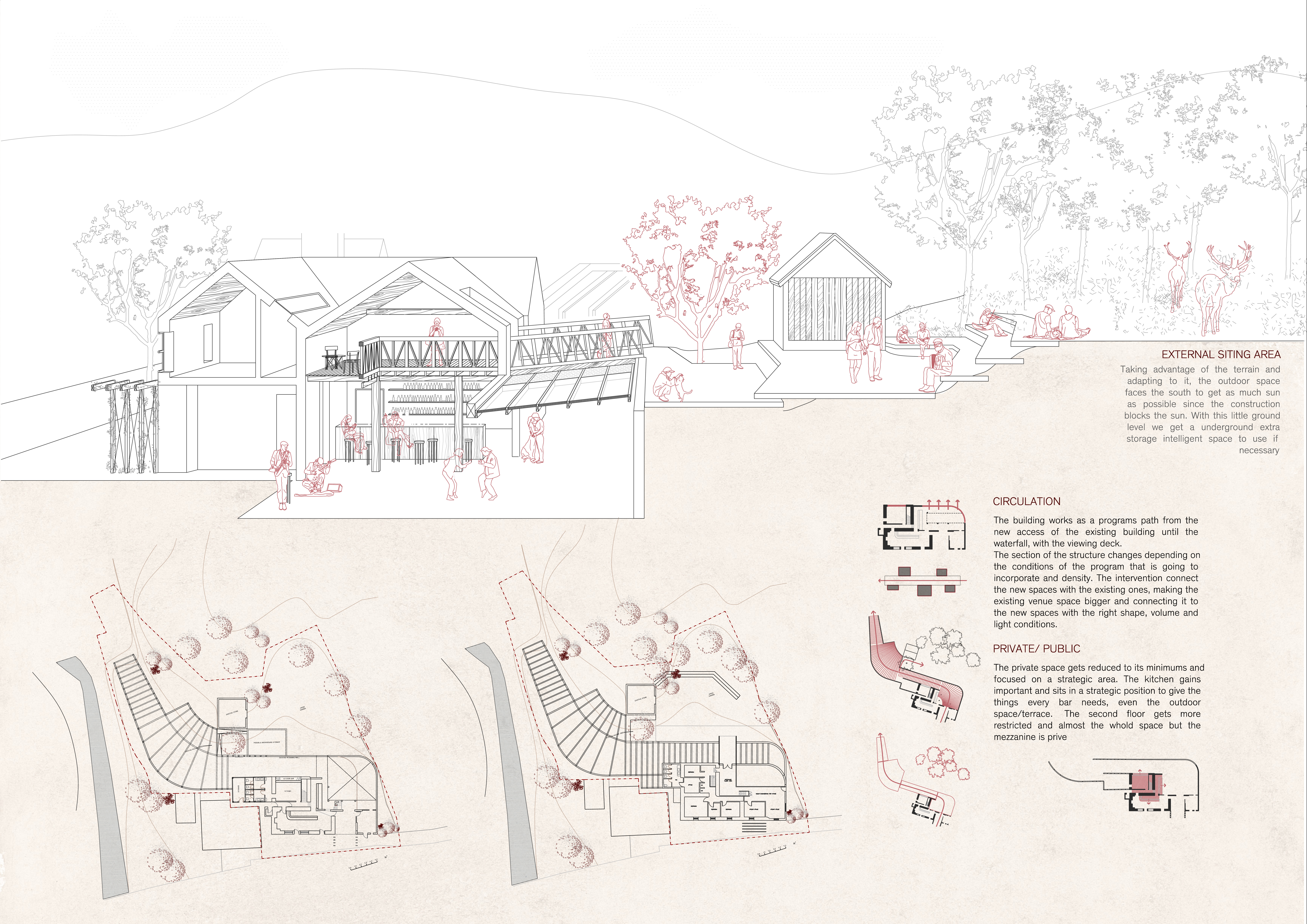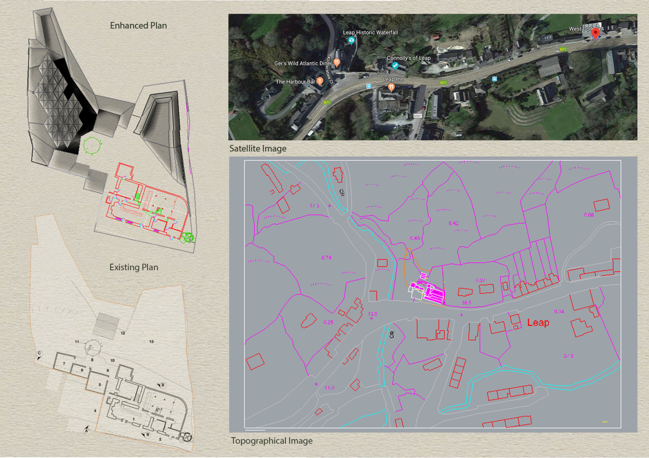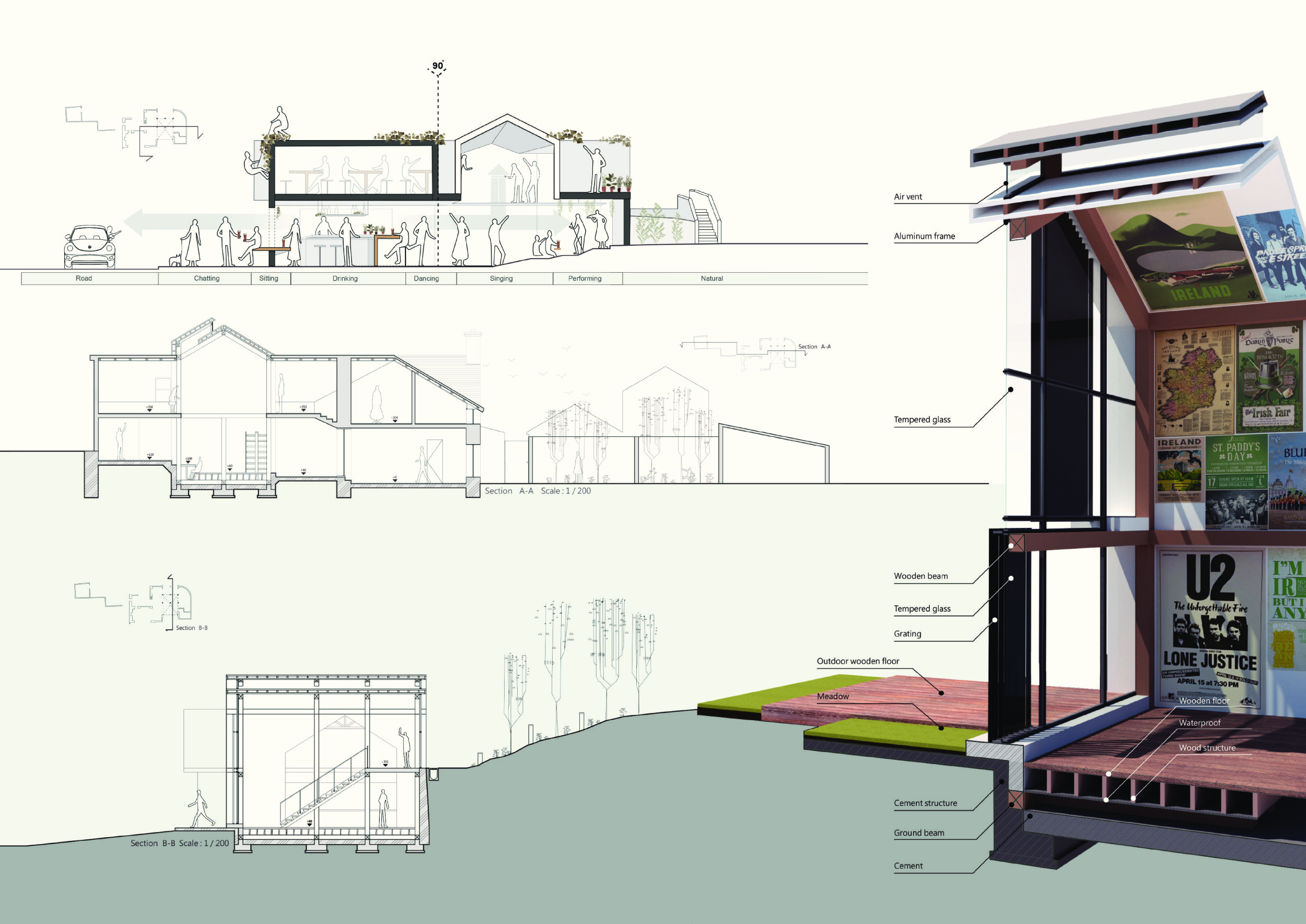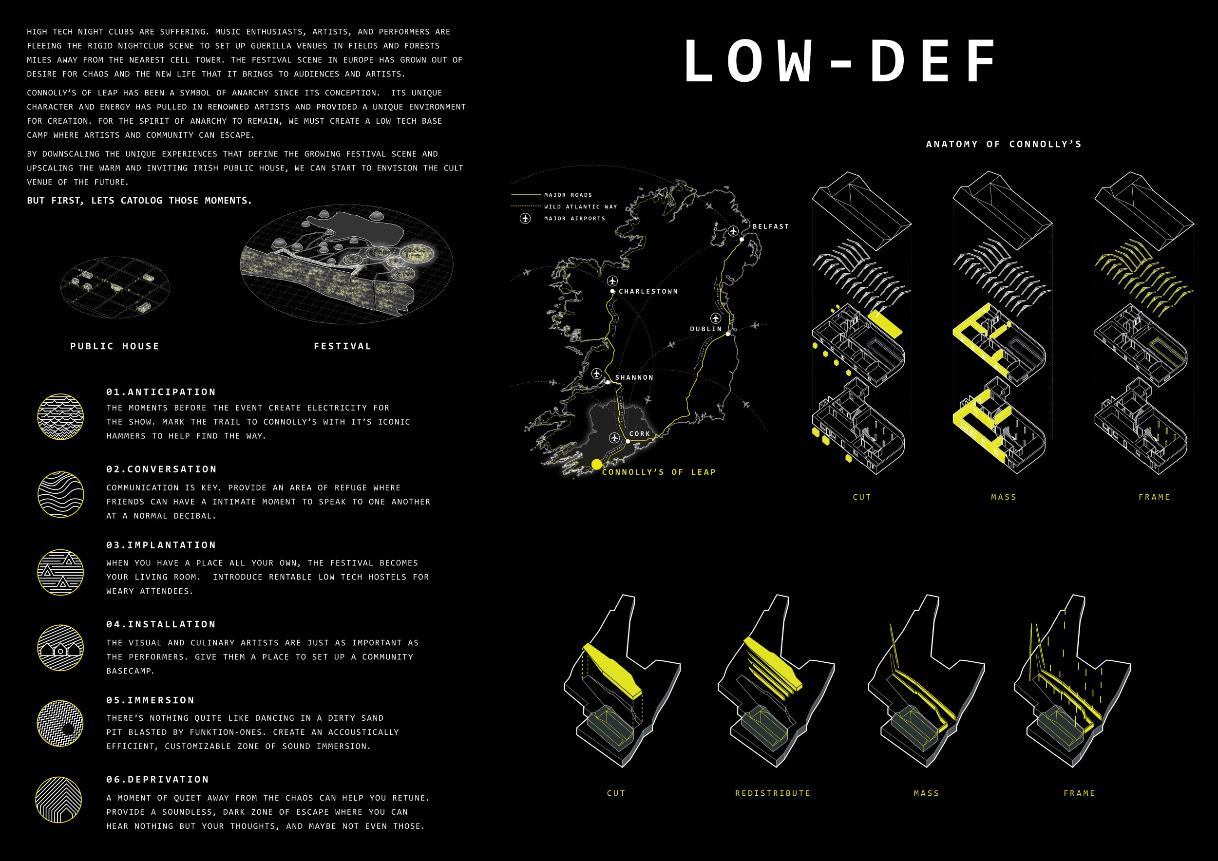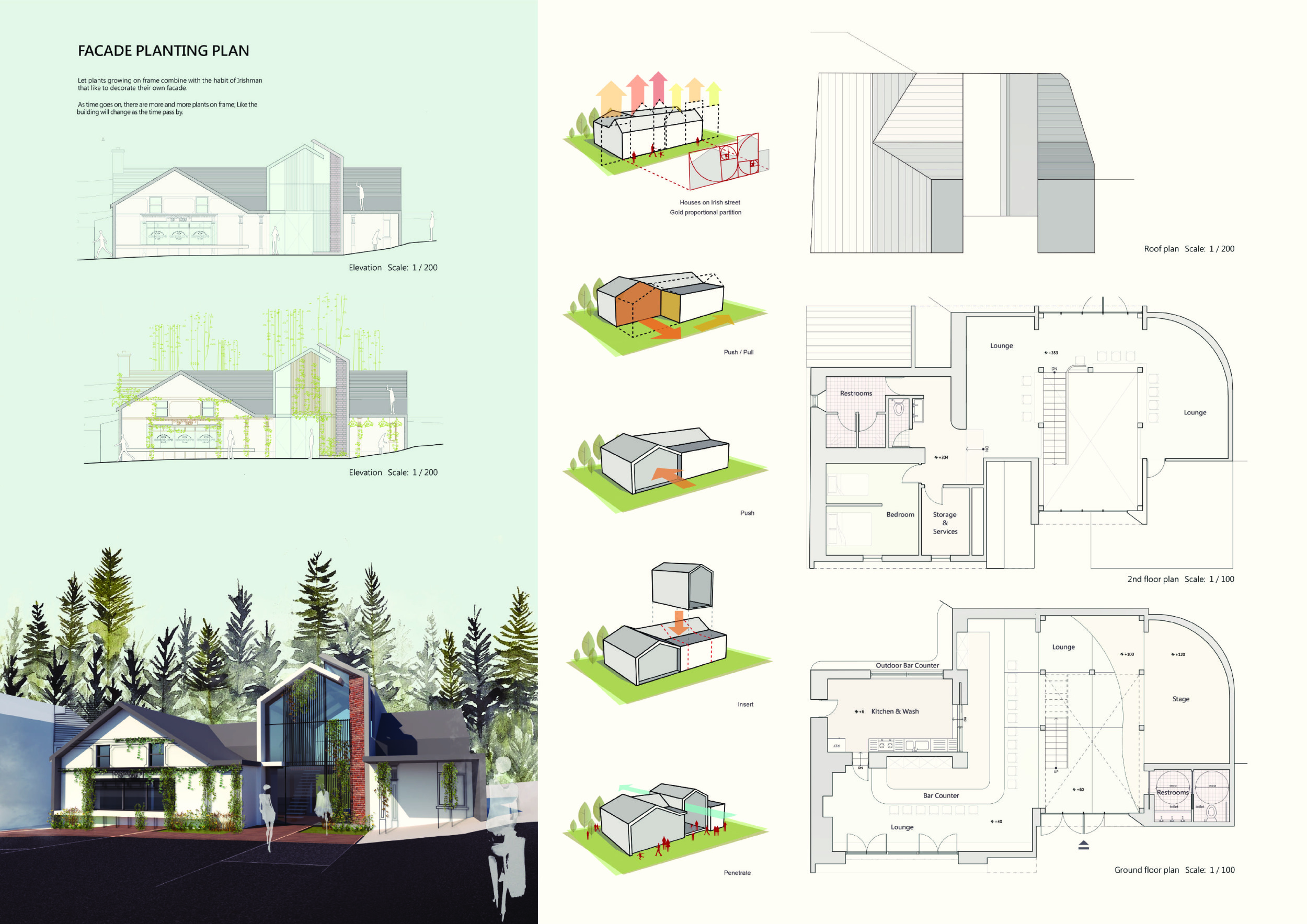 This competition tasked participants with envisioning a concept for a renovation and programmatic extension of the Connolly’s of Leap venue. The site, located on a steep hill next to the storied ravine and a waterfall, contains the existing music venue building and family quarters, as well as a collection of outbuildings today used for storage. Participants were challenged to re-think the site and its ability to offer a unique setting for musical performance in two ways: first the refurbishment of the existing venue with the possibility of altering it with design interventions; and second, an expansion within the site to include the following recommended programs: an external performance zone with a bar, a cafe or restaurant, external seating area, a recording lab, management offices, a creative workshop and studio spaces, exhibition spaces, a waterfall viewing deck, parking, guest quarters for visiting artists, and a sound engineering booth for stage. This list of programs was left open to interpretation and modification by each participant.