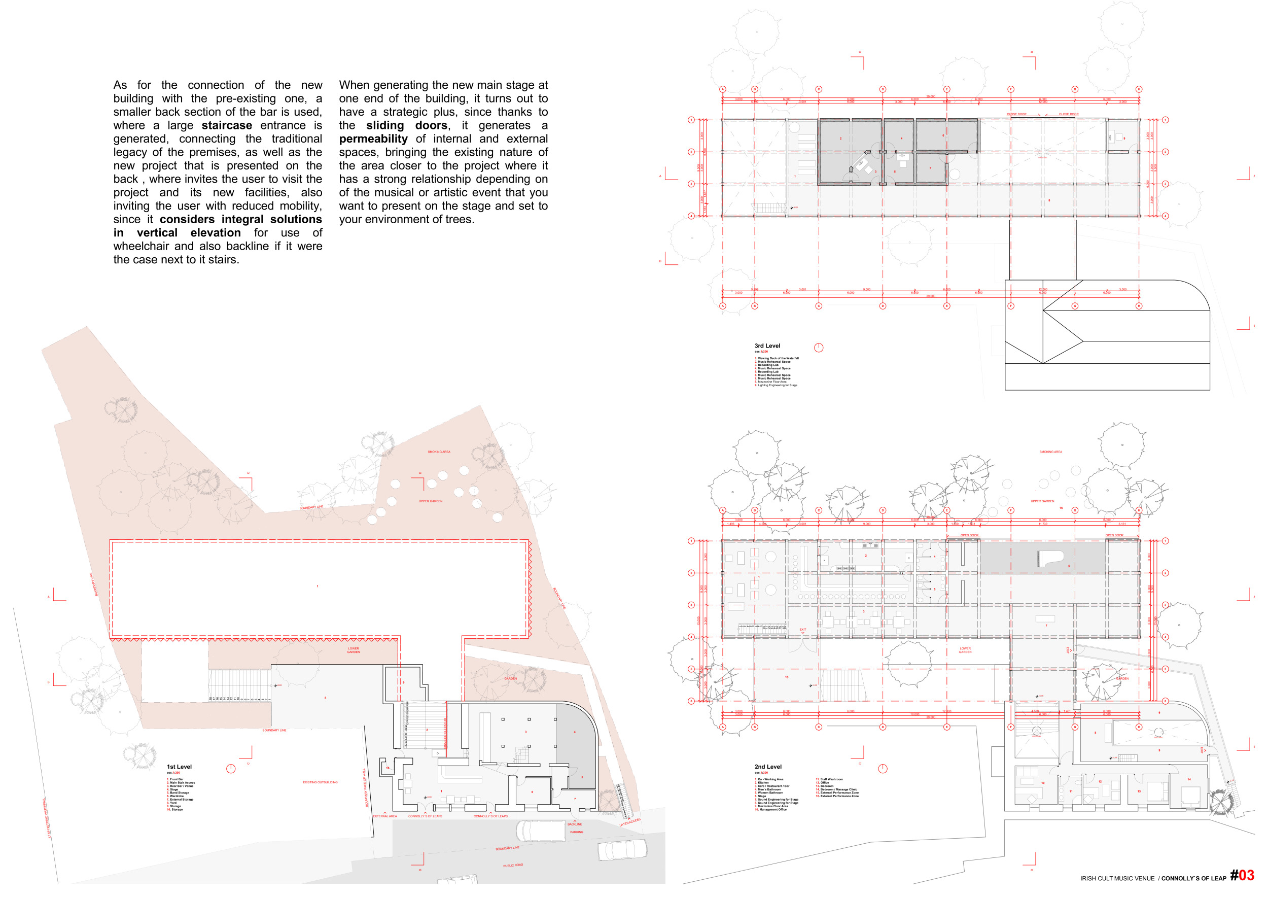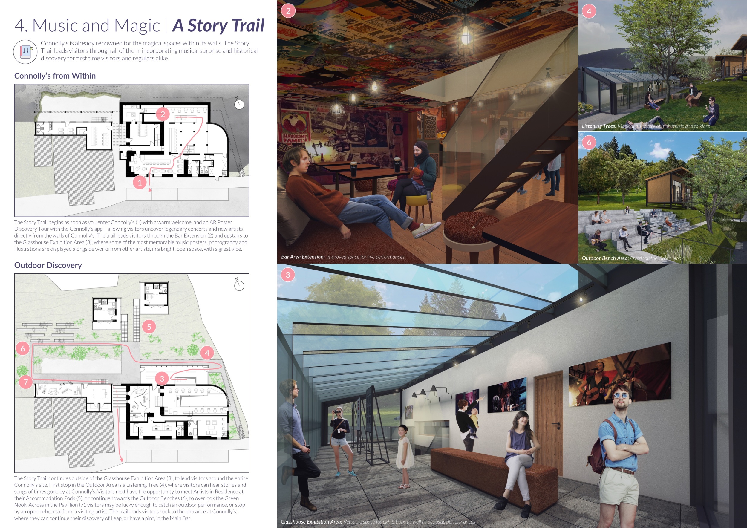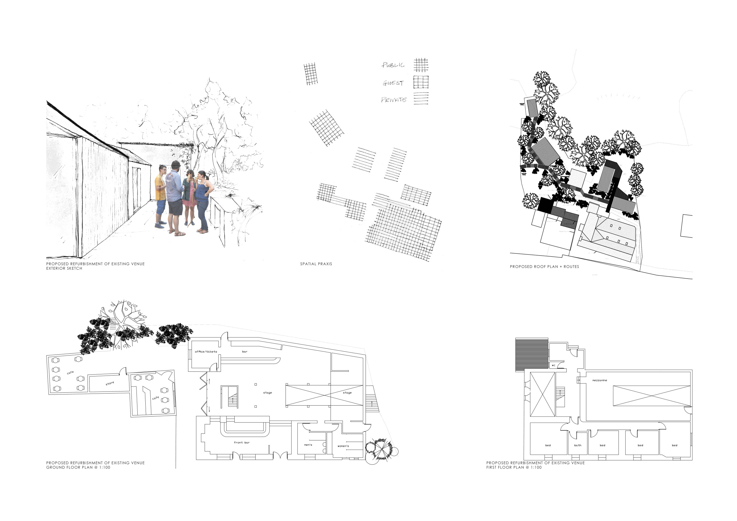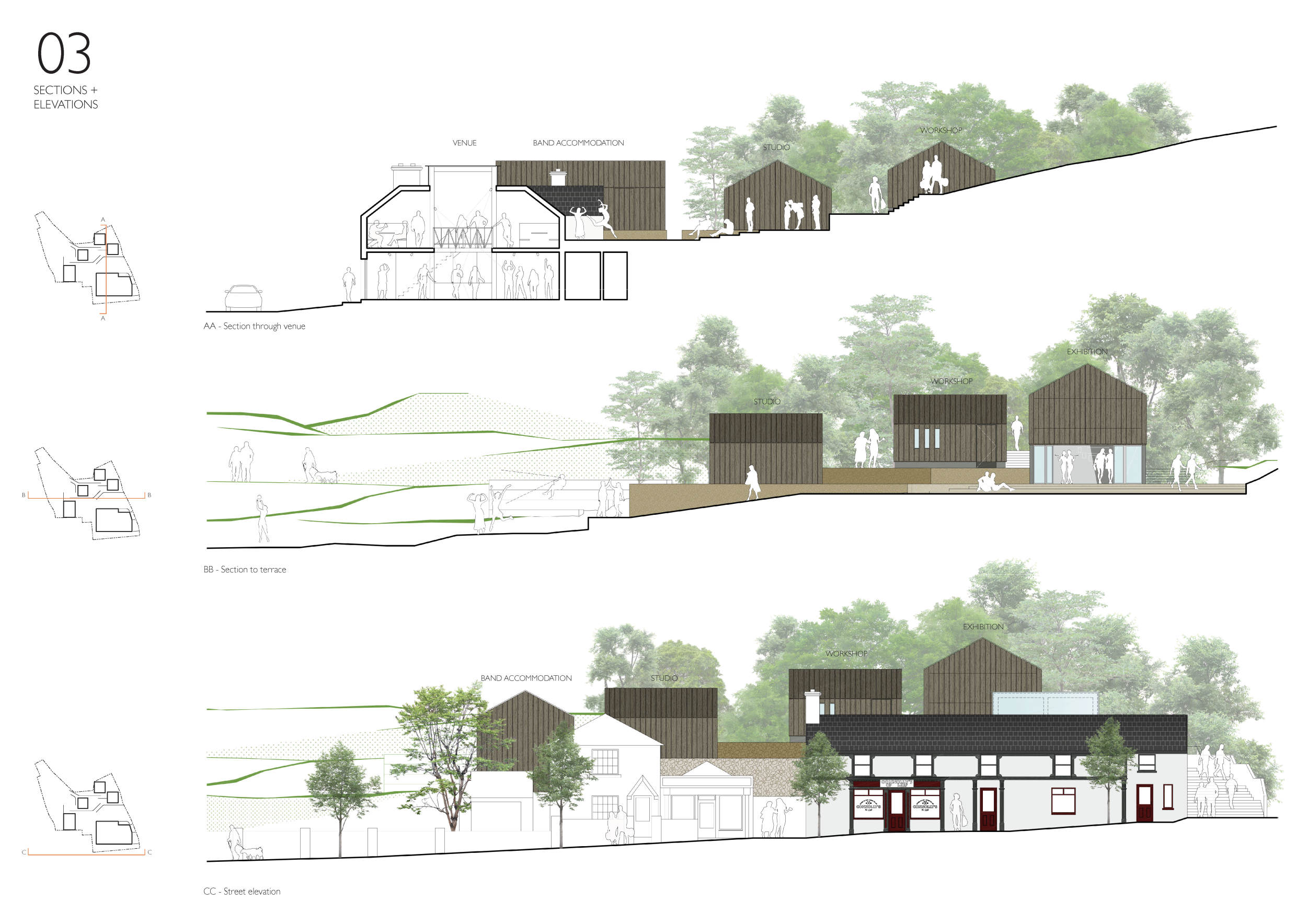 This competition tasked participants with envisioning a concept for a renovation and programmatic extension of the Connolly’s of Leap venue. The site, located on a steep hill next to the storied ravine and a waterfall, contains the existing music venue building and family quarters, as well as a collection of outbuildings today used for storage. Participants were challenged to re-think the site and its ability to offer a unique setting for musical performance in two ways: first the refurbishment of the existing venue with the possibility of altering it with design interventions; and second, an expansion within the site to include the following recommended programs: an external performance zone with a bar, a cafe or restaurant, external seating area, a recording lab, management offices, a creative workshop and studio spaces, exhibition spaces, a waterfall viewing deck, parking, guest quarters for visiting artists, and a sound engineering booth for stage. This list of programs was left open to interpretation and modification by each participant.