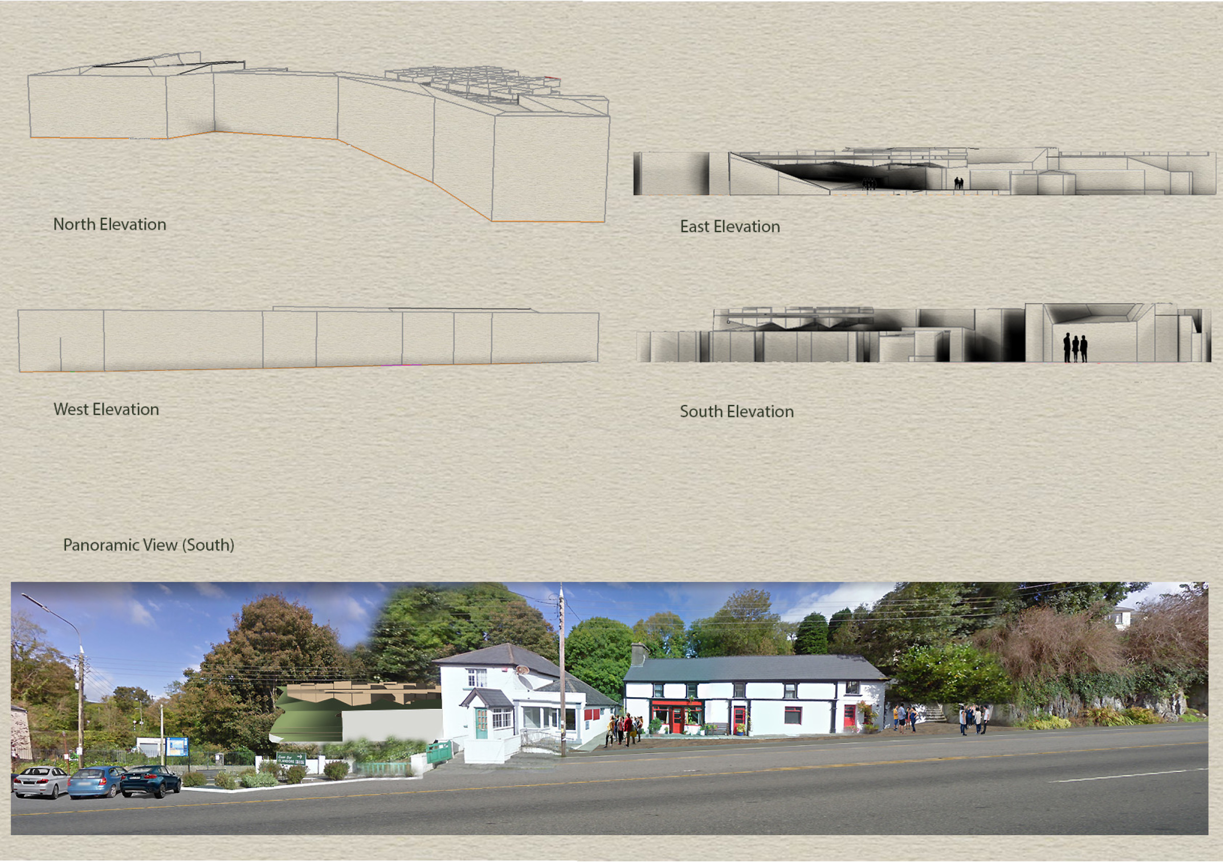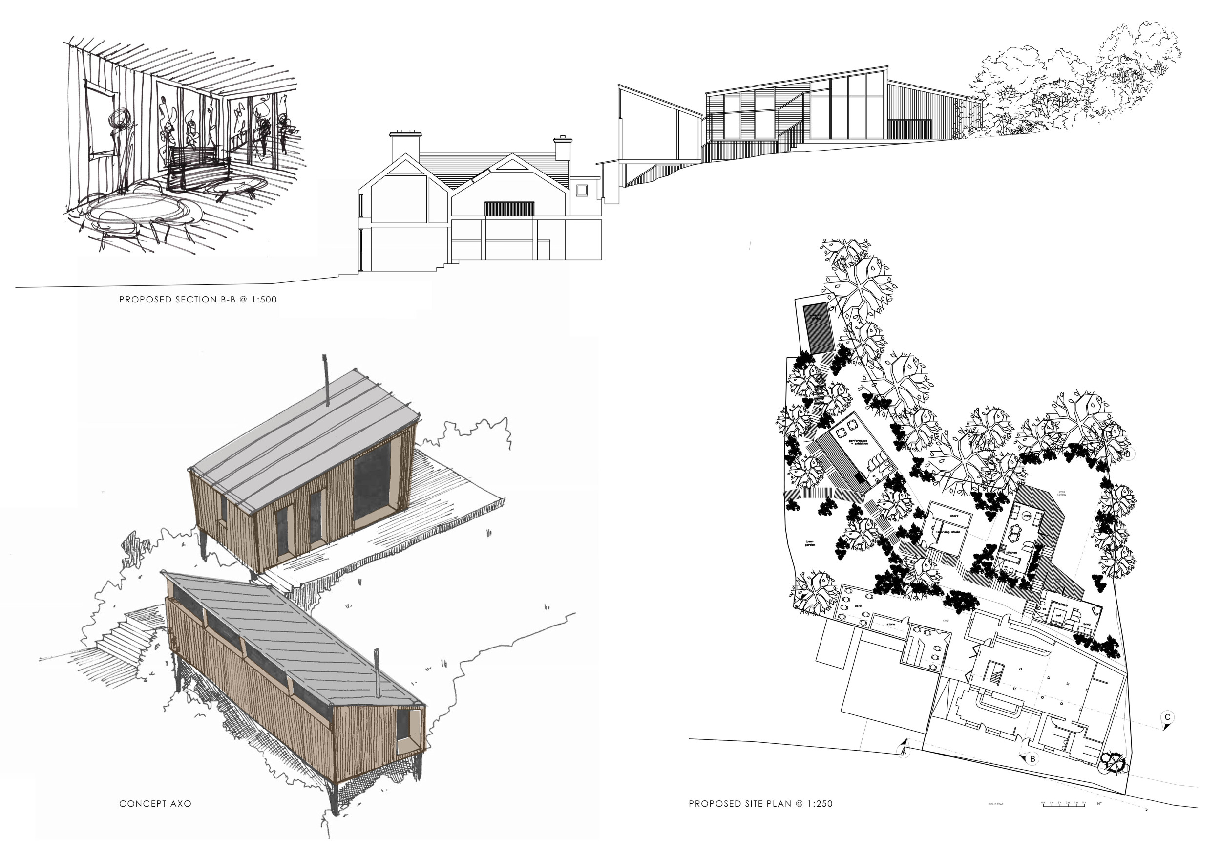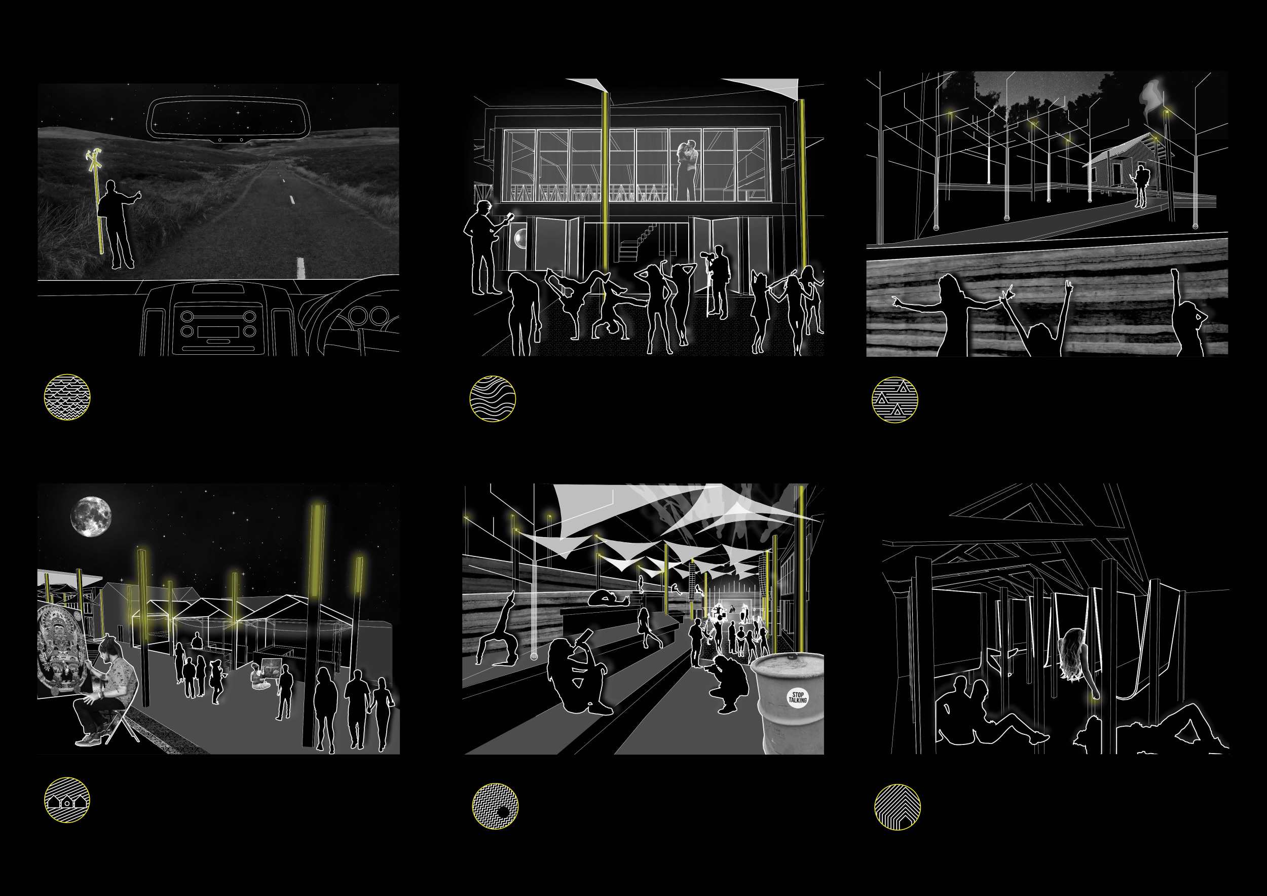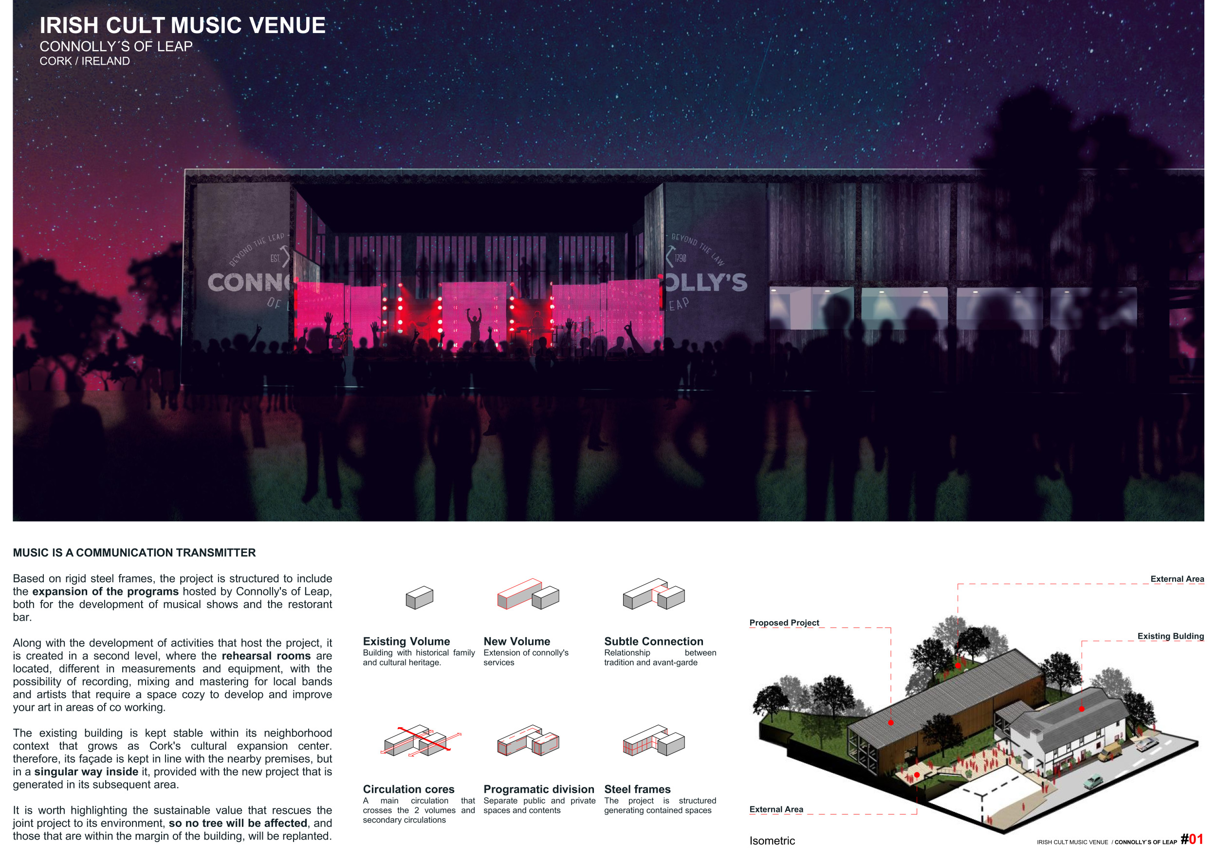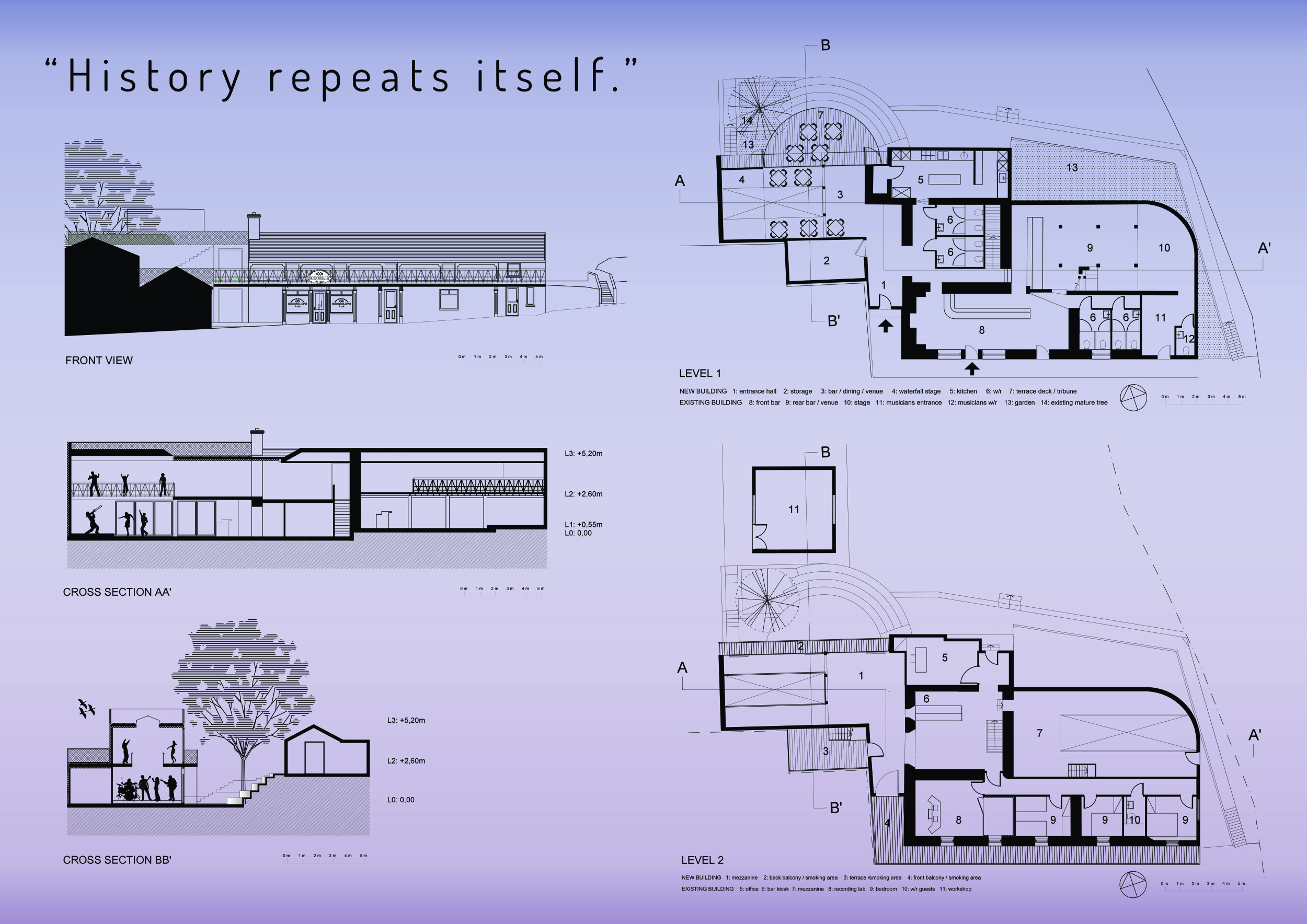 This competition tasked participants with envisioning a concept for a renovation and programmatic extension of the Connolly’s of Leap venue. The site, located on a steep hill next to the storied ravine and a waterfall, contains the existing music venue building and family quarters, as well as a collection of outbuildings today used for storage. Participants were challenged to re-think the site and its ability to offer a unique setting for musical performance in two ways: first the refurbishment of the existing venue with the possibility of altering it with design interventions; and second, an expansion within the site to include the following recommended programs: an external performance zone with a bar, a cafe or restaurant, external seating area, a recording lab, management offices, a creative workshop and studio spaces, exhibition spaces, a waterfall viewing deck, parking, guest quarters for visiting artists, and a sound engineering booth for stage. This list of programs was left open to interpretation and modification by each participant.