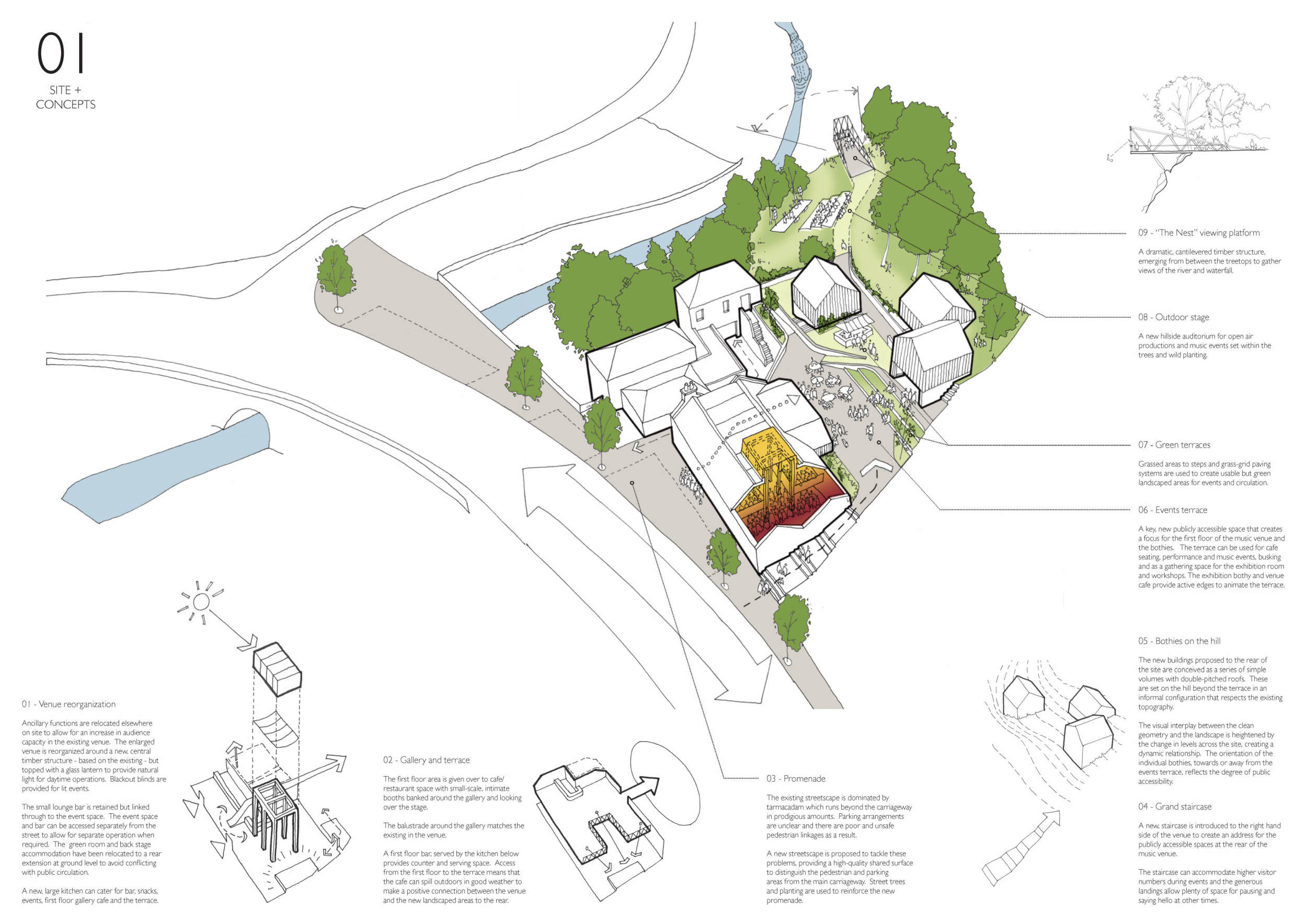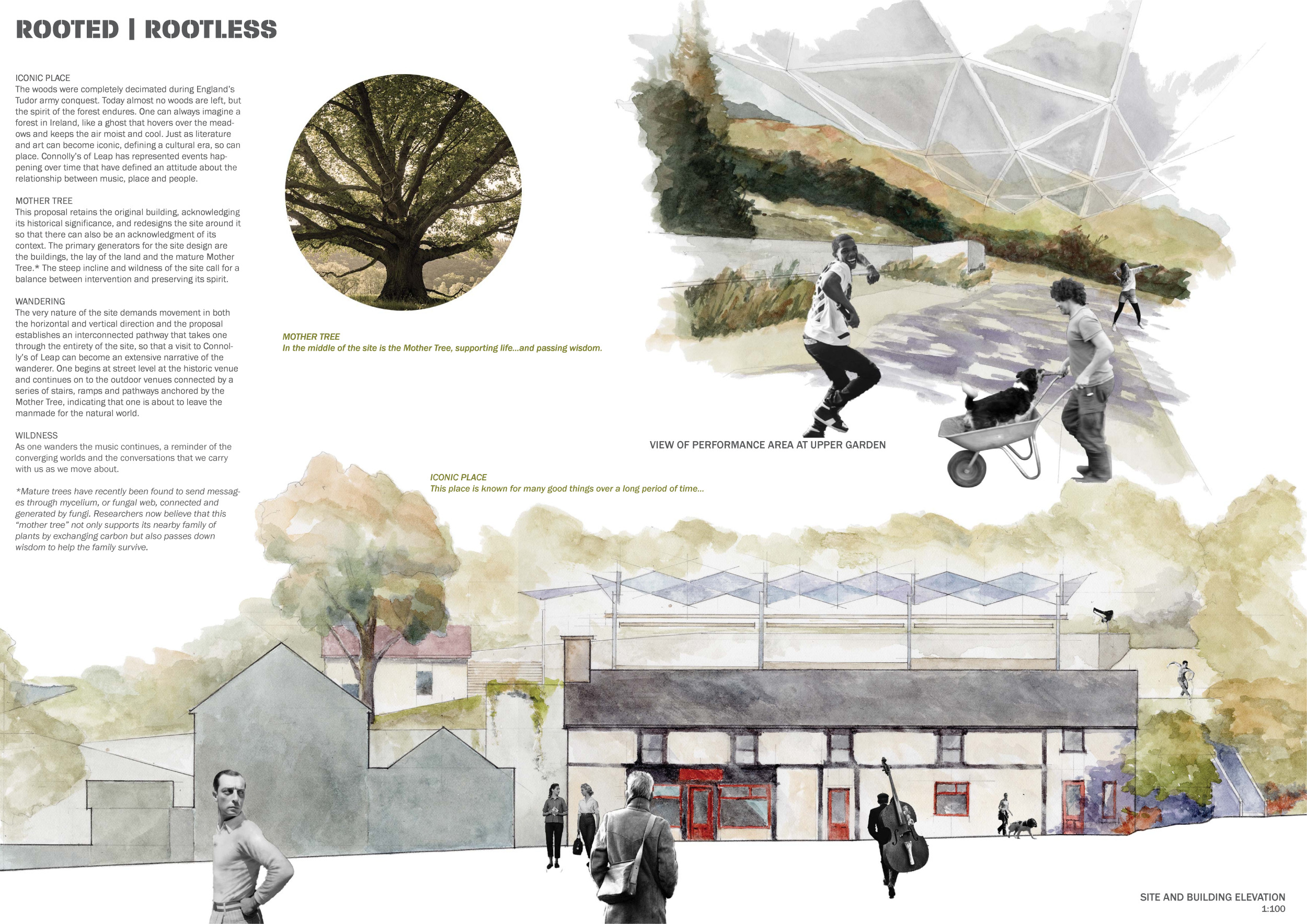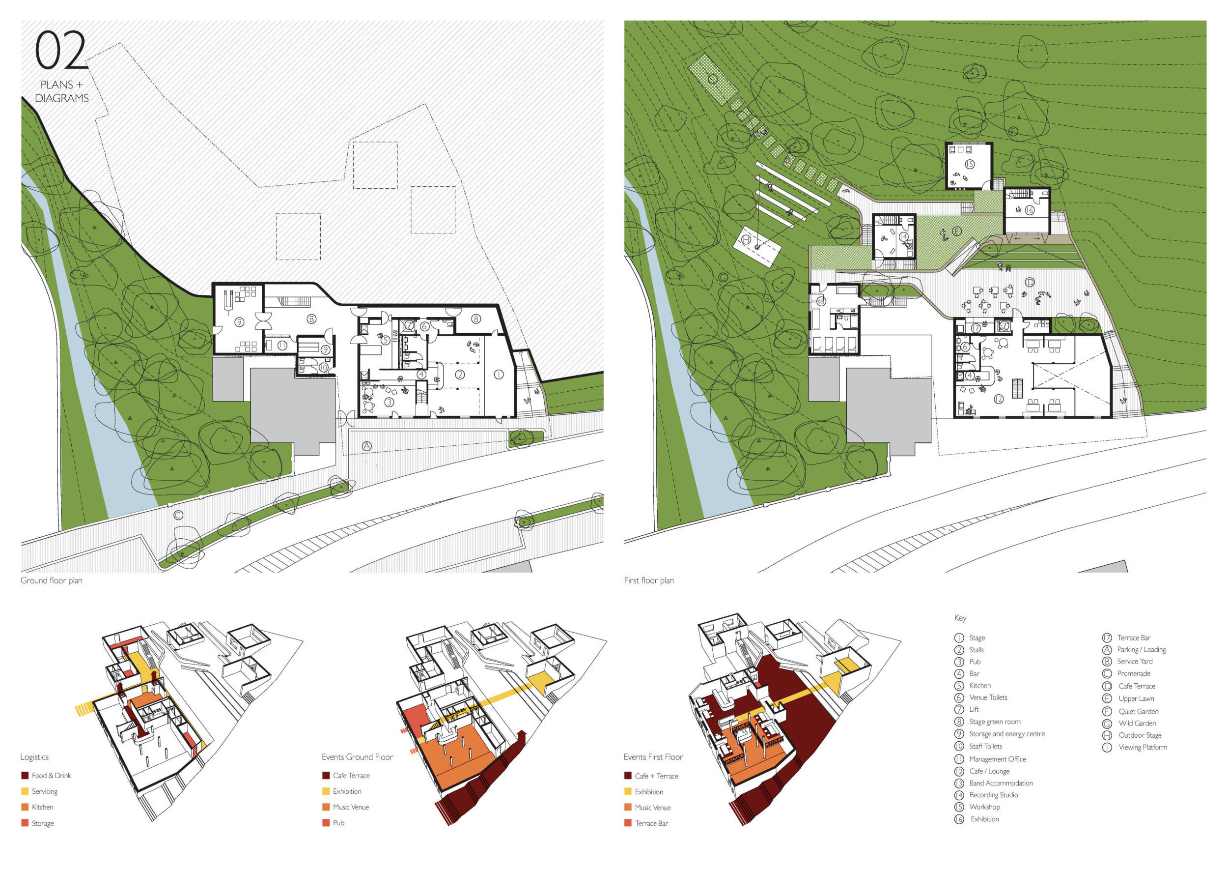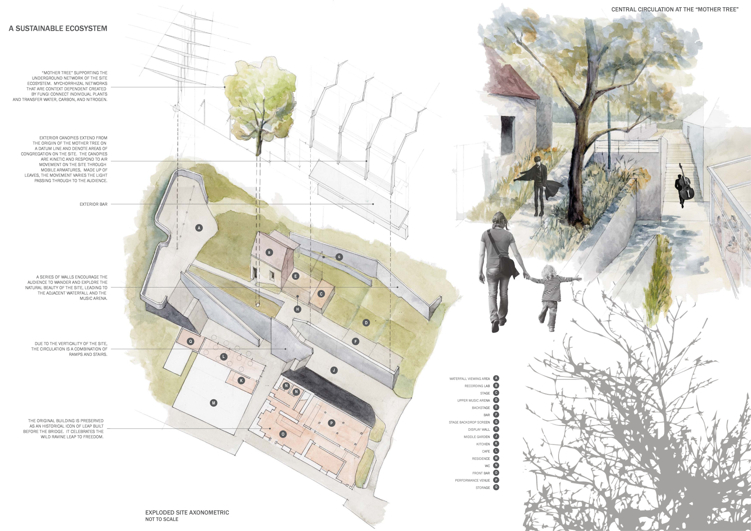“Rooted/Rootless” focuses the design of the expanded music venue around a central tree. A series of gardens connected by ramps brings visitors from the existing preserved building to a waterfall viewing zone and large new music arena set on the hillside. The arena is covered by a faceted canopy, the submission’s principle design move. The canopy appears to float above the existing venue, infusing it with a dynamic new form and material.