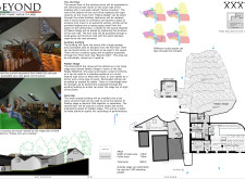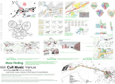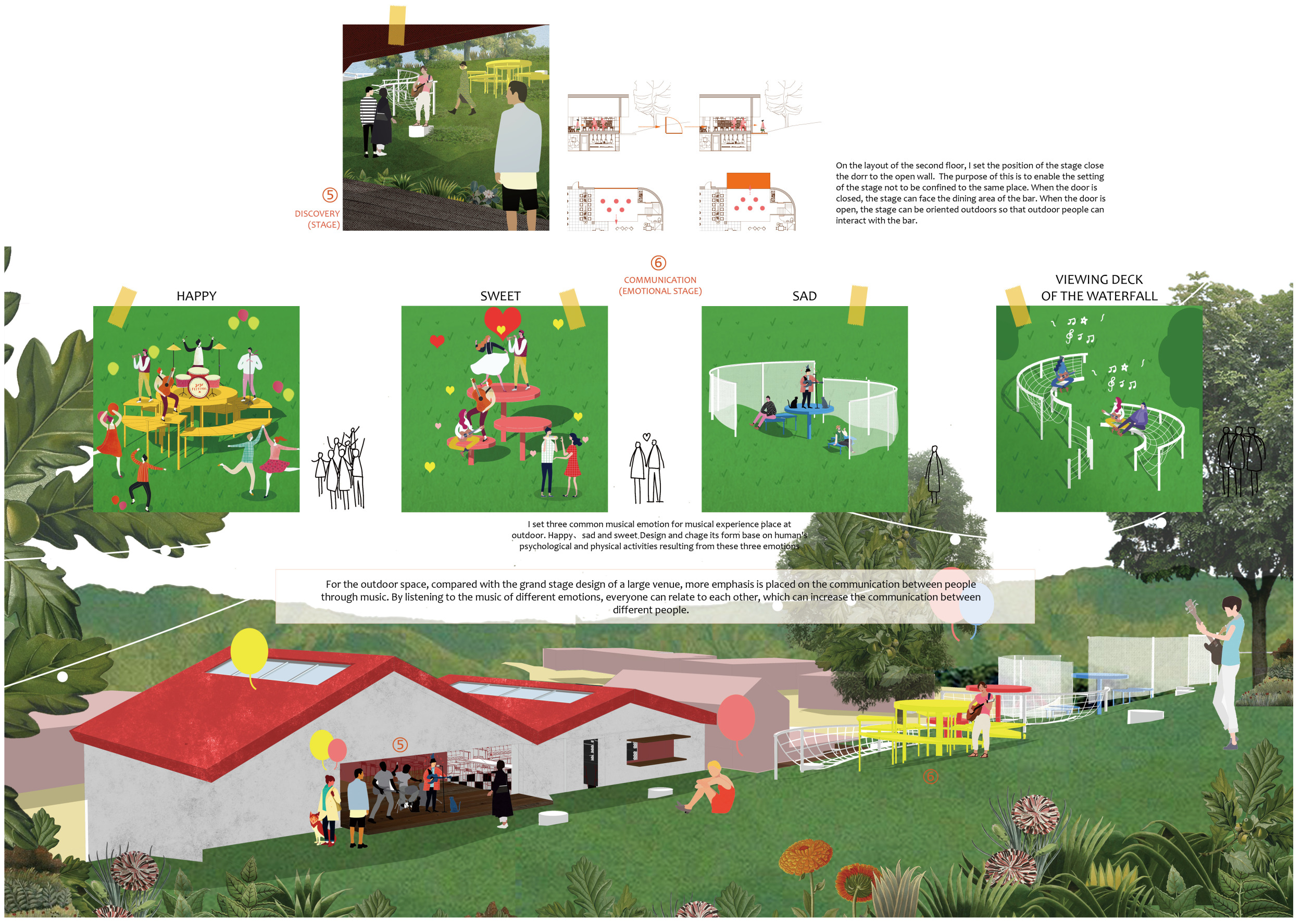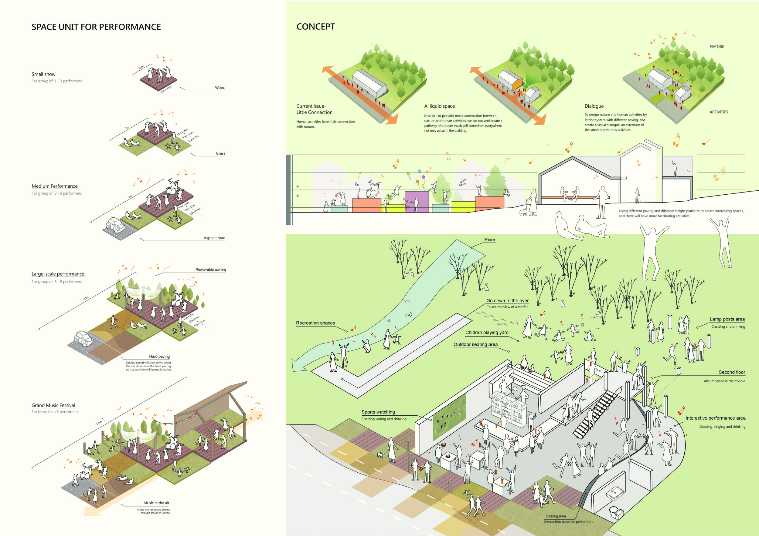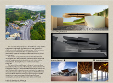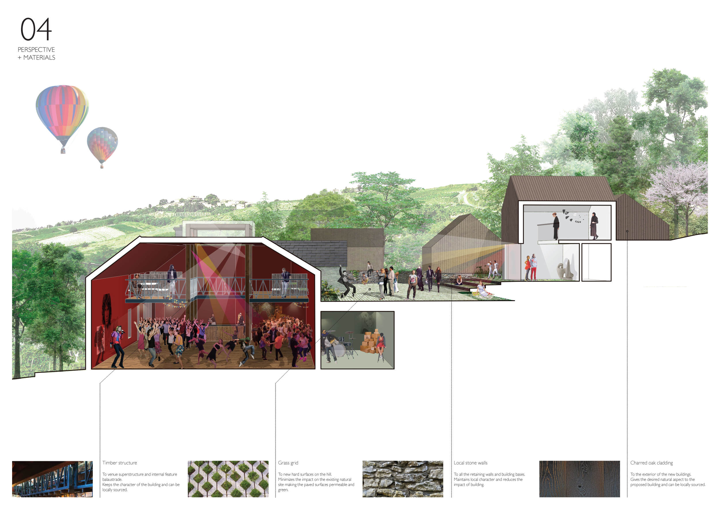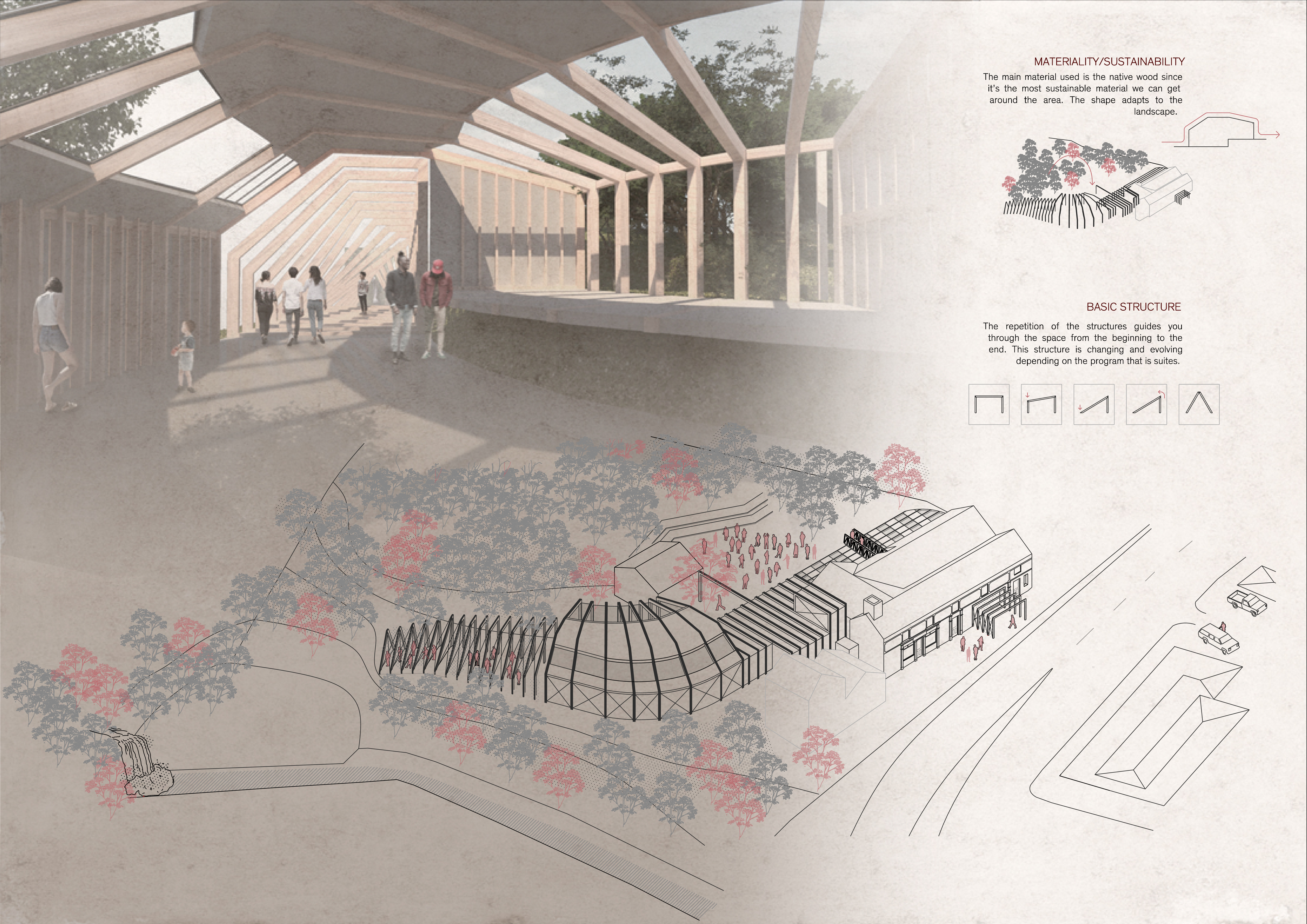 “Rooted/Rootless” focuses the design of the expanded music venue around a central tree. A series of gardens connected by ramps brings visitors from the existing preserved building to a waterfall viewing zone and large new music arena set on the hillside. The arena is covered by a faceted canopy, the submission’s principle design move. The canopy appears to float above the existing venue, infusing it with a dynamic new form and material.