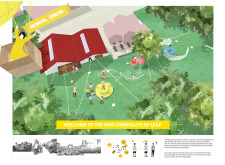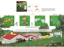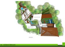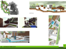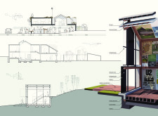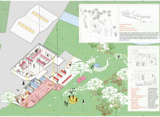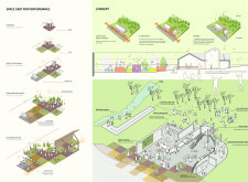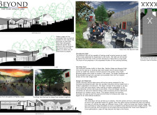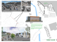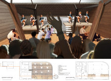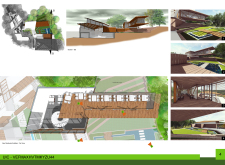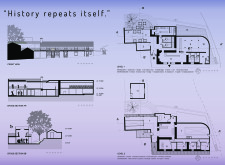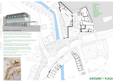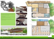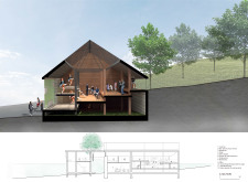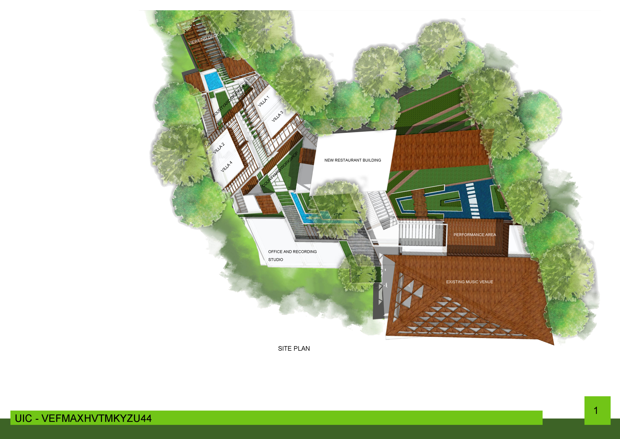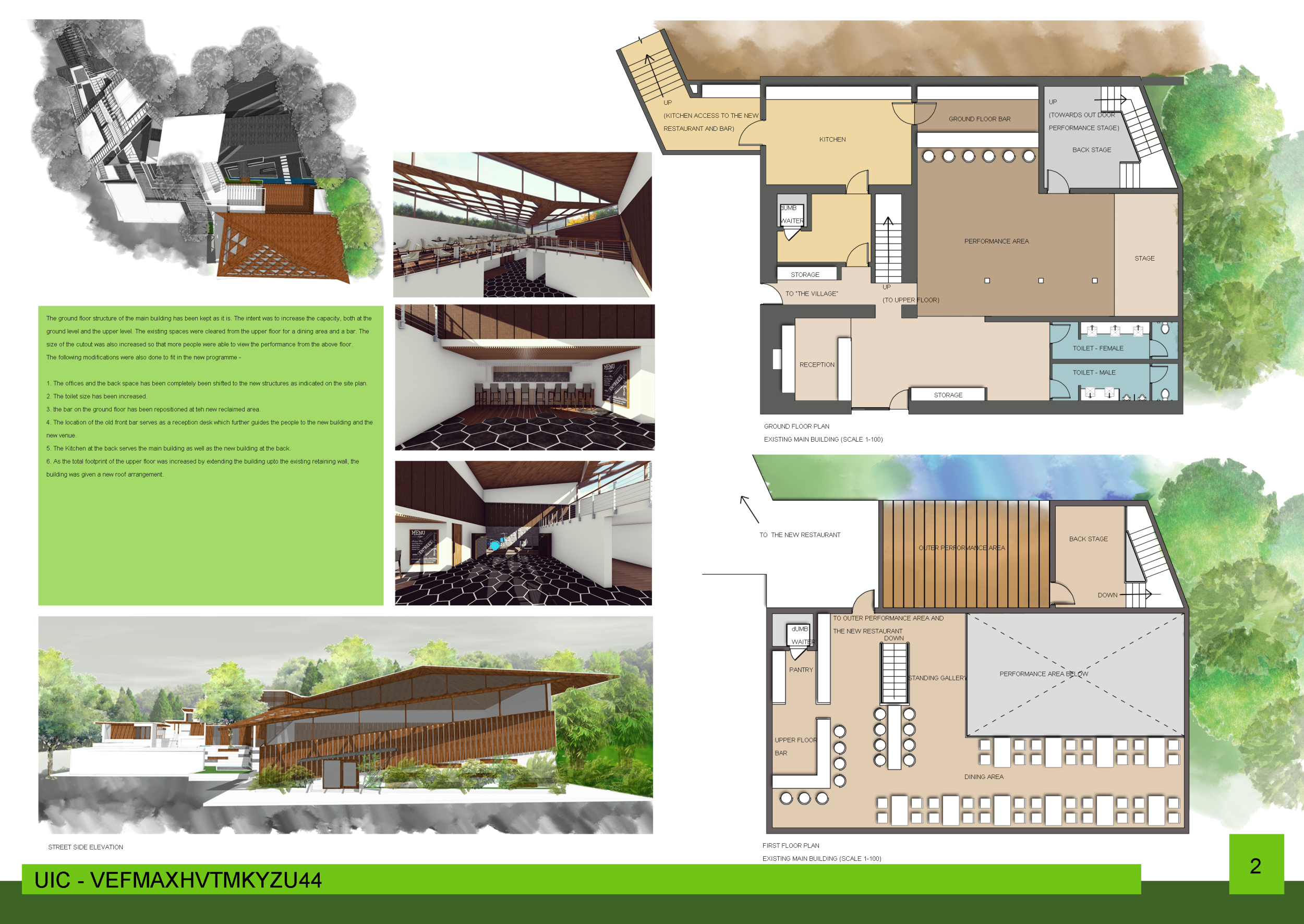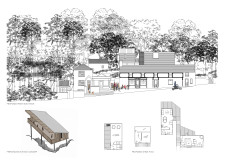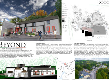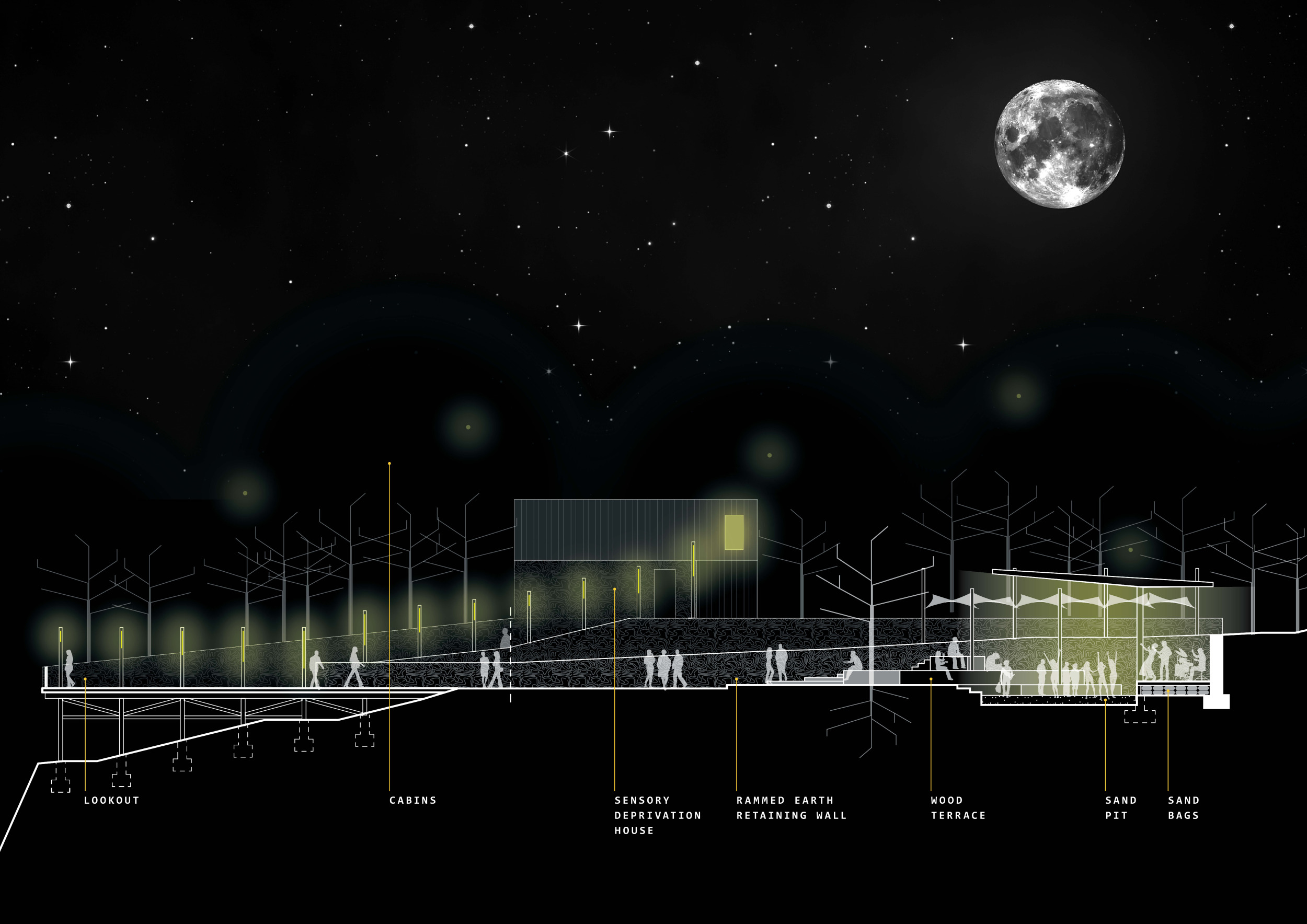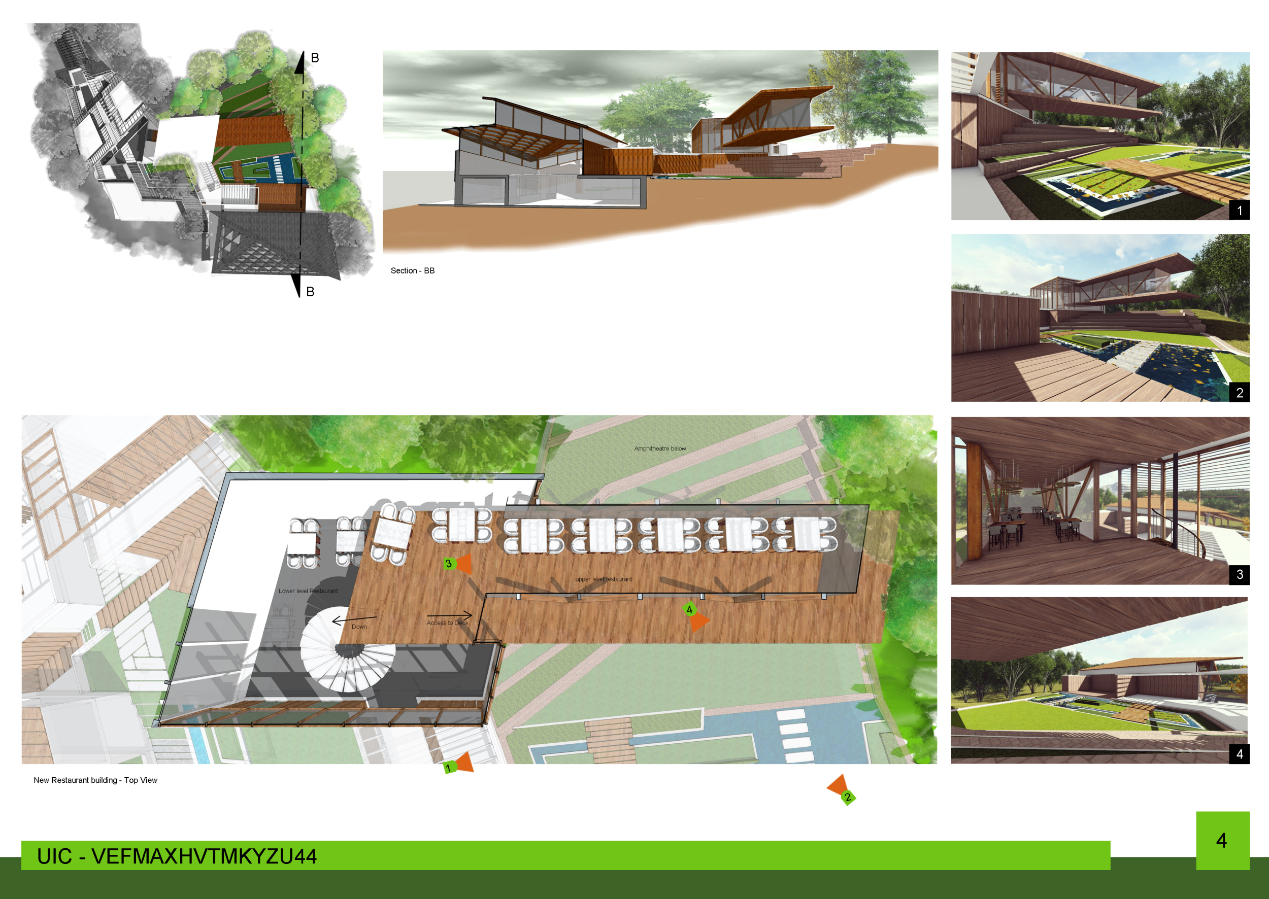“Rooted/Rootless” focuses the design of the expanded music venue around a central tree. A series of gardens connected by ramps brings visitors from the existing preserved building to a waterfall viewing zone and large new music arena set on the hillside. The arena is covered by a faceted canopy, the submission’s principle design move. The canopy appears to float above the existing venue, infusing it with a dynamic new form and material.